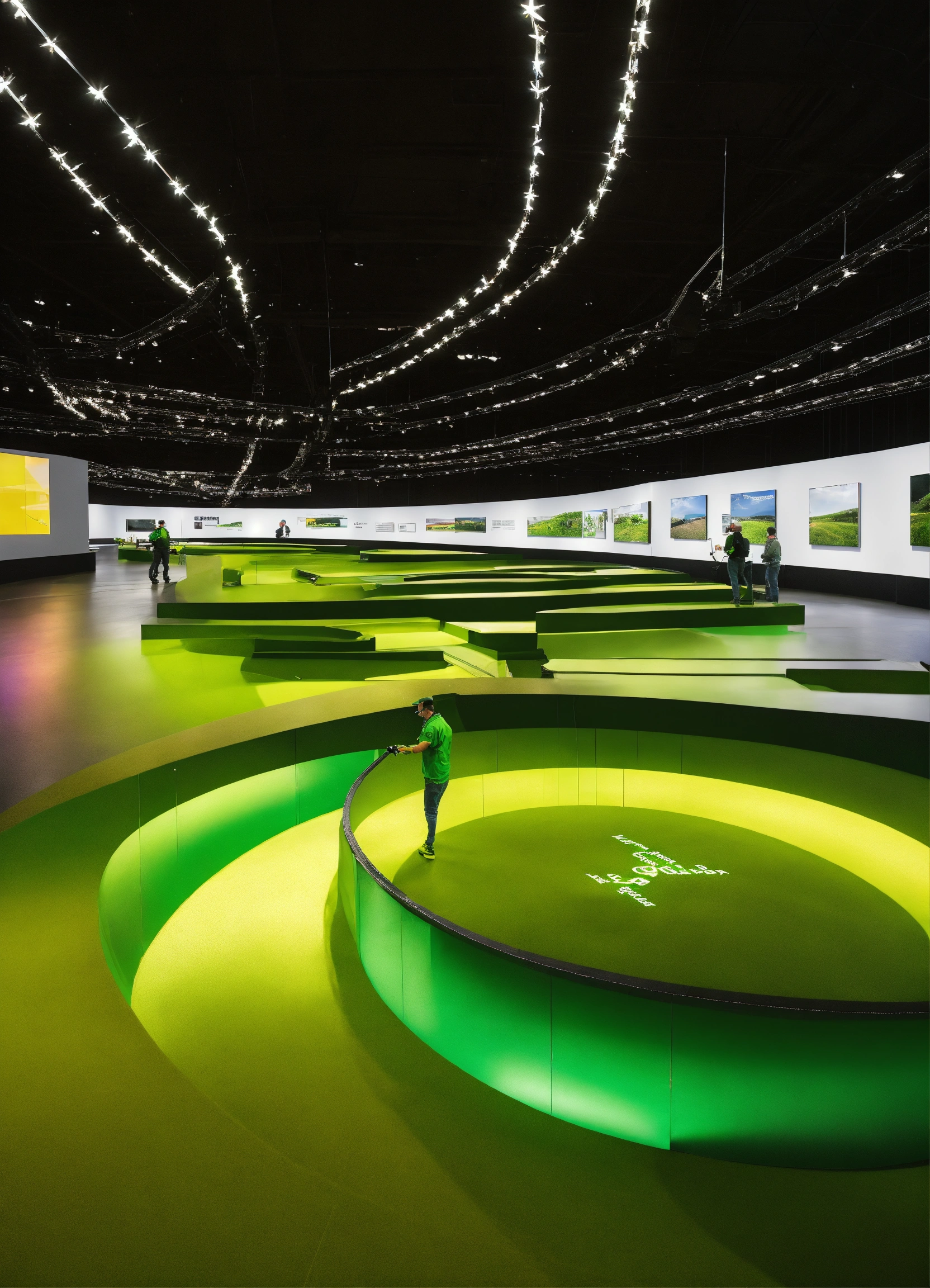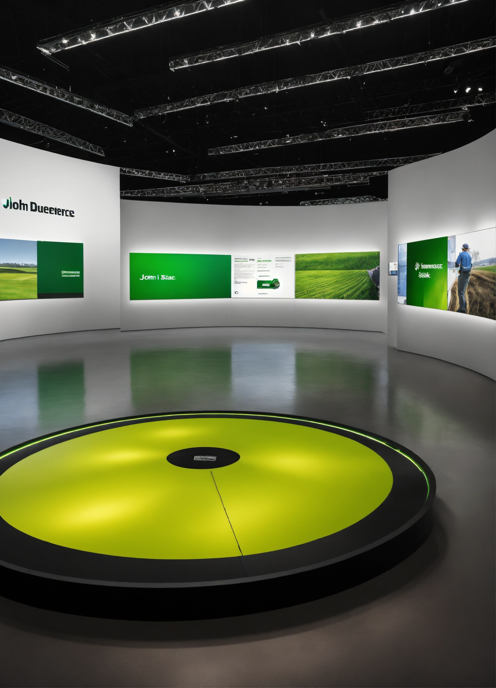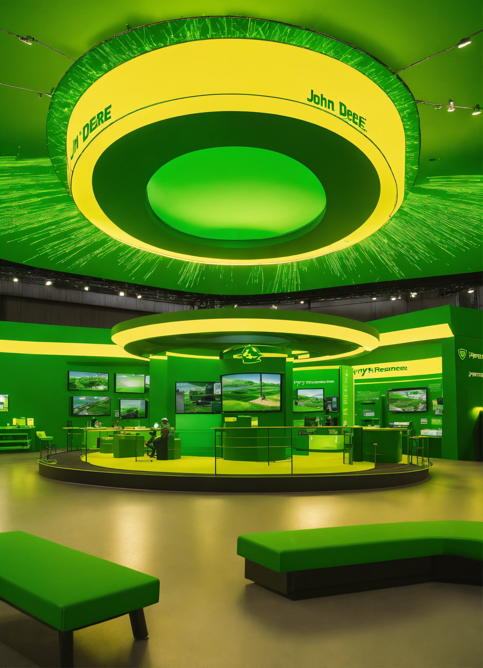 Imagine a 32-foot circular exhibition space inspired by anthony mccall, rendered in hyper-realistic 4k resolution, and adorned with john deere's signature colors green pantone 364 c yellow pantone 109 c black (for text and accents) pantone black c white (backgrounds and text) pantone white dark gray (occasionally for accents) pantone cool gray 11 c designed for a john deere trade show, the focal point is cutting-edge technology. this circular space emphasizes real-time decision-making immediate connection clear coordination data-driven decisions uptime maintenance effort minimization risk reduction immediate maintenance precise decisions it puts the farmer in control of data visibility, allowing trusted advisors to send instructions.