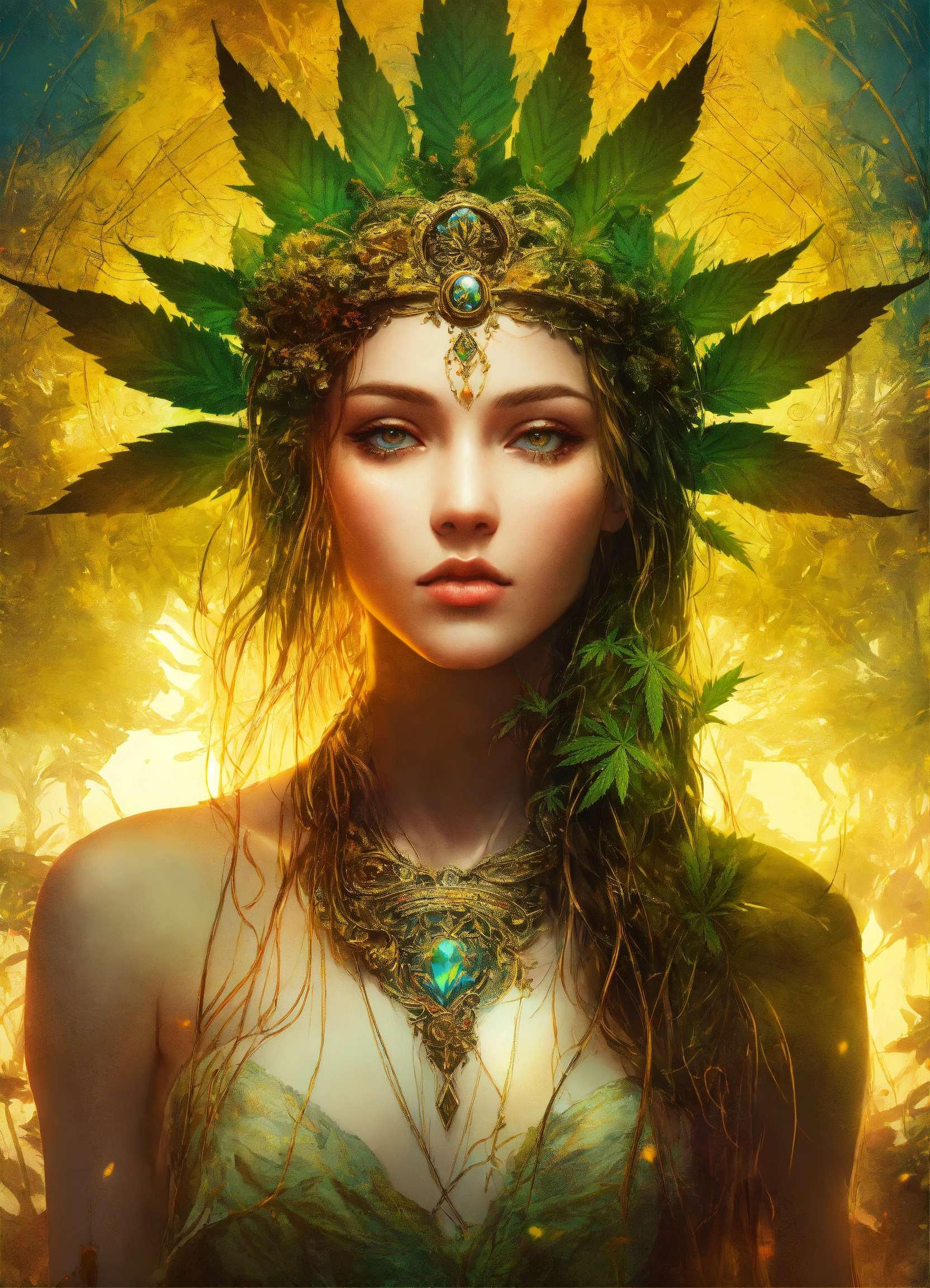 Cannabis goddess by carne griffiths, sf, intricate artwork masterpiece, ominous, matte painting movie poster, golden ratio, trending on cgsociety, intricate, epic, trending on artstation, by artgerm, h. r. giger and beksinski, highly detailed, ultra high quality model, (dark shot1.17), epic realistic, faded, ((neutral colors)), art, (hdr1.5), (muted colors1.2), hyperdetailed, (artstation1.5), cinematic, warm lights, dramatic light
