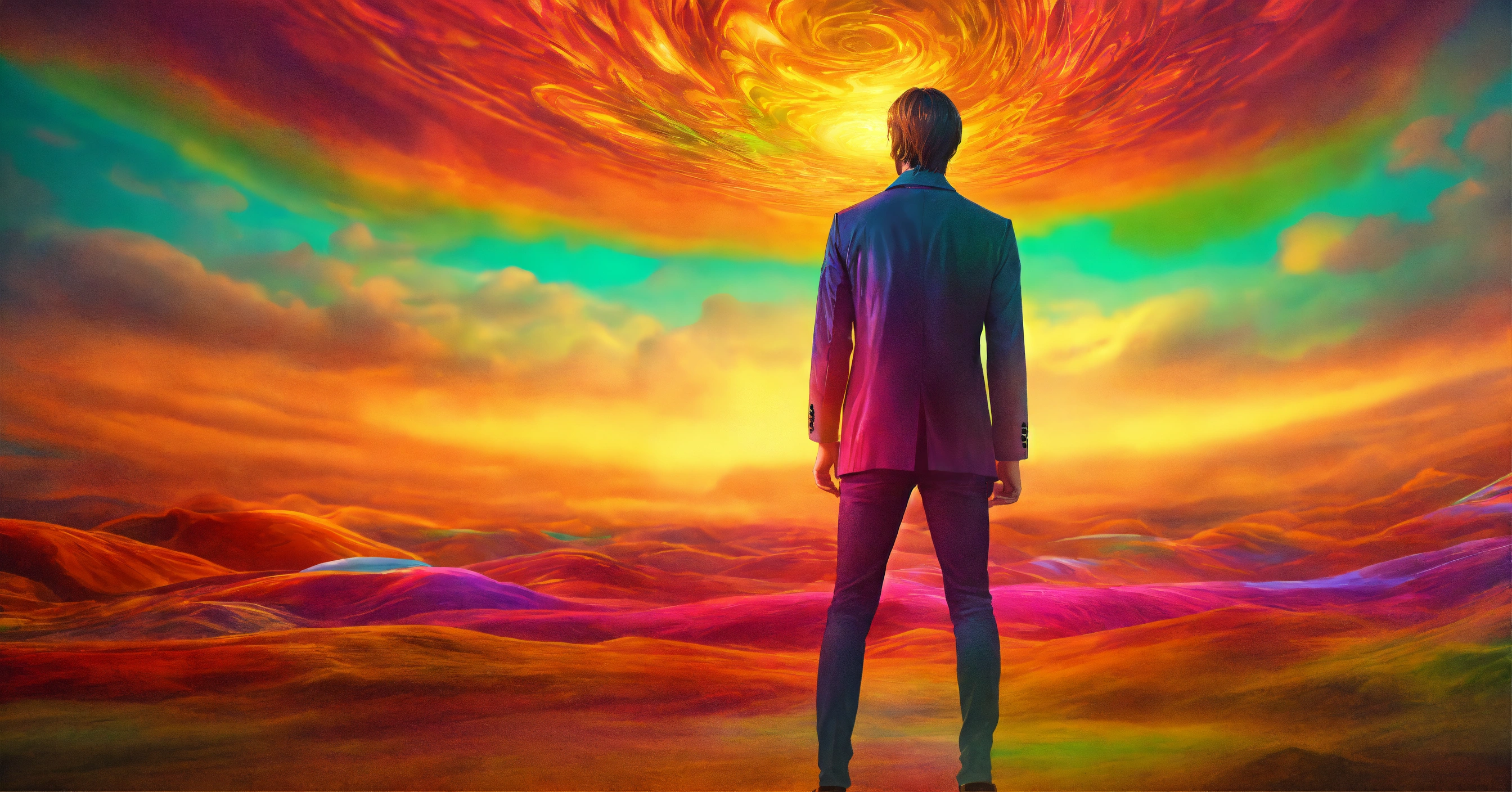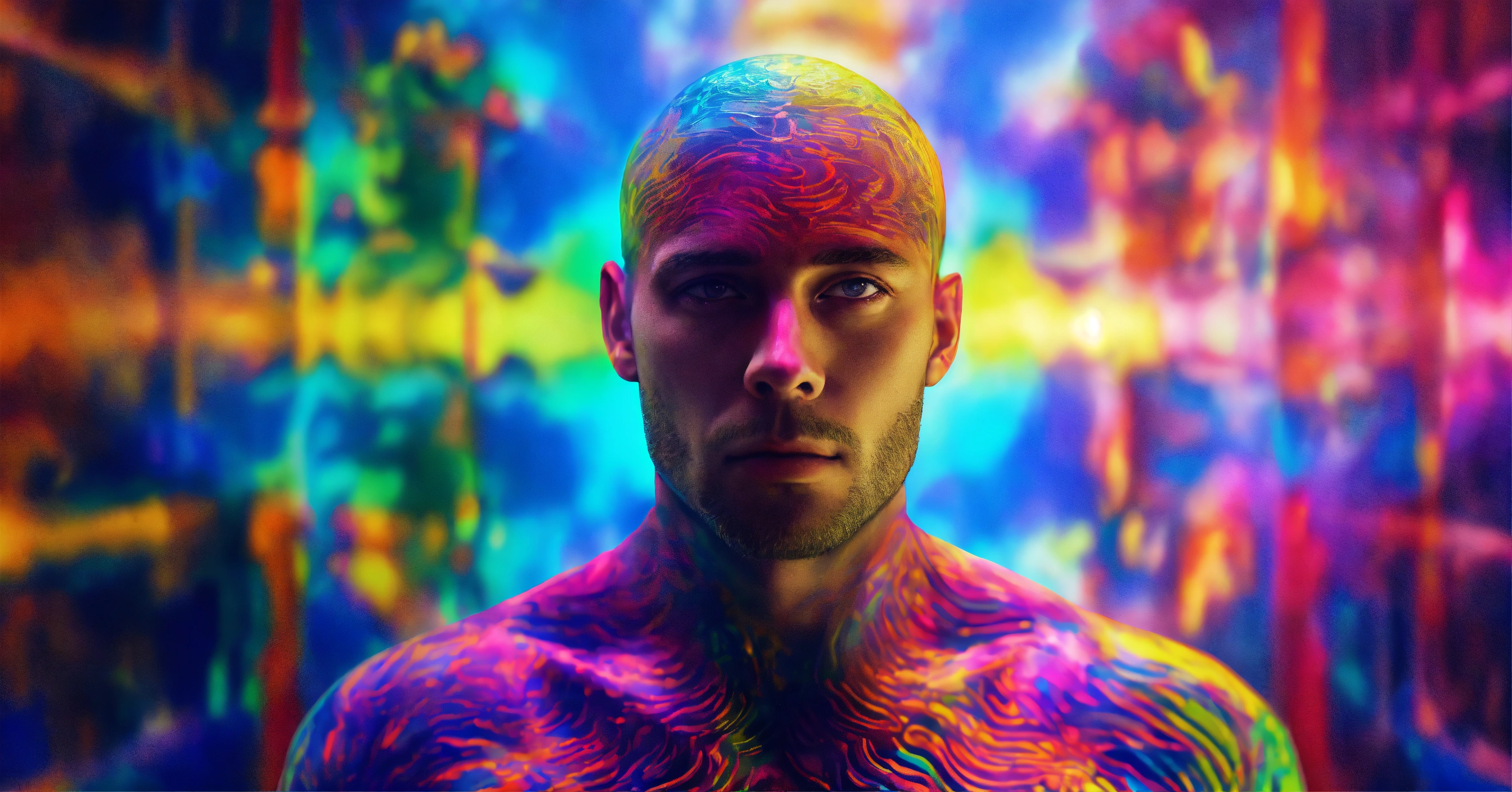 The human soul, well built man standing looking at the camera, soul floating around him, aura, 4k resolution, psychedelic colours, photo realistic