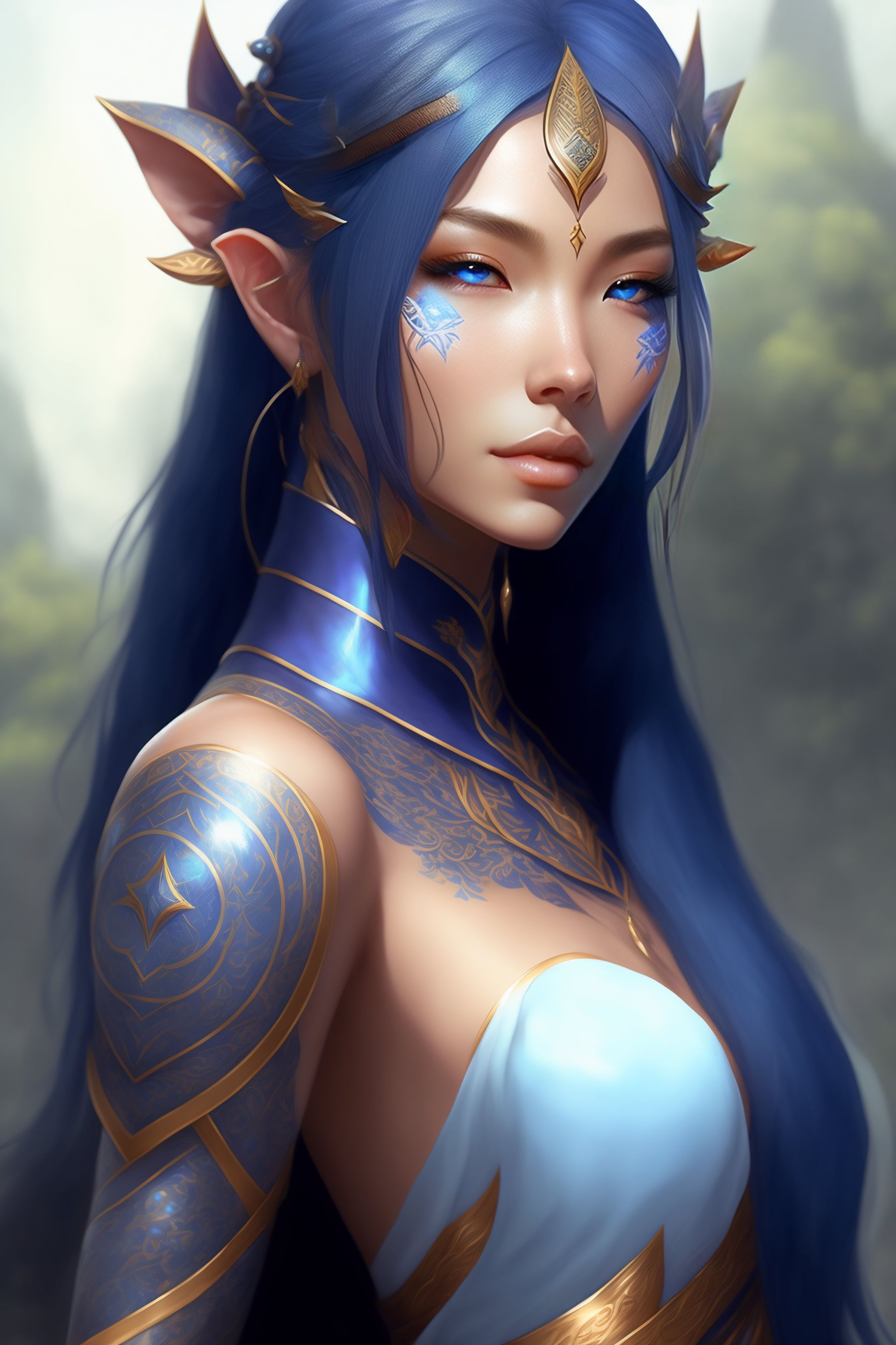 Imagine blue skin female water elf, beautiful, tattooed arm, pretty face, pointed ears, view full body, intricate details, by hyung-tae kim and krenz cushart and artgerm on artstation