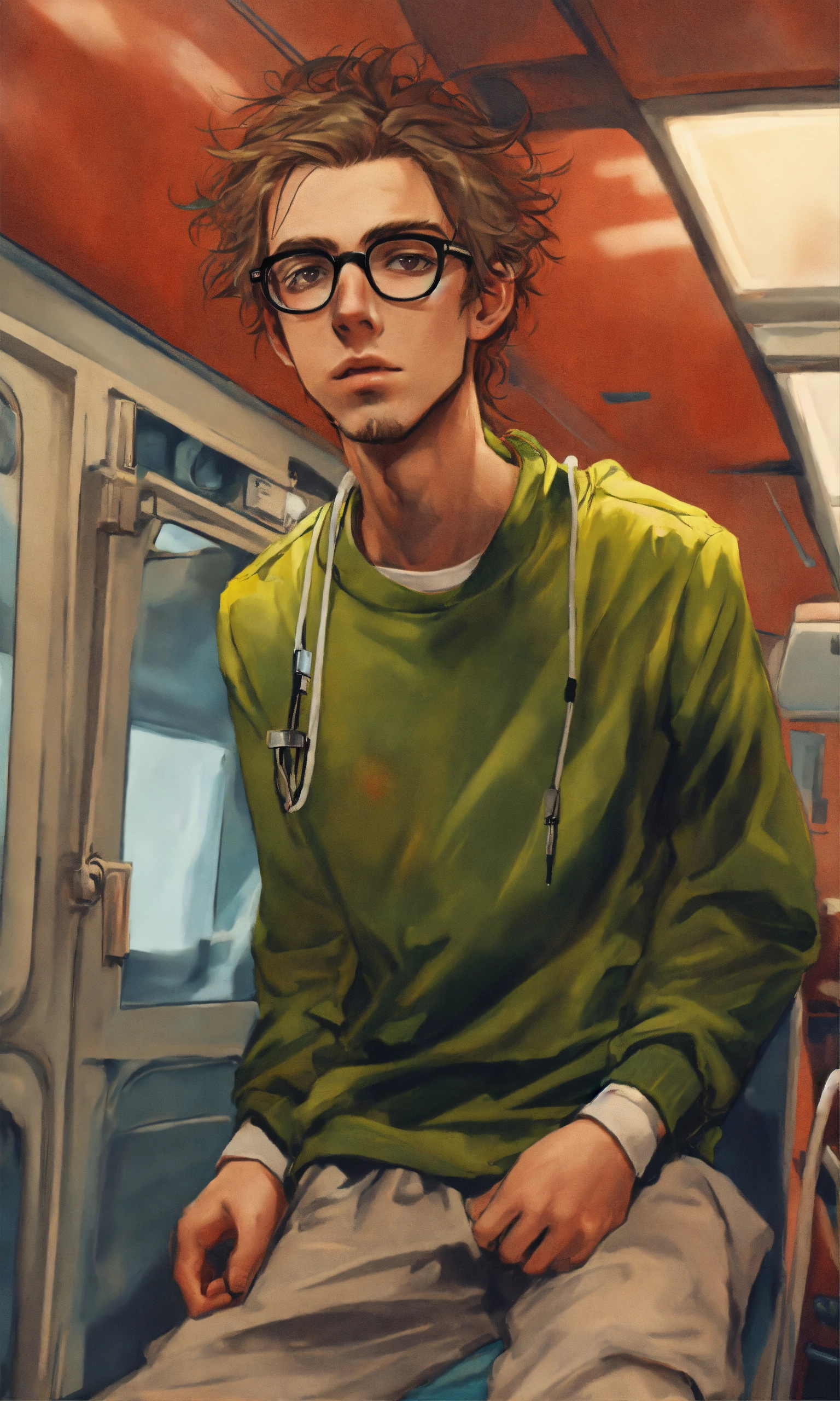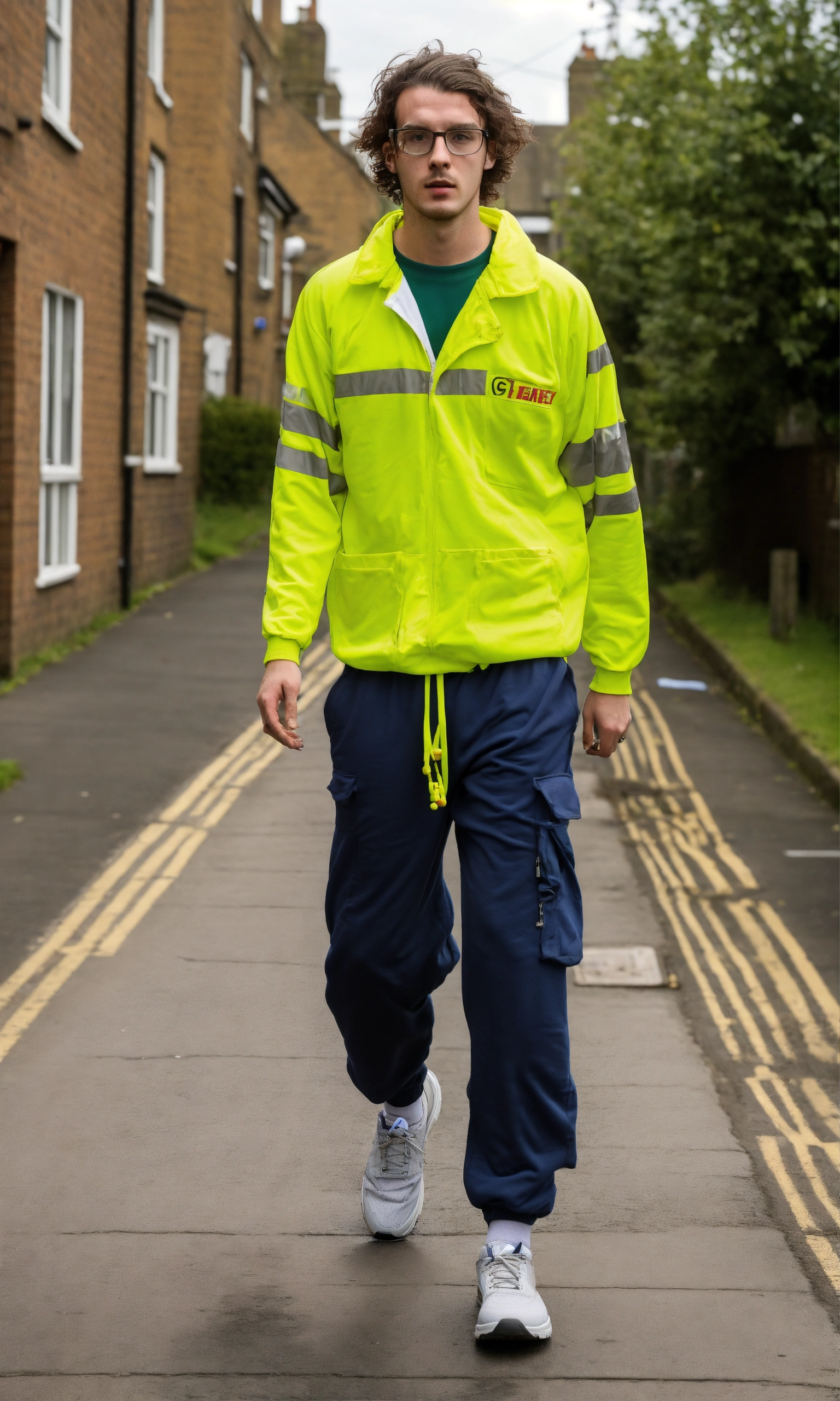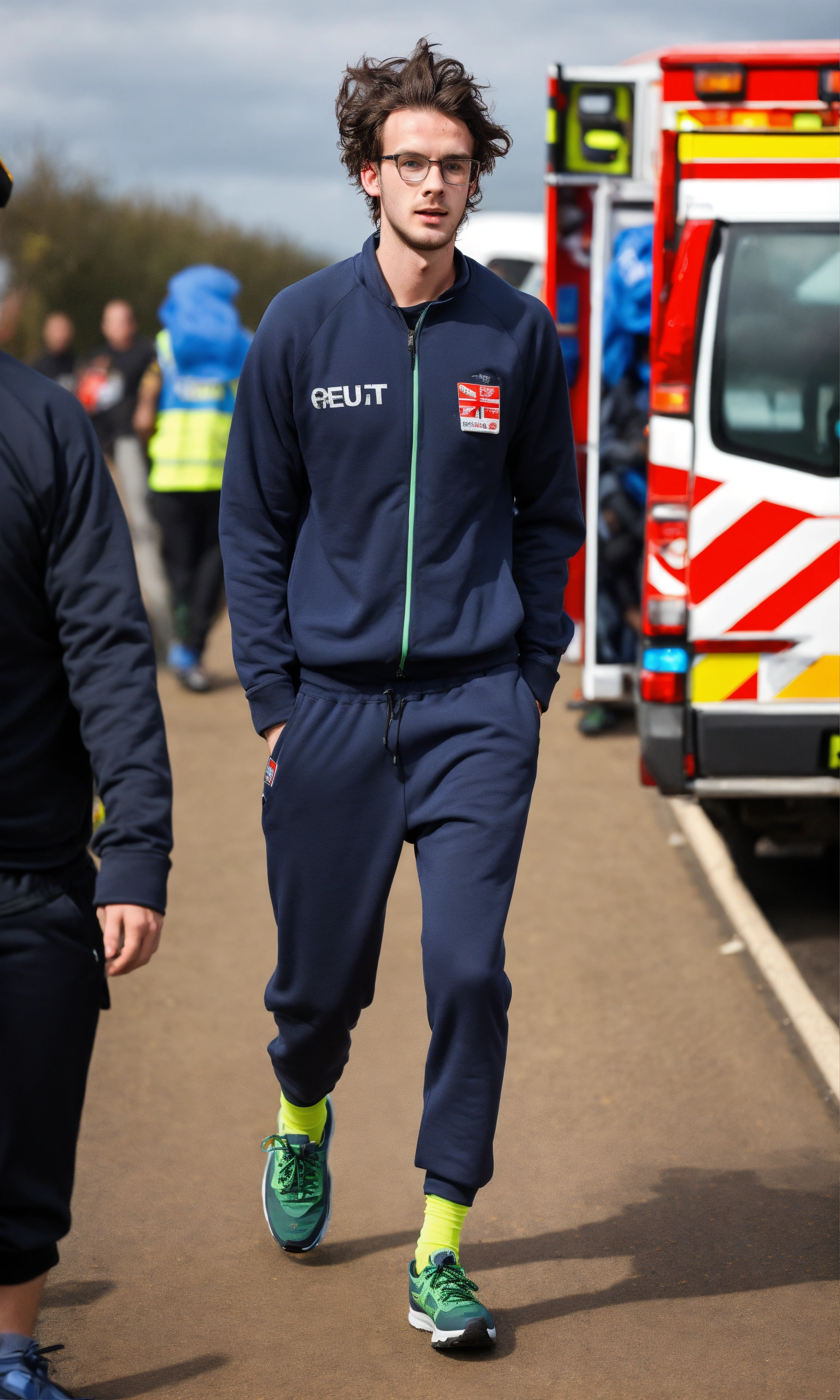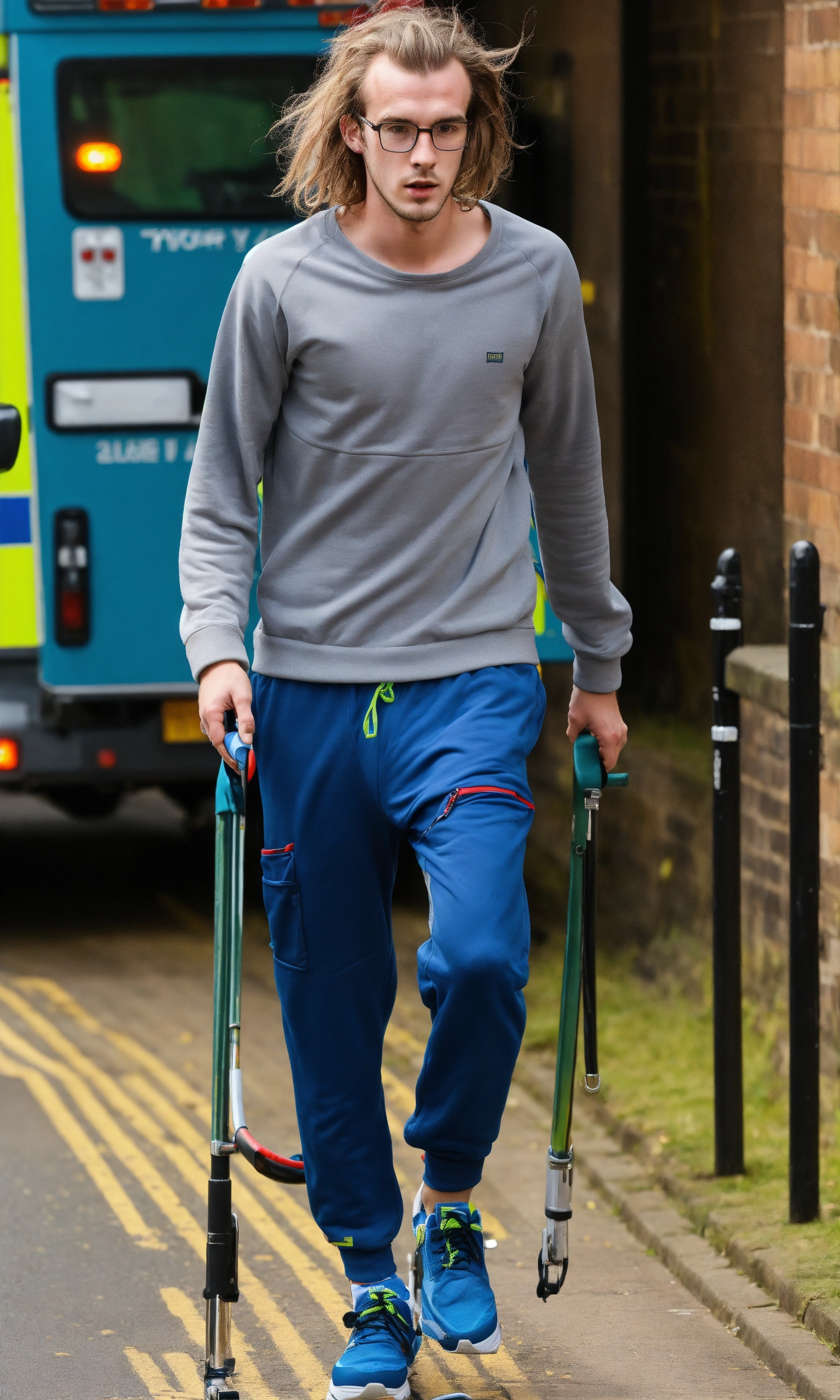 Ugly, skinny, 25 year old british man, he is wearing jogging bottoms, he has greasy hair and is wearing glasses, he is in an ambulance being taken to hospital on a stretcher