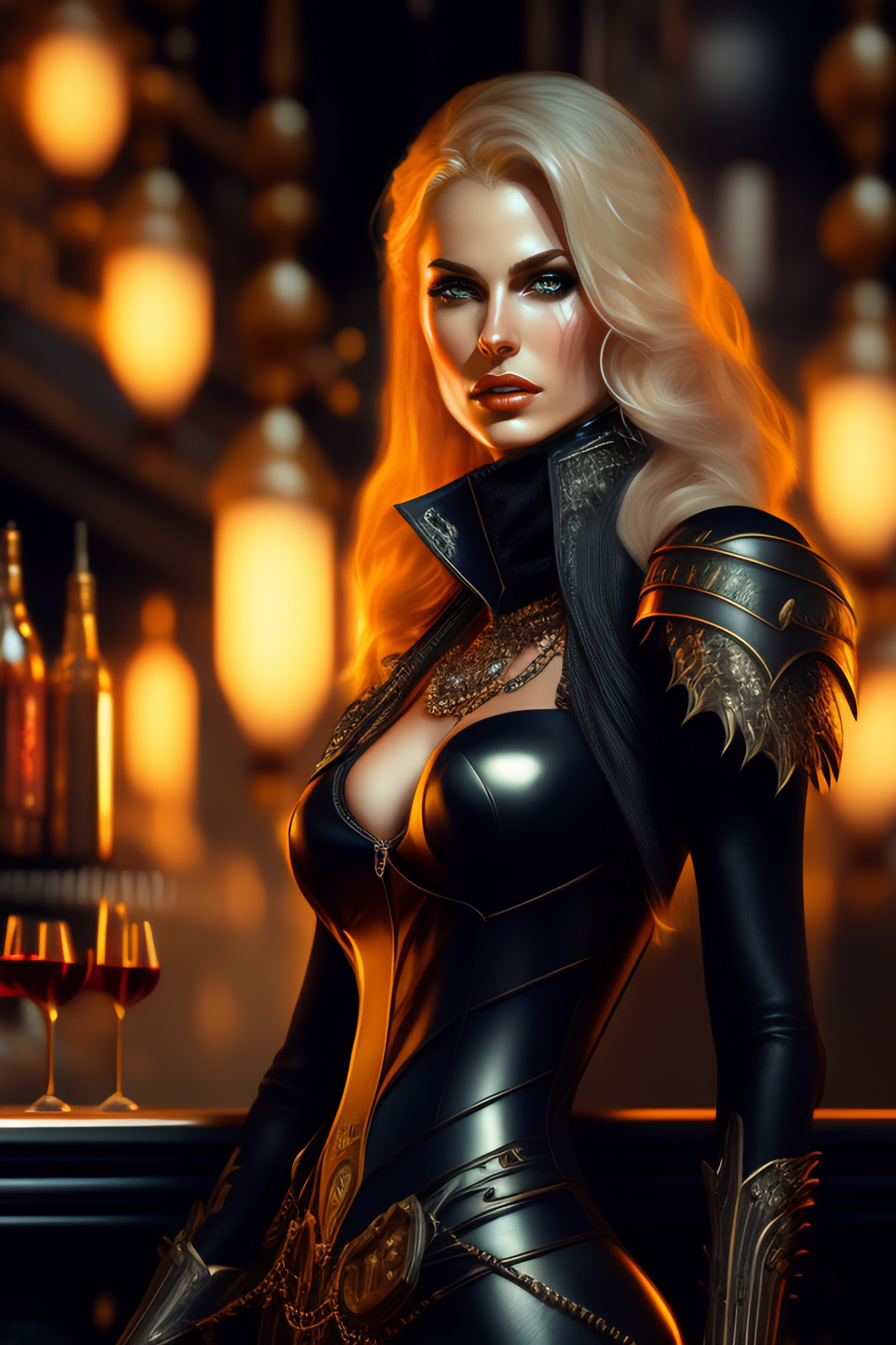 Female blond vampire, full body cinematic style digital art render with mechanical and futuristic details in a cyberpunk underworld, (((drinking a bloody cocktail))), moody atmospheric lighting, bizarre, dangerous, art by louis royo and giger