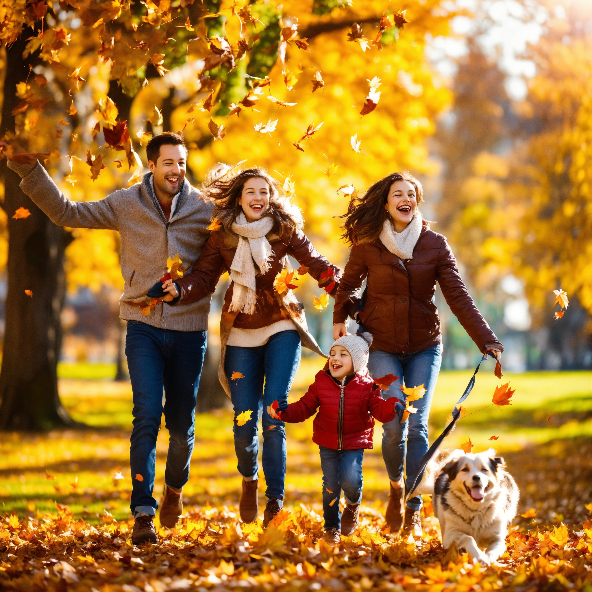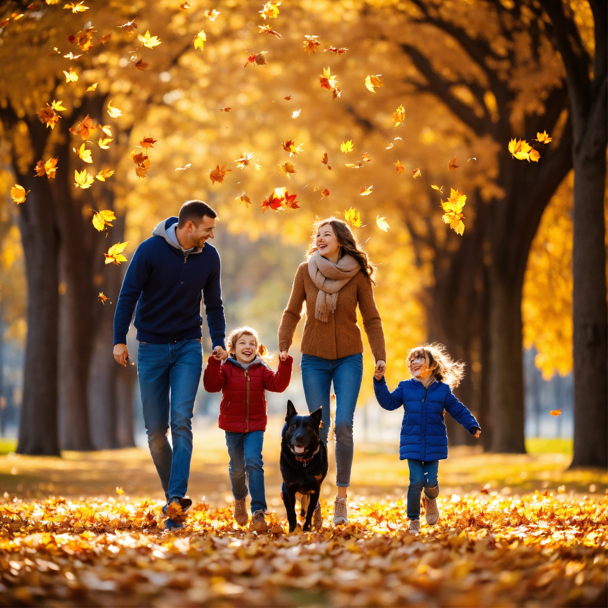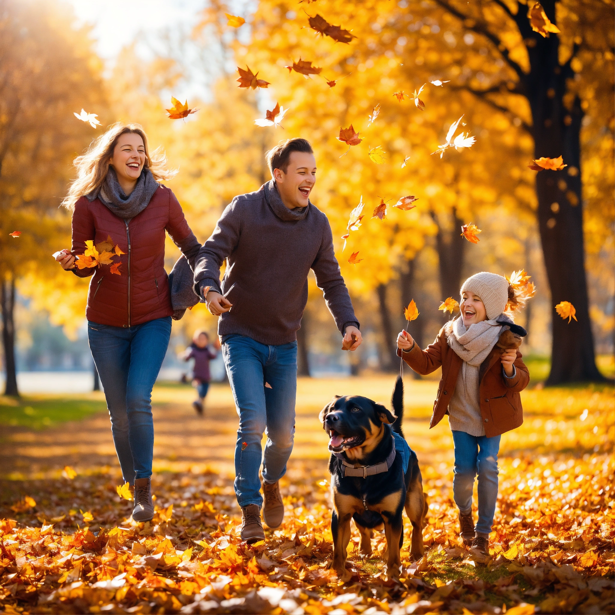 Happy mom, dad, son, daughter and a dog in a sunny windy autumn park with falling leaves. children run and throw leaves into the air, mom and dad laugh in the background looking at the children. crisp, detailed, dynamic photography