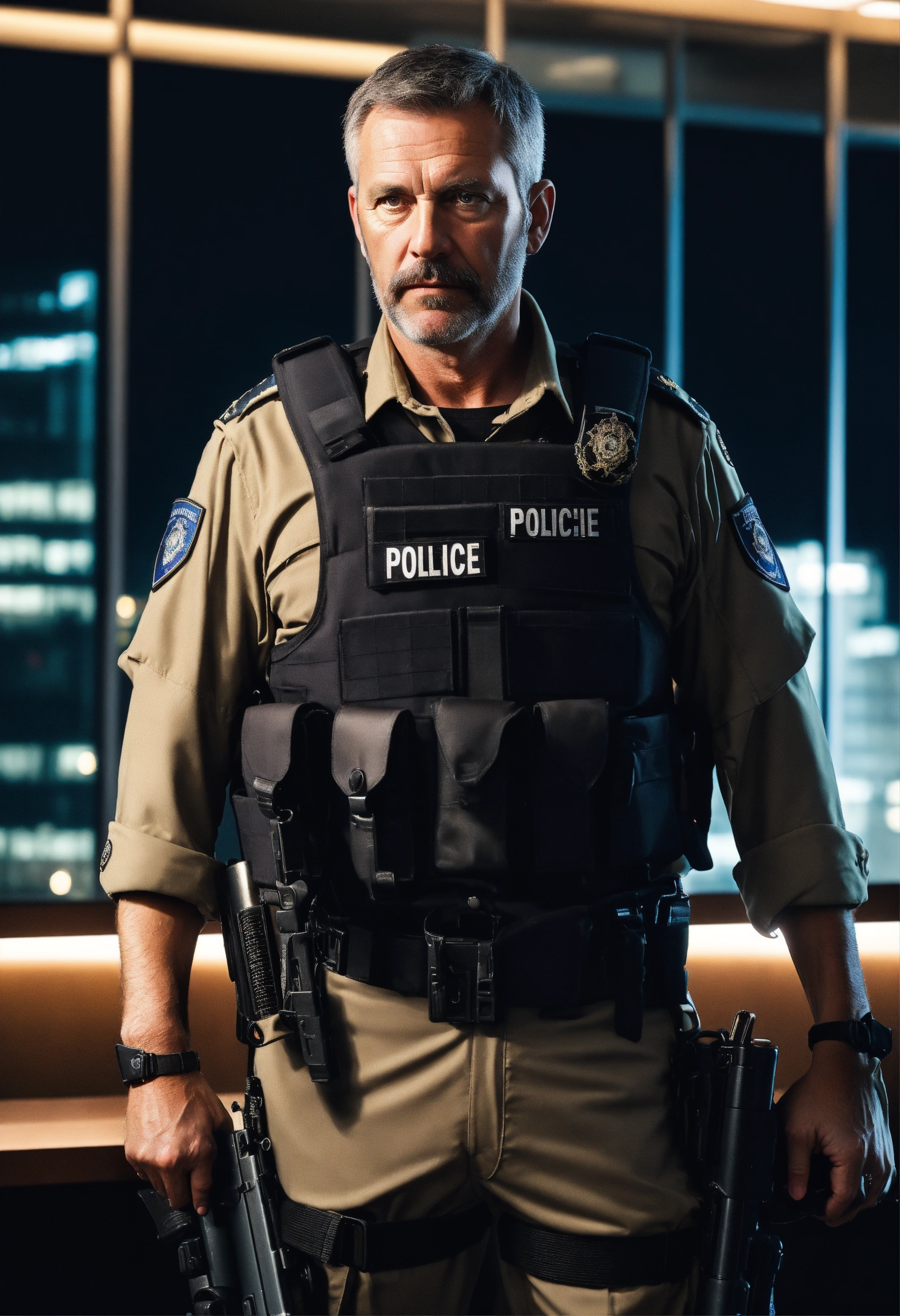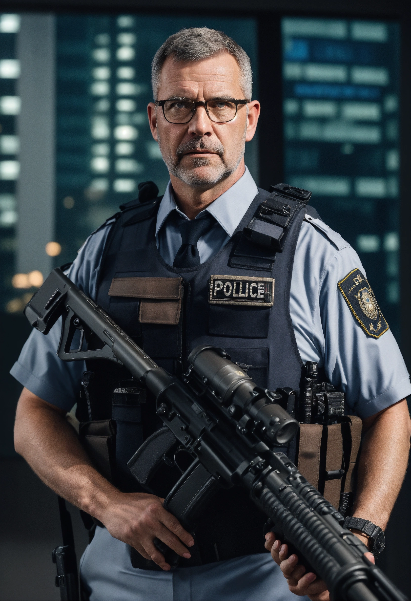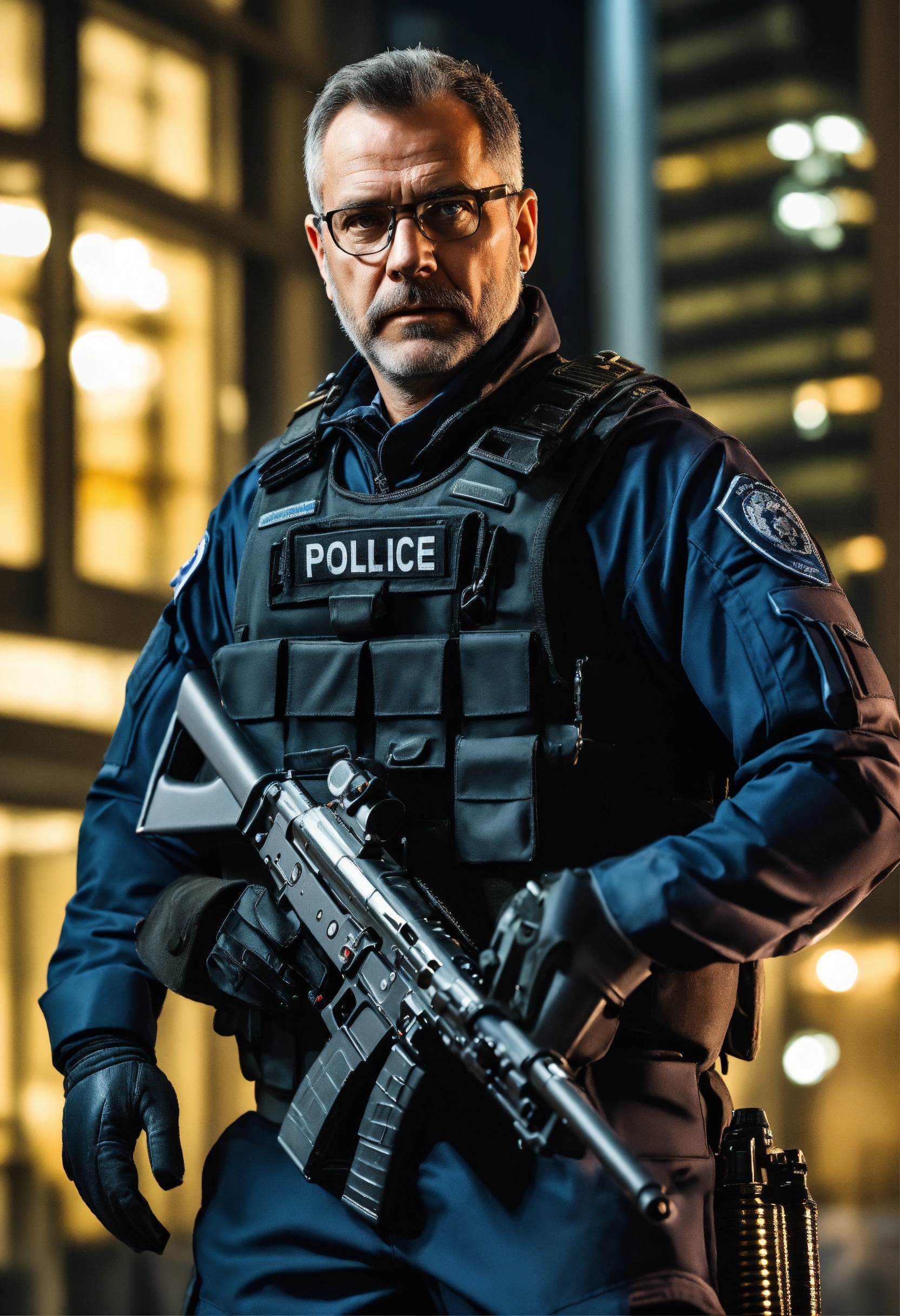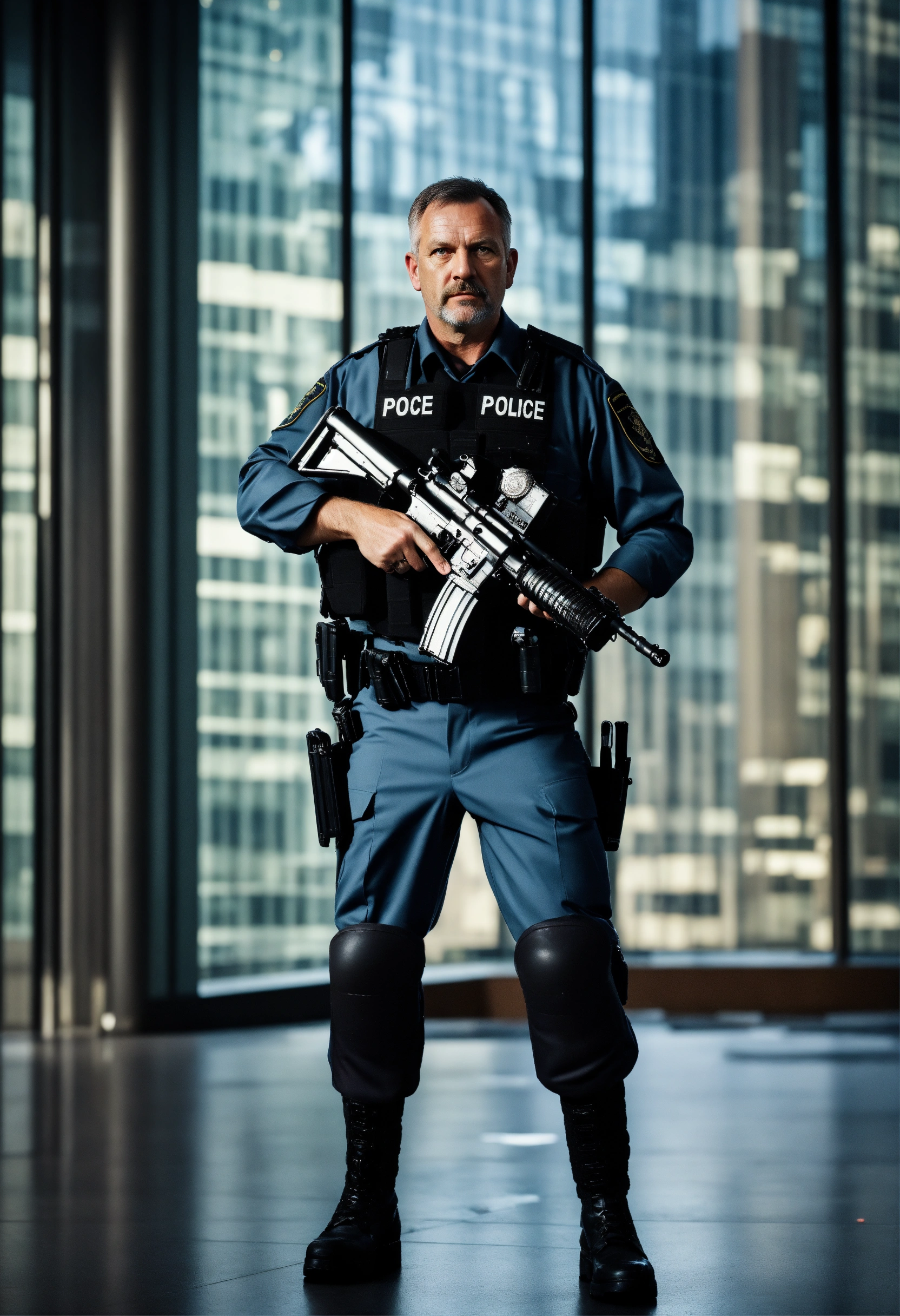 A photograph of a full body ugly 50-year-old german police captain, with a serious expression, deep brown eyes, gray very short hair, with short beard, holding a grenade launcher, in the background the inside glassed-in offices of a skyscraper, dramatic illumination, hyperdetailed, hyperrealistic, 8 k