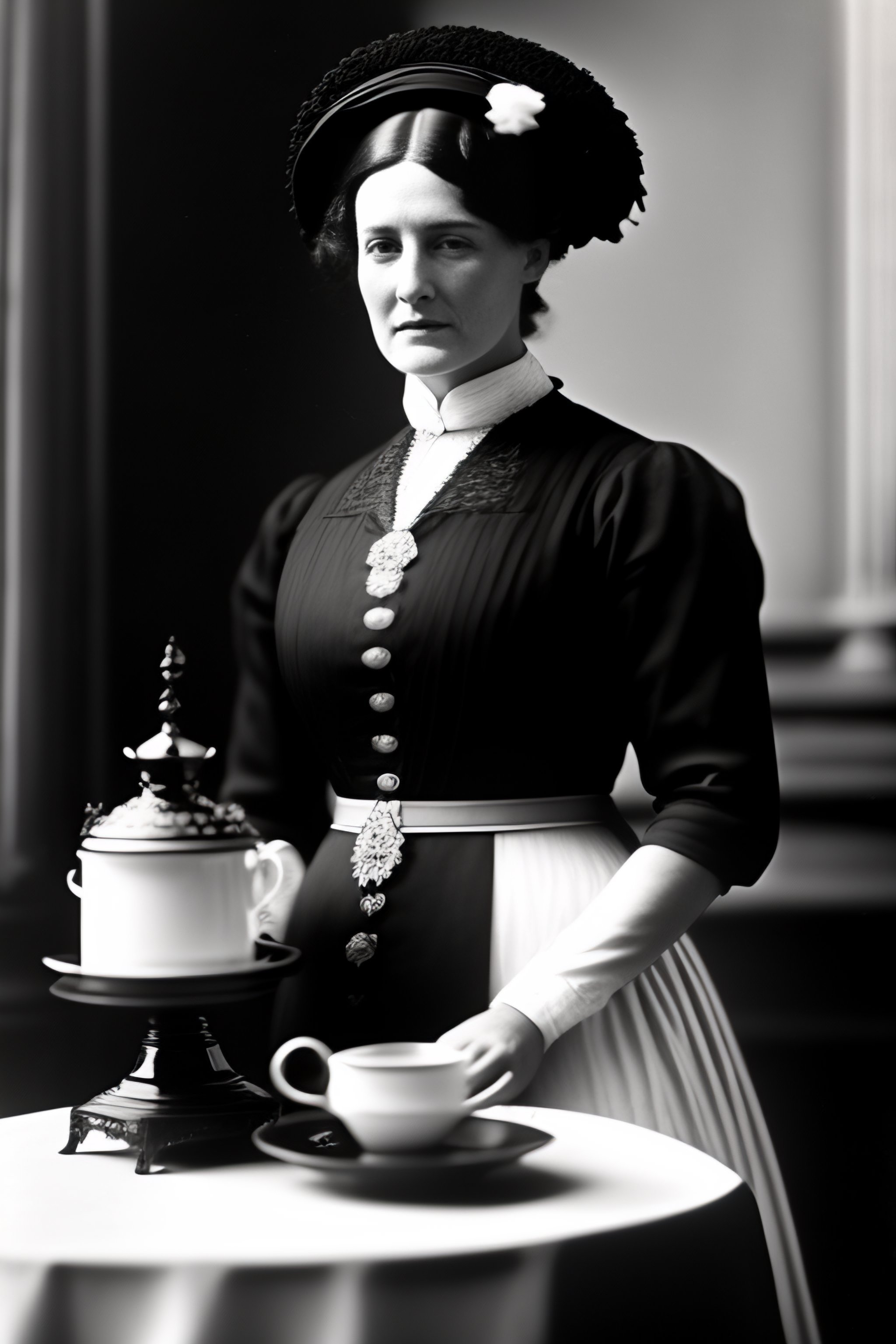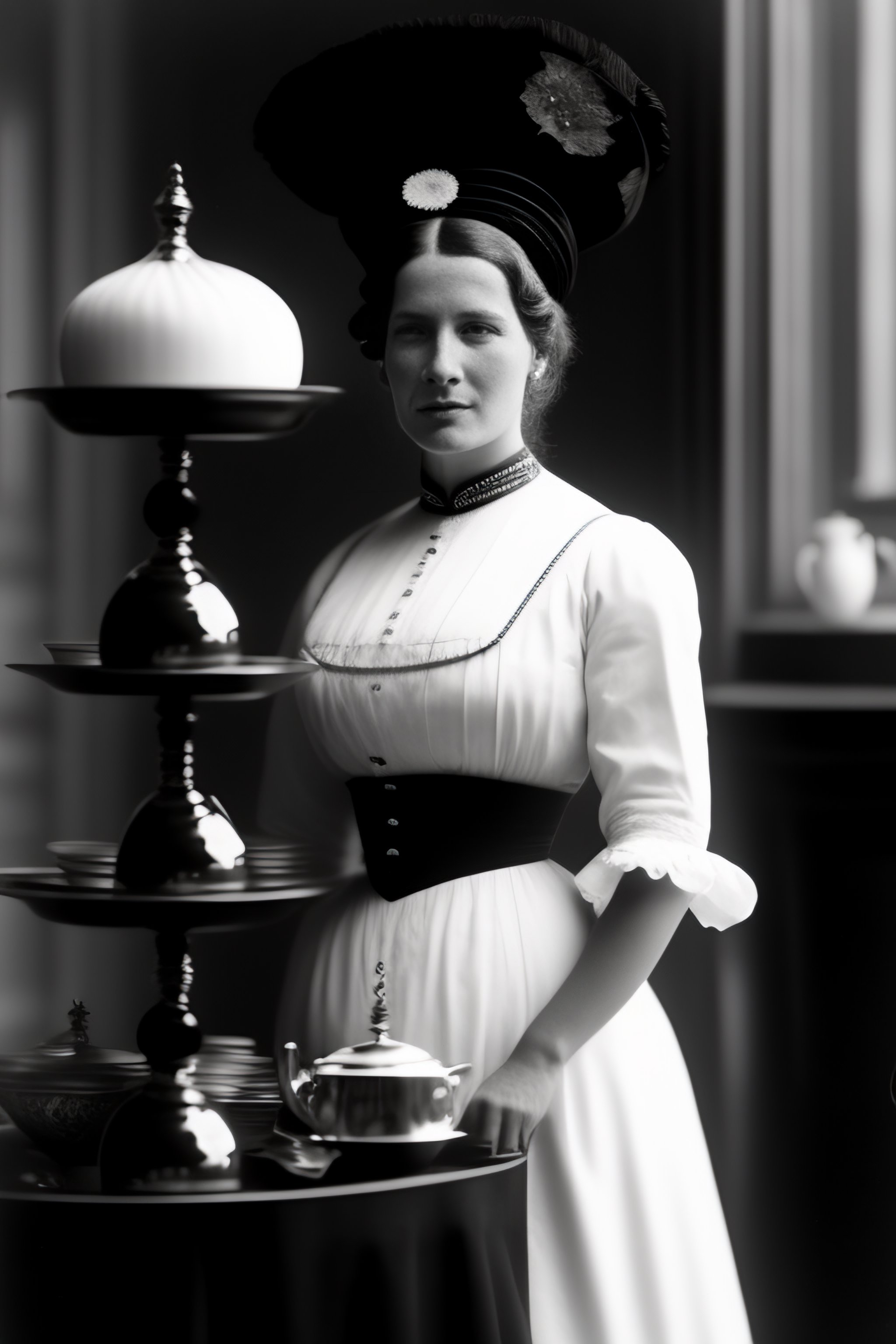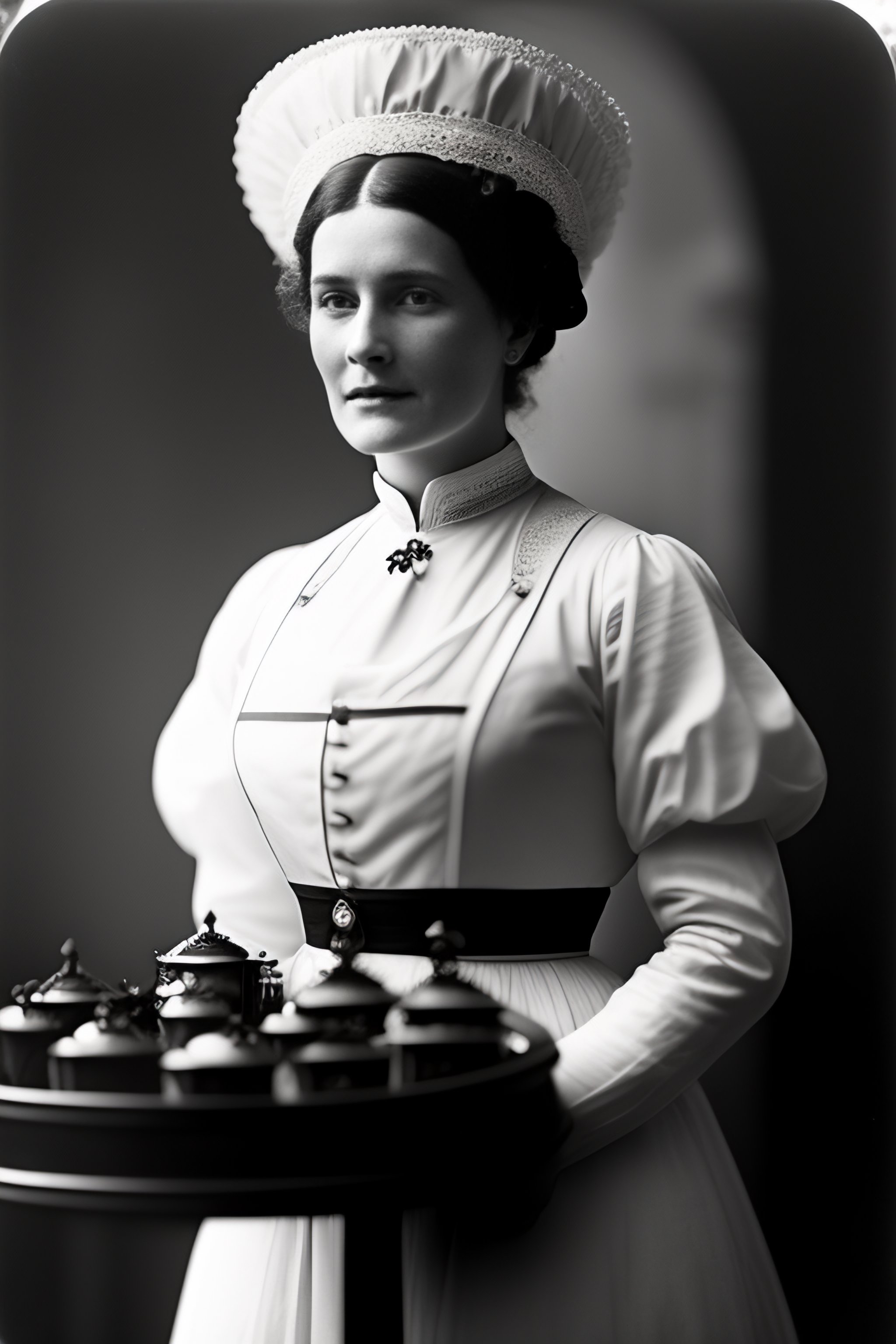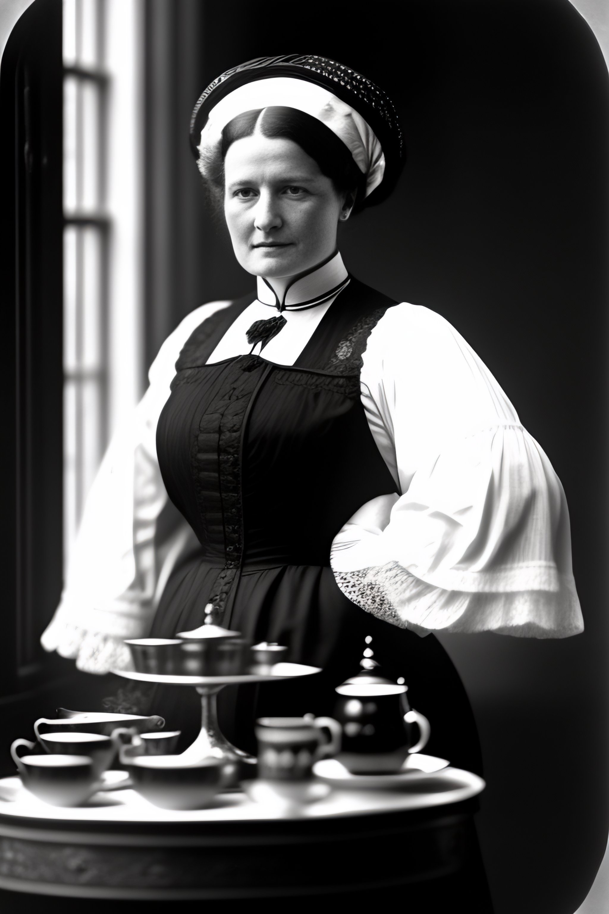 1910 grainy photograph of an edwardian maid with a black dress and a white apron and a small white bonnet on her head standing next to a tea trolley