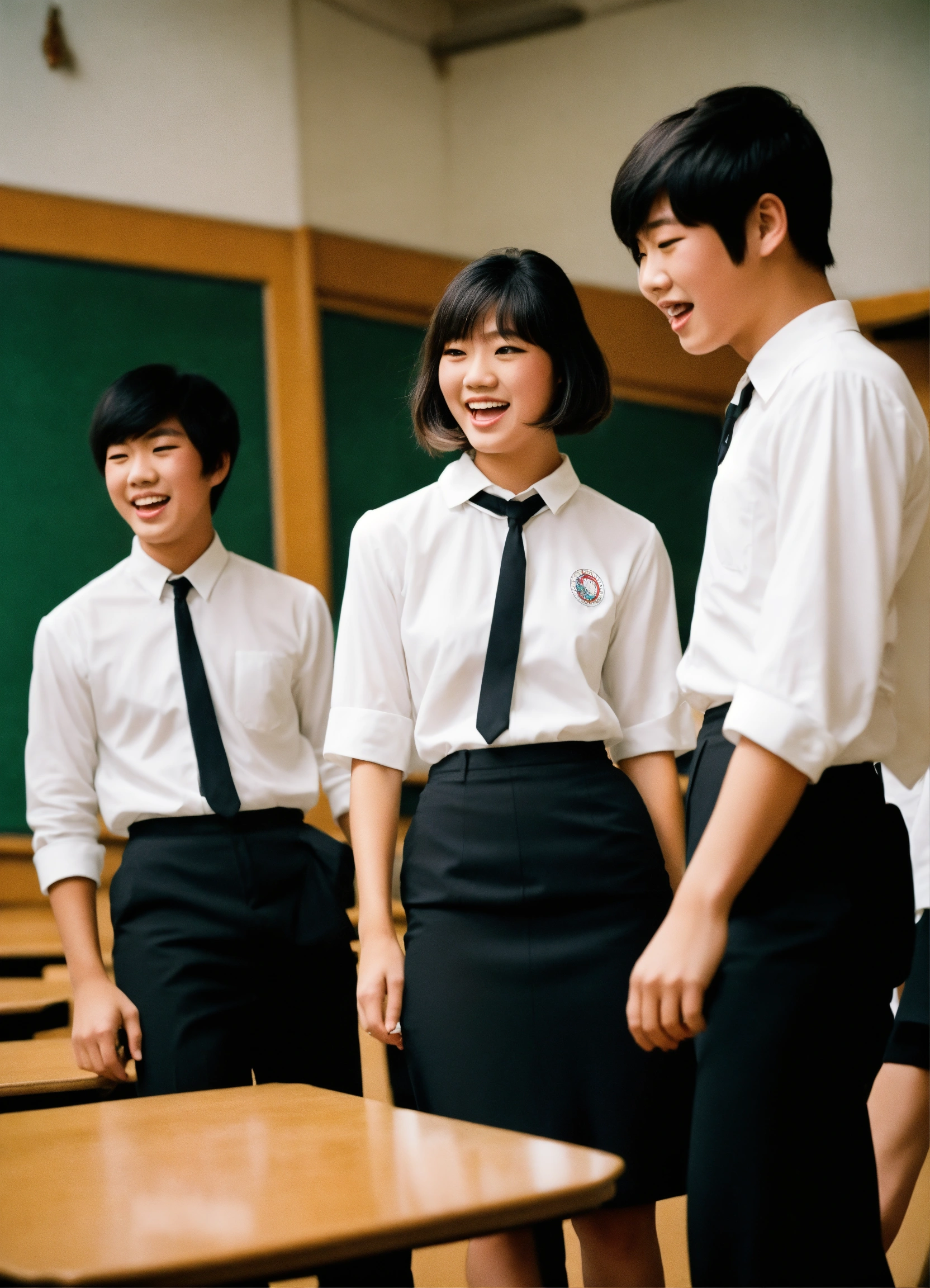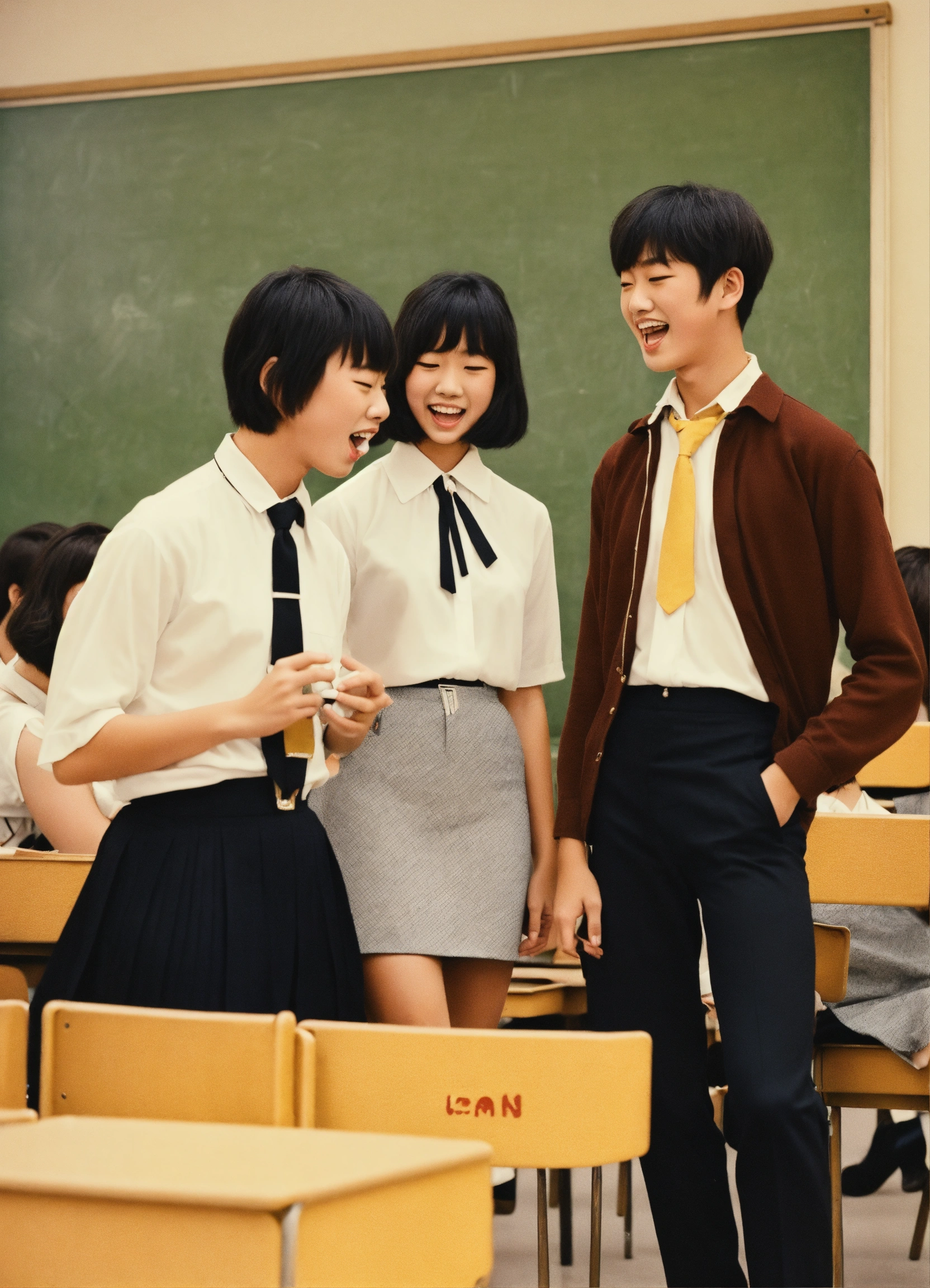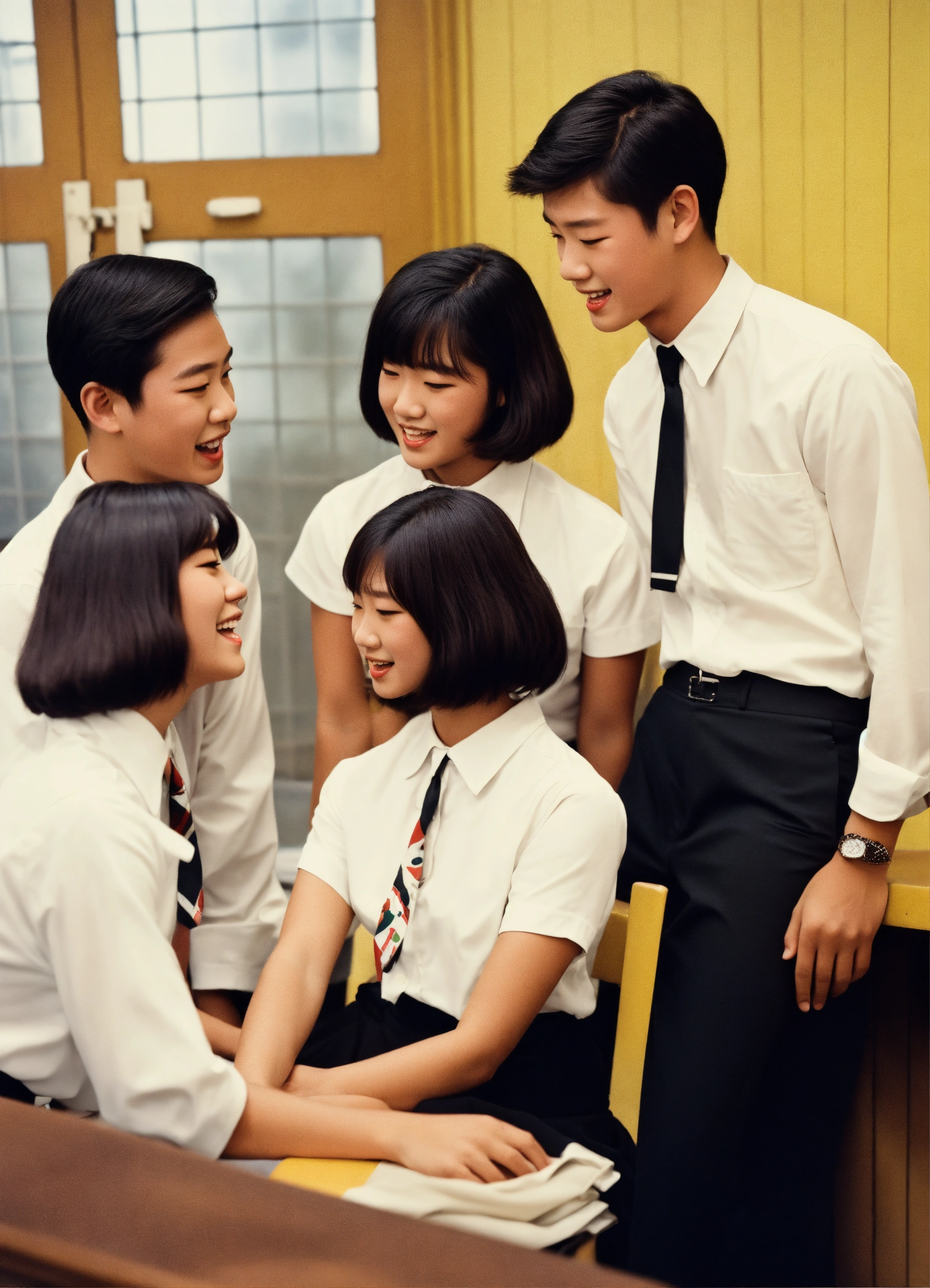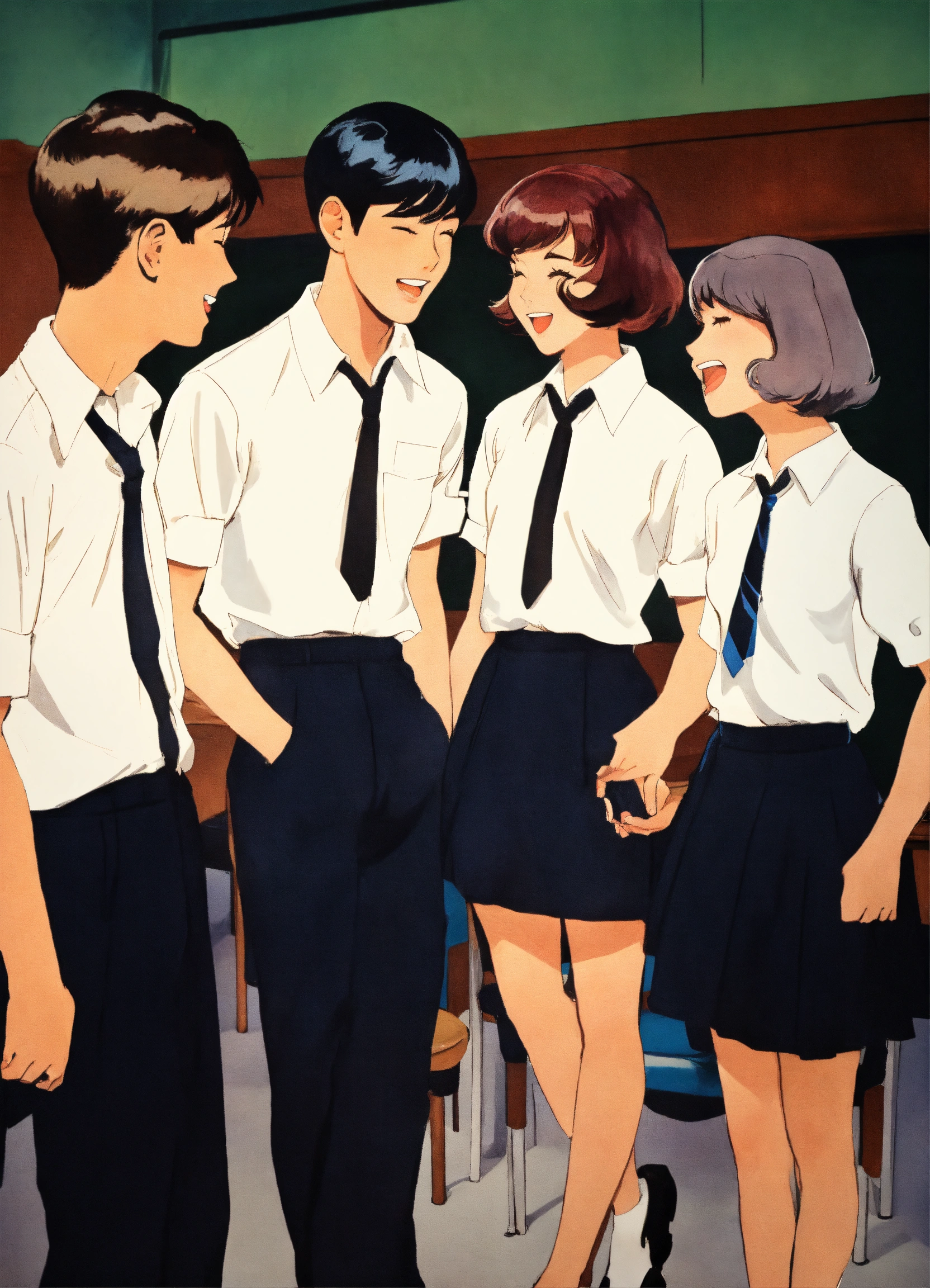 2 male and 2 female high school seniors in the 1960s, singing circle, delicate, cartoon style, fun, classroom. white shirt and black pants, white blouse and black skirt japanese