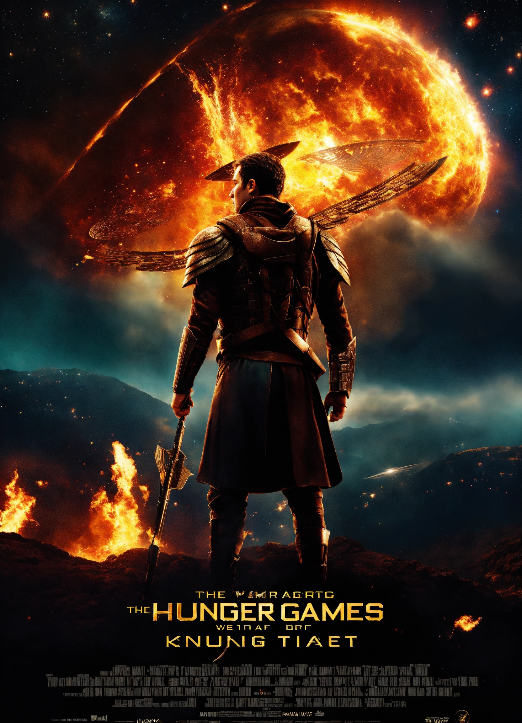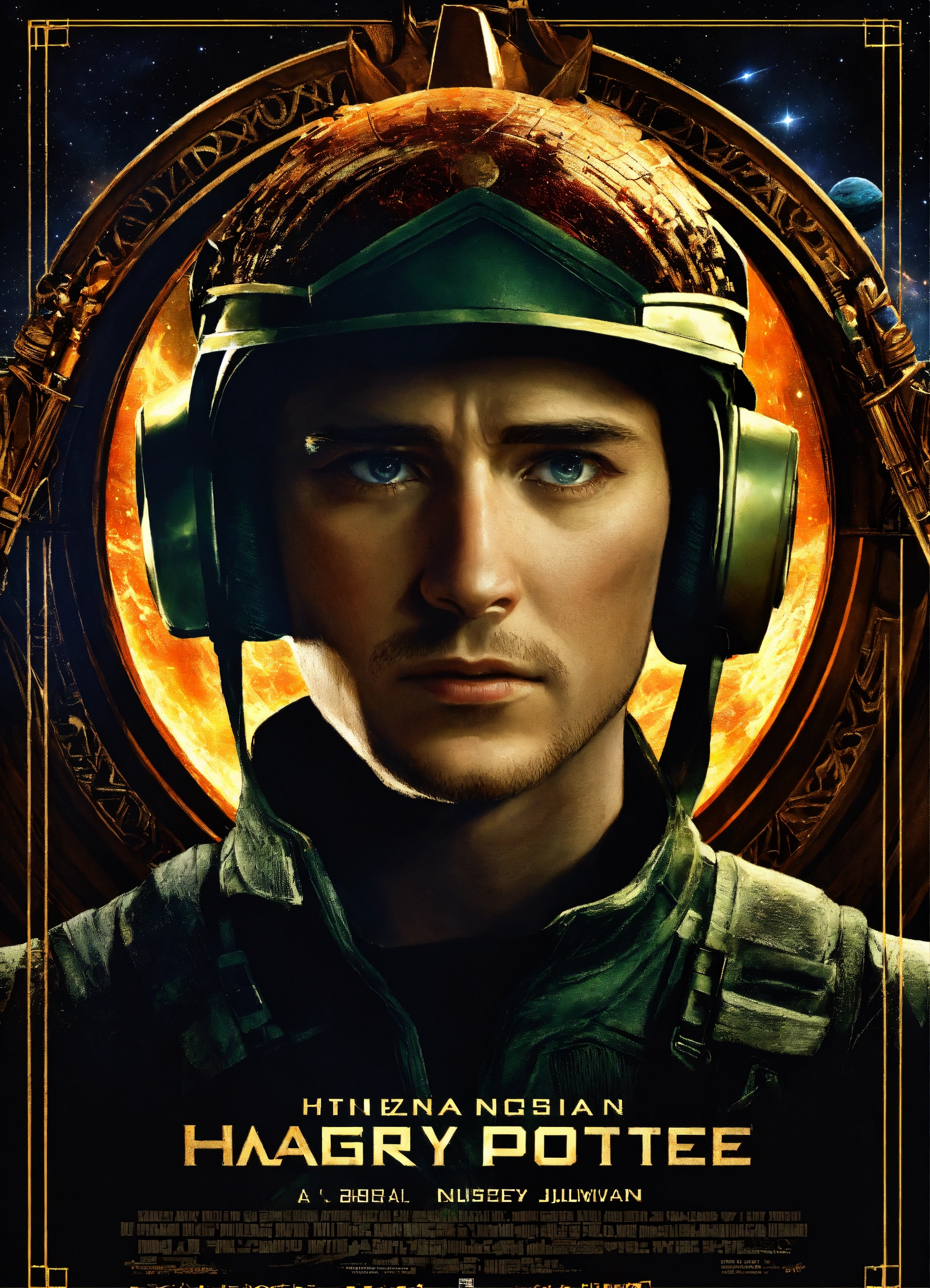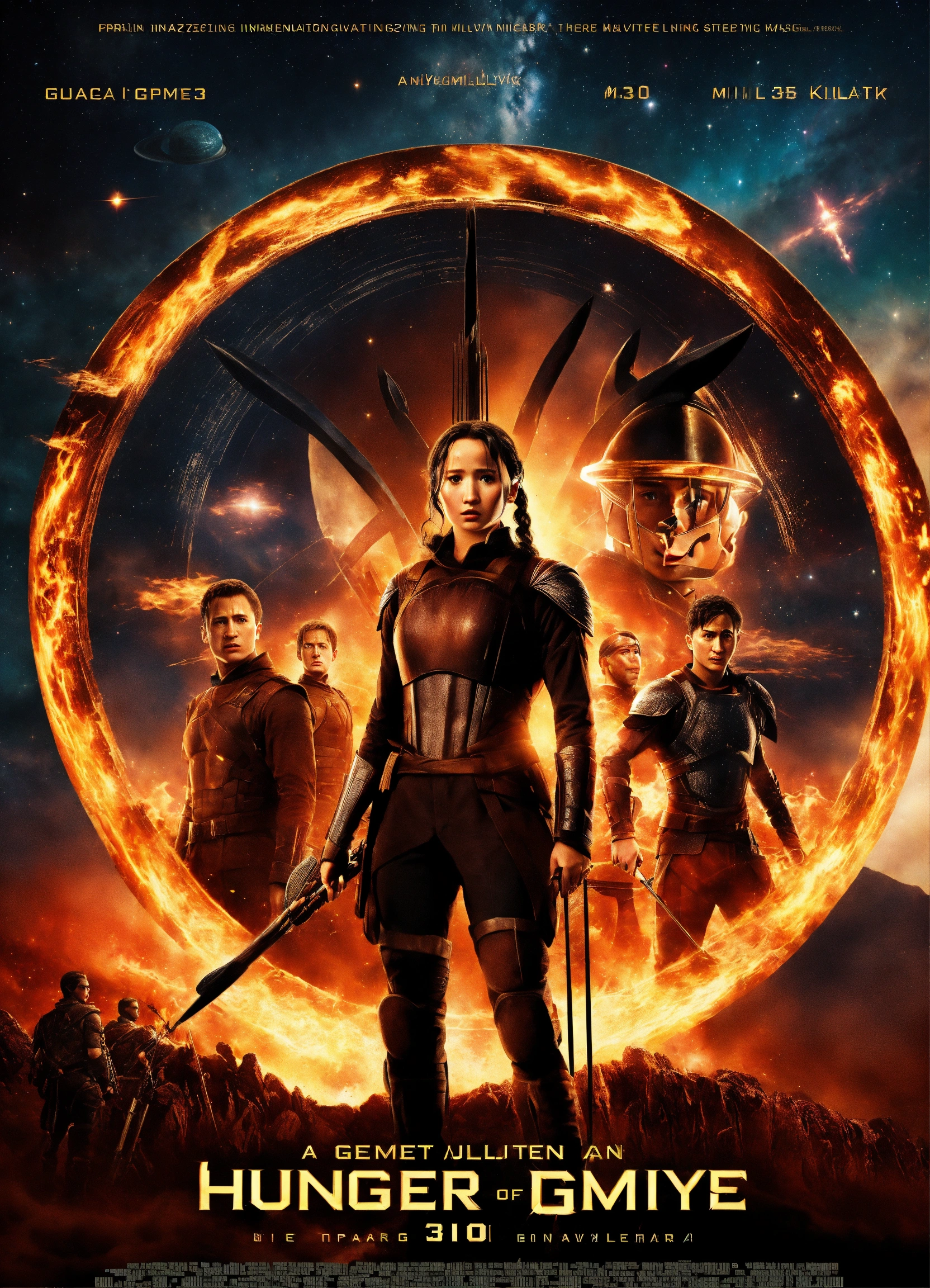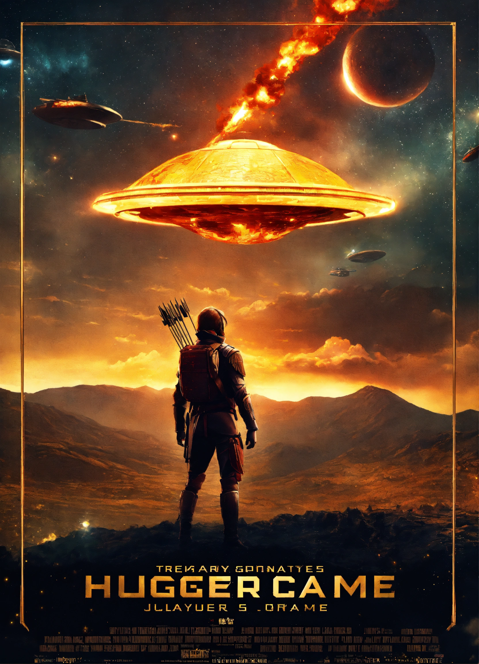 Generate an astonishing and imaginative movie poster that combines the worlds of 'hunger games, ' 'harry potter, ' 'kuvayı milliye, ' 'machete bıyık, ' 'julius caesar, ' and '300 spartans, ' set against a backdrop of a starry night sky with a space ufo hovering above, promising an unforgettable cinematic experience