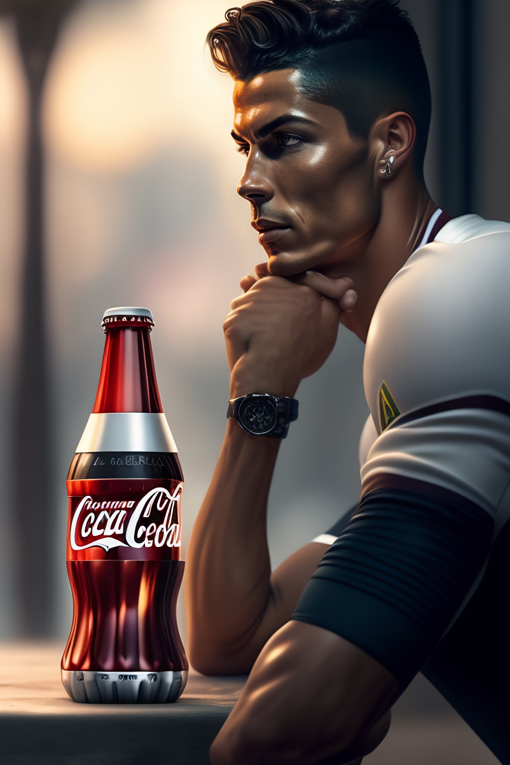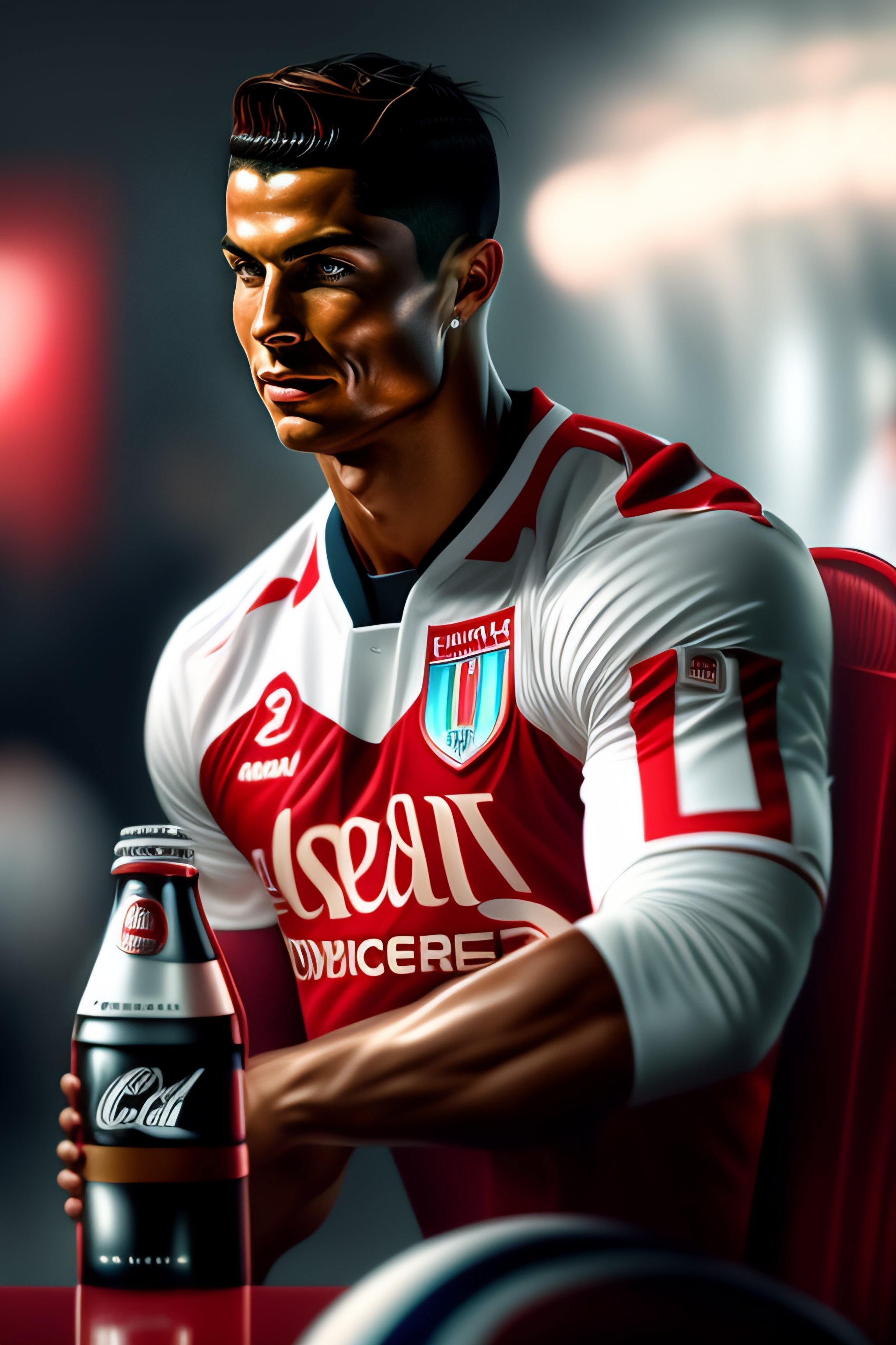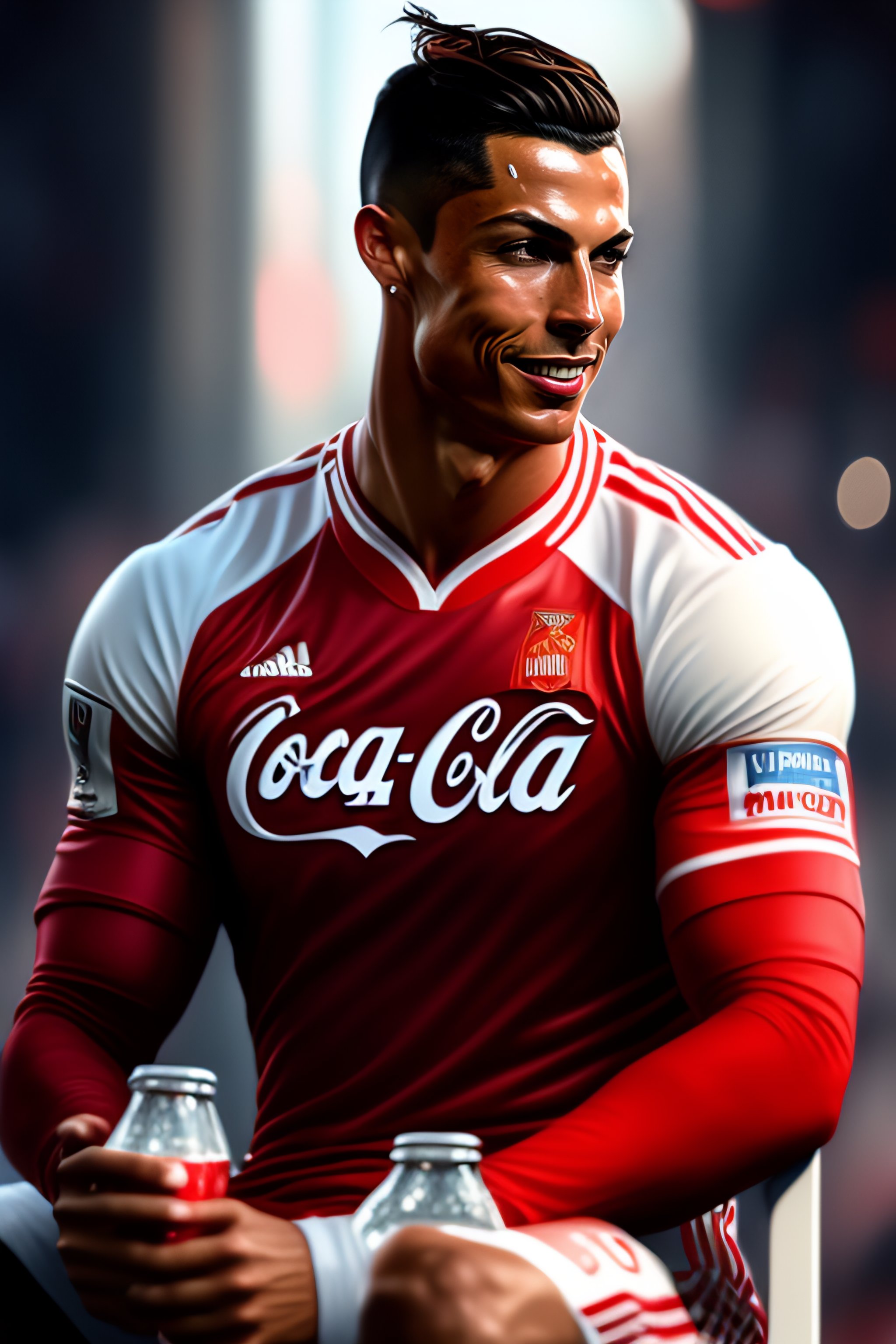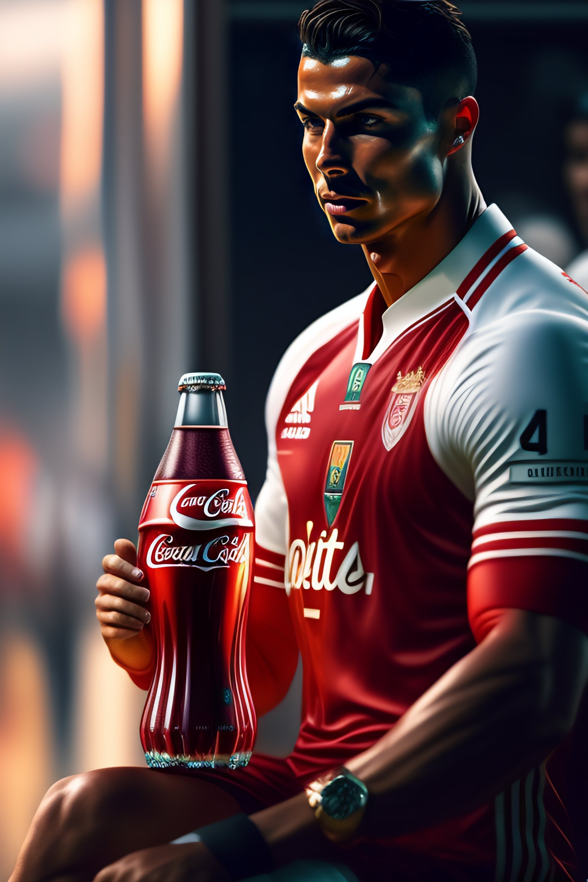 Cristiano ronaldo showing coca-cola in hand, 4k, coca-cola, sitting at a chair, trash water bottle, highly detailed, digital painting, art stations, concept art, smooth, sharp focus, illustration, unreal engine 5, 8 k, art by and greg rutkowski and alphonse mucha