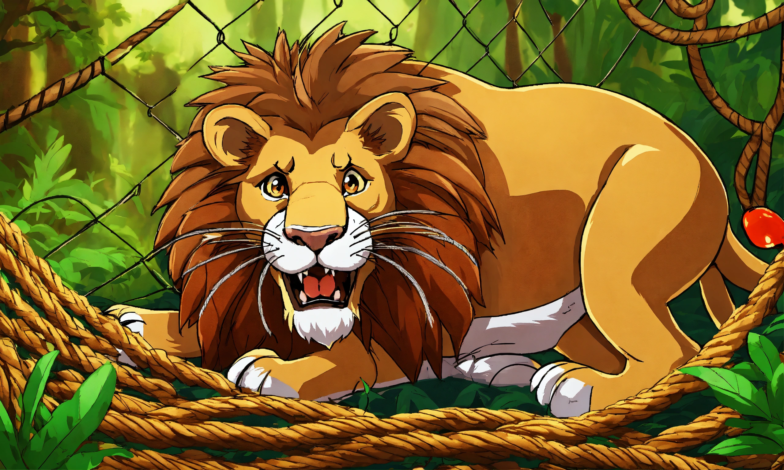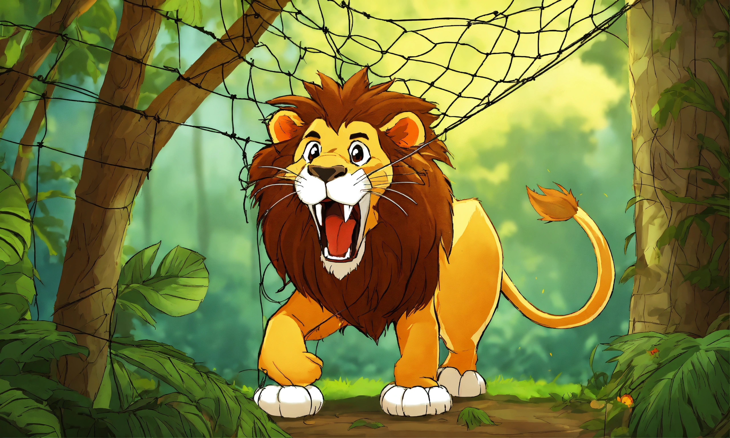 Cartoon big lion was captured and trapped in a net and hang to the tree and with mouse sharp teeth, the mouse nibbled through the net in jungle