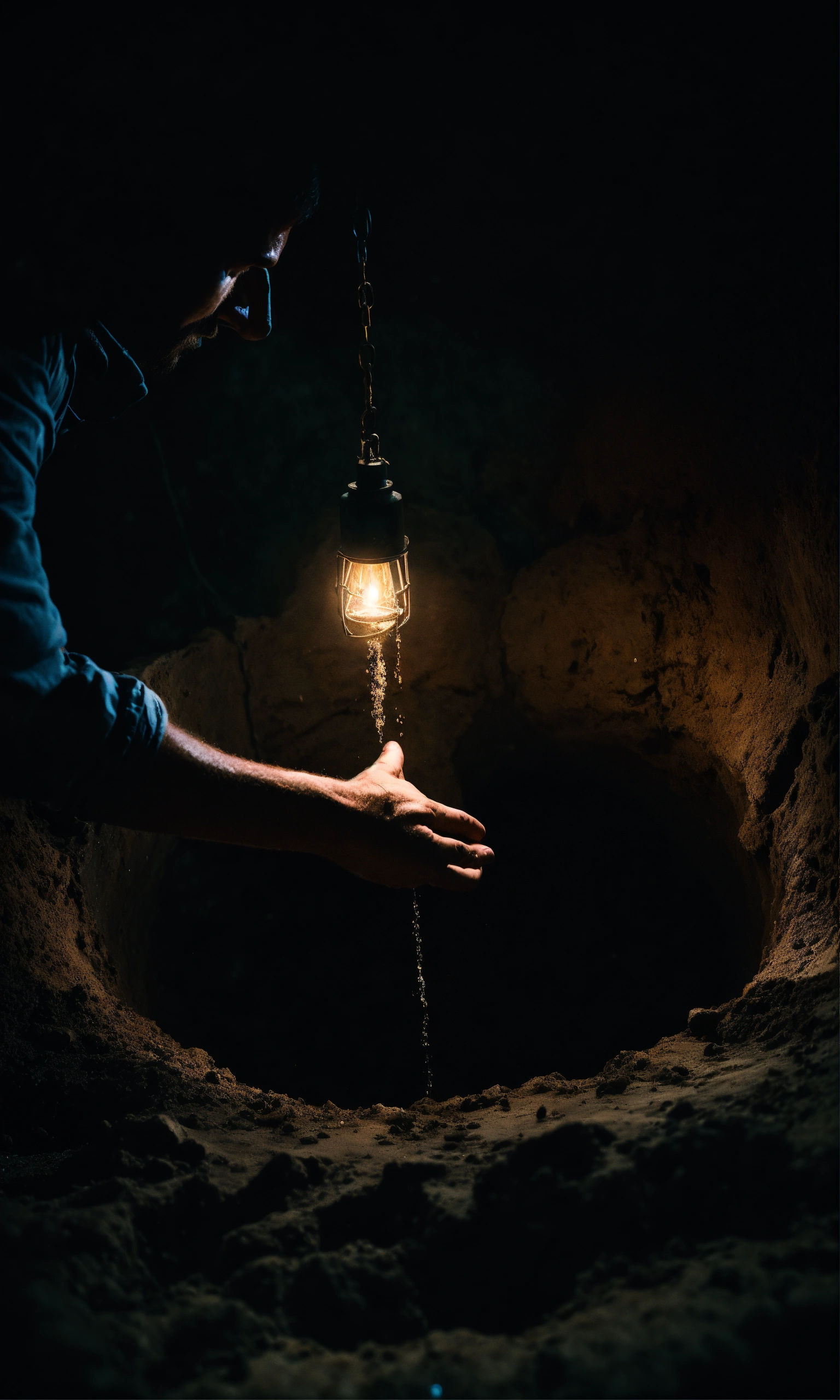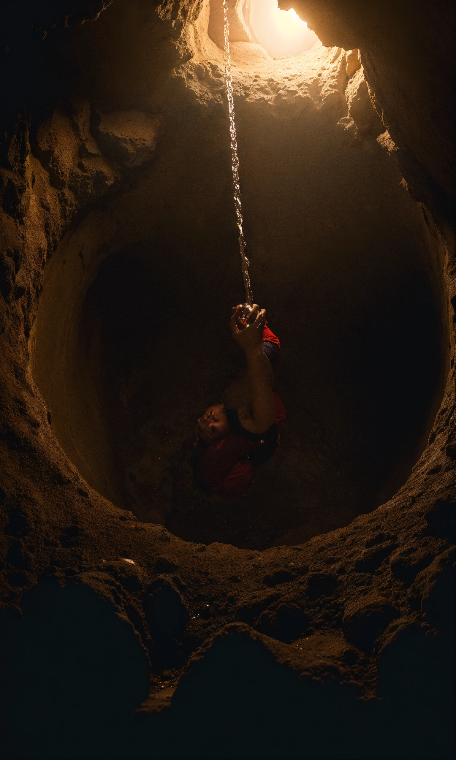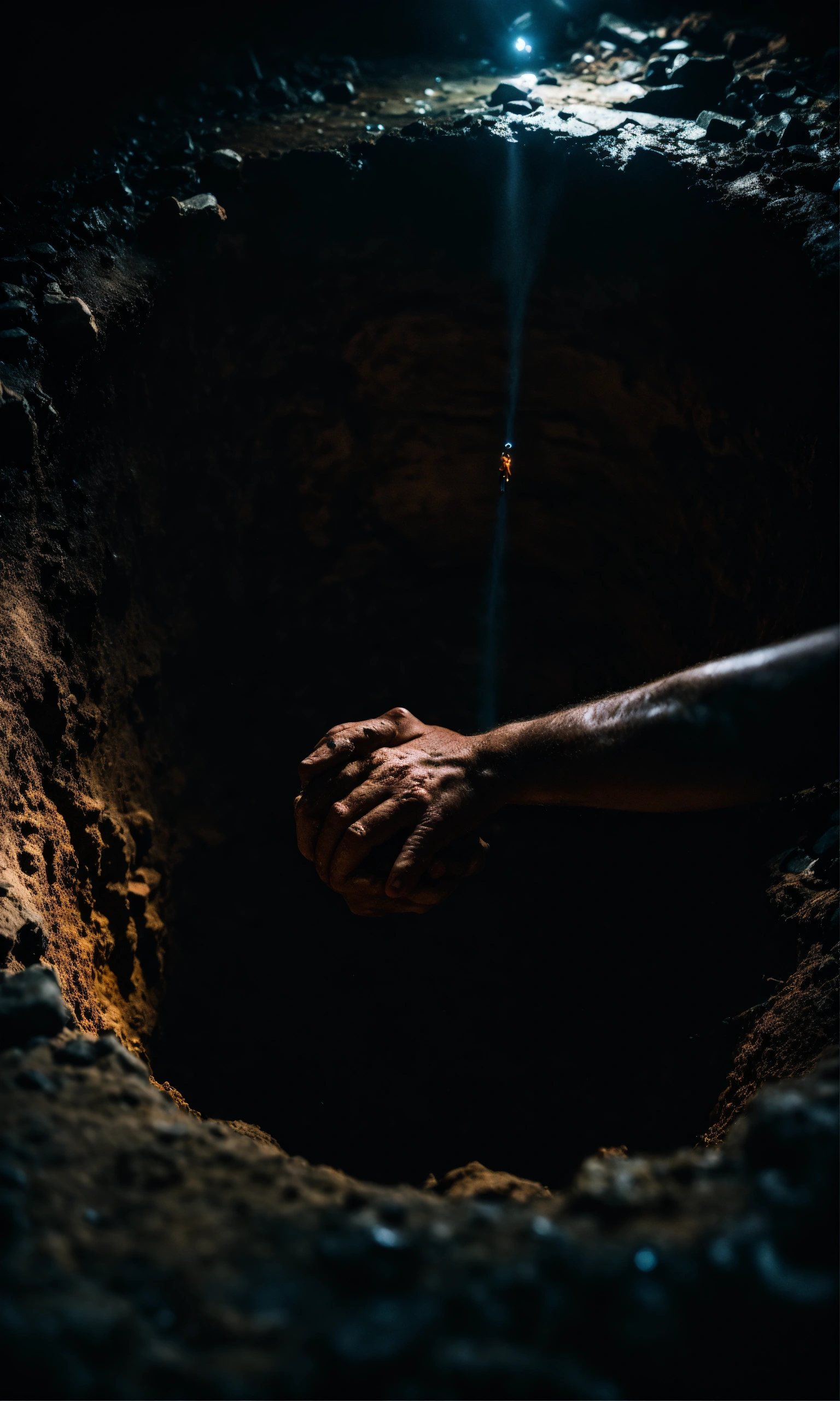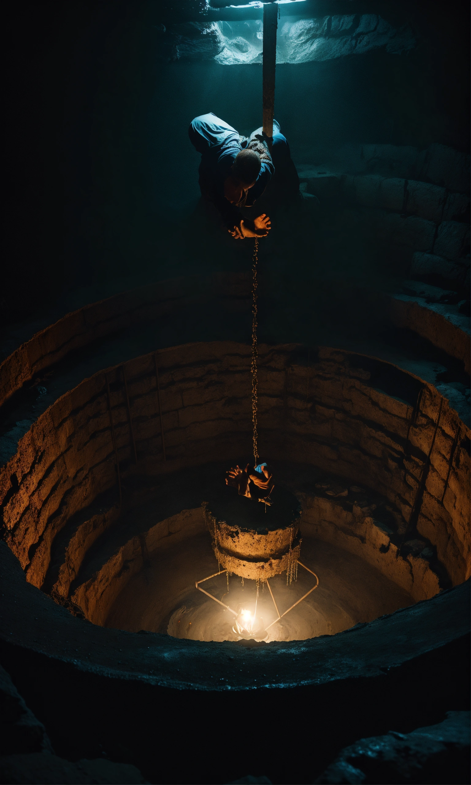 Extended hand in a deep well trying to help a despaired man at the bottom of the pit, light from the top, surreal photo, fujifilm xt3, dark lighting, raw photo, 8k uhd, unreal engine 5, ray trace