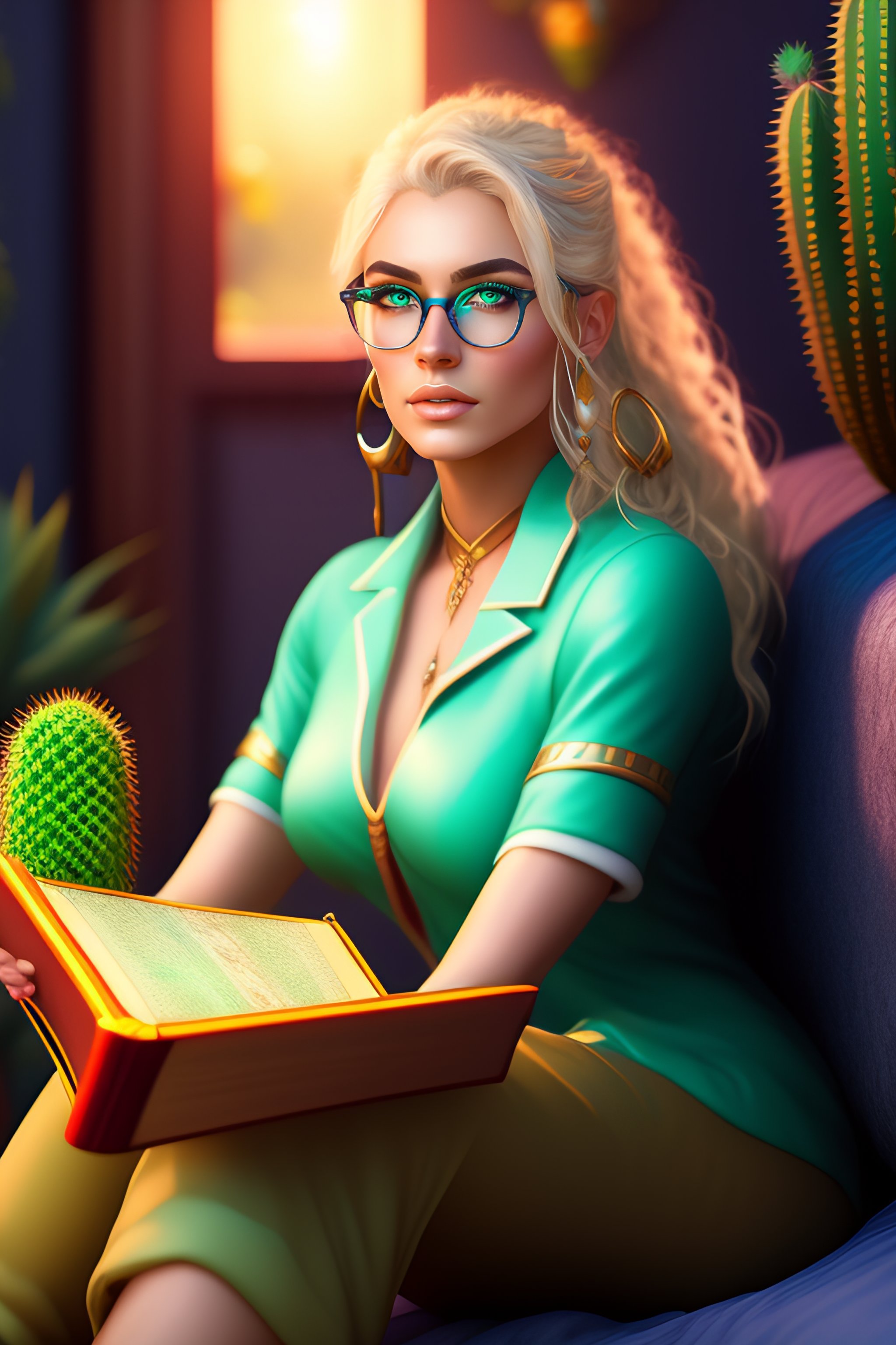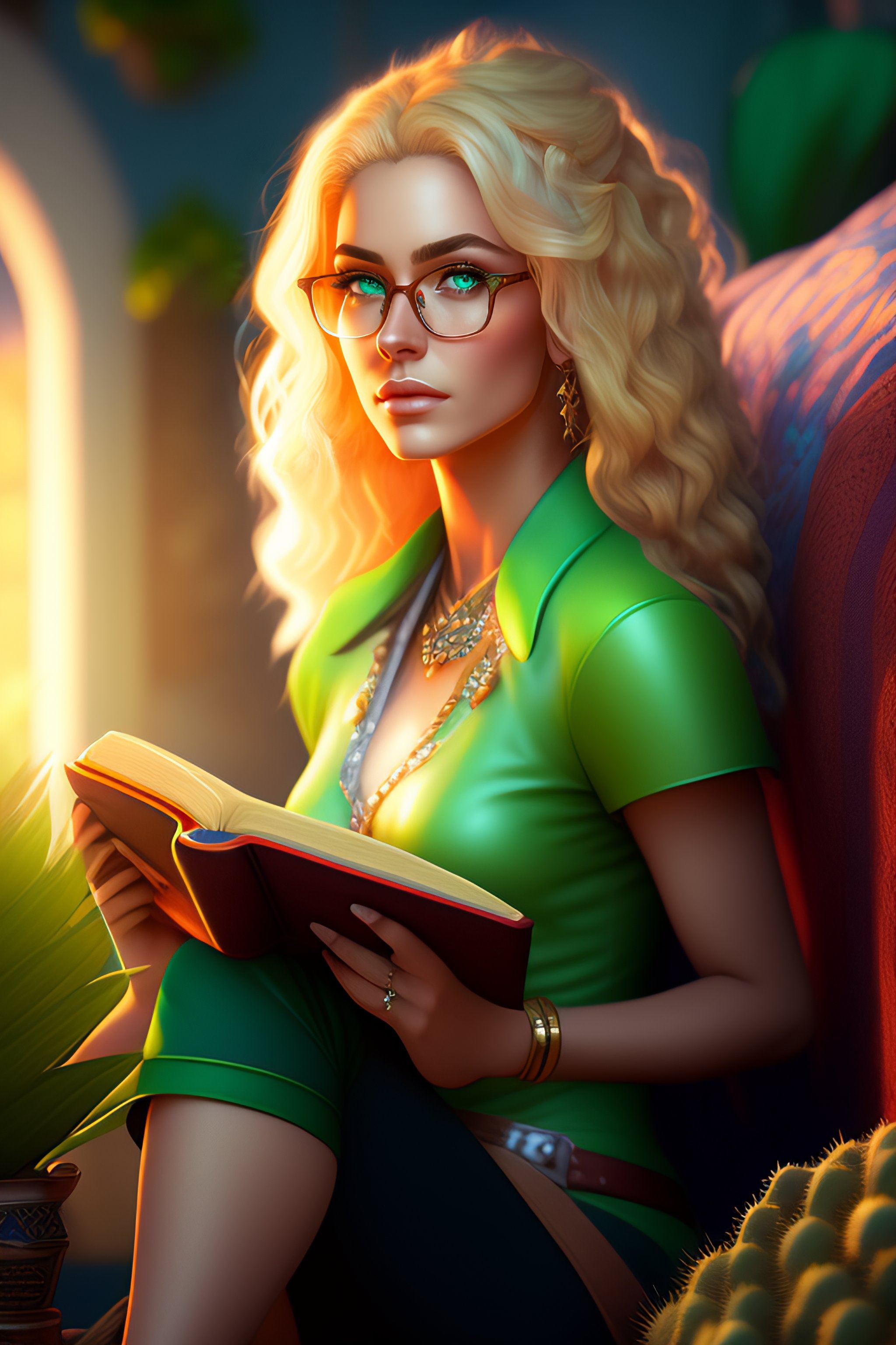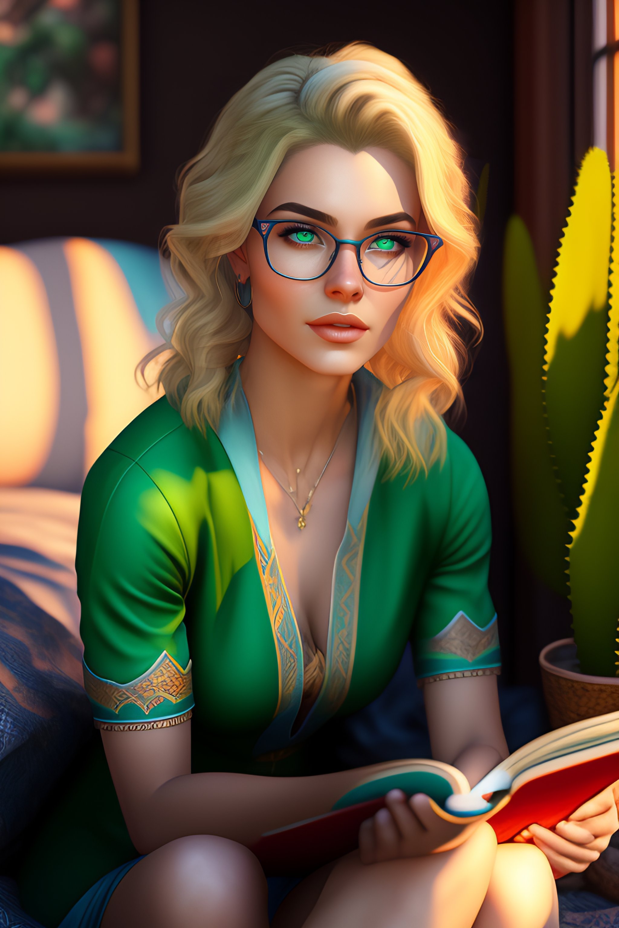 An epic fantasy comic book style portrait painting of a woman, very expressive, reading a book, light blue piercing eyes, round face, glasses, blonde medium hair, wearing a green shirt and comfy pants, sitting on the bed, in a bedroom, with cactus plants in the room, character design by mark ryden and pixar and hayao miyazaki, unreal 5, daz, hyperrealistic, octane render, cosplay, rpg portrait, dynamic lighting, intricate detail, summer vibrancy, cinematic