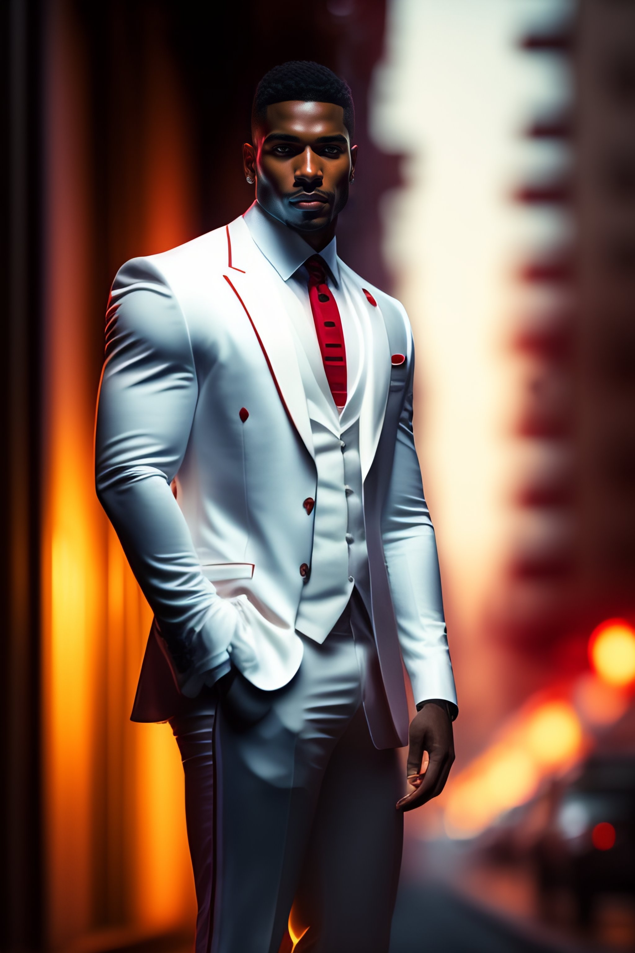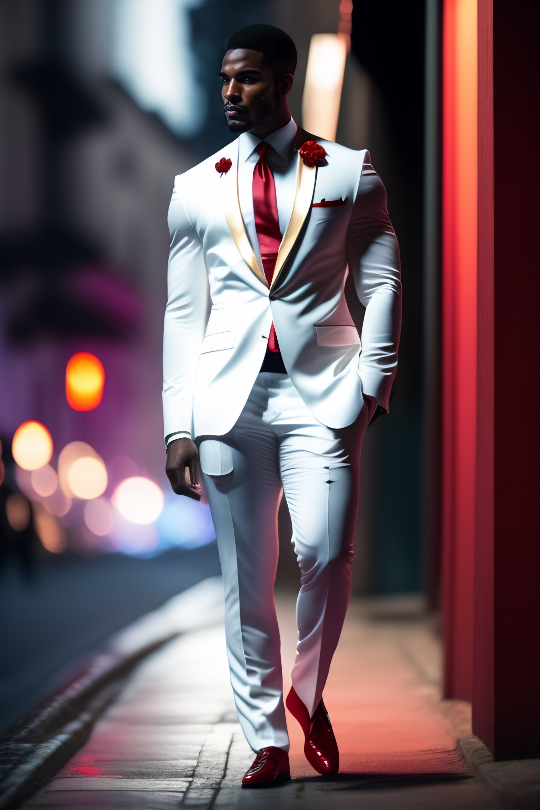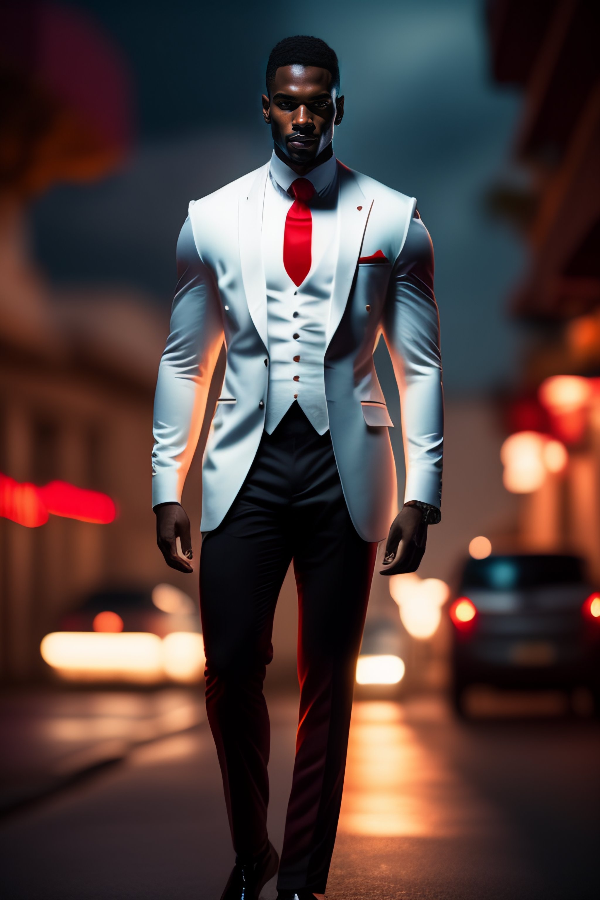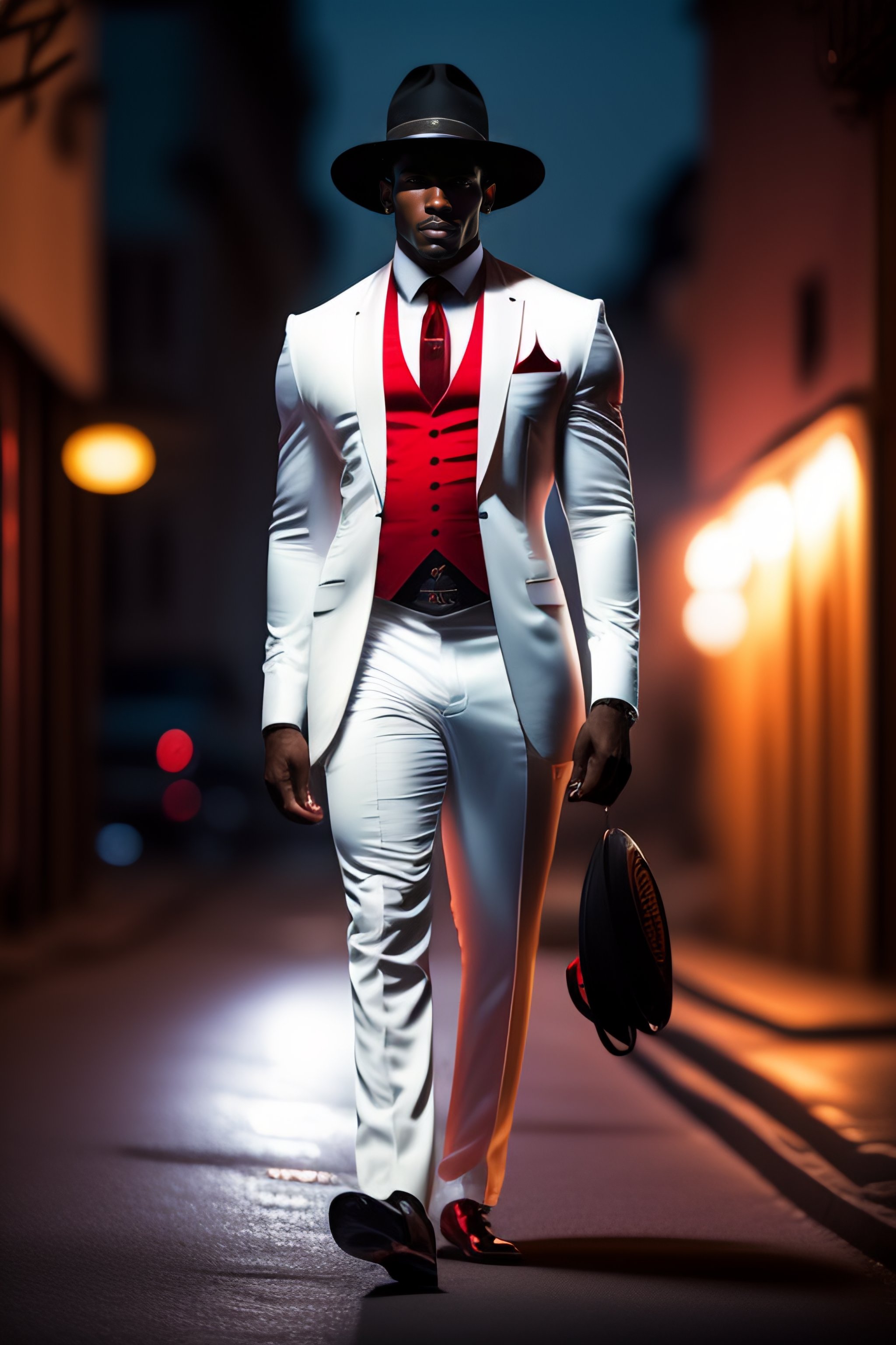 Handsome black brazilian man wearing white suit and red tie, wearing white hat, on street at night, in arcos da lapa rio de janeiro, full body view, greg rutkowski, ultra detailed, volumetric lighting