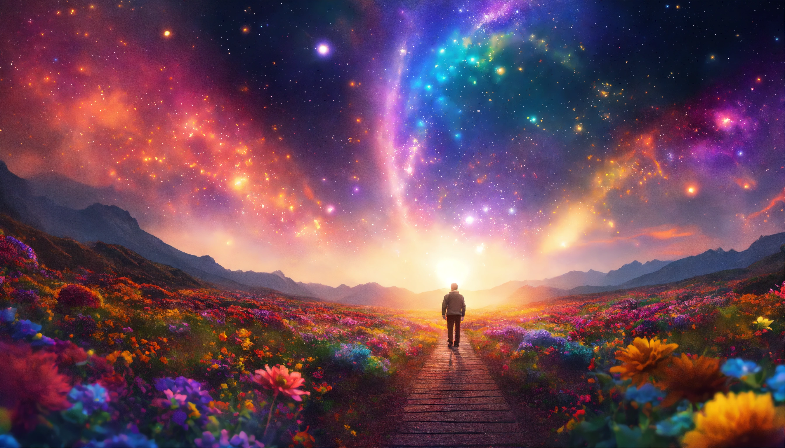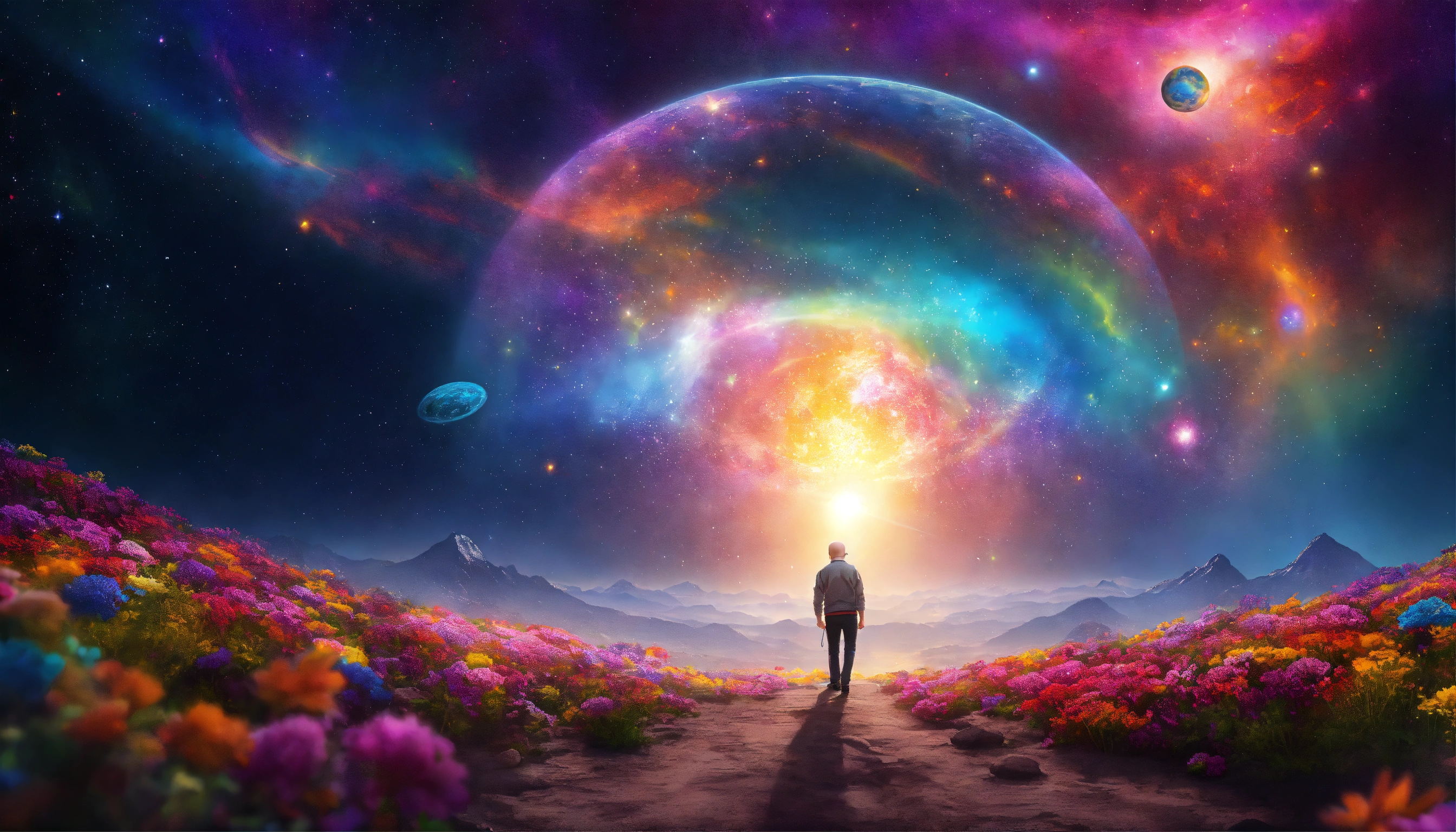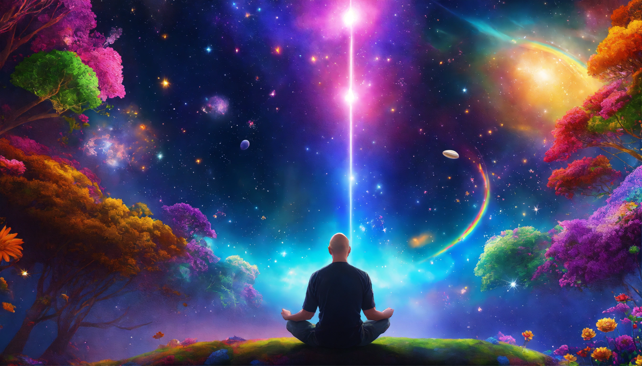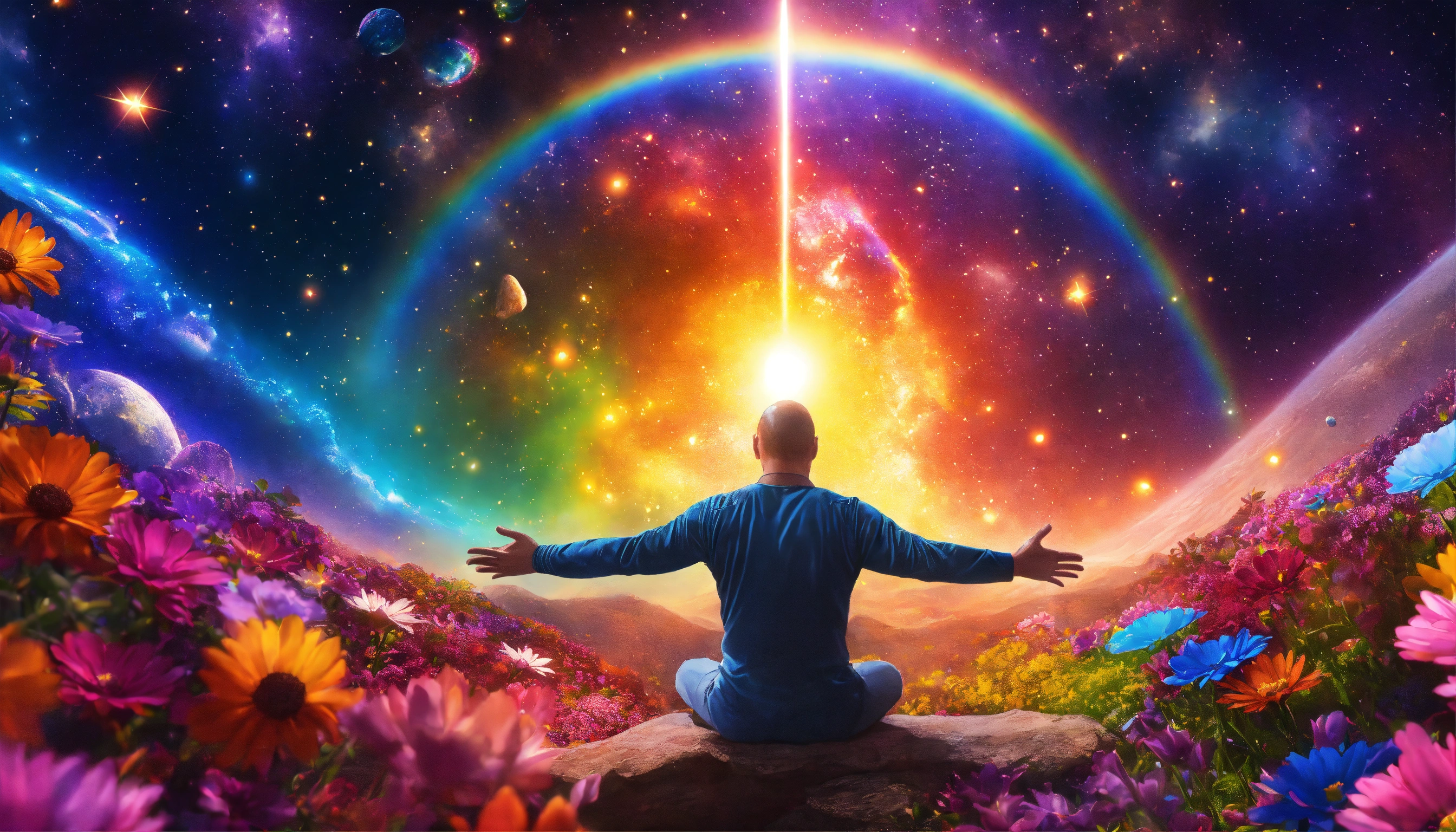 Motivational speaker wayne dyer in space, meditation, cosmic space, exuding enlightenment, bright vibrant colors, flowers everywhere, stars and space, rainbow vibrant colors, vulmetric lighting, 8k resolution, highly detailed
