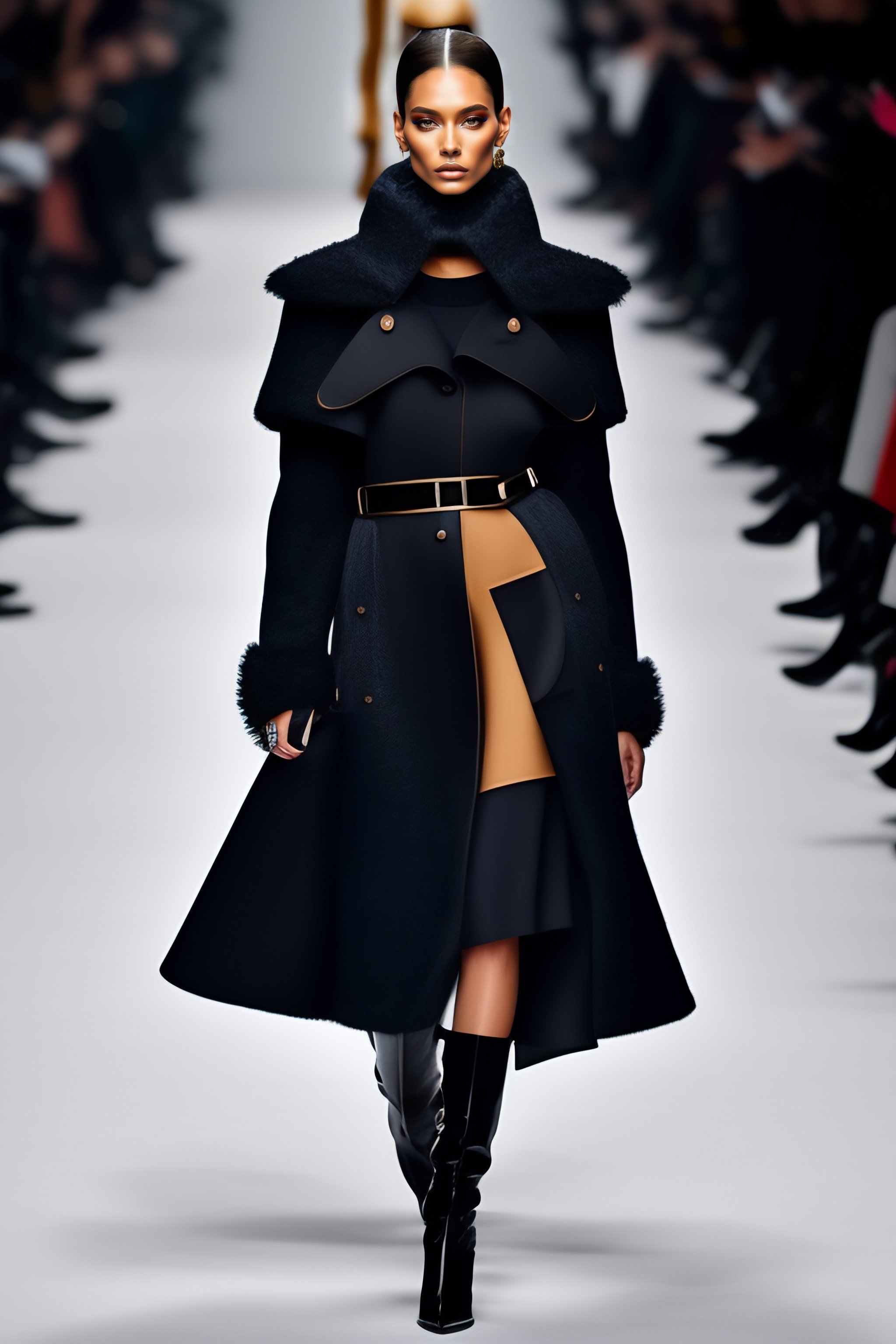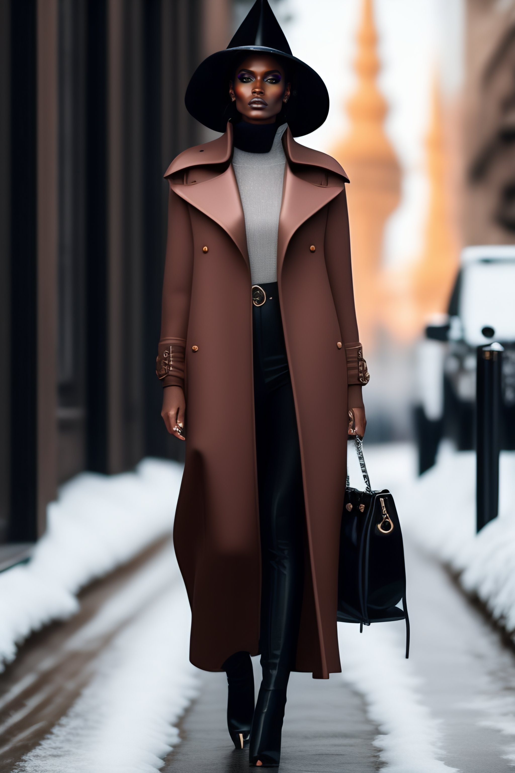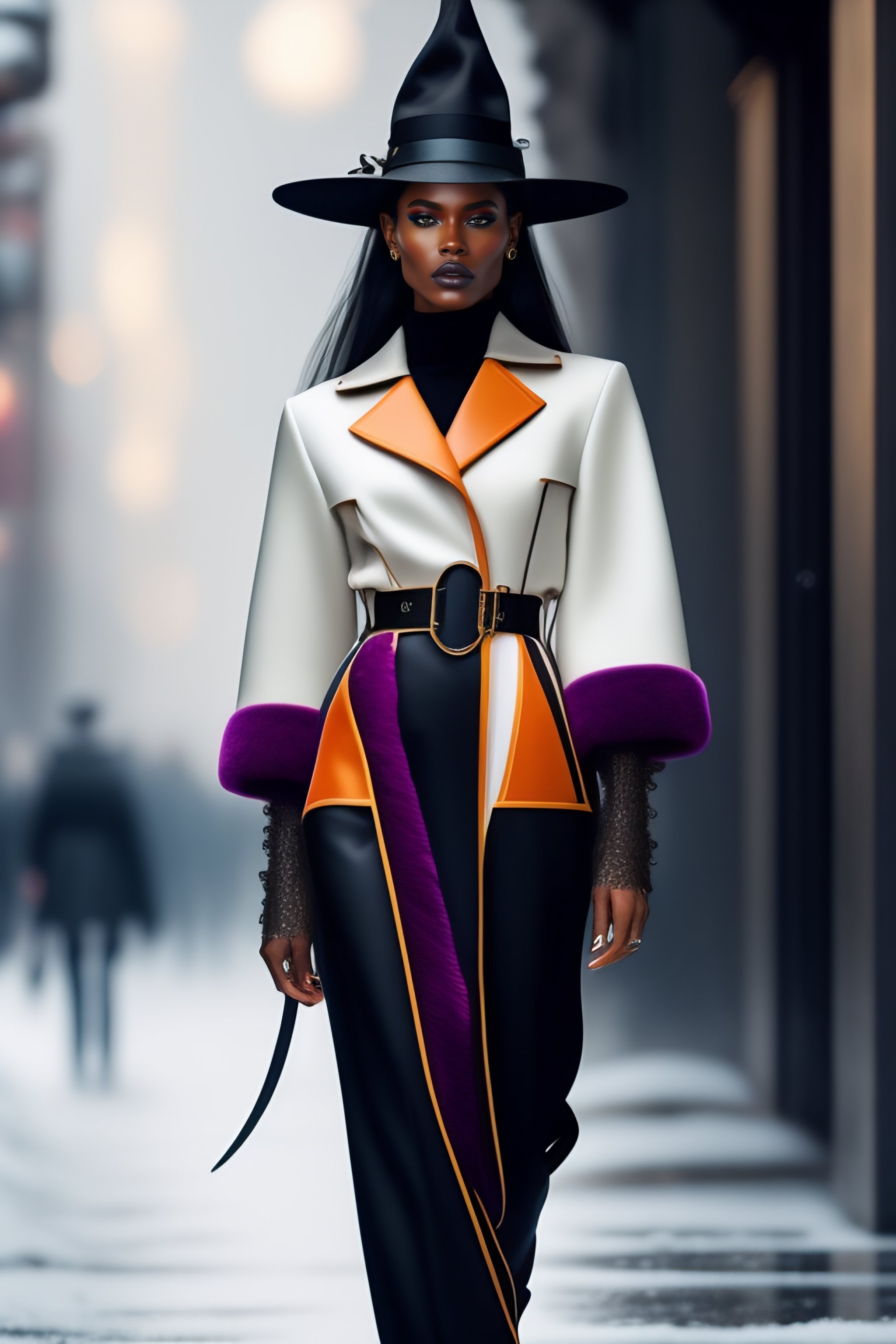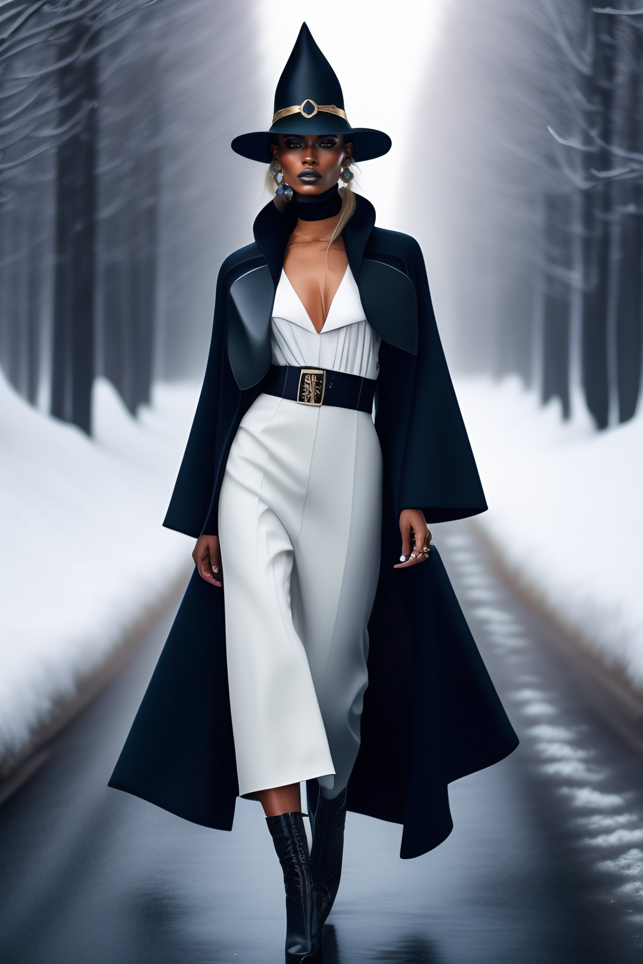 Modern witch outerwear, asymmetrical, avant-garde clothing style, hyperrealism, 3d woman, snow, fashion trends fall-winter 2023, clothes