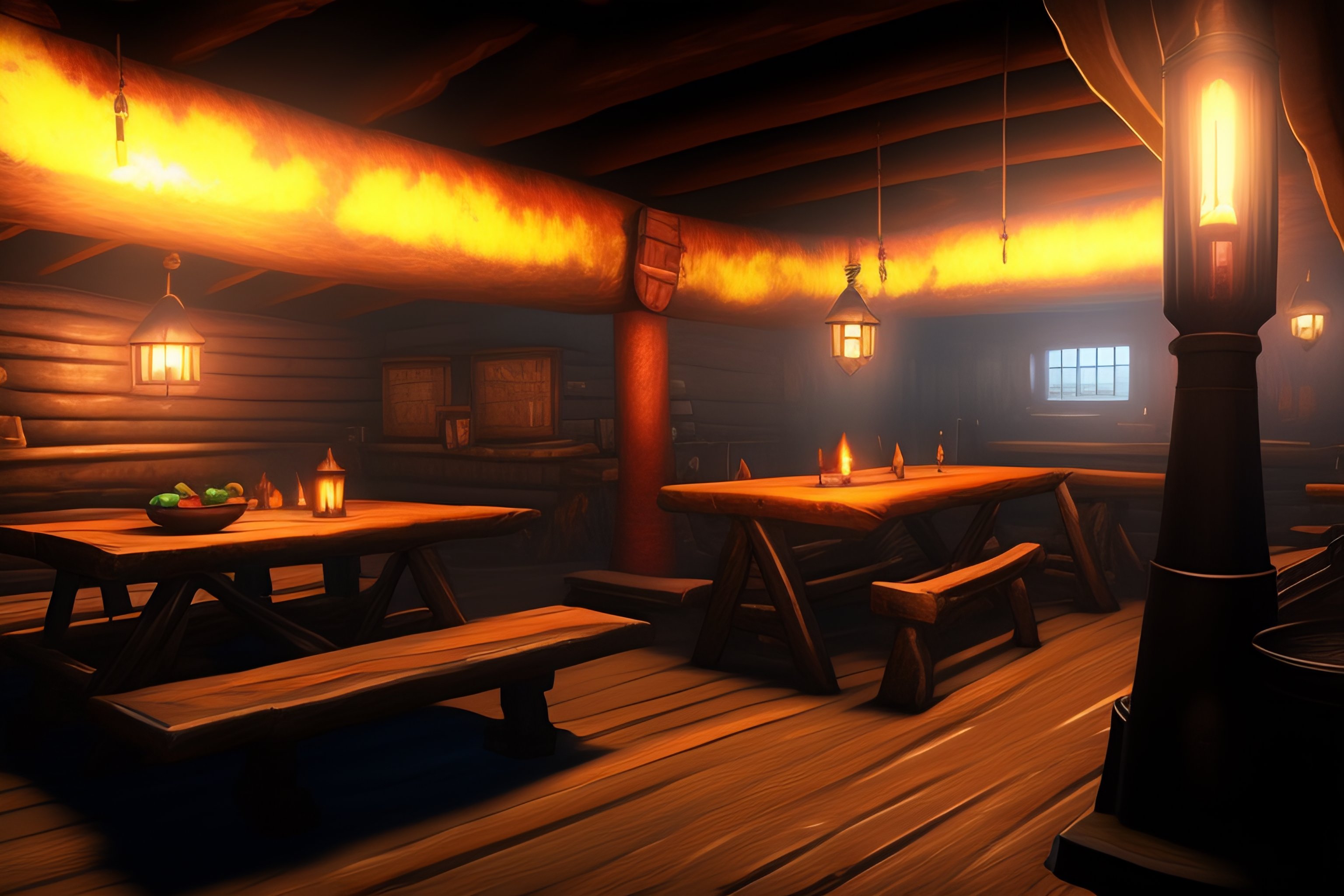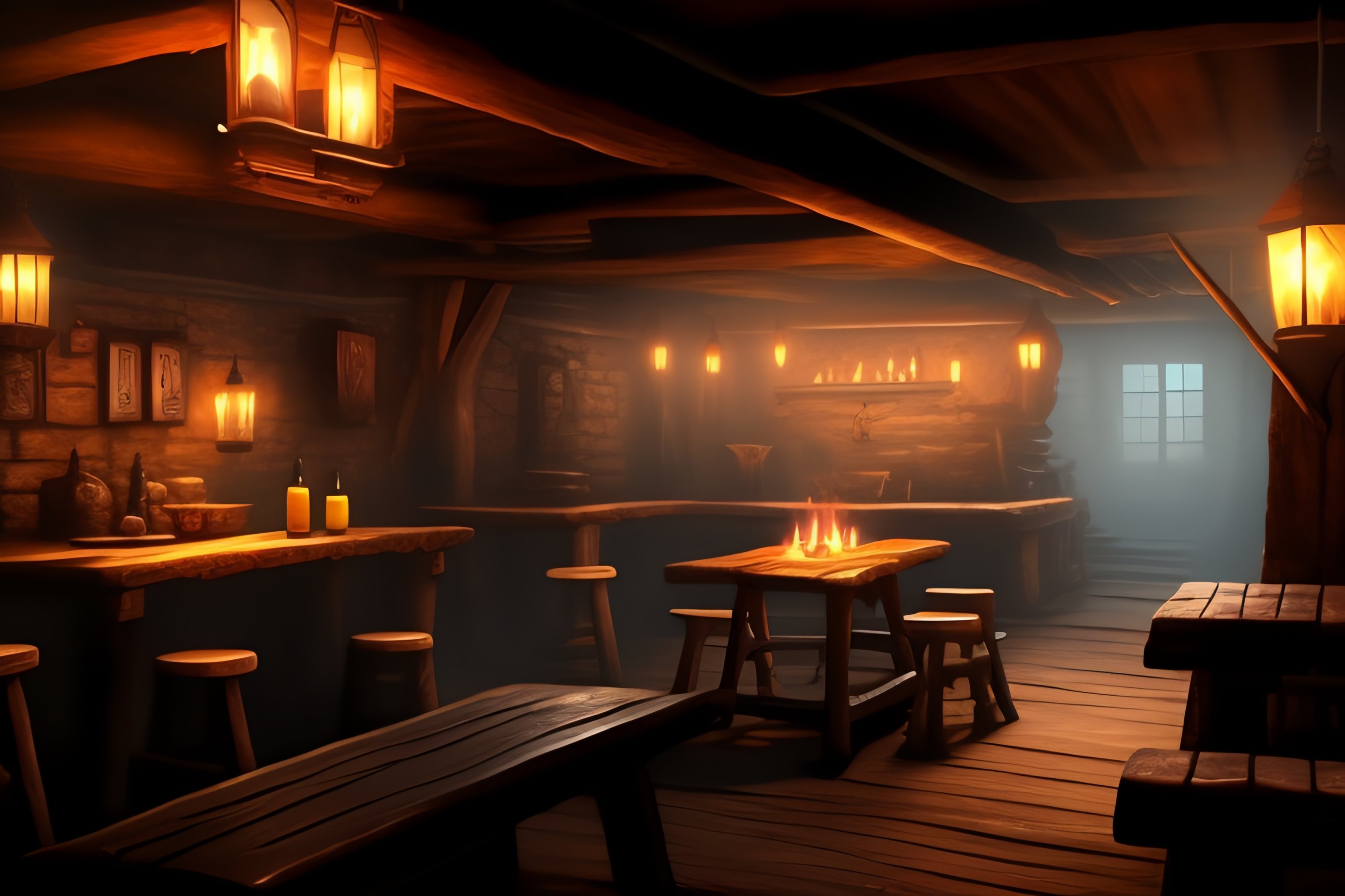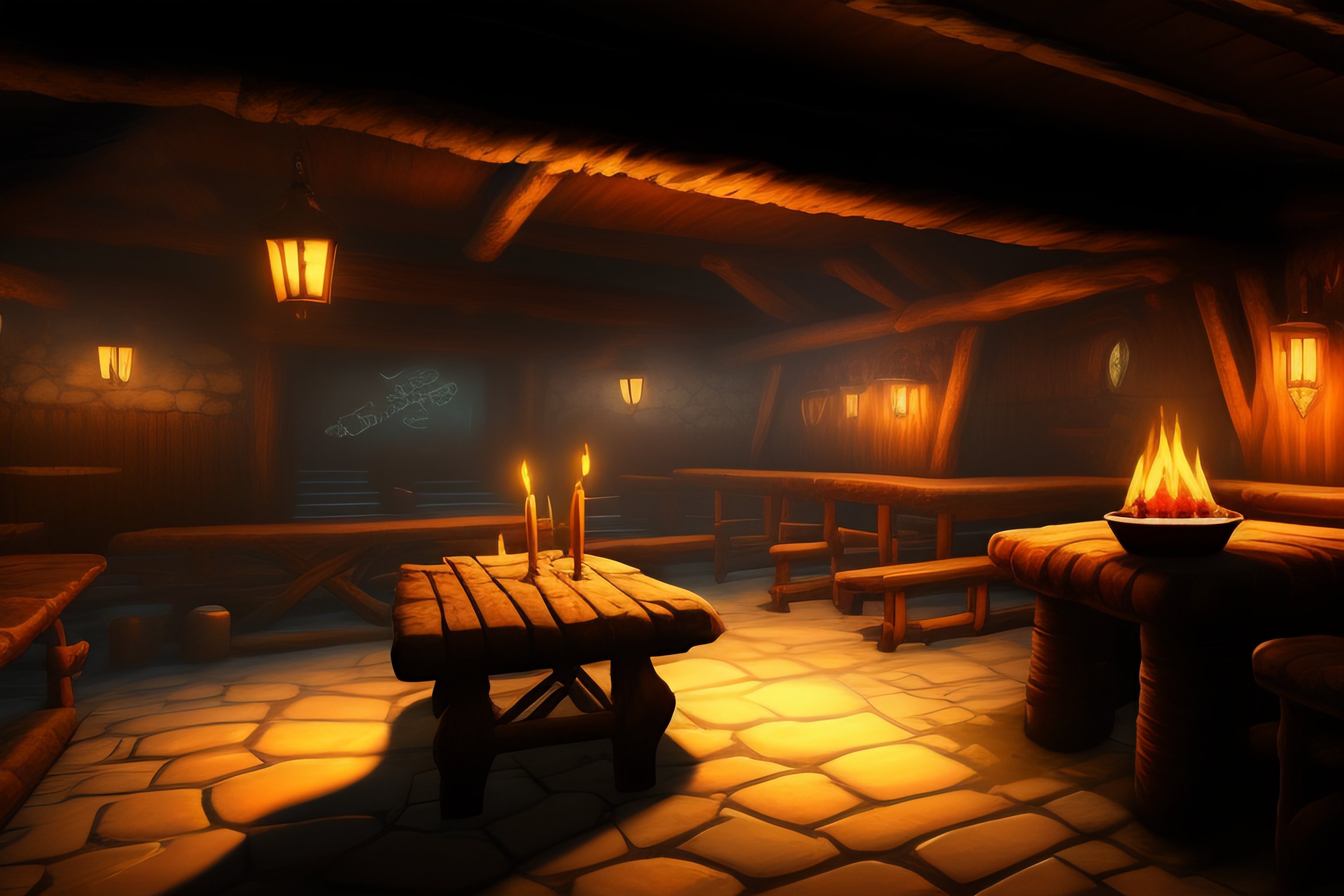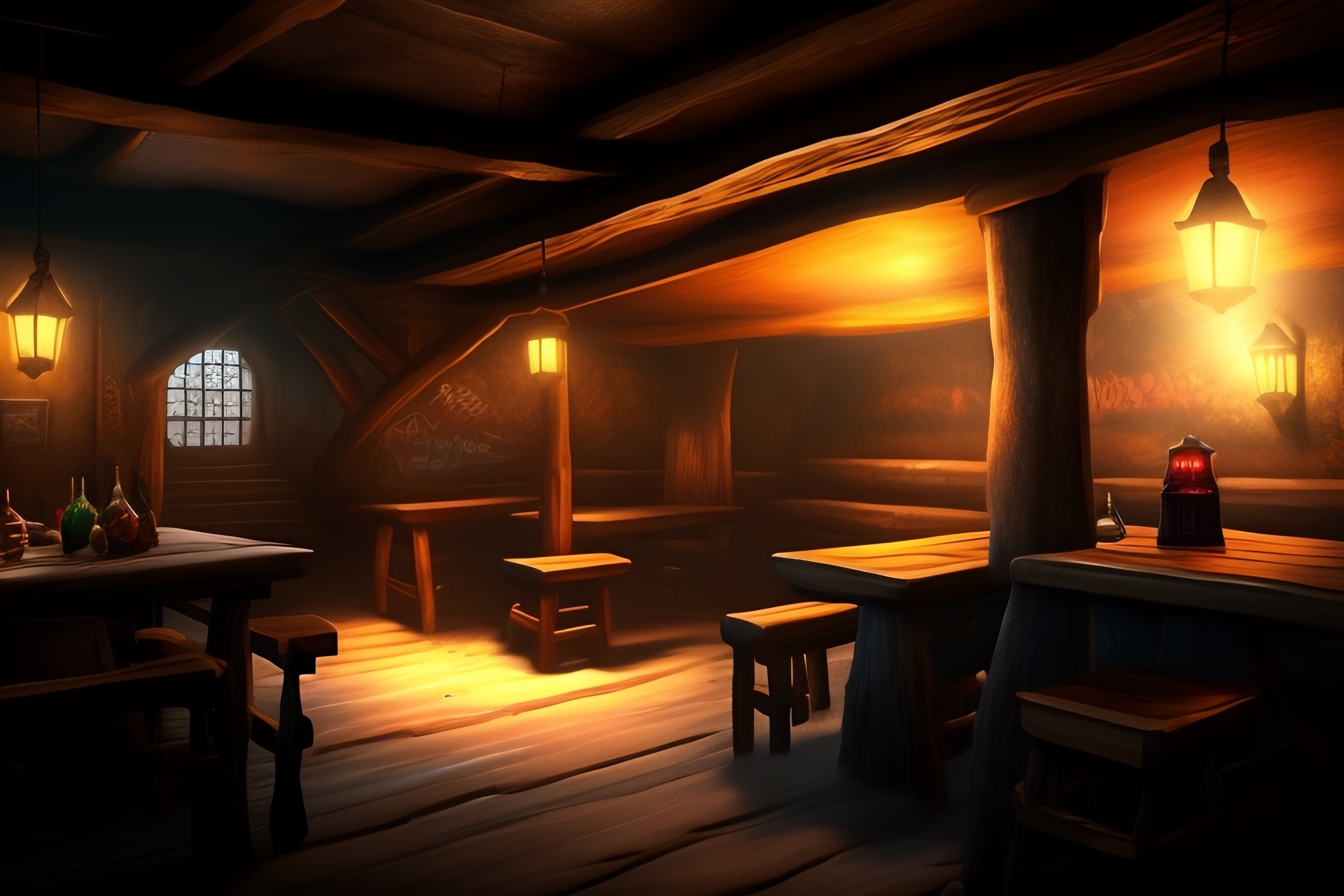 A rough and worn tavern with a dingy, underground feel. the walls are adorned with graffiti and the tables are made from rough-hewn, aged wood. there is a large fireplace in the center of the room, and the lighting is dim and shadowy. there is a sense of danger lurking in the air.