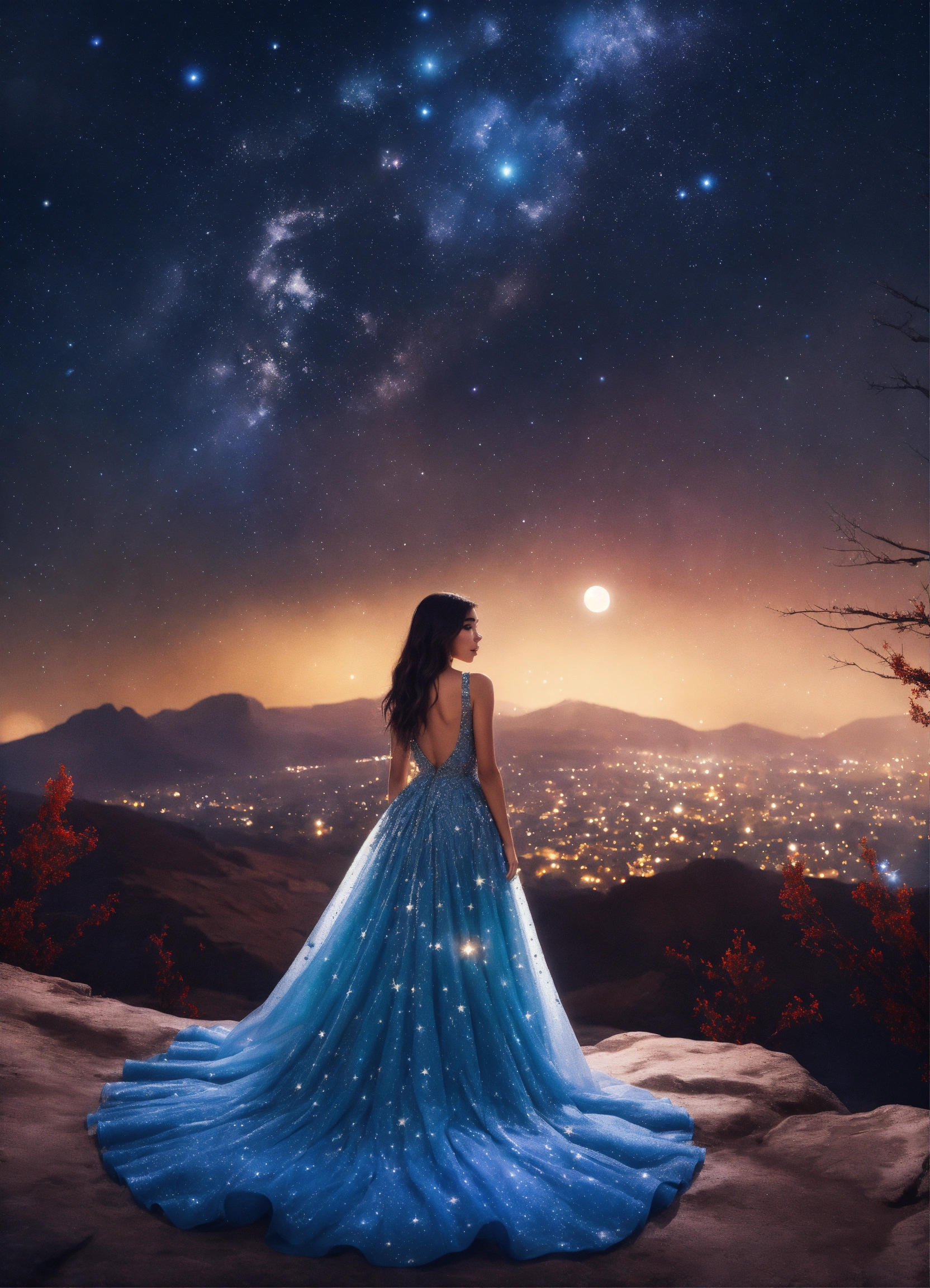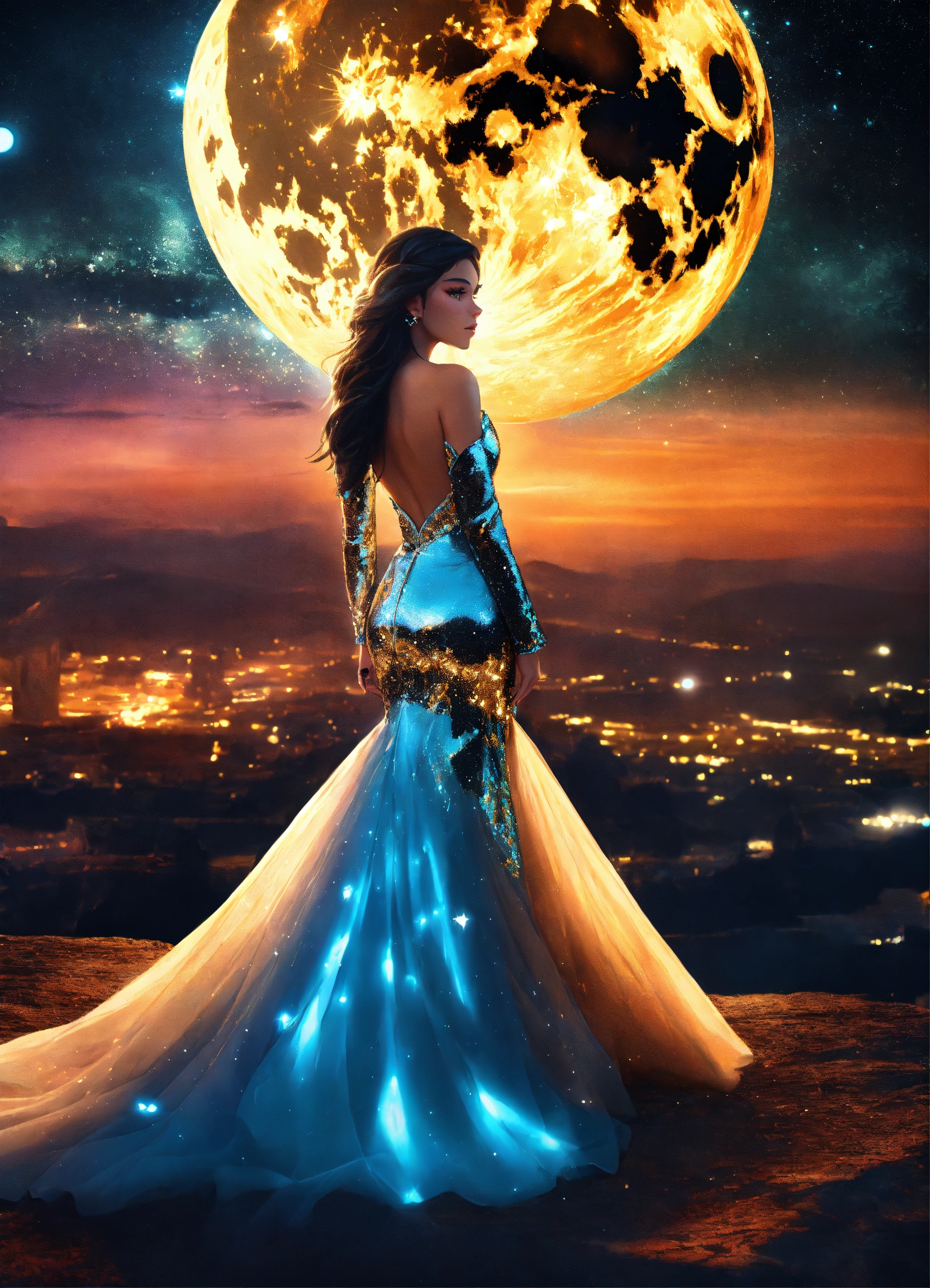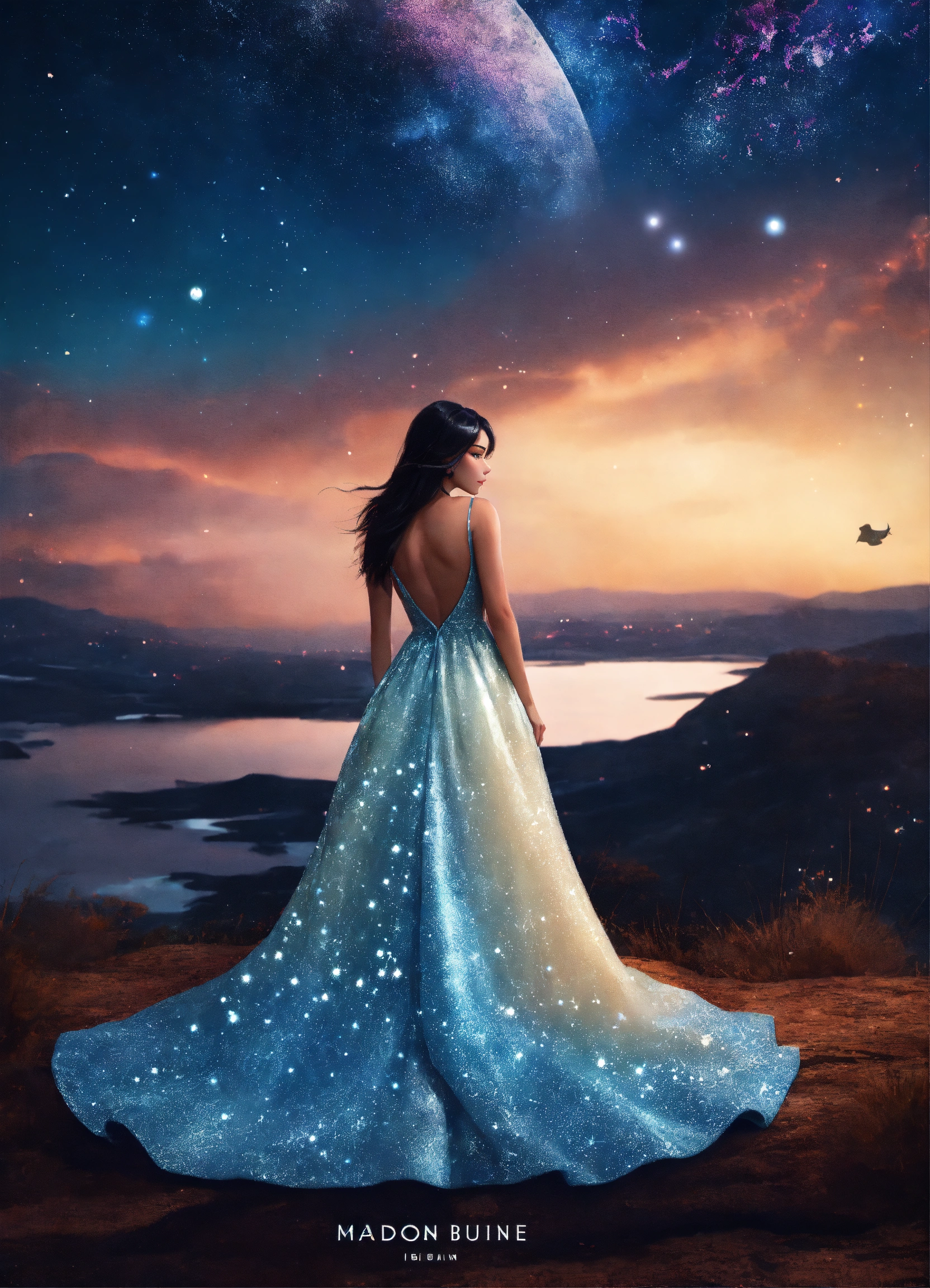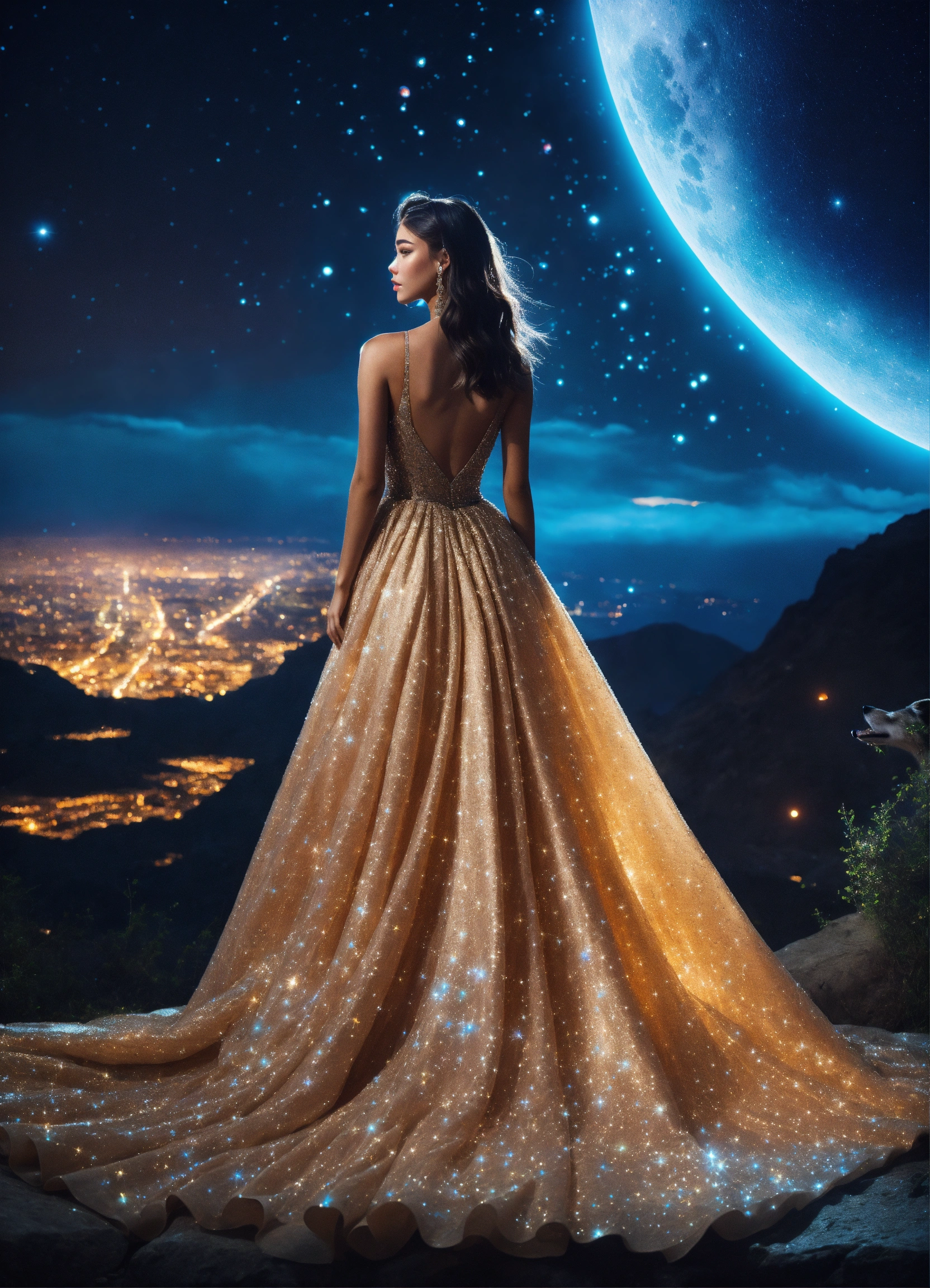 Madison beer in a beautiful sparkling designer gown, in a futuristic landscape, back turned. stars raining down, a wolf with amber eyes watching her. two moons in the nightsky at nightfall, realistic