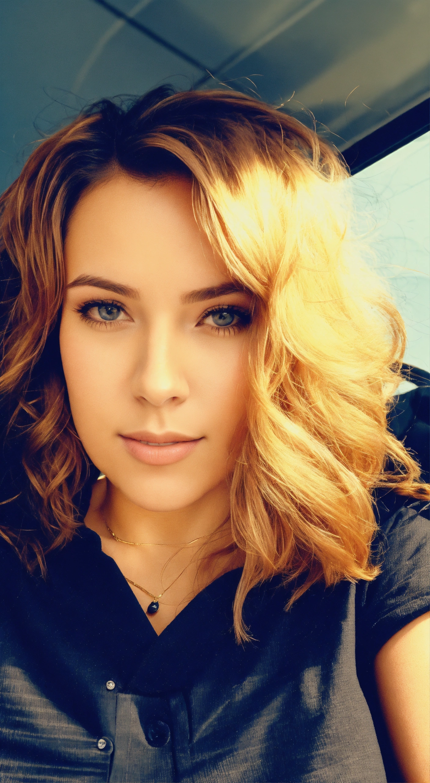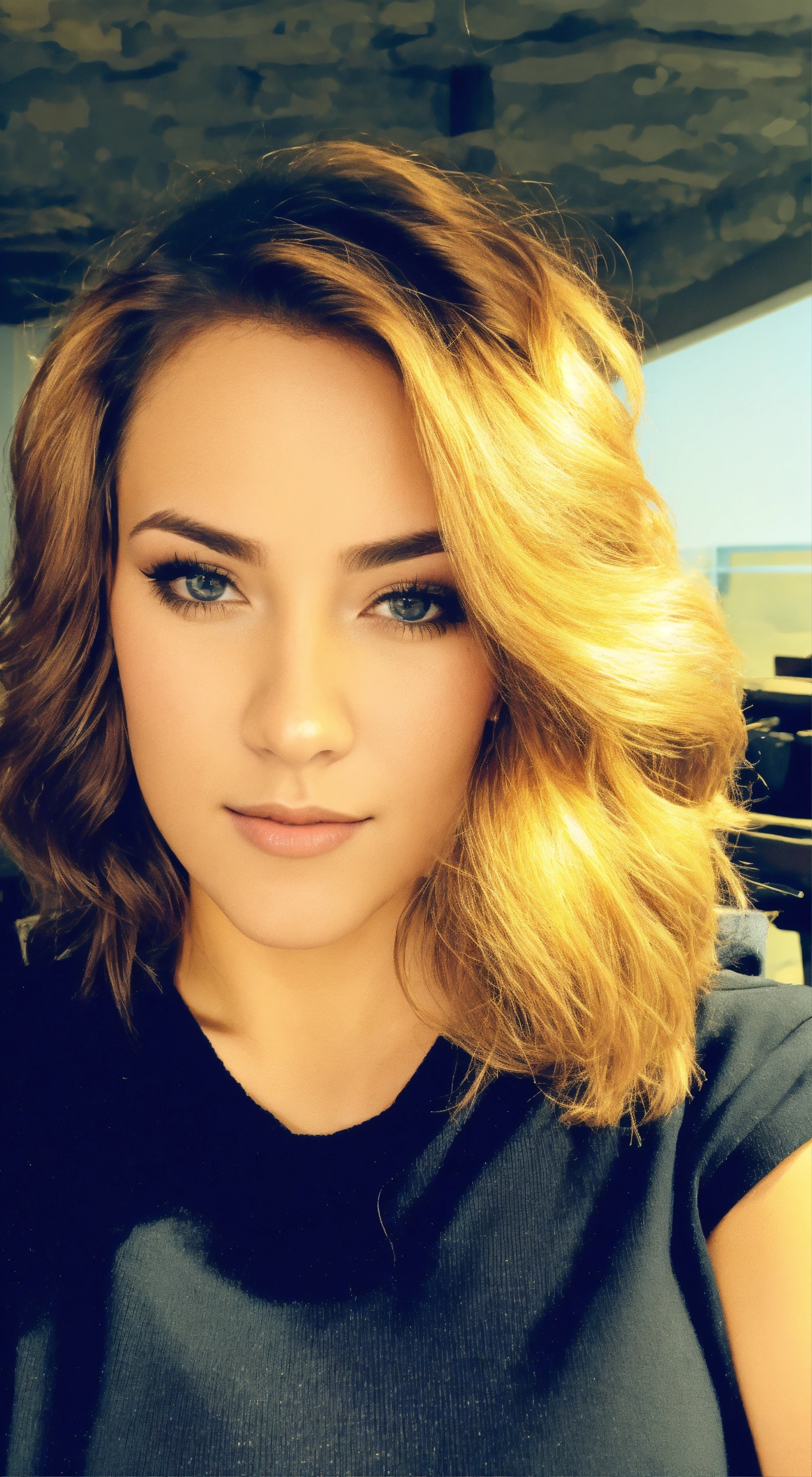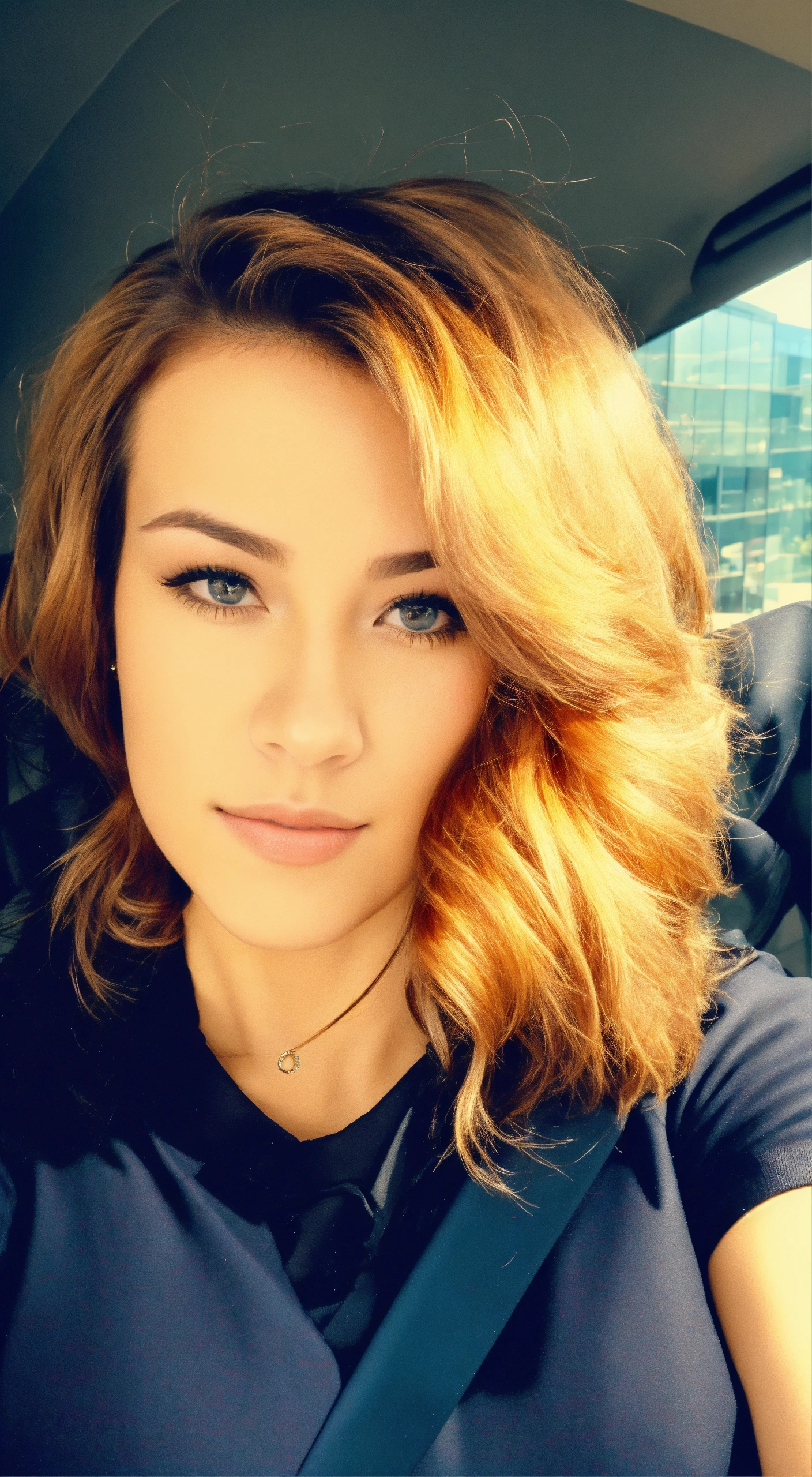 hair all the same but change out fit to business attire and solid black background