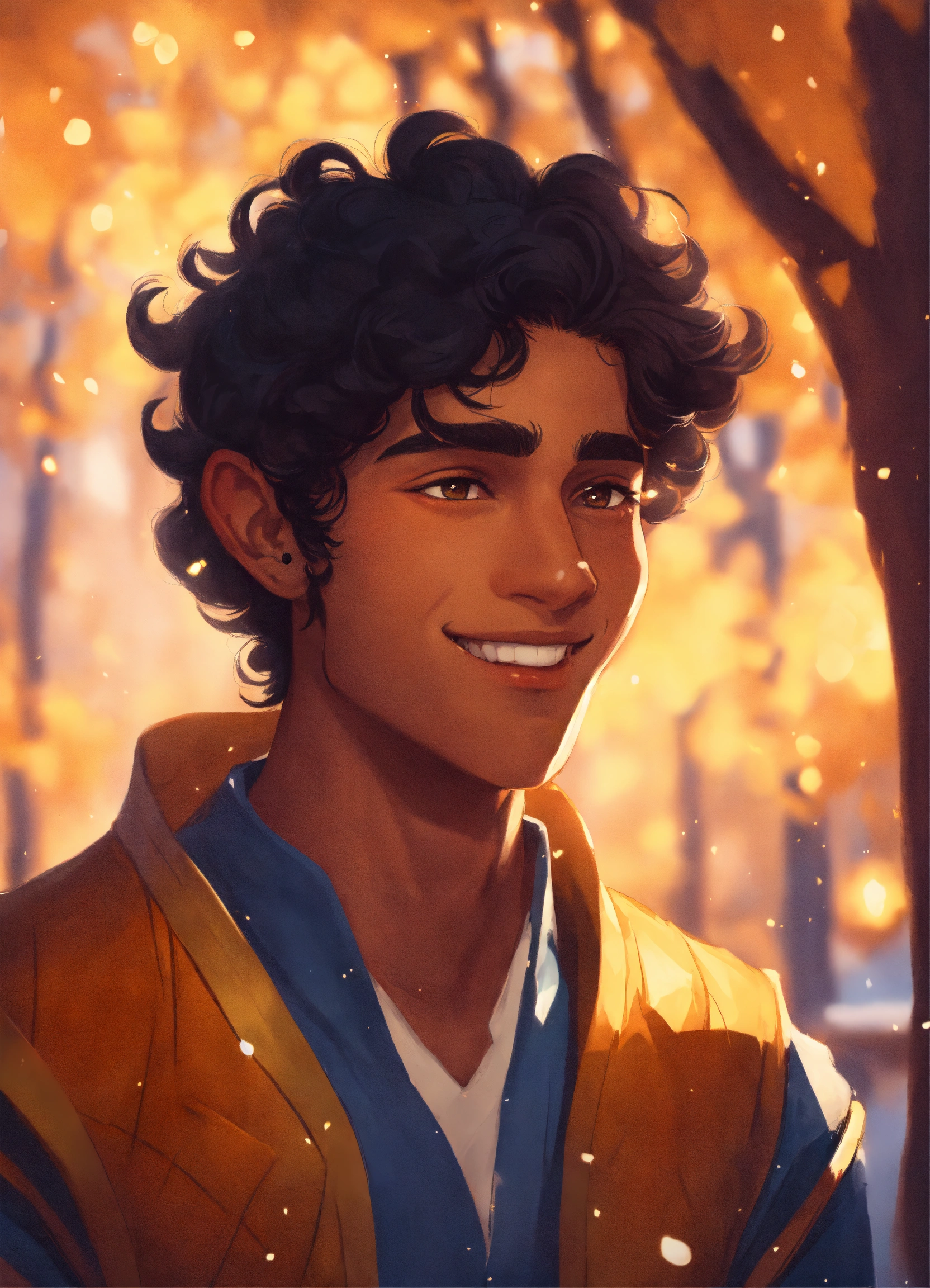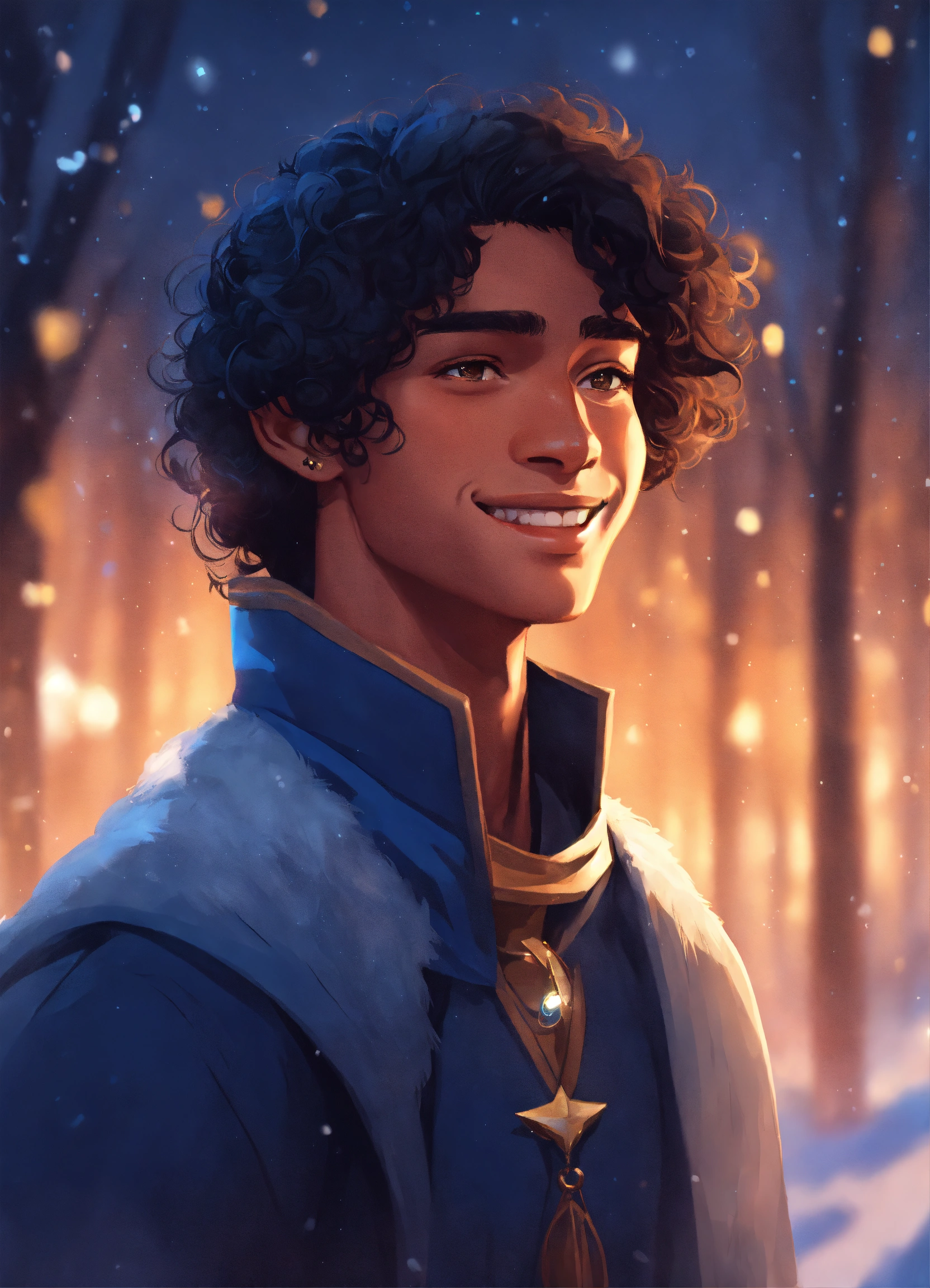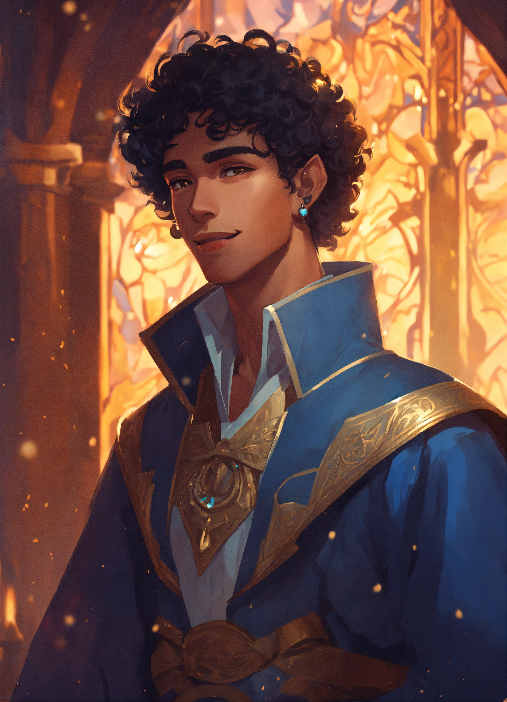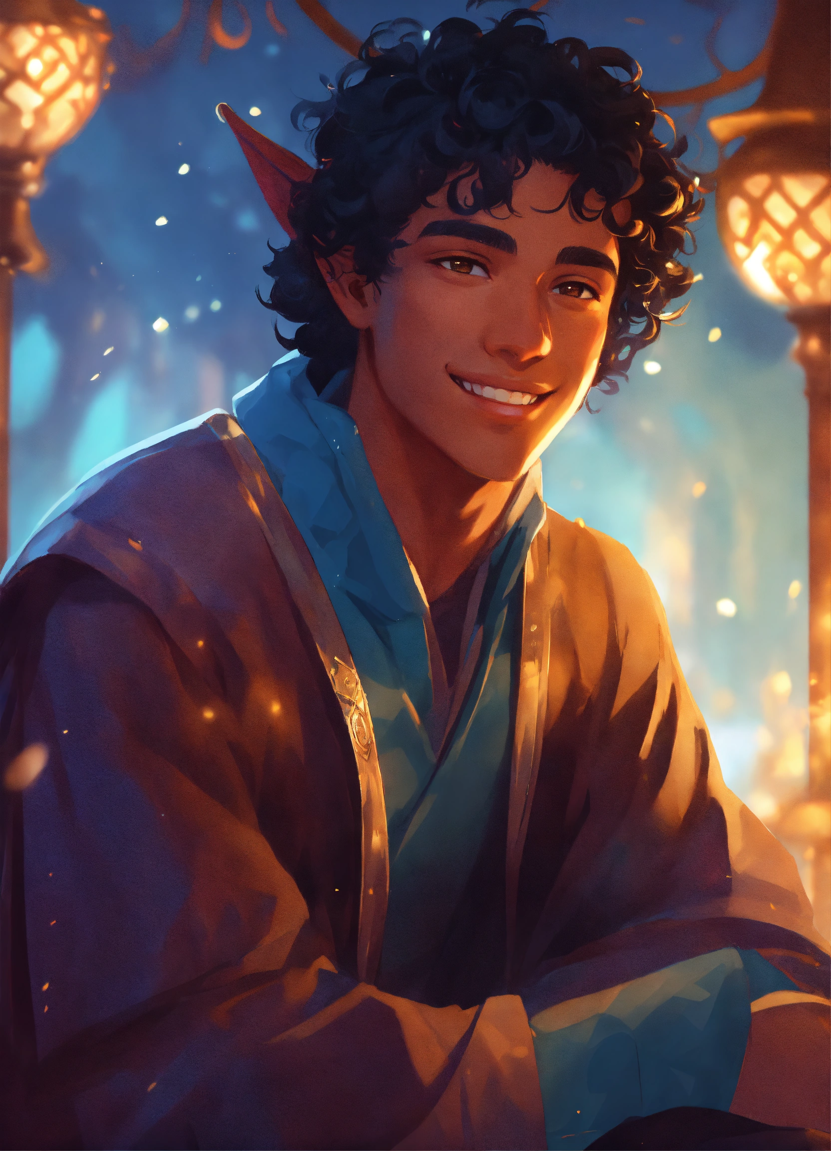 25 year old elf man, curly black hair, tan skin, hazel eyes, smile, by james gilleard, fantasy world, wizard, simple silver earing, winter blue gold, magic