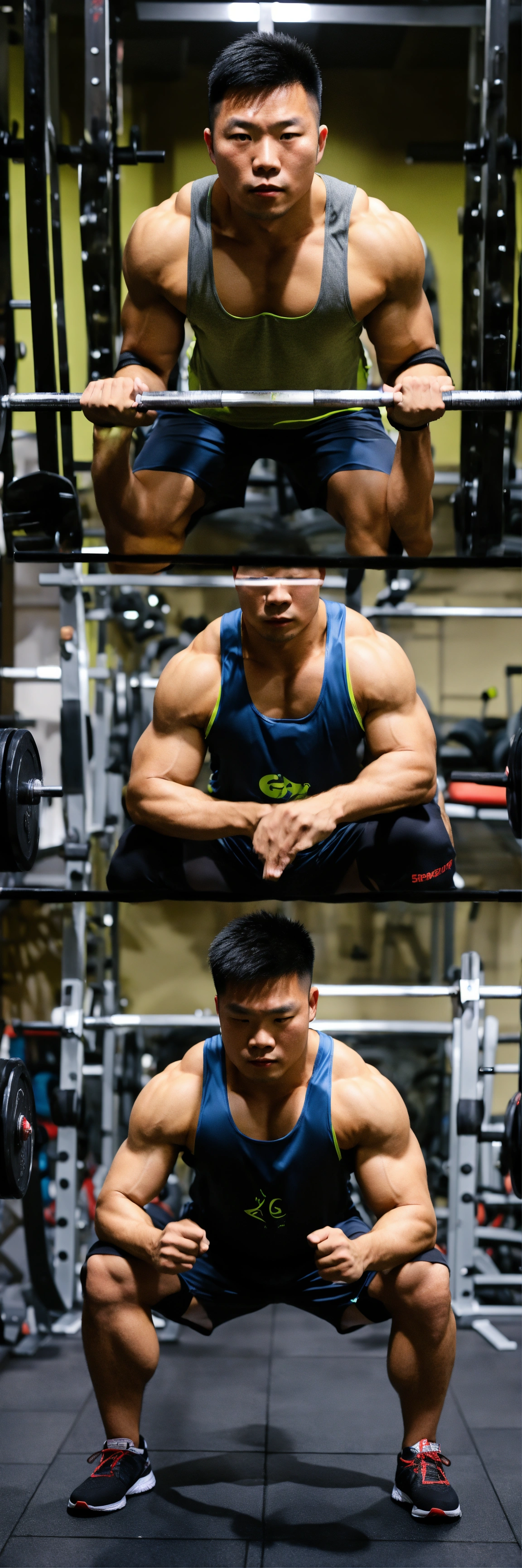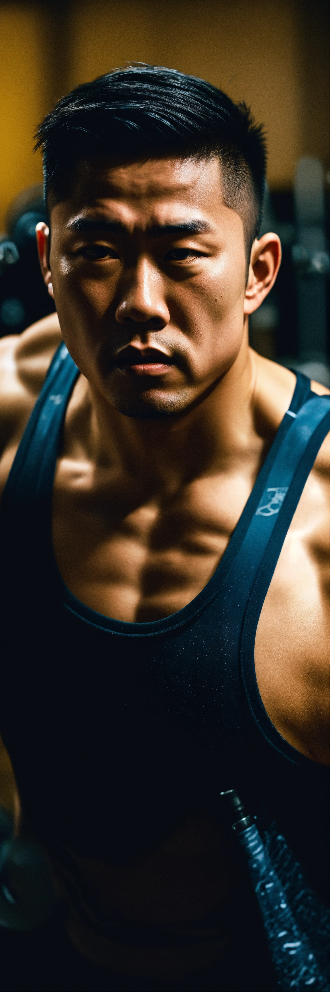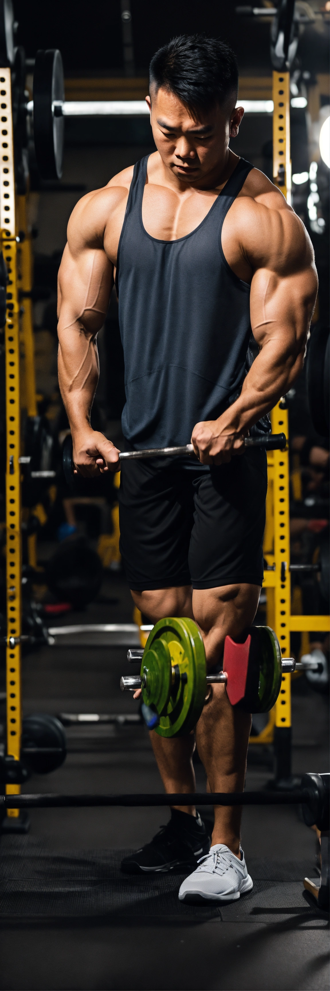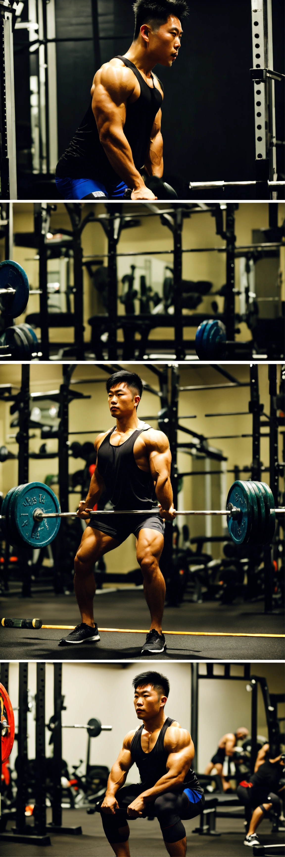 I am an asian man in profile who practices weight training in a tank top in a dark and obscure weight room, i do the squat exercise with a barbell on my shoulders