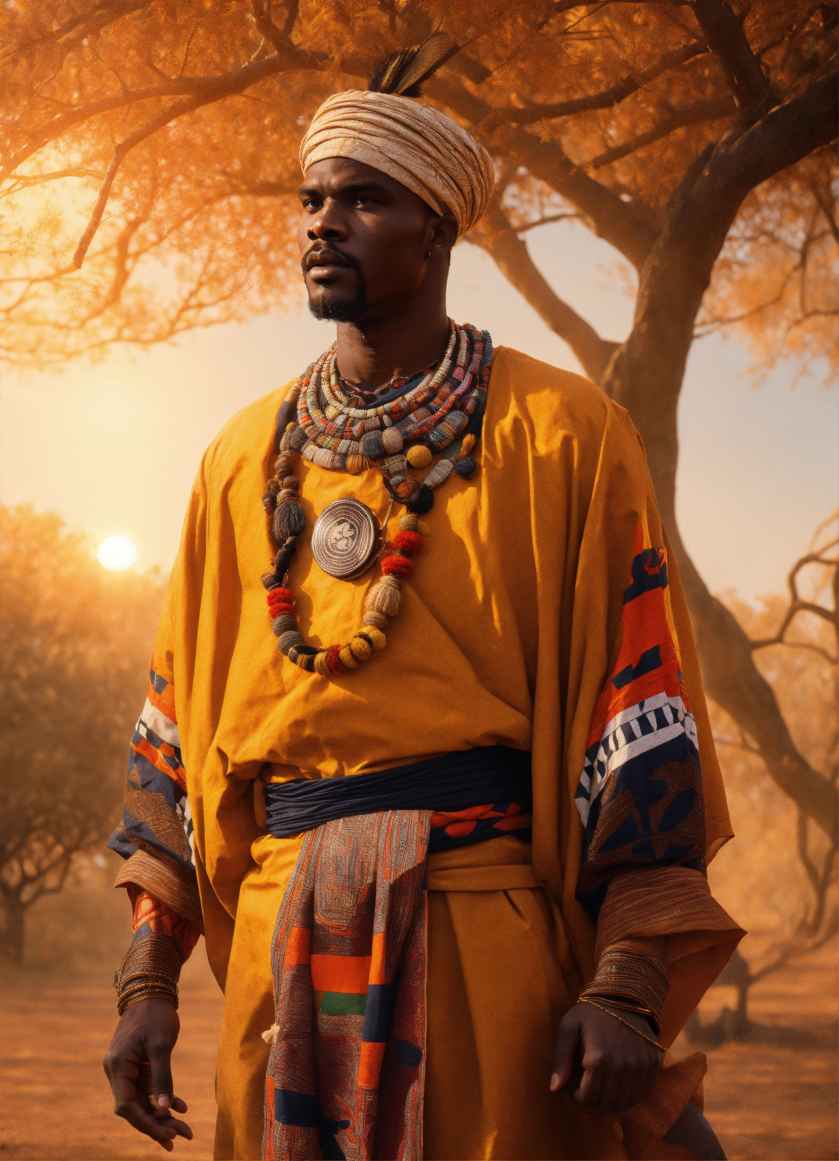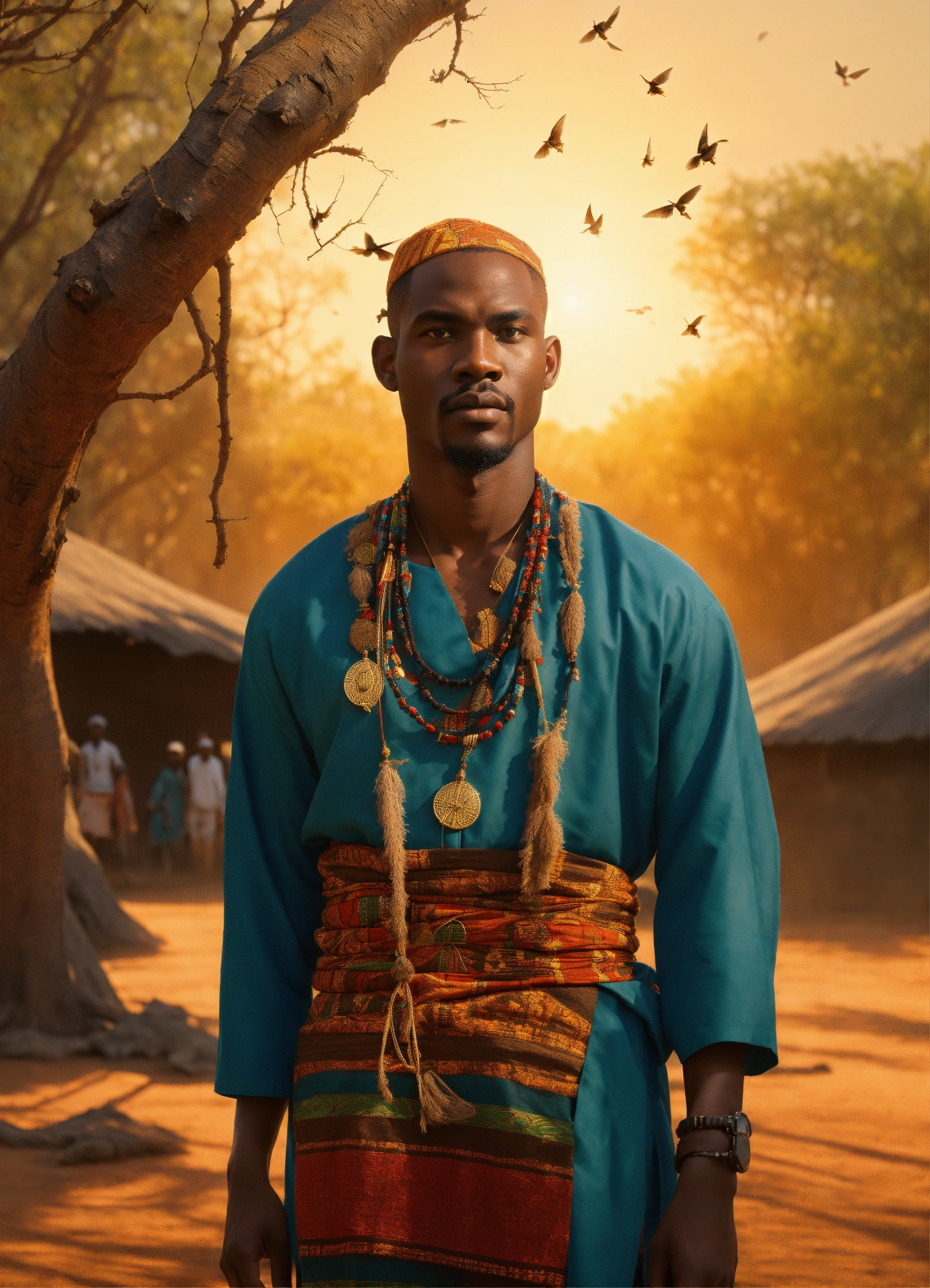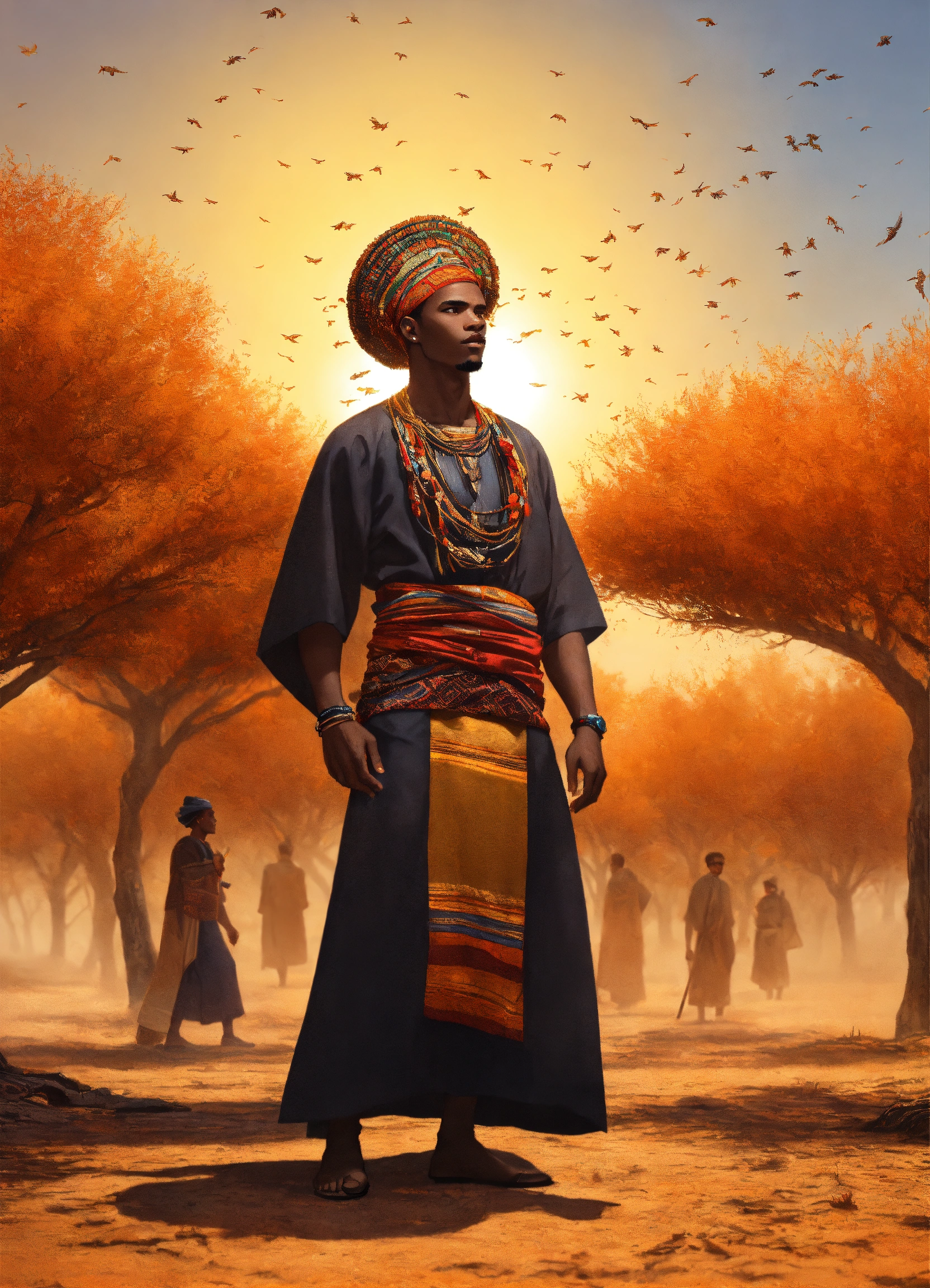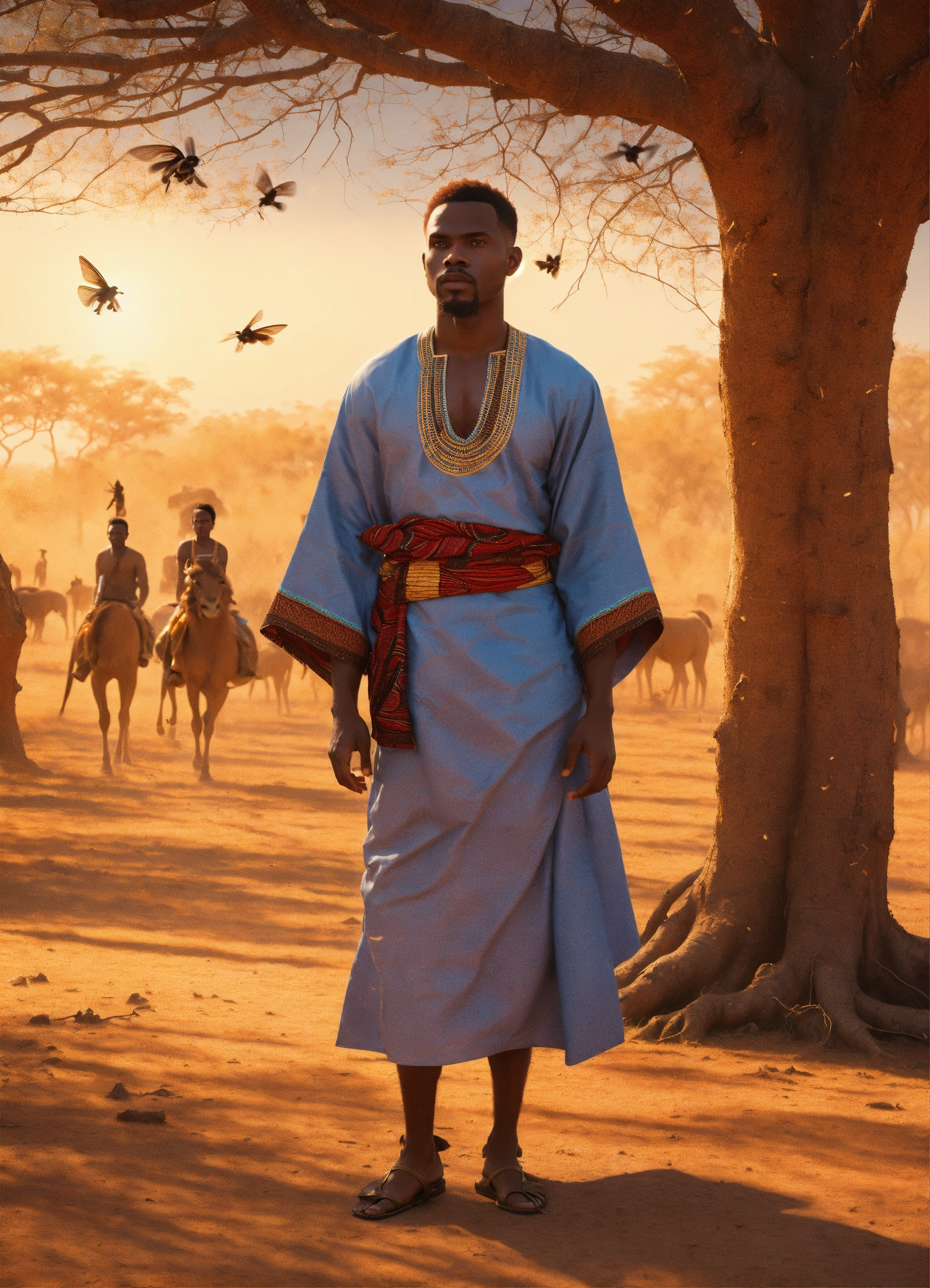 Handsome black light skinned omolu man with ginger hair with african traditional clothes, on brown earth with dry leafless trees, with blowflies flying full length view with bright sun in background, greg rutkowski, ultra detailed, volumetric lighting