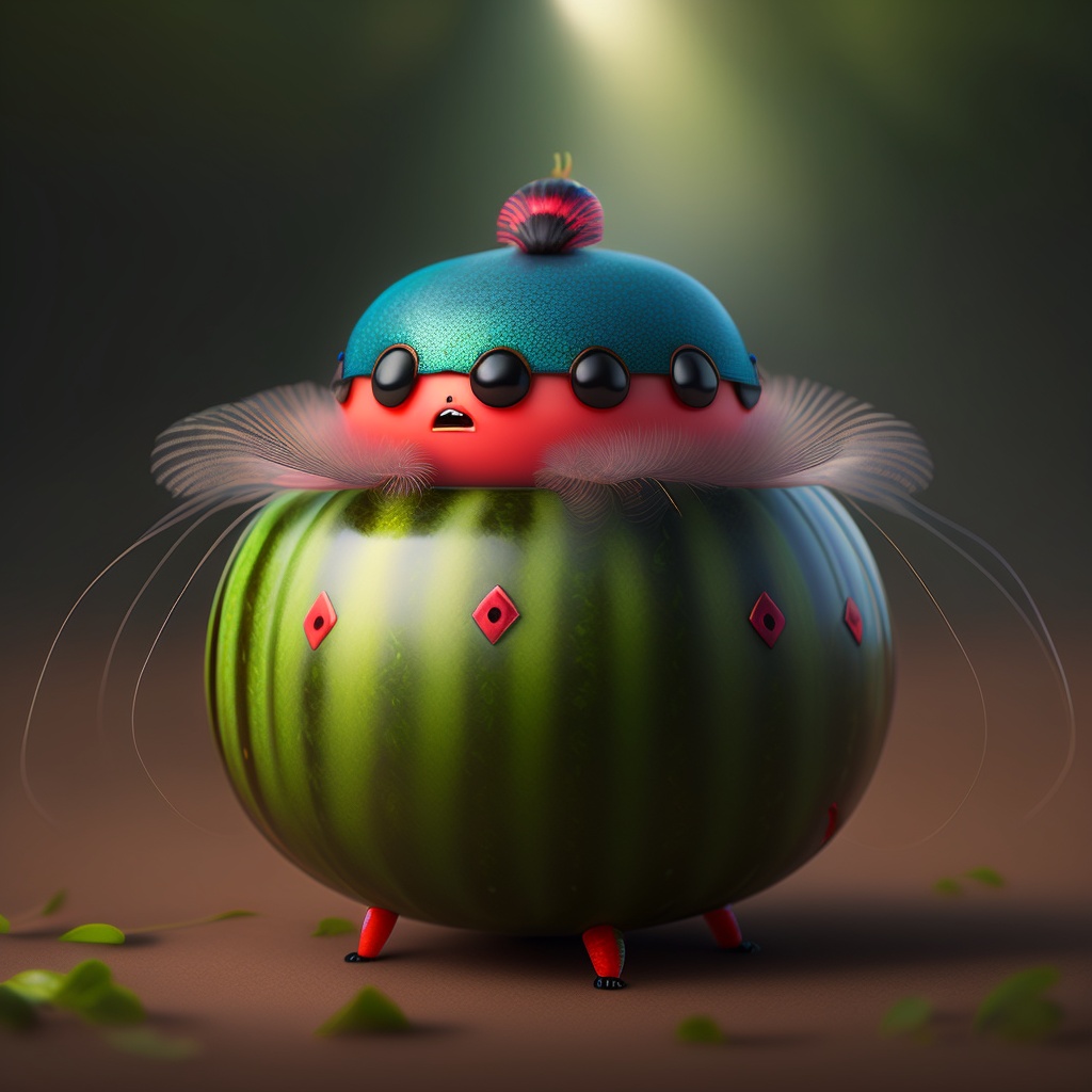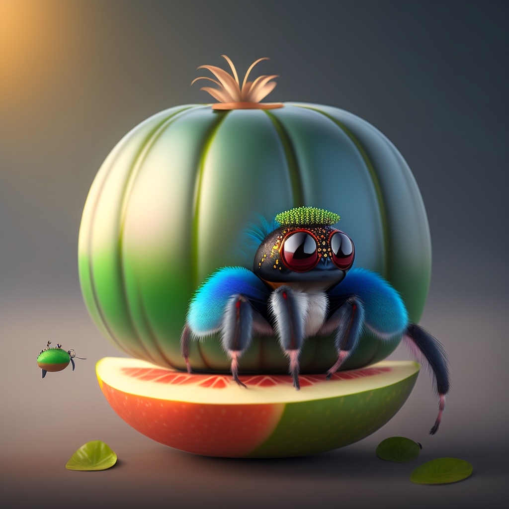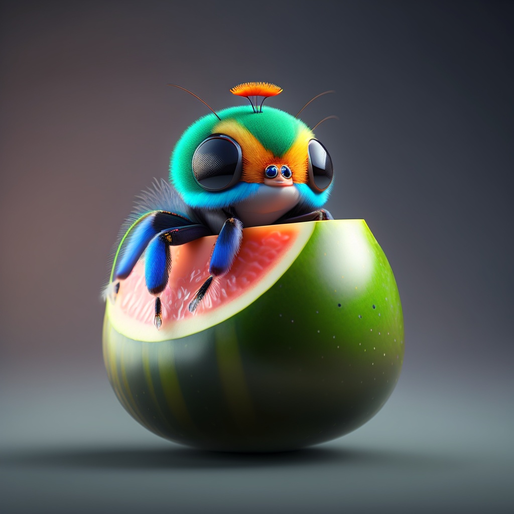 Realistic fluffy baby peacock spider on a huge watermelon, foggy background, cinematic lighting, big eyes, anime style