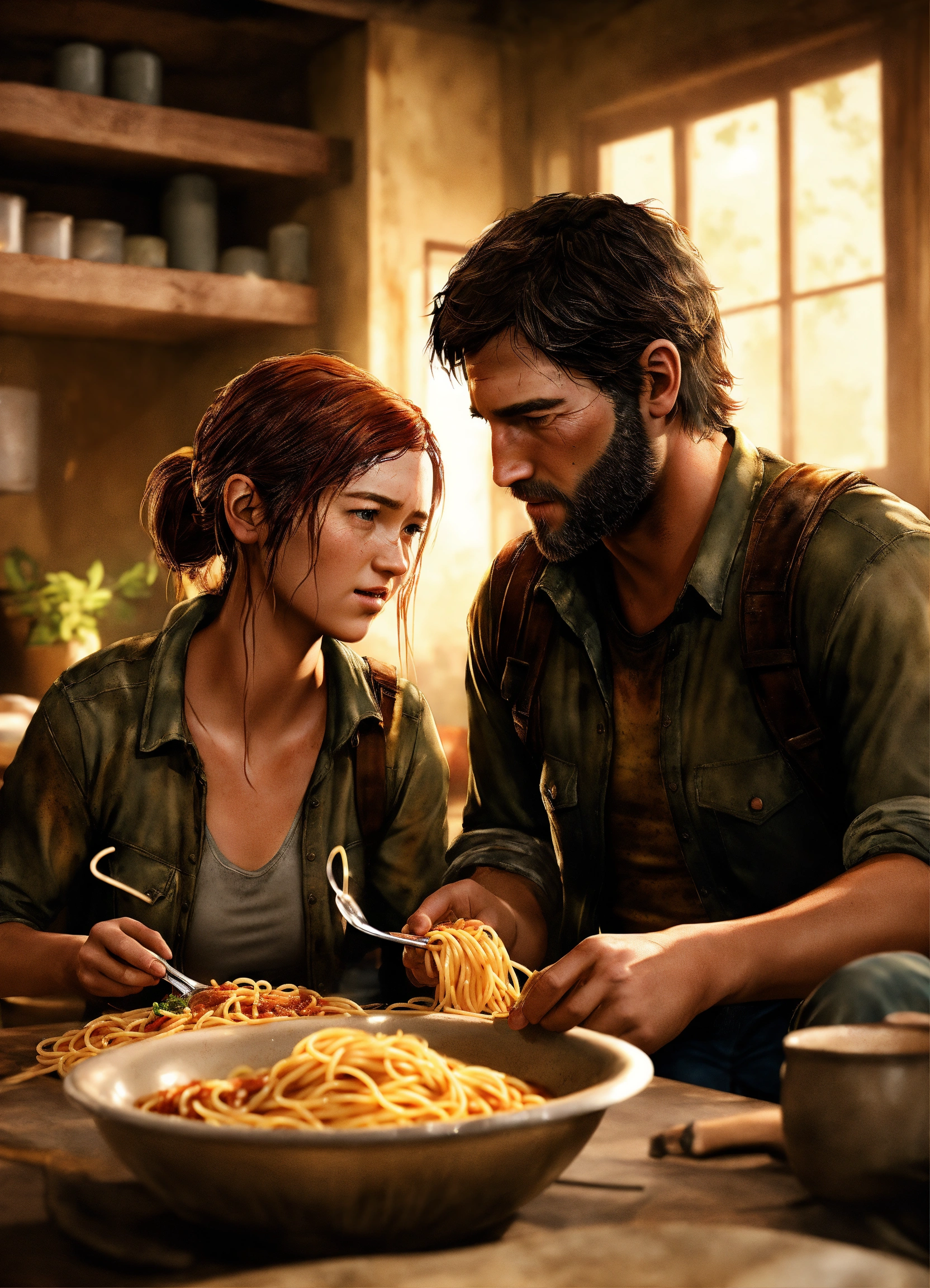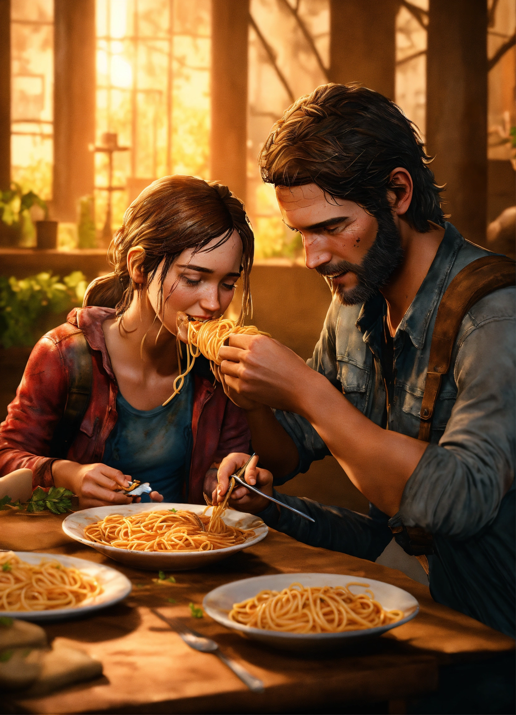 Photo of ellie and joel from the last of us happily eating spaghetti
