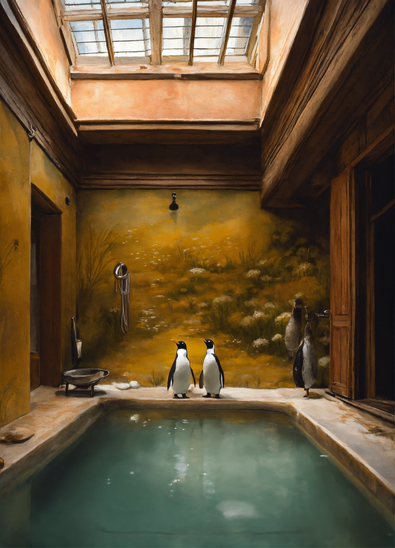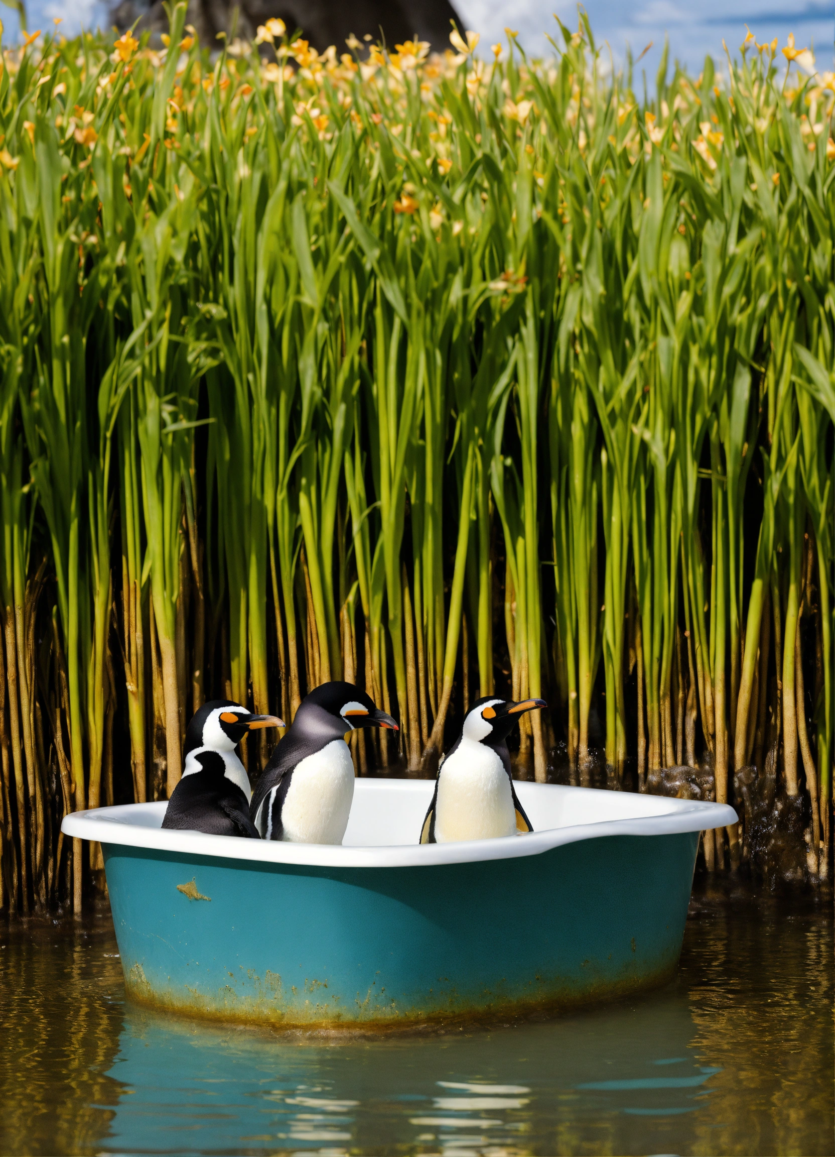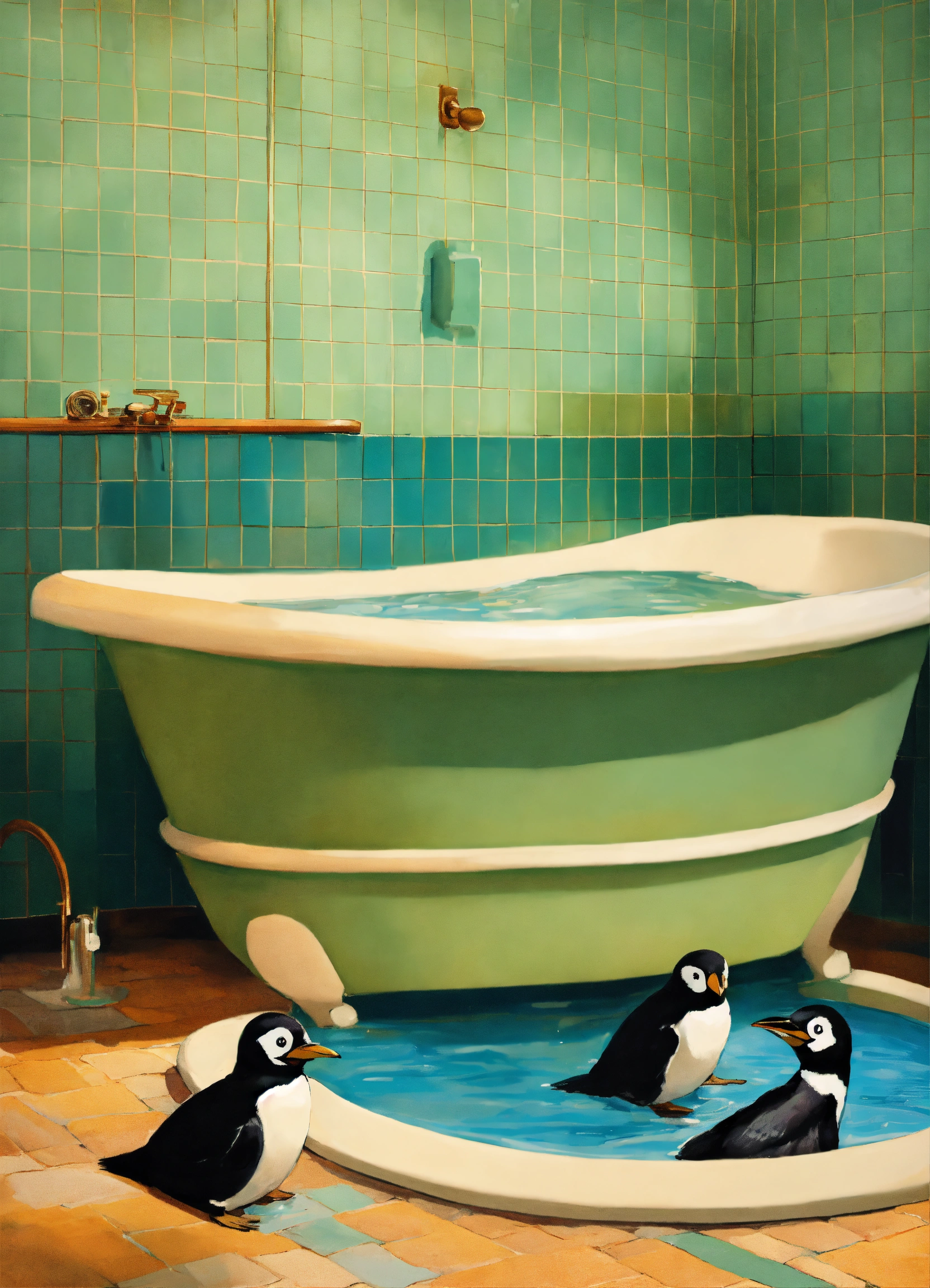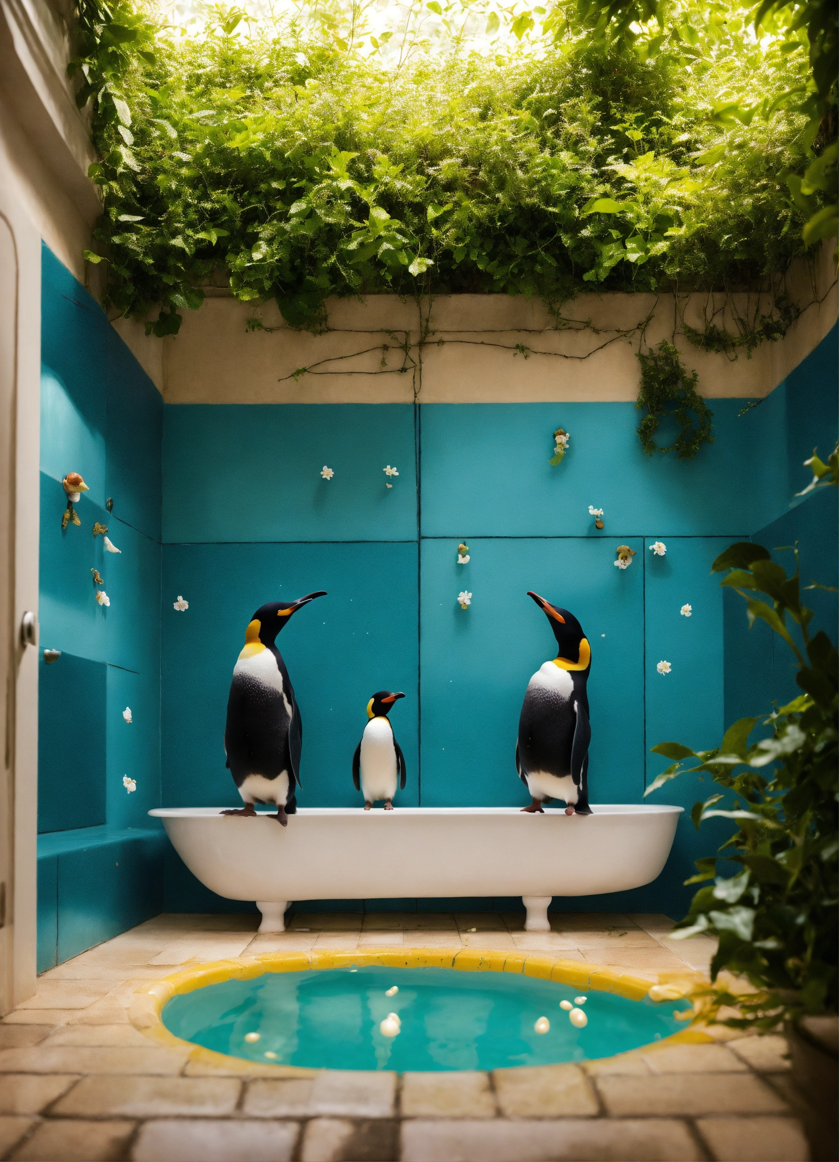 "créez une image réaliste montrant une baignoire vue de côté, placée au centre de l'image. dans la baignoire, il y a deux pingouins qui jouent joyeusement. l'eau éclabousse légèrement autour d'eux. assurez-vous que les détails de la baignoire et des pingouins soient clairs et que l'ensemble donne une impression de gaieté."