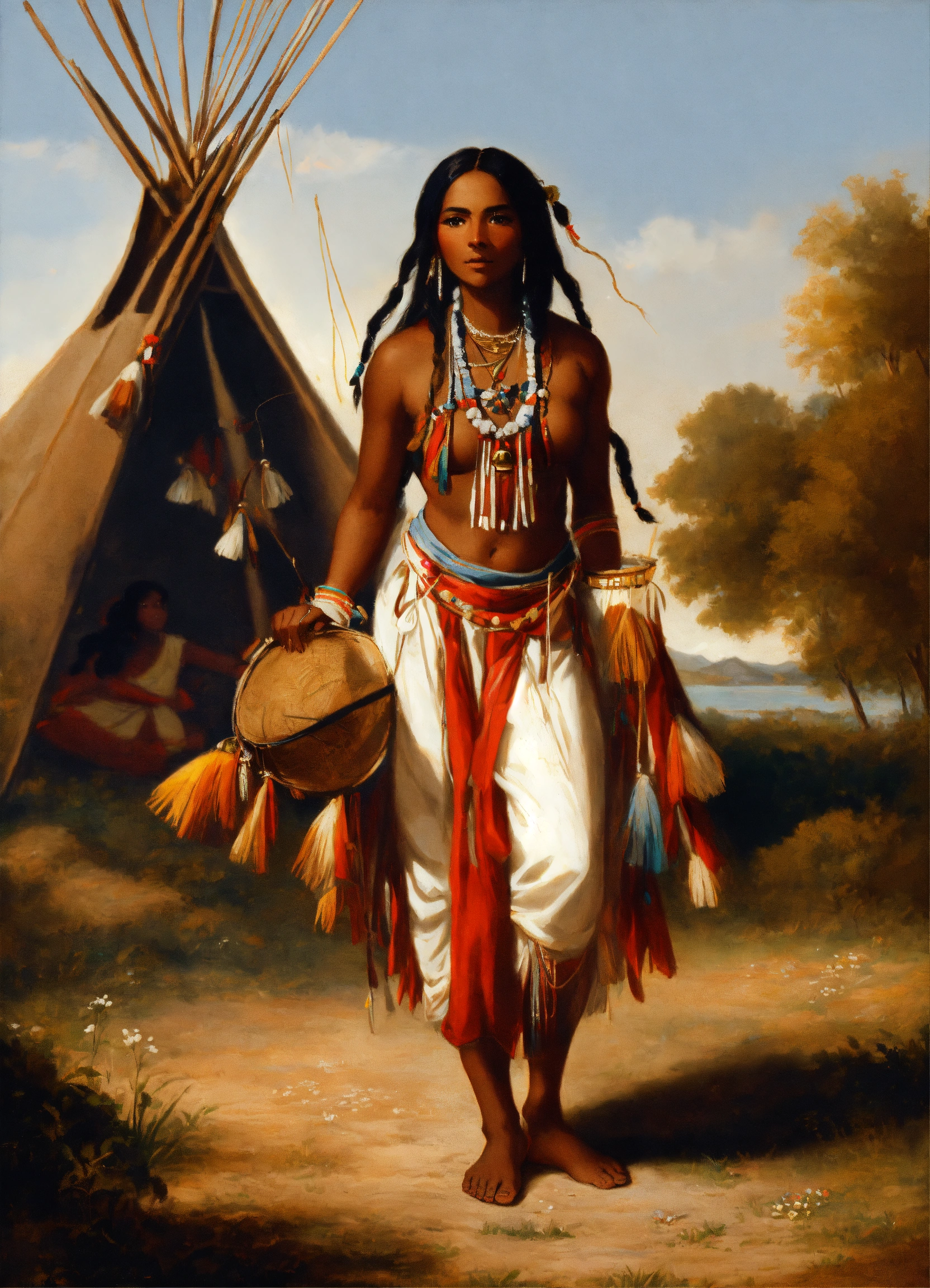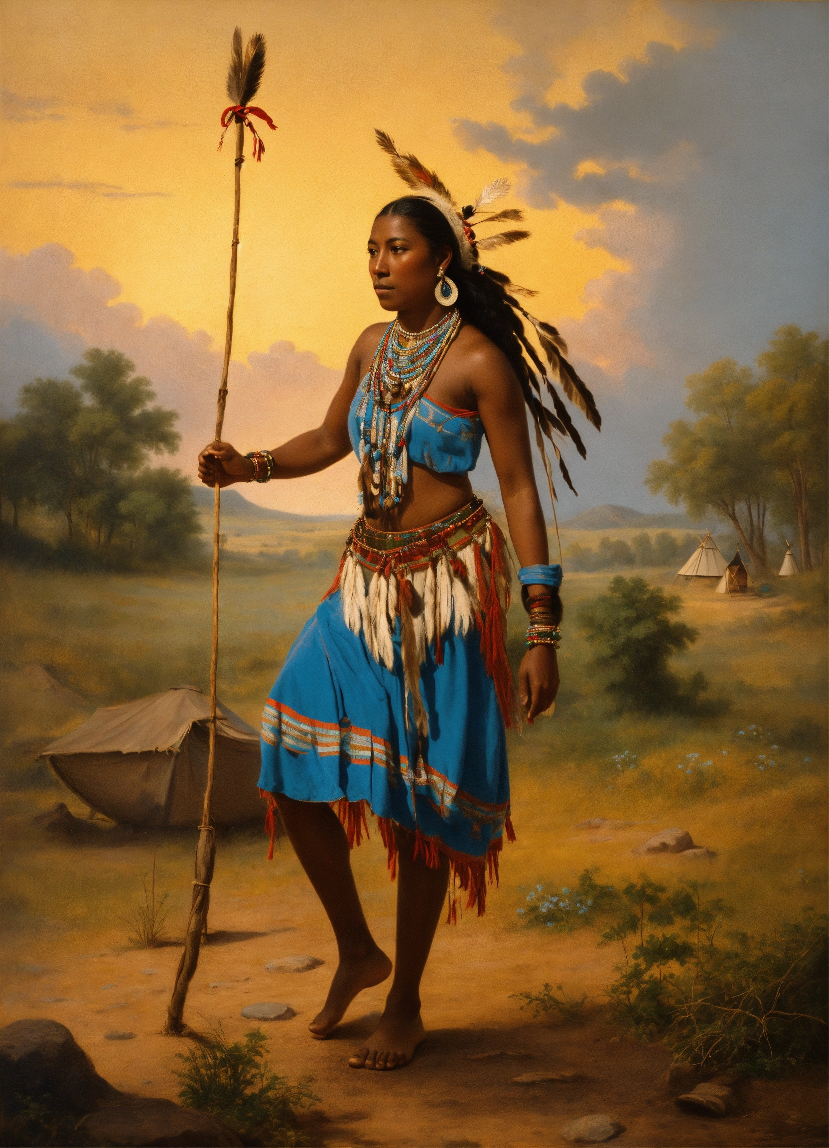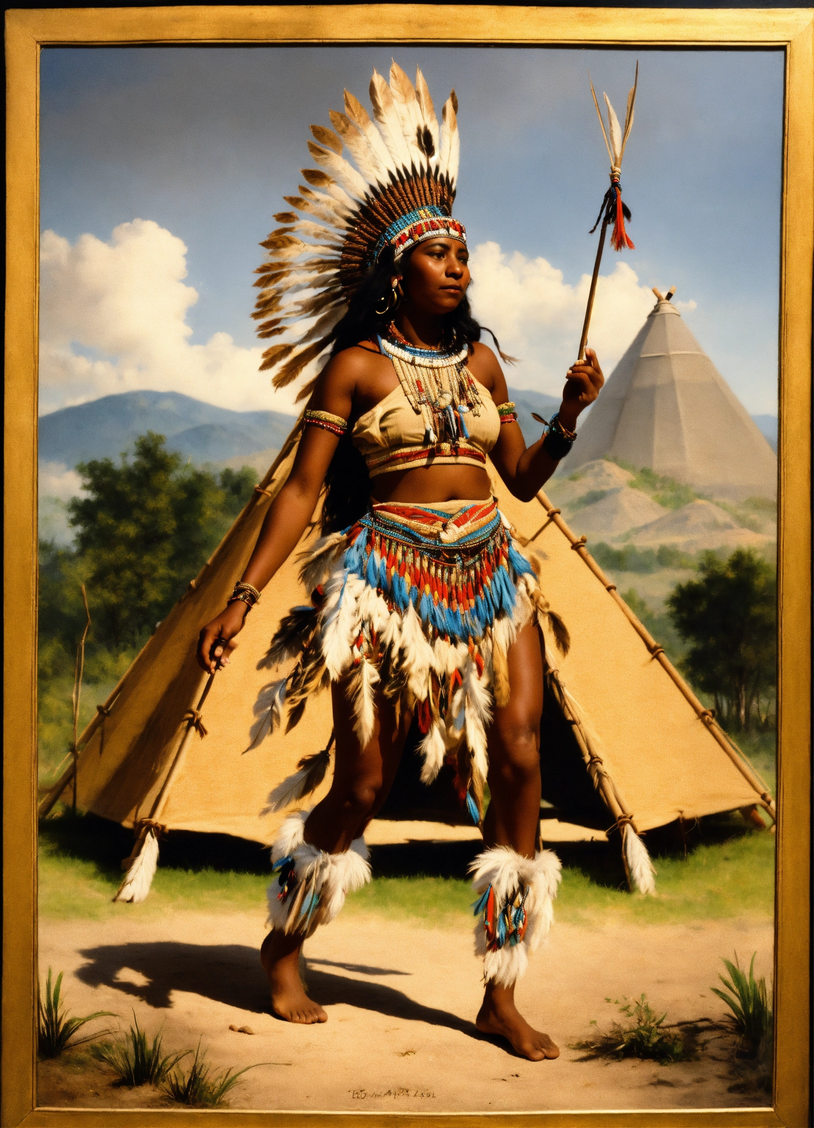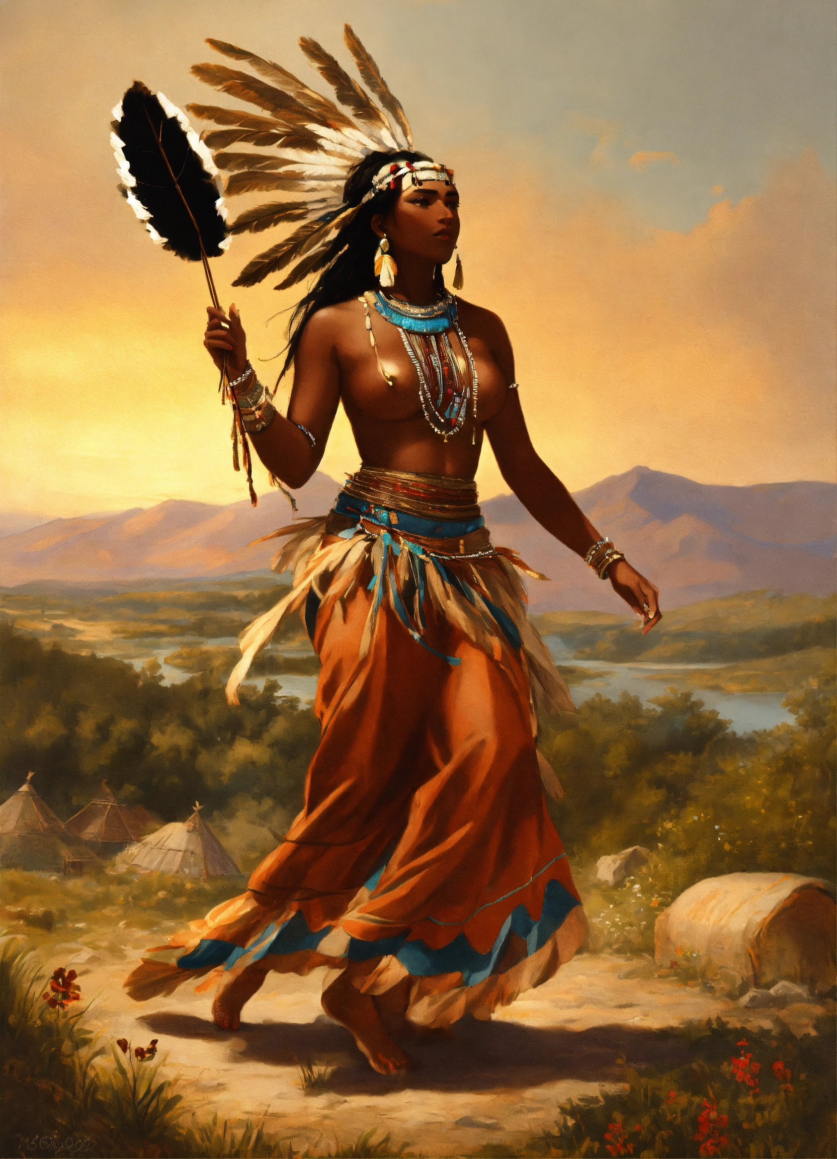 In full view a 1600s depiction of a beautiful dark-skinned beautiful native american yamasee black woman, she is dancing to a spiritual drum beat, she has little bells strapped around her ankles, indian teepee on the landscape