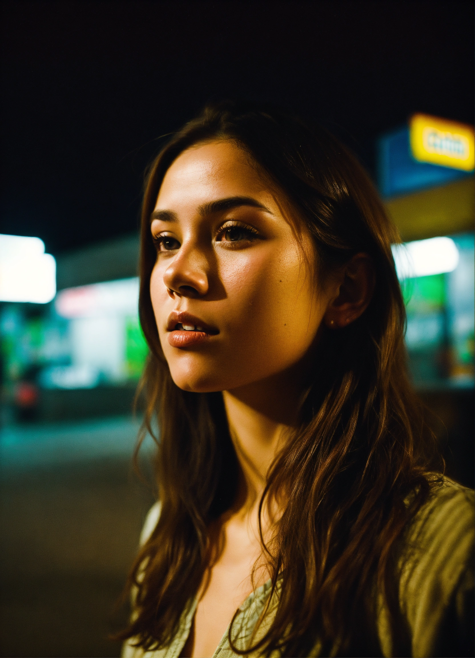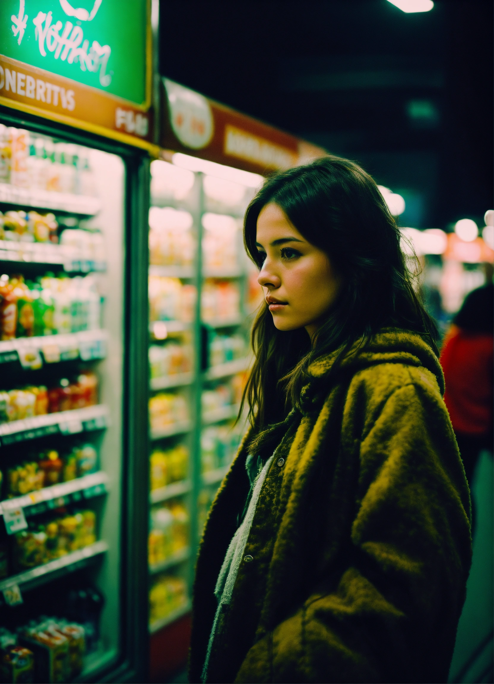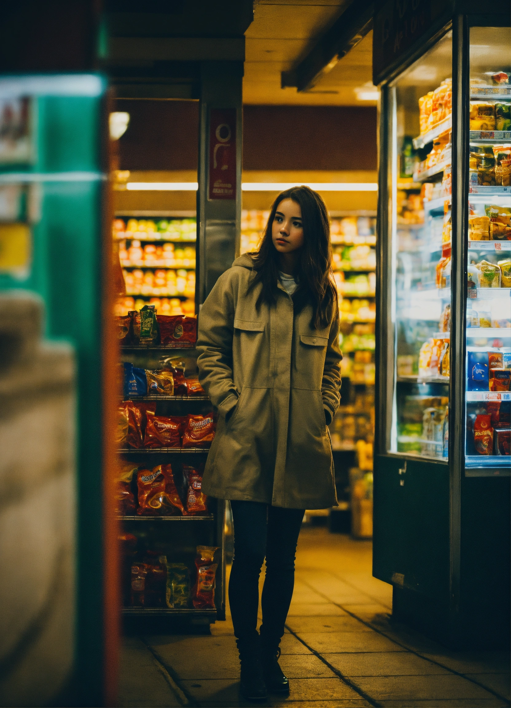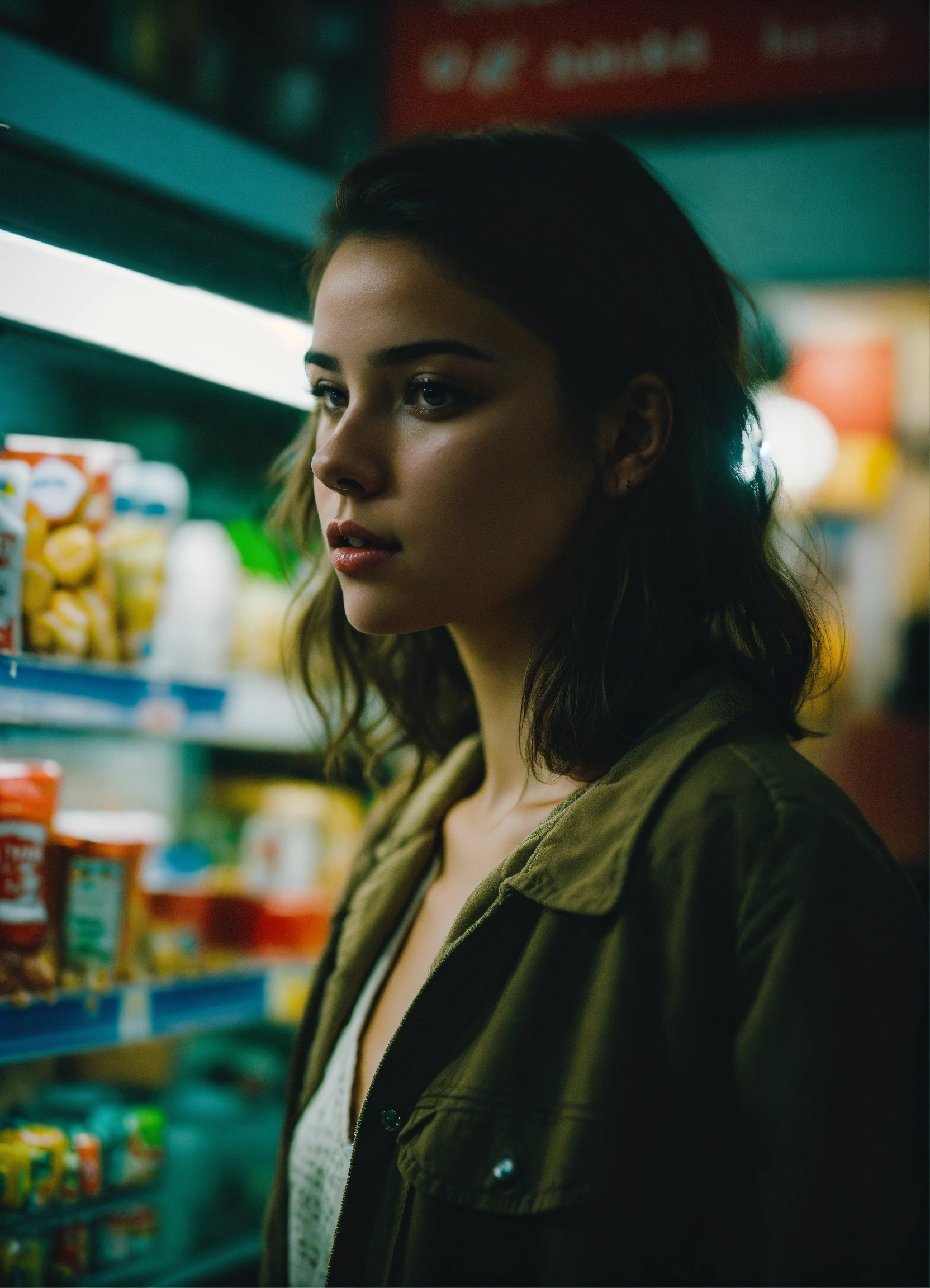 Candid photo of a young brunette woman taken at a convenience store during the night, low quality image, exhibiting a grainy texture, jpg artifacts, film grain, gritty, raw aesthetic