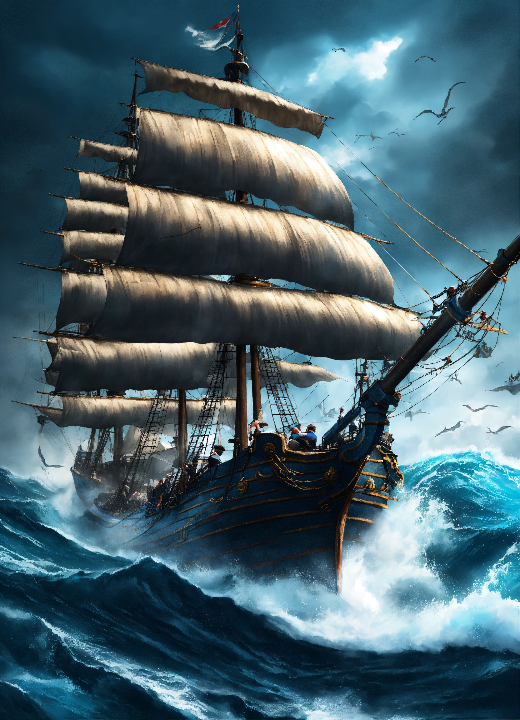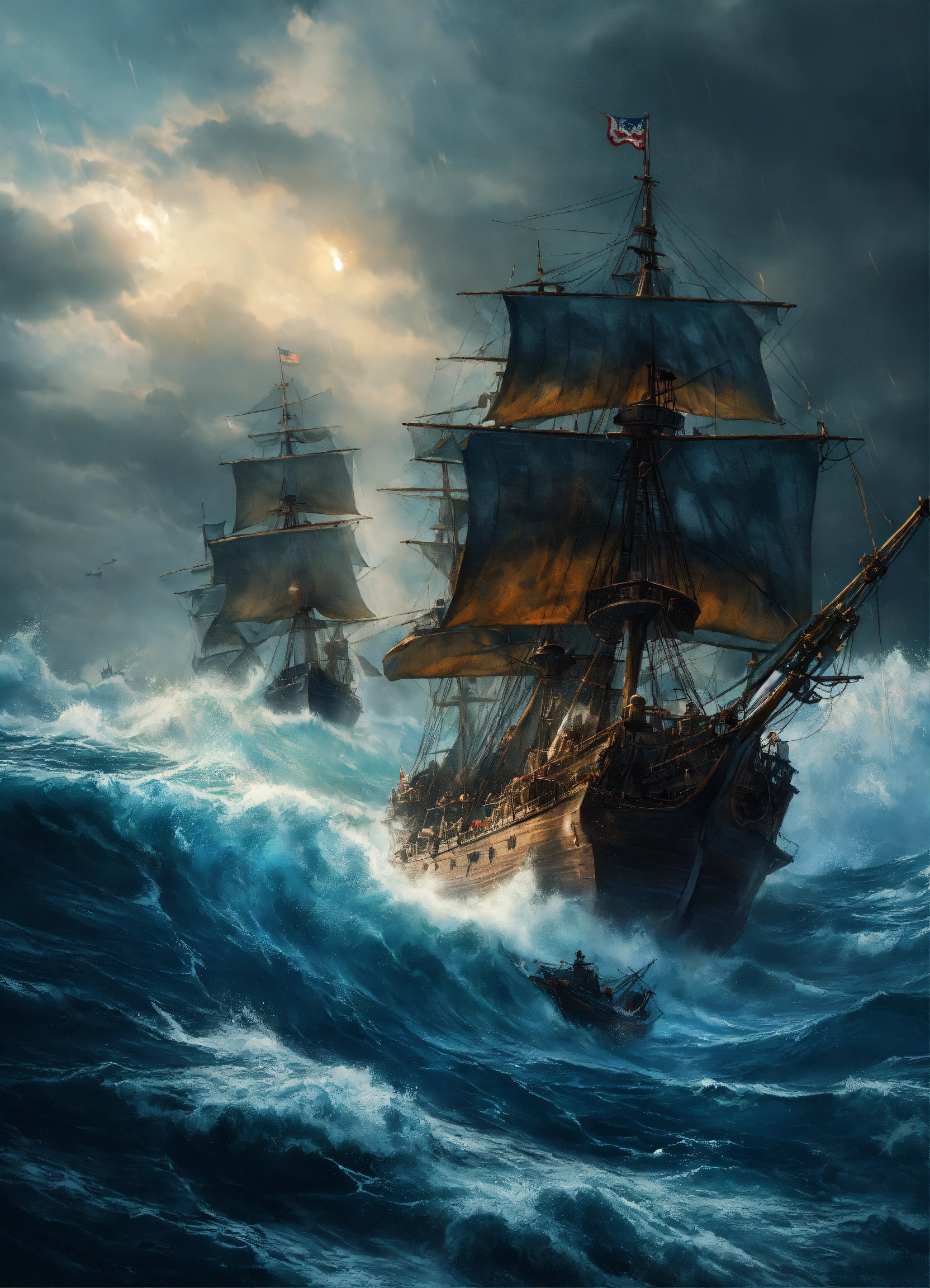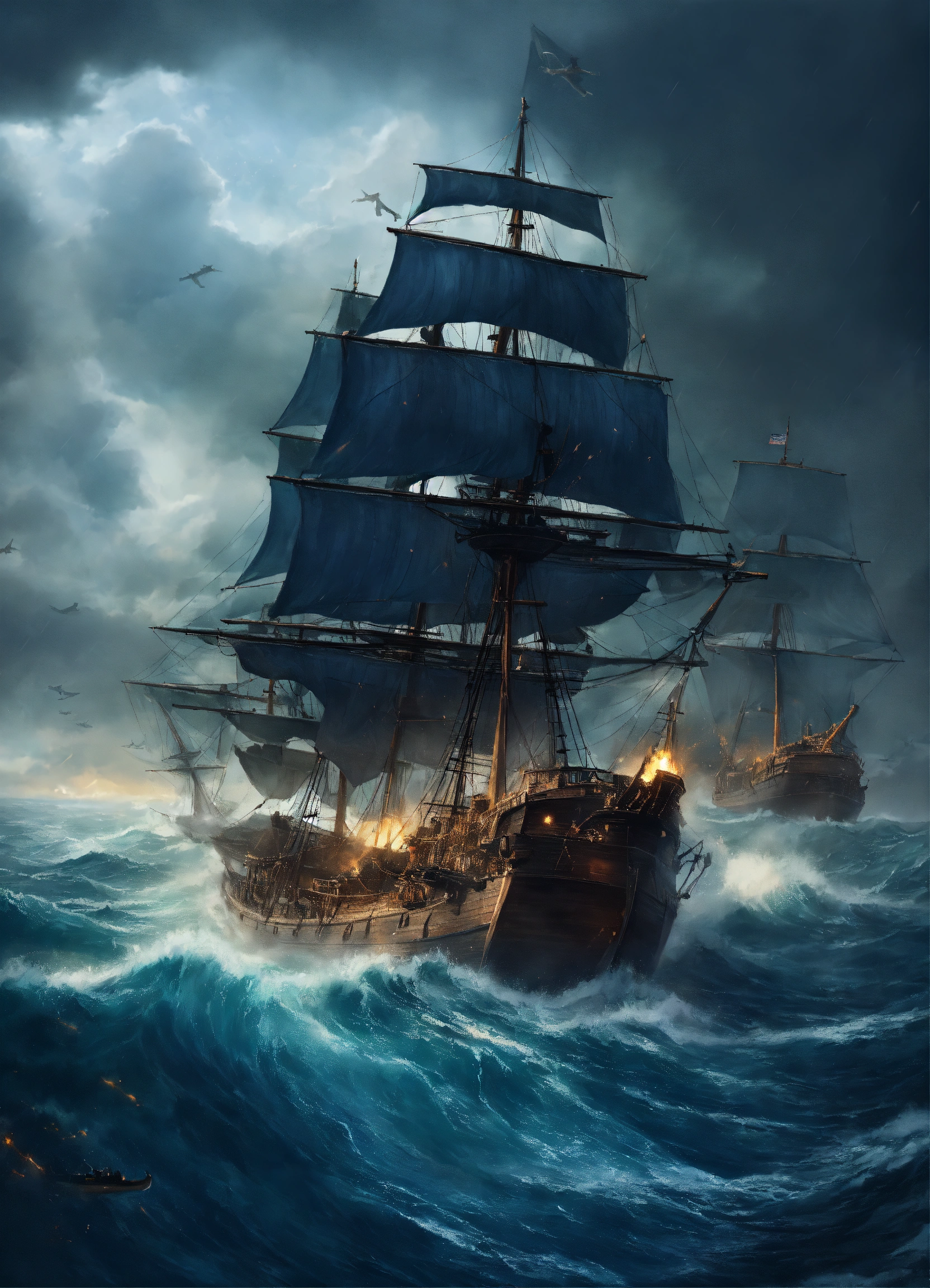 Very realistic two fighting pirateships in the war and they are fighting - dark color blue and storm and high waves, people jumping in the ocean
