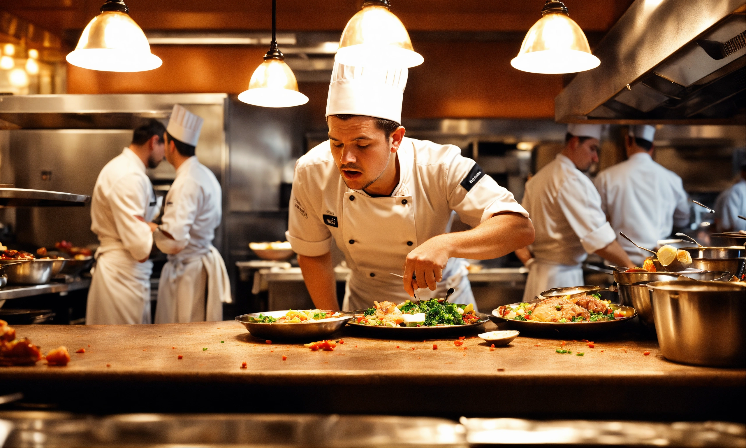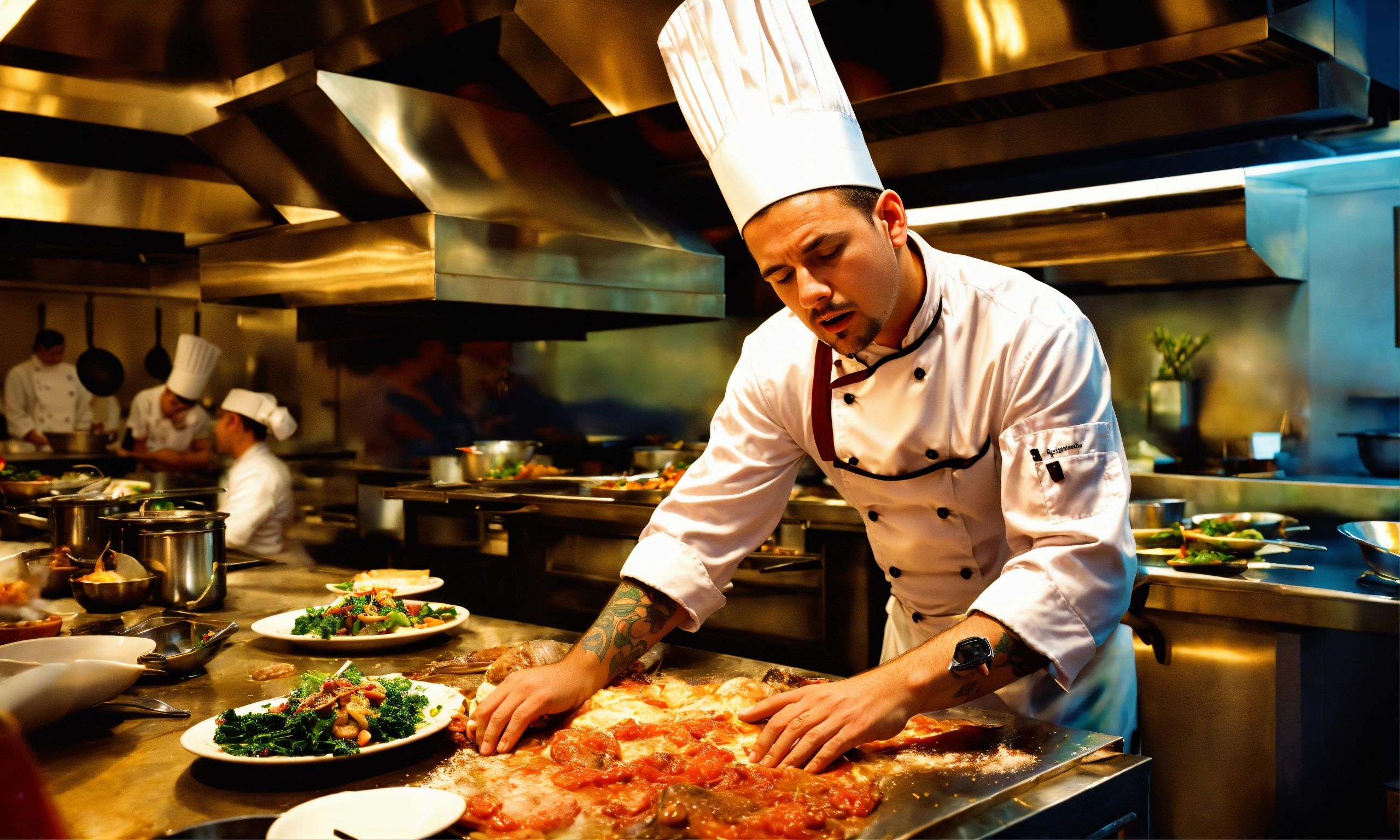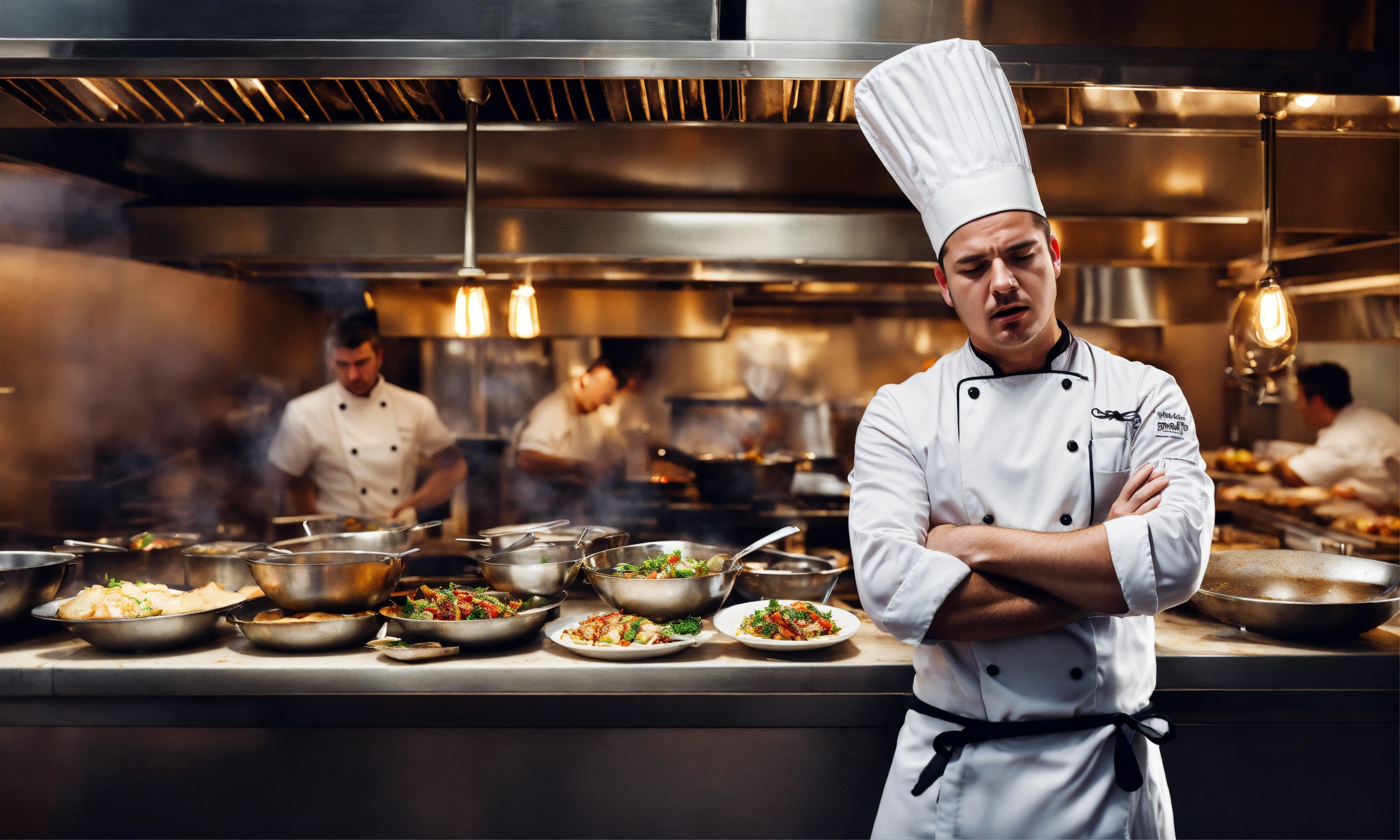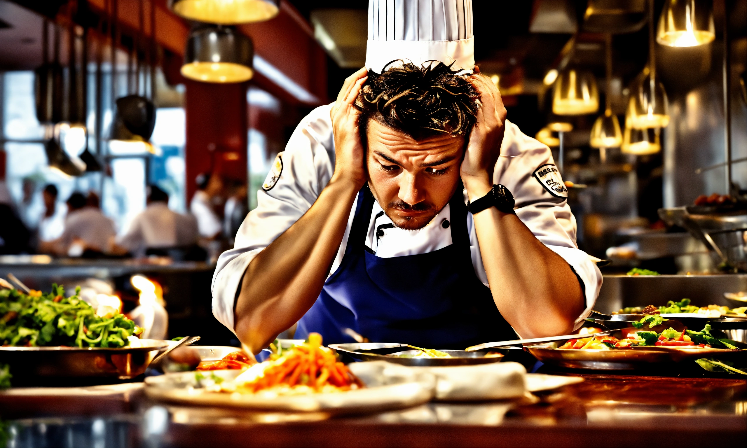 An artistic photo realistic picture of an stressed out chef at a very busy restaurant