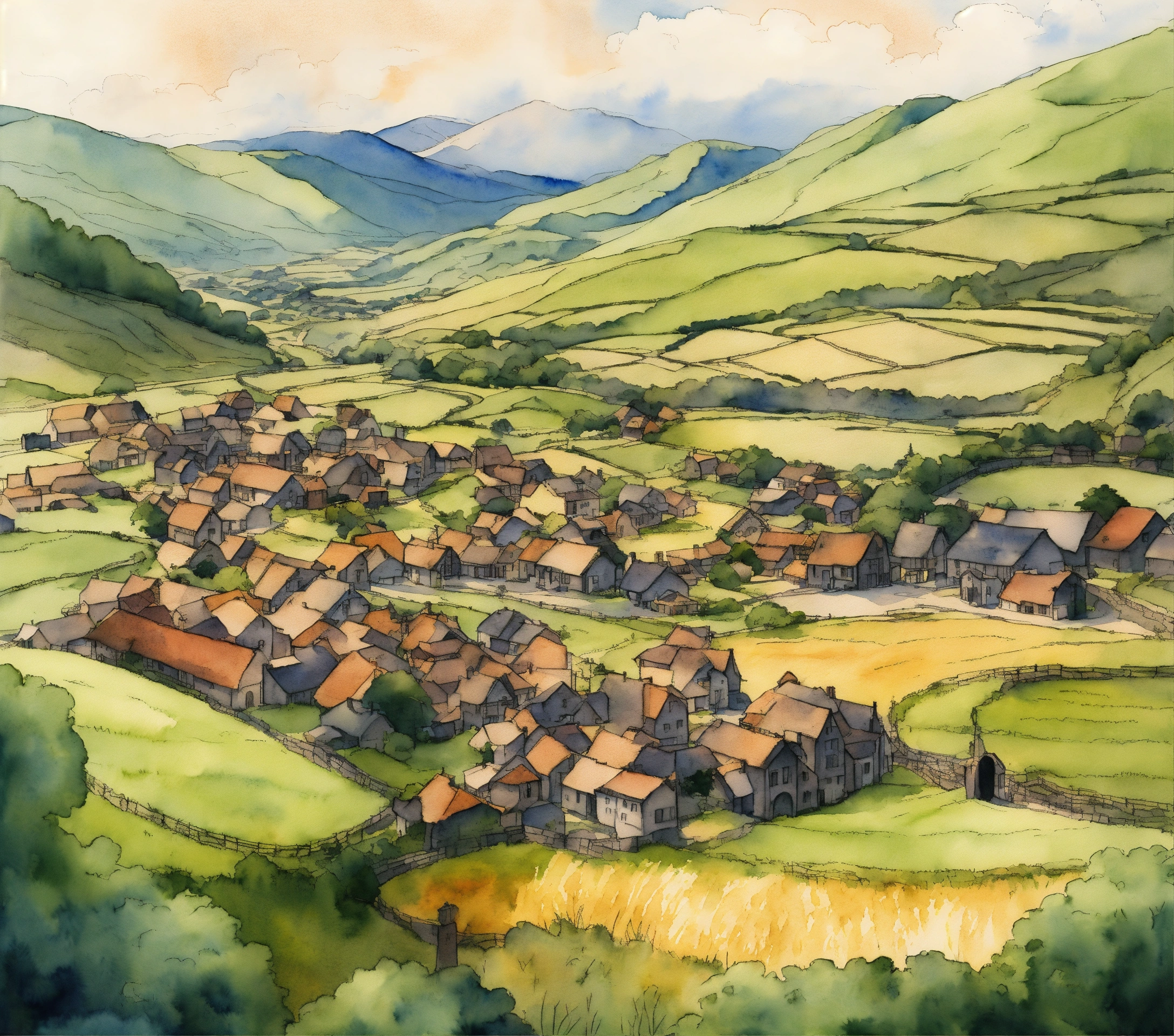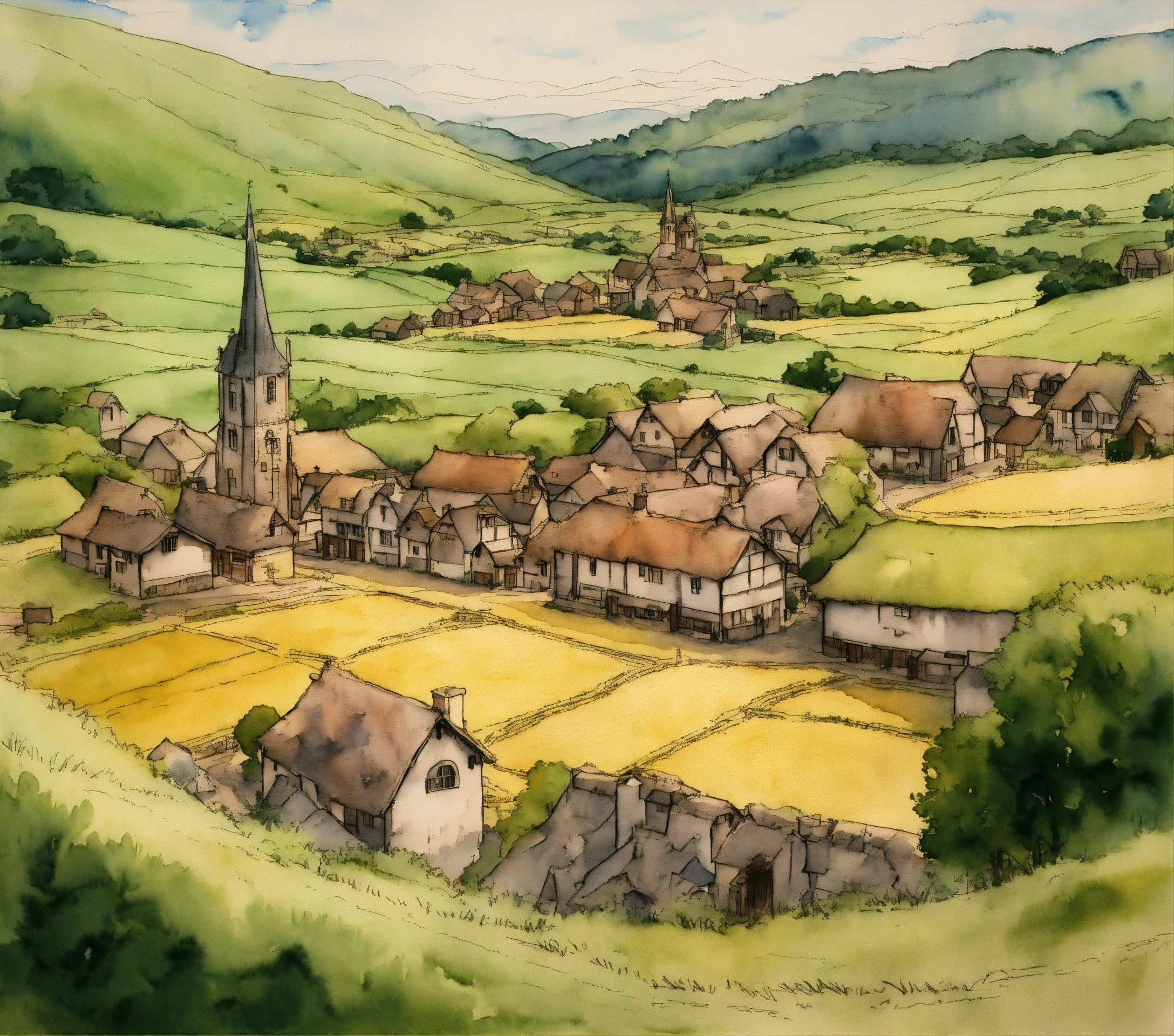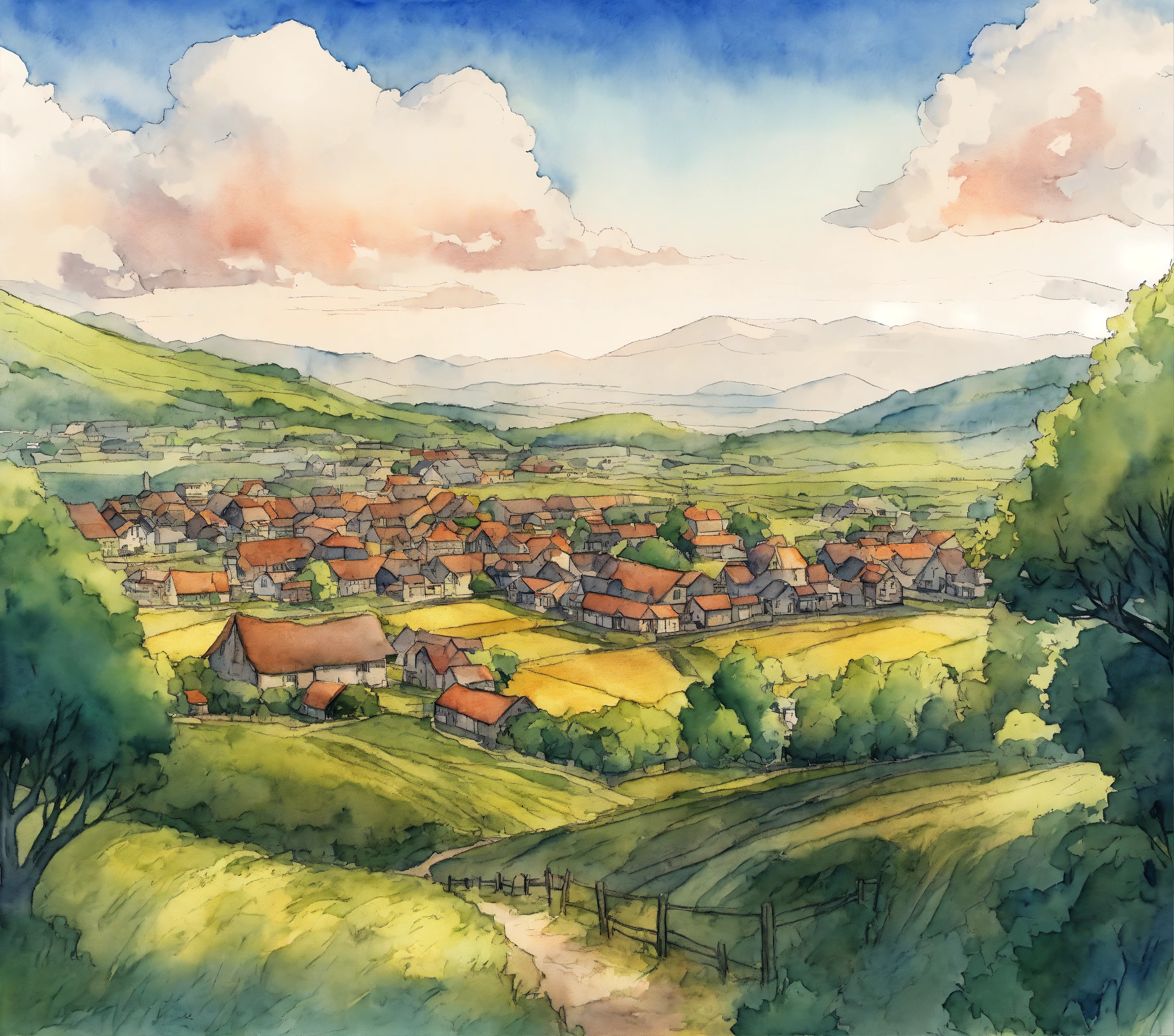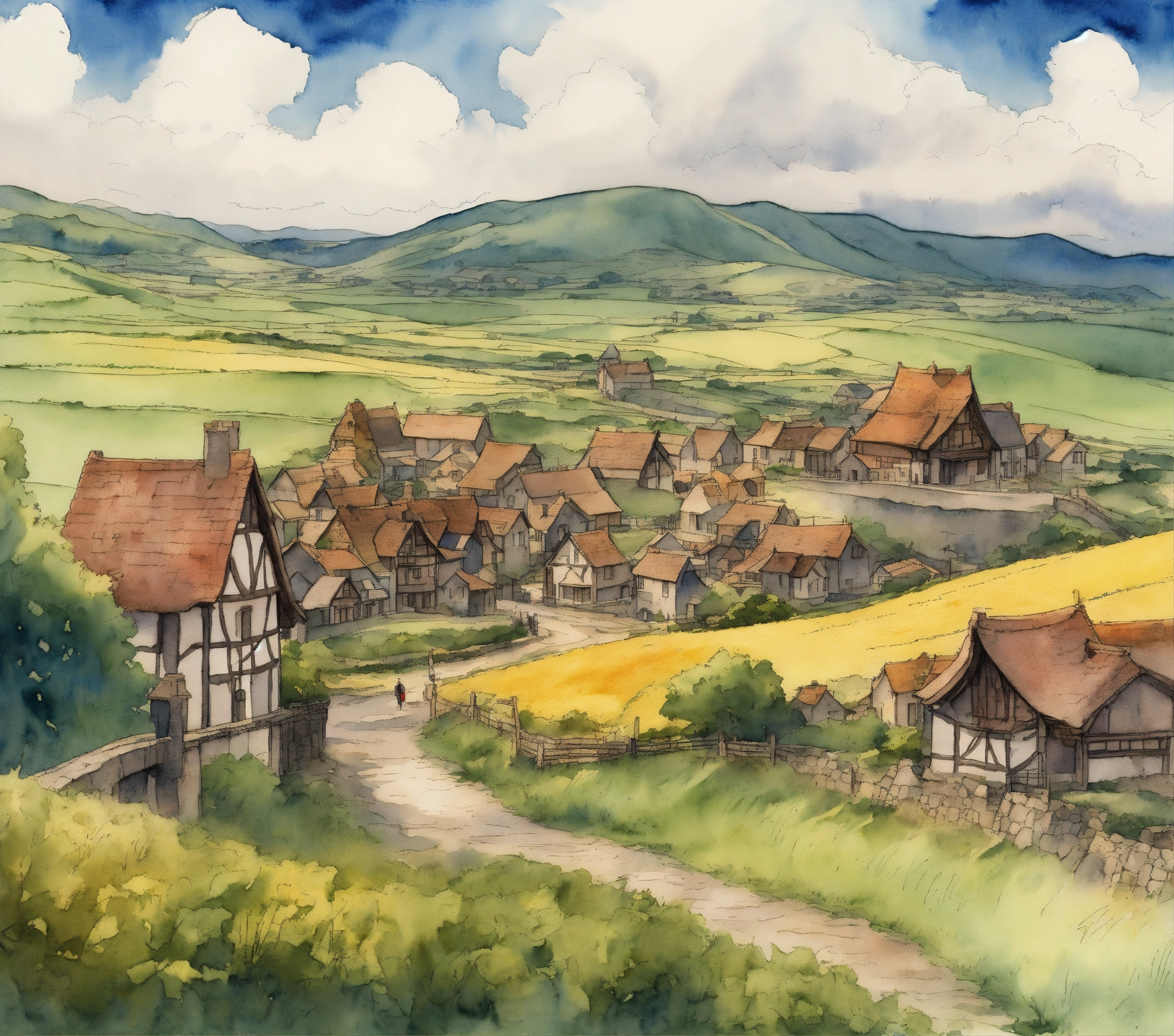The town of bree from lotr in vagabond manga drawing art style, watercolor, with fields the background