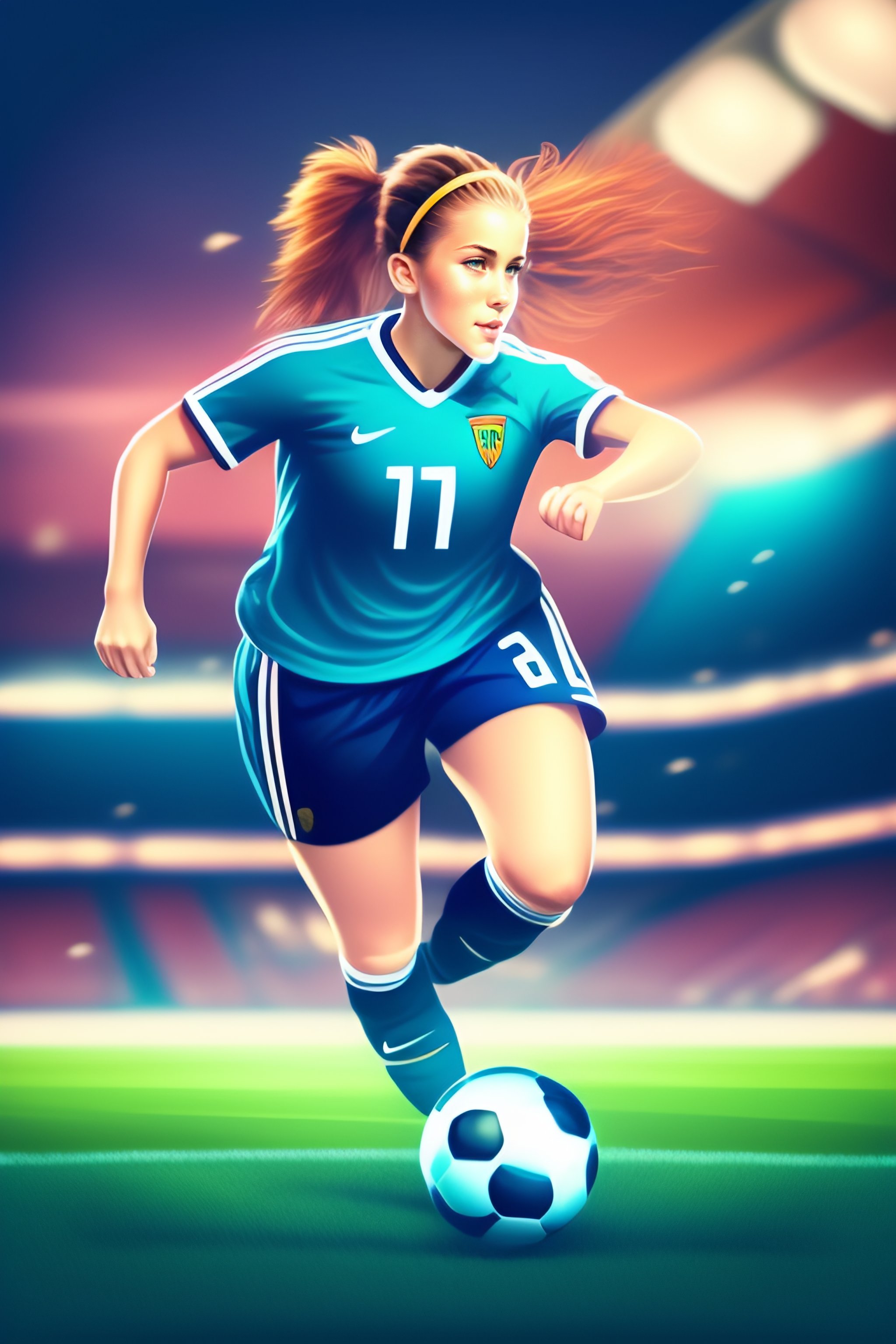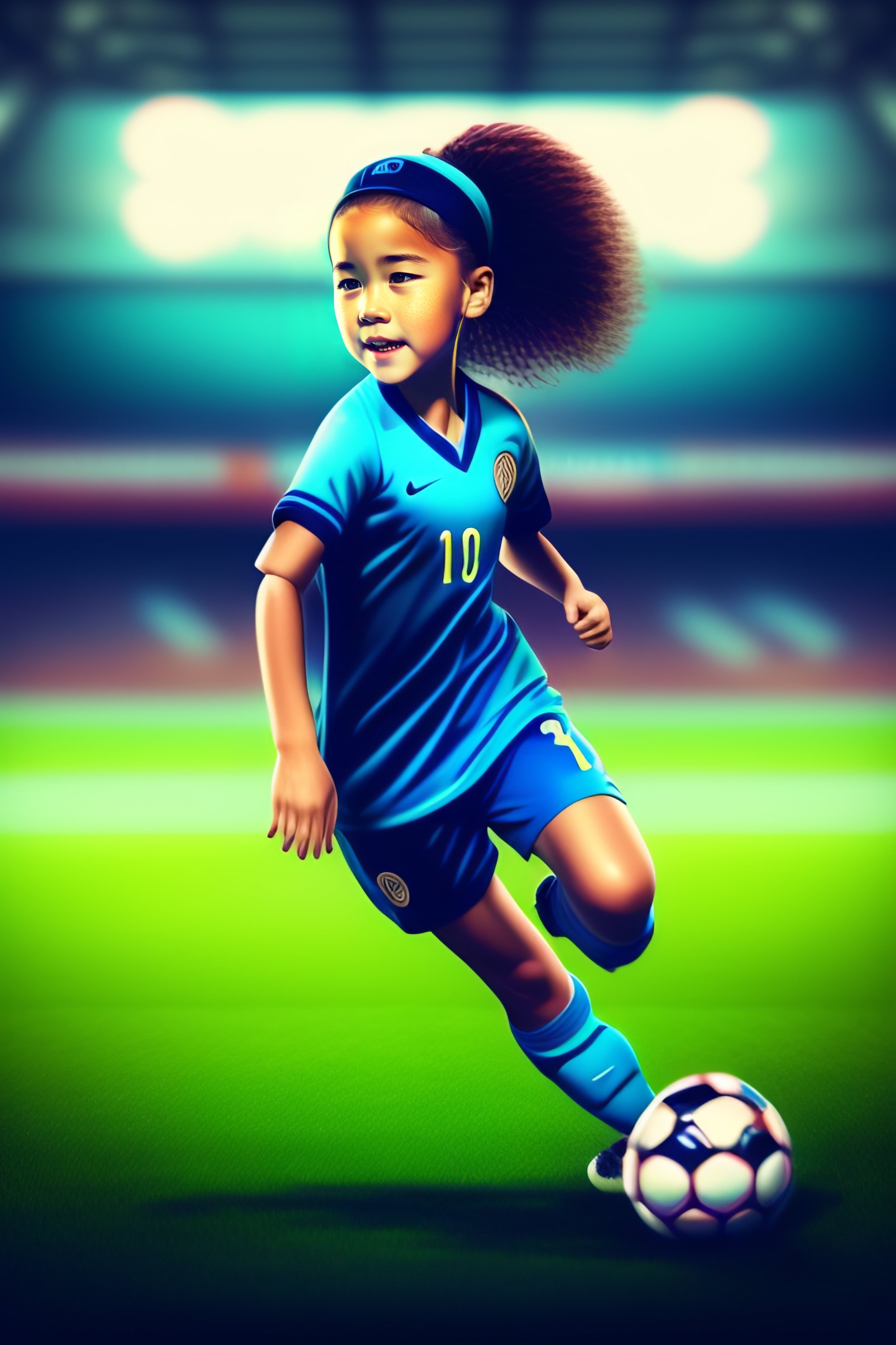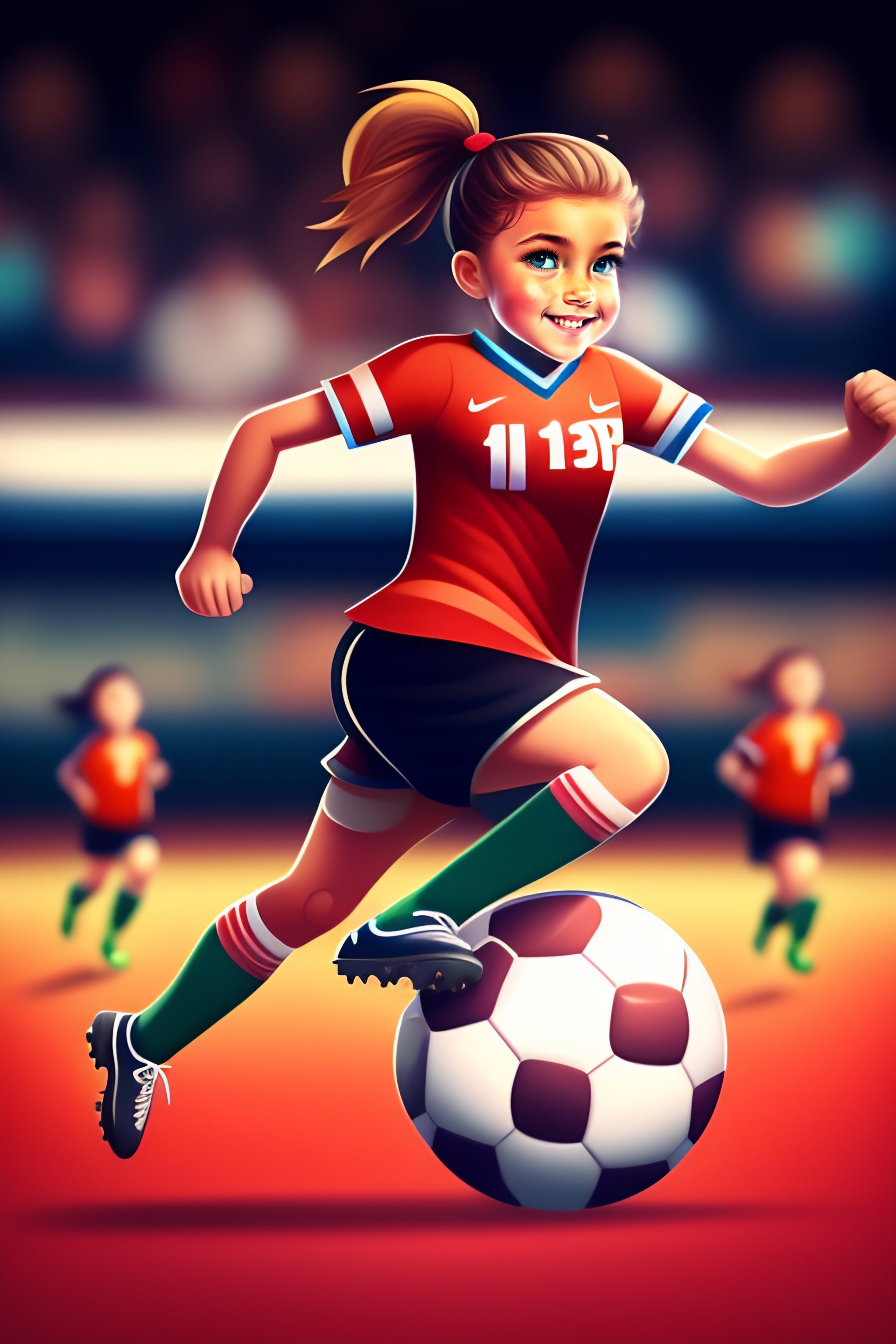 Cartoon-style girl soccer player on the field with a soccer ball scoring