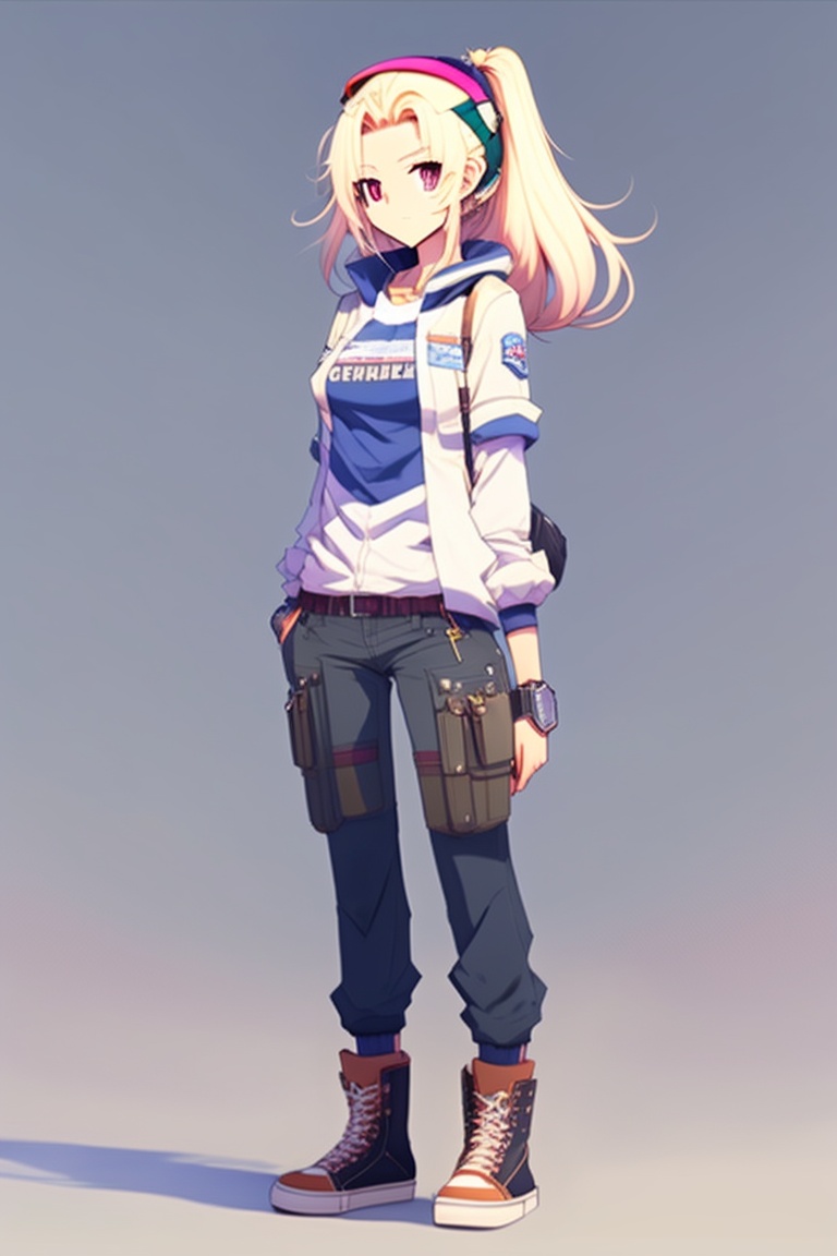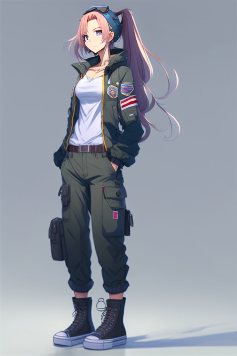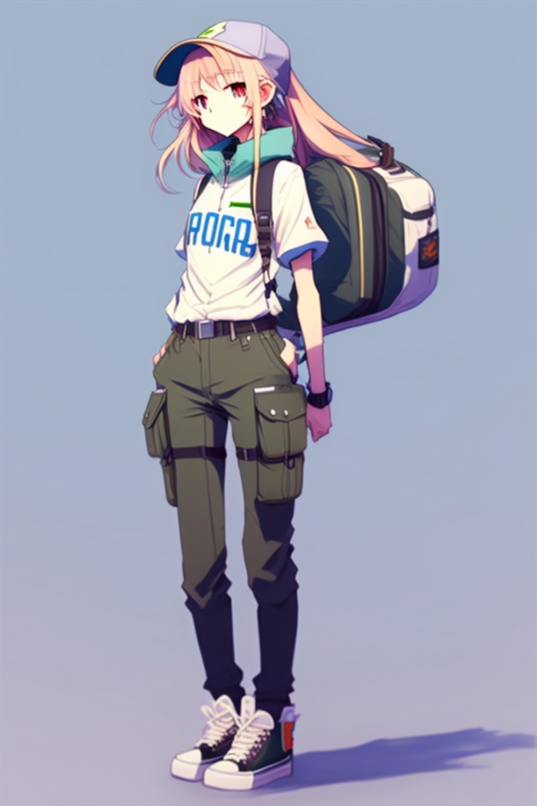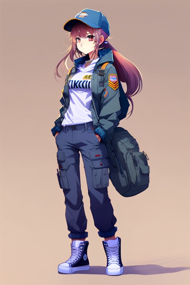 Anime girl facing the screen, looking fierce and beautiful wearing cargo pants, baggie shirt and air force vans, full body shot