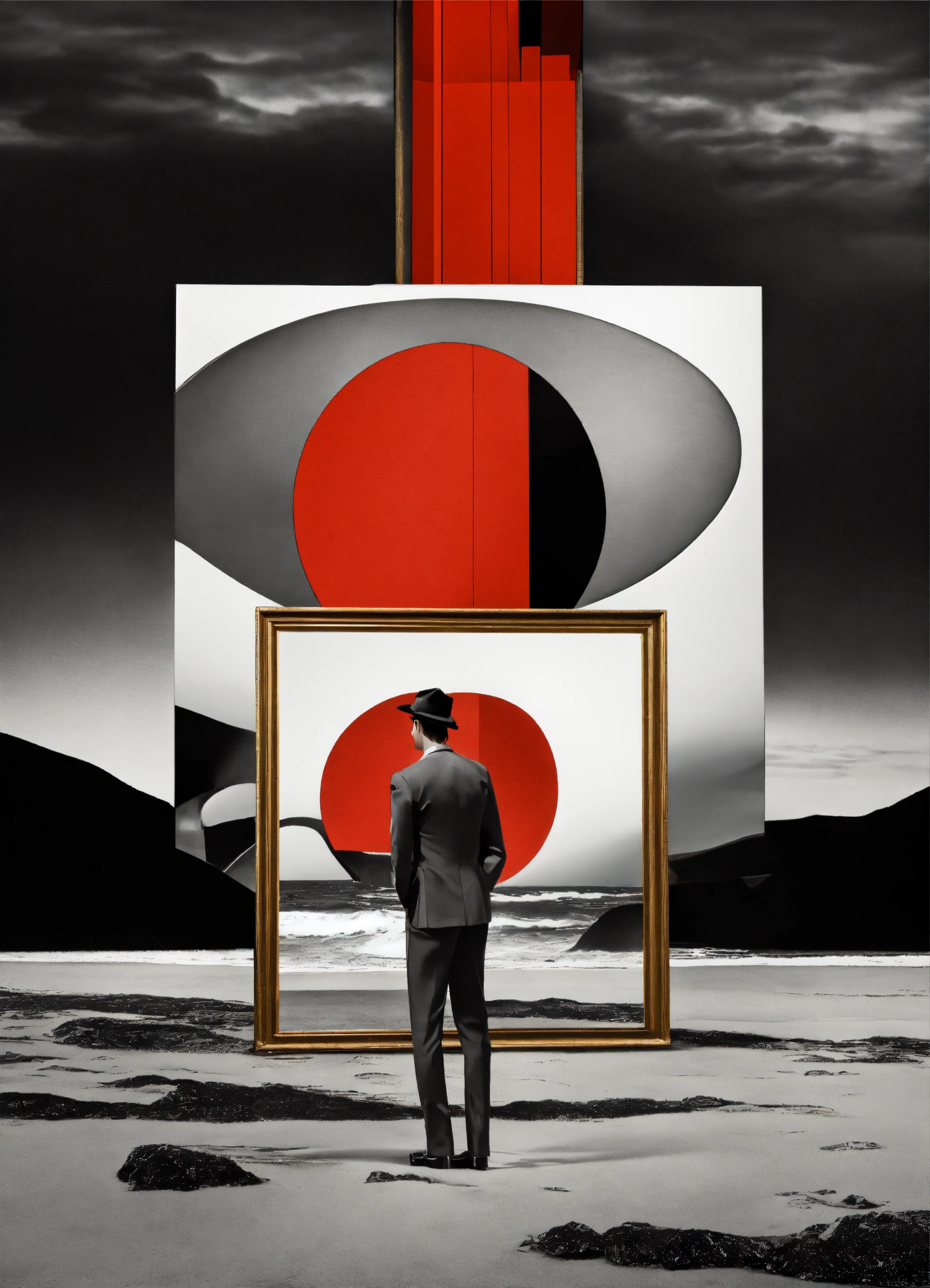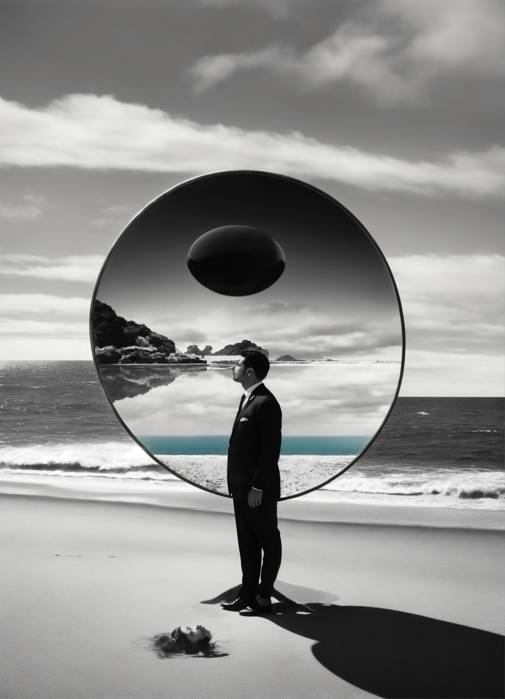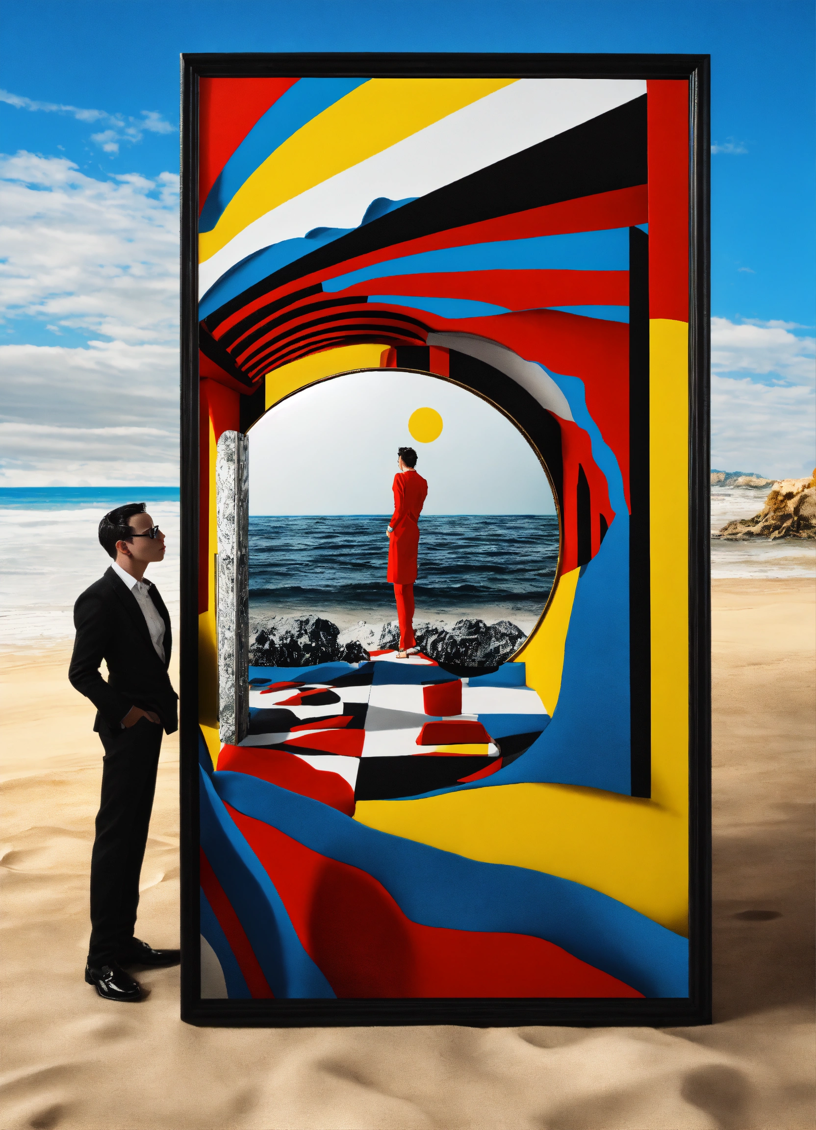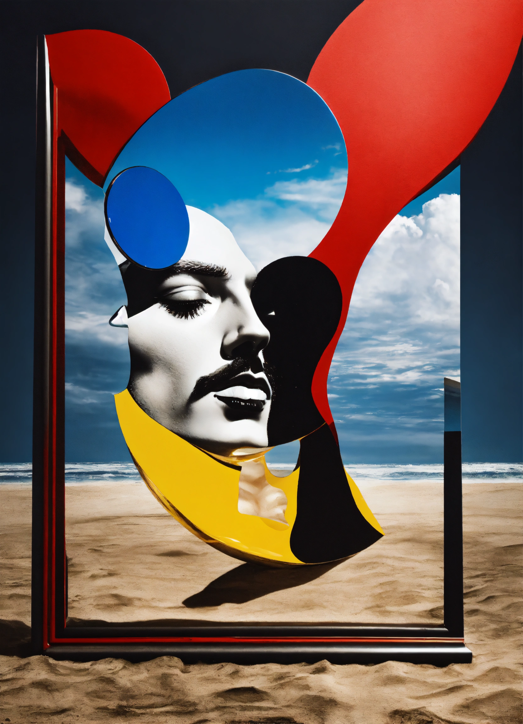 Black and white and primary colors, 3d surreal seascape, realistic men kisses portrait, immersive inspired art deco beach, upside down mirror, salvador dali inspiration.