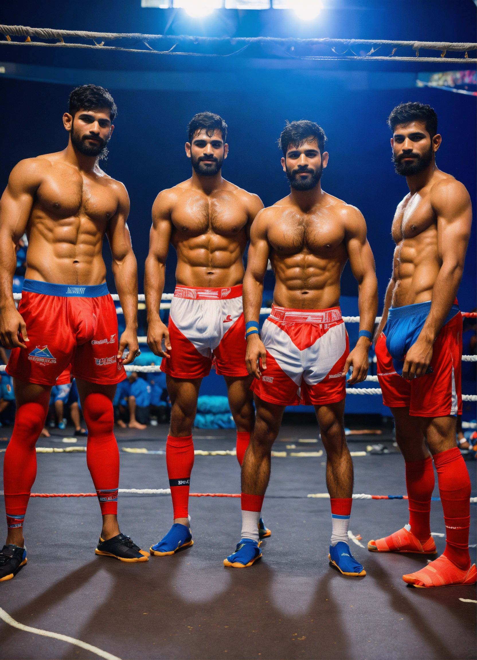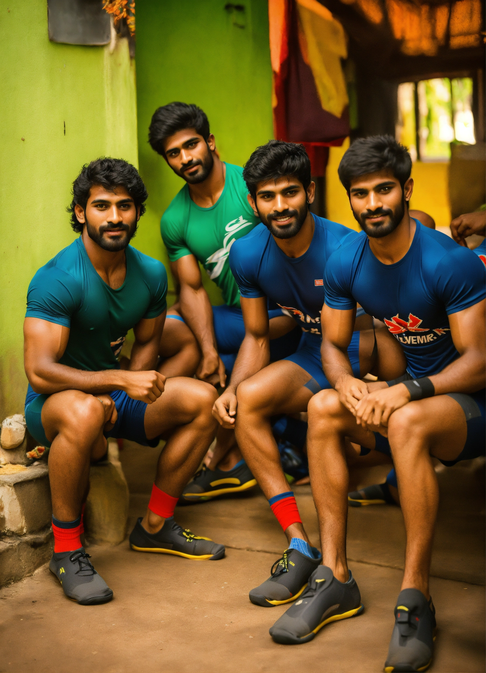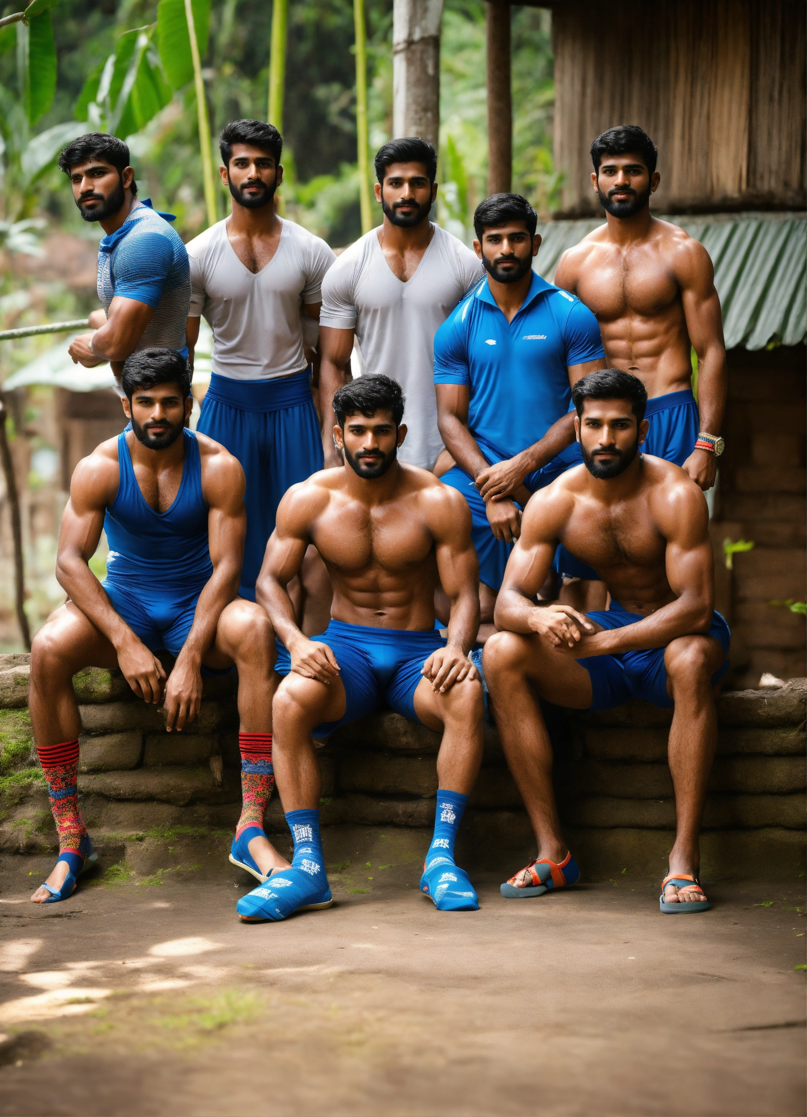 Group of six pack abs skinny sweaty wrestlers boxers handsome kerala guys, legs very hairy, squatting wearing sporty socks and slides