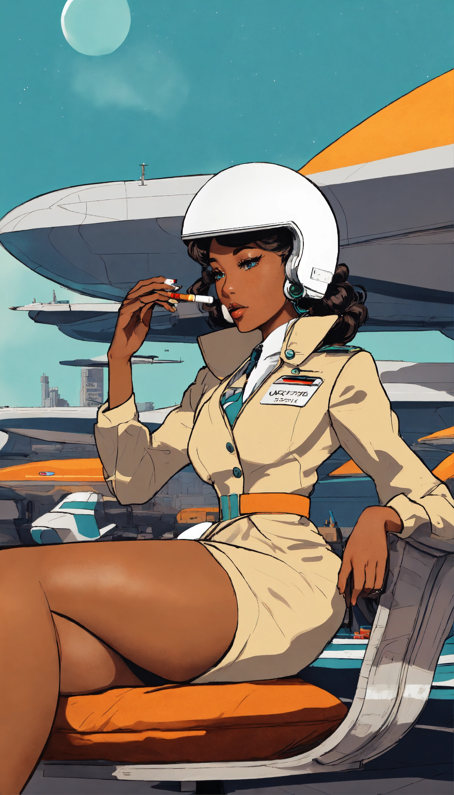 Anime, black jetsons, cartoon smoke, joint company anthropomorphic female branding, "traybien", modern ethiopian 👩🏾25 years_old, vintage aesthetic, icons, business cards, pinup, bauhaus, kwakiutl, blue and mint, golden ratio, formfitting stewardess flightsuit, [futuristic transparent helmet], creative layflat, "traybien" hand lettering, cigarette packaging, art deco architekture|graffiti, perfect composition, approaching perfection, balanced amalgamation, many retro vintage black and japanese stickers, by edward hopper and norman rockwell and zaha hadid