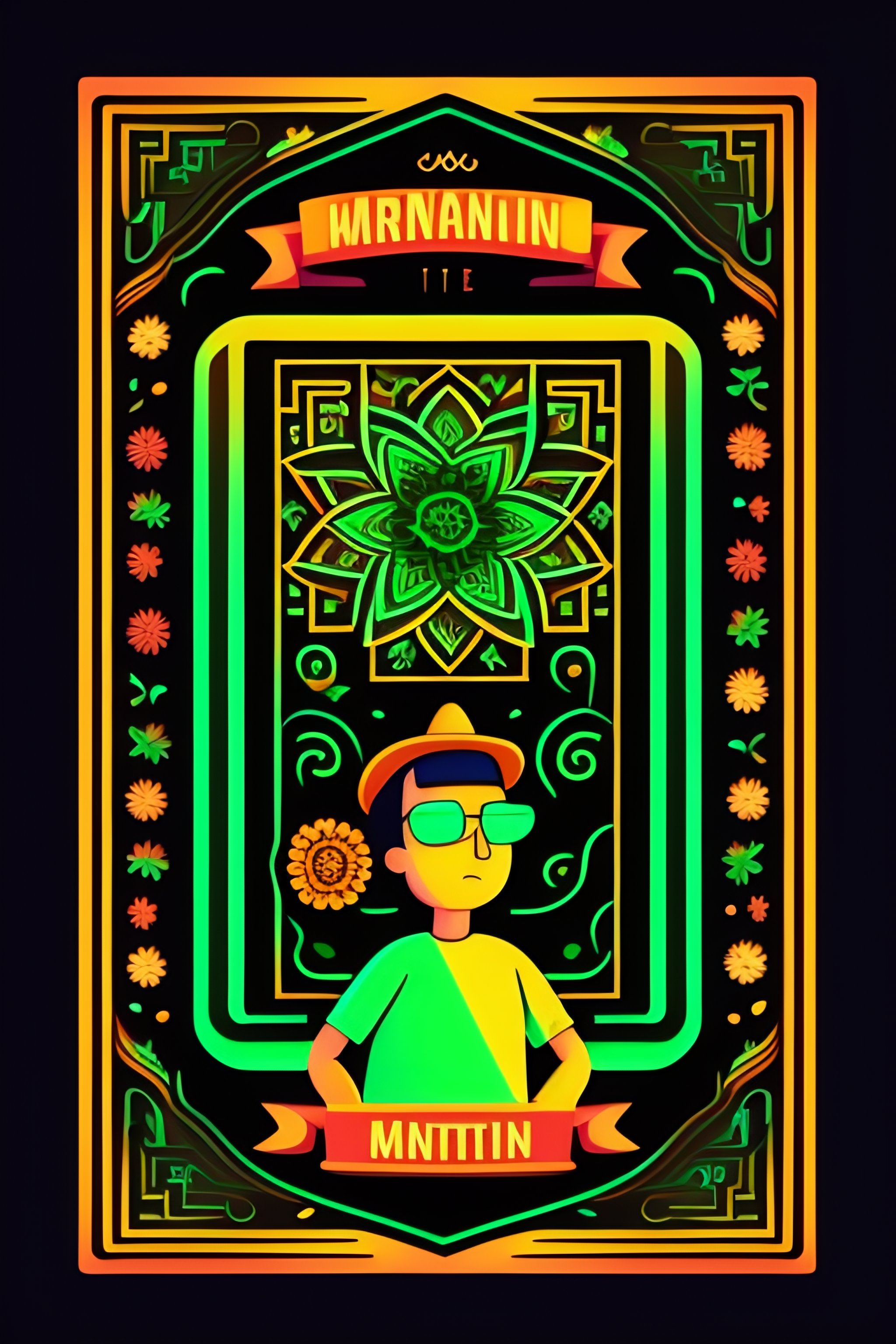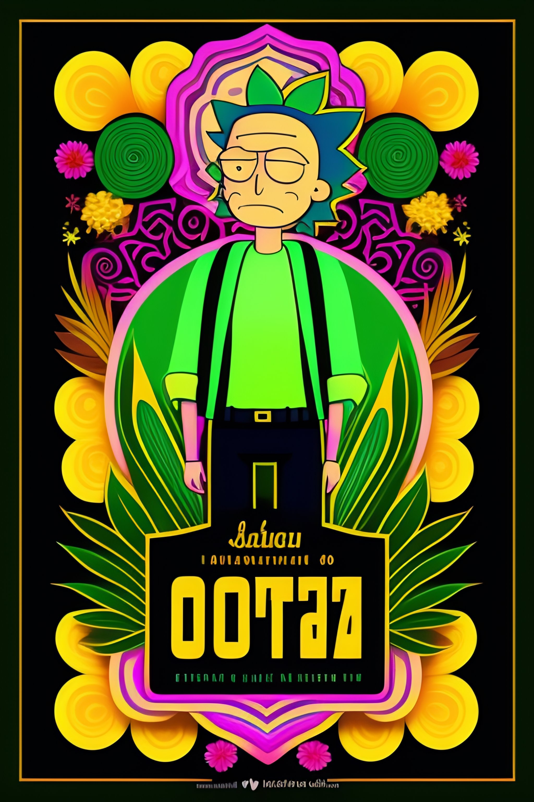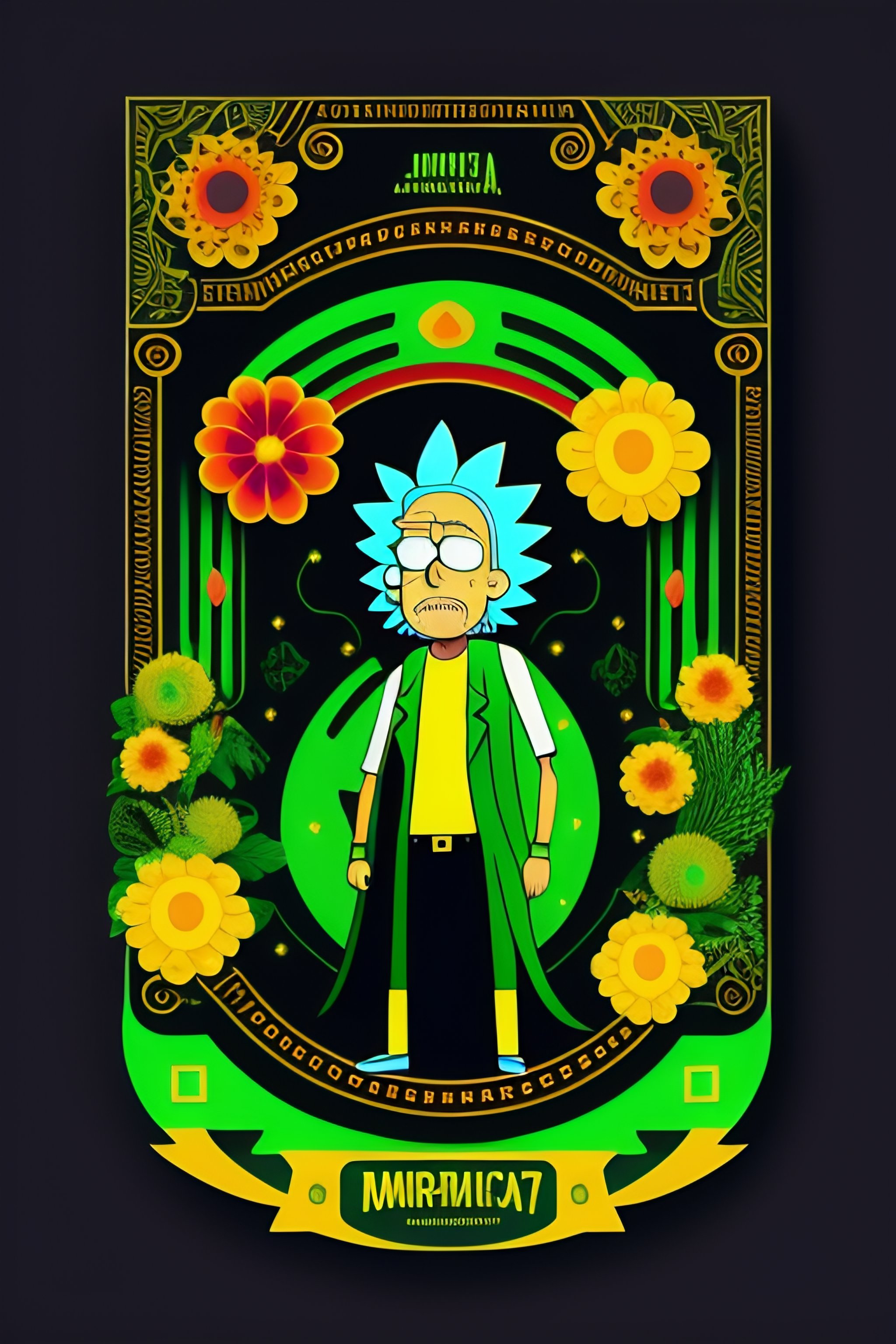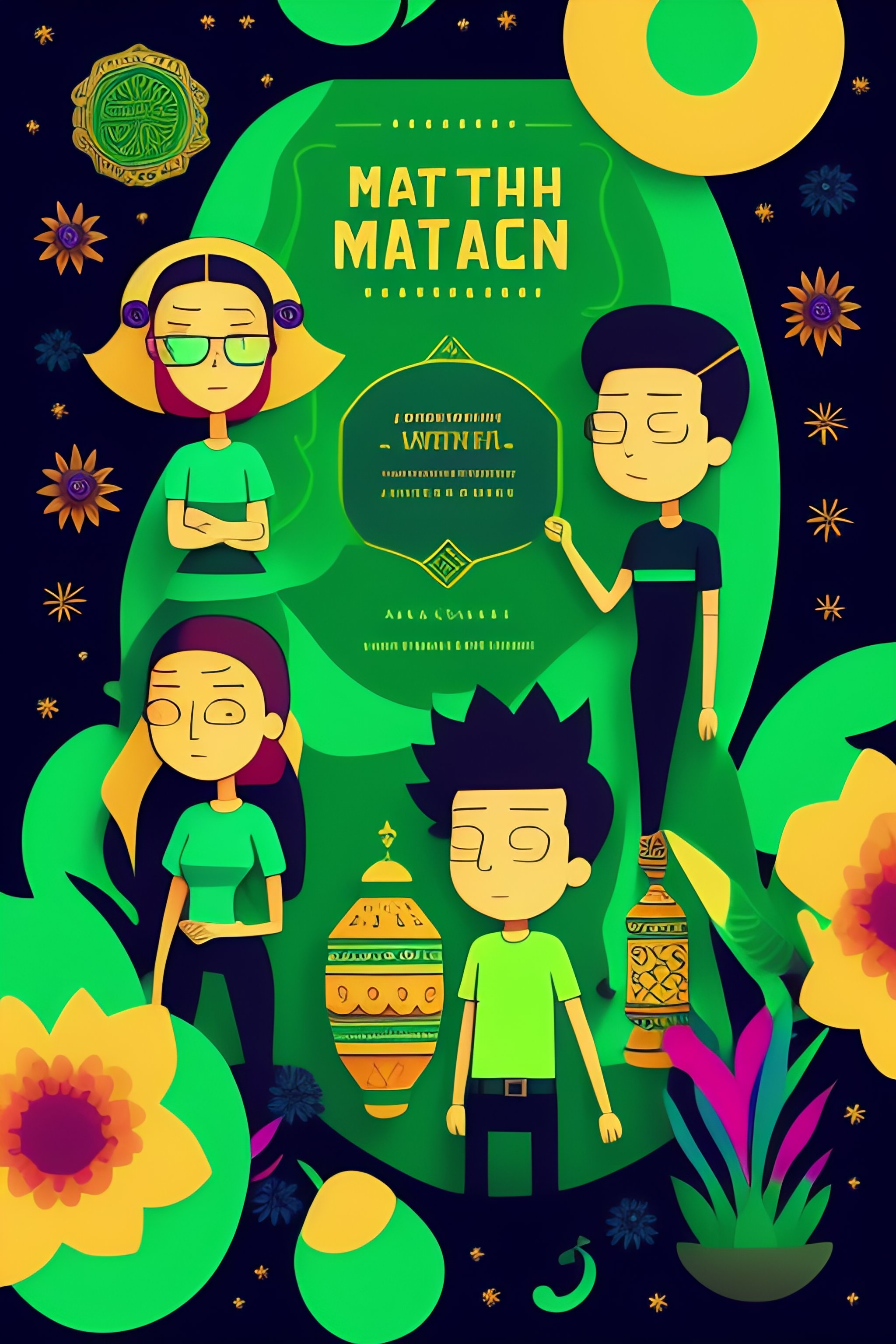 Vector flat flyer, flyer flat vector 2d image of rick and morty surrounded by mexican ornamental elements, flowers, garlands of lights and native plants, colors green and black