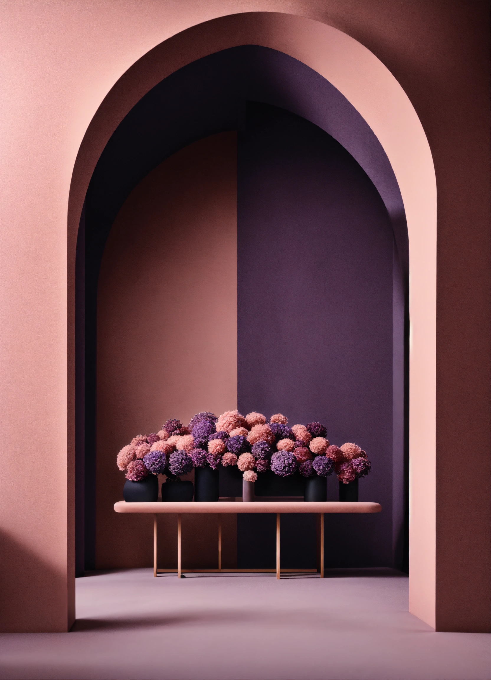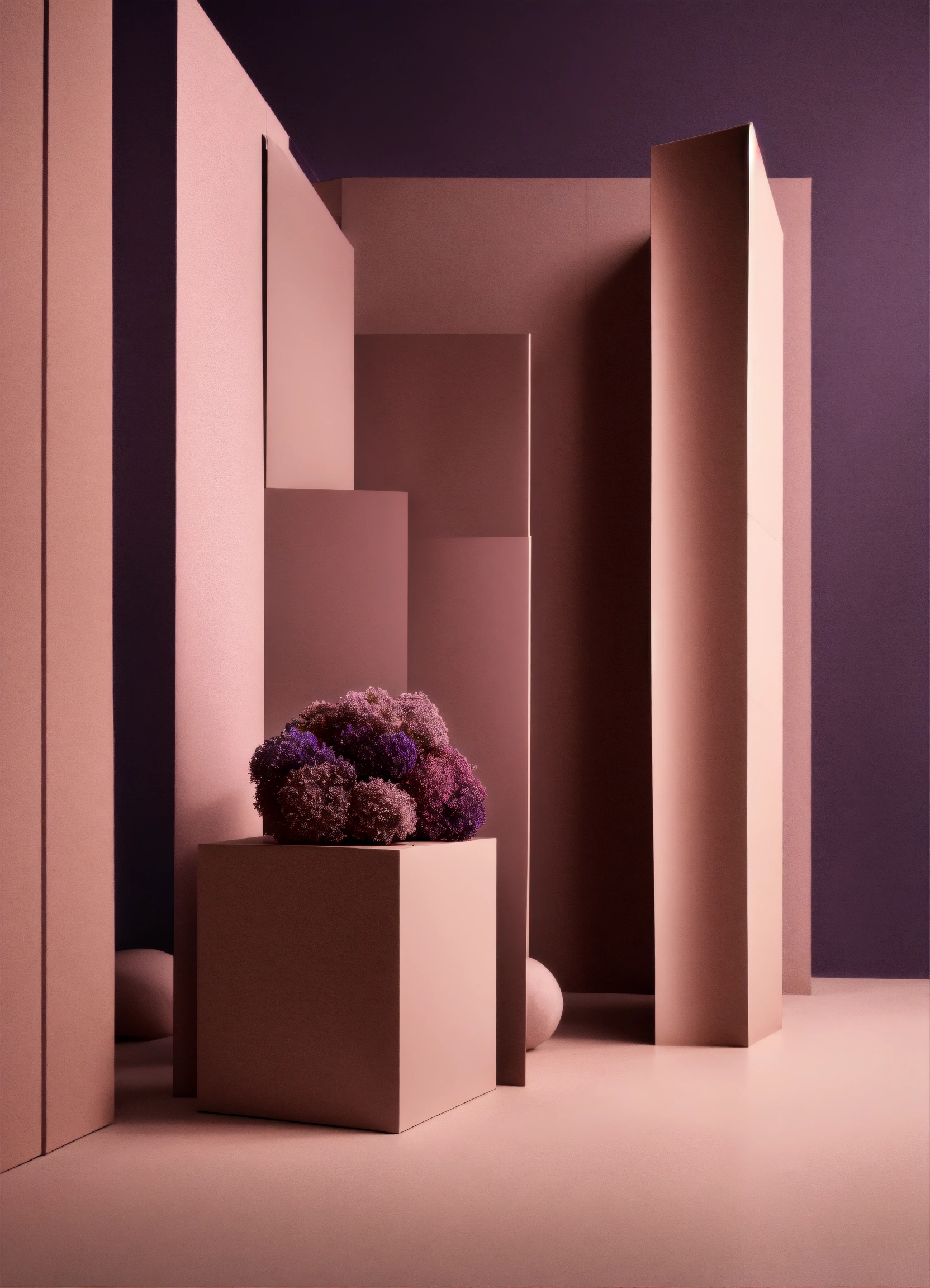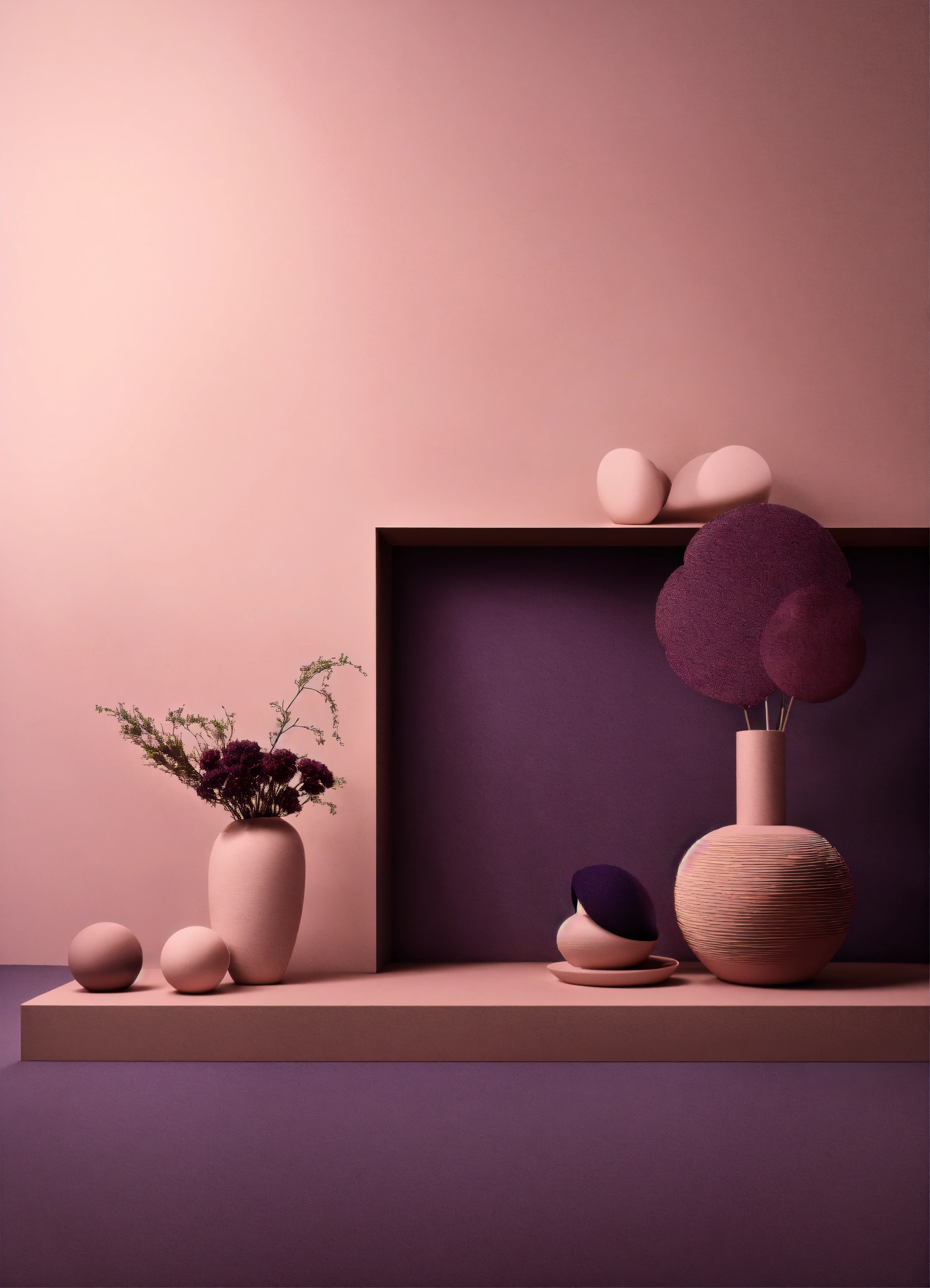 Muted tones of dusty pink and dark purple surreal combination with minimalist compositions, evoking a sense of calmness, wedding installations, simple bare minimalist style 3d compositions, wedding theme.