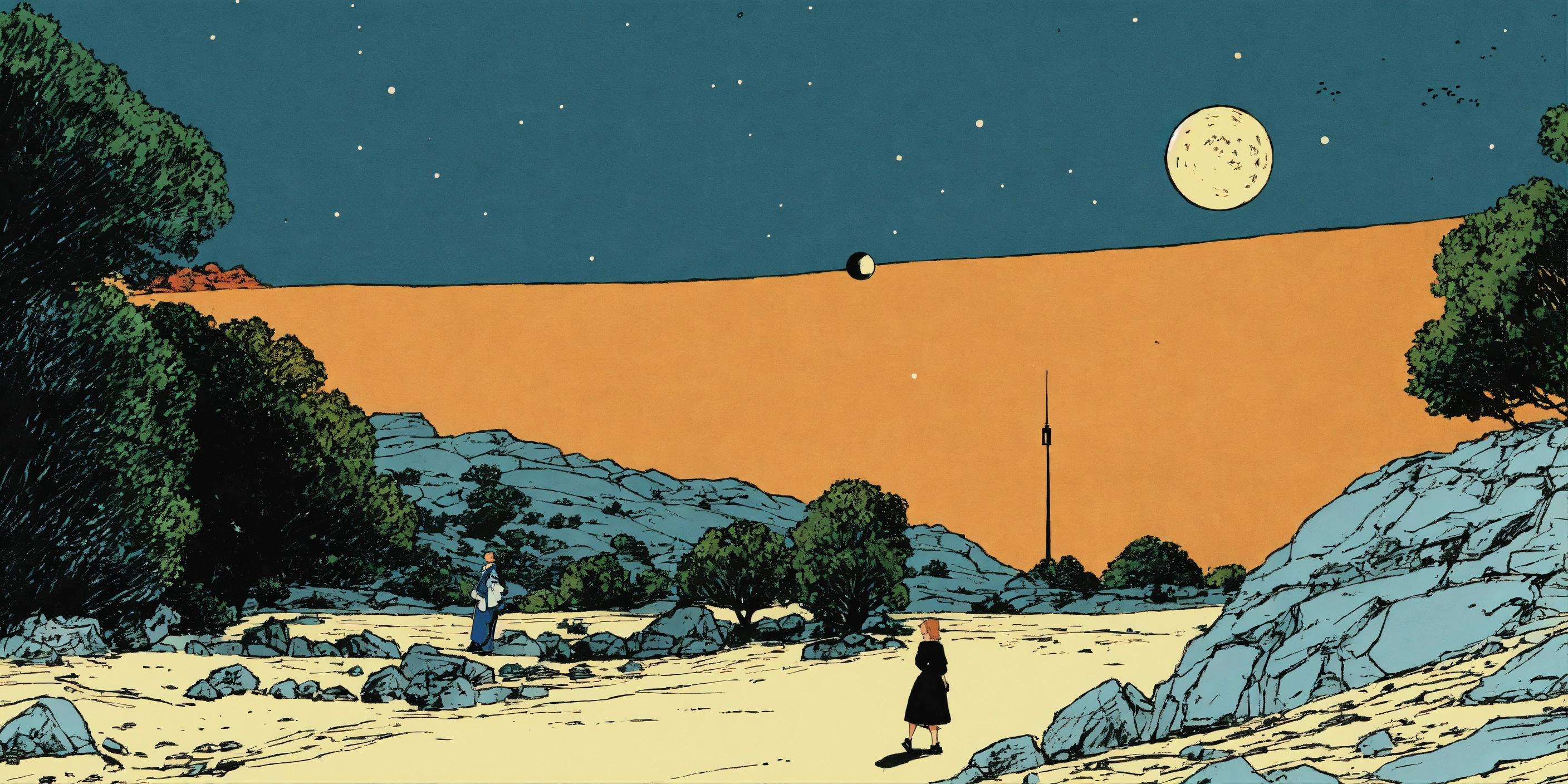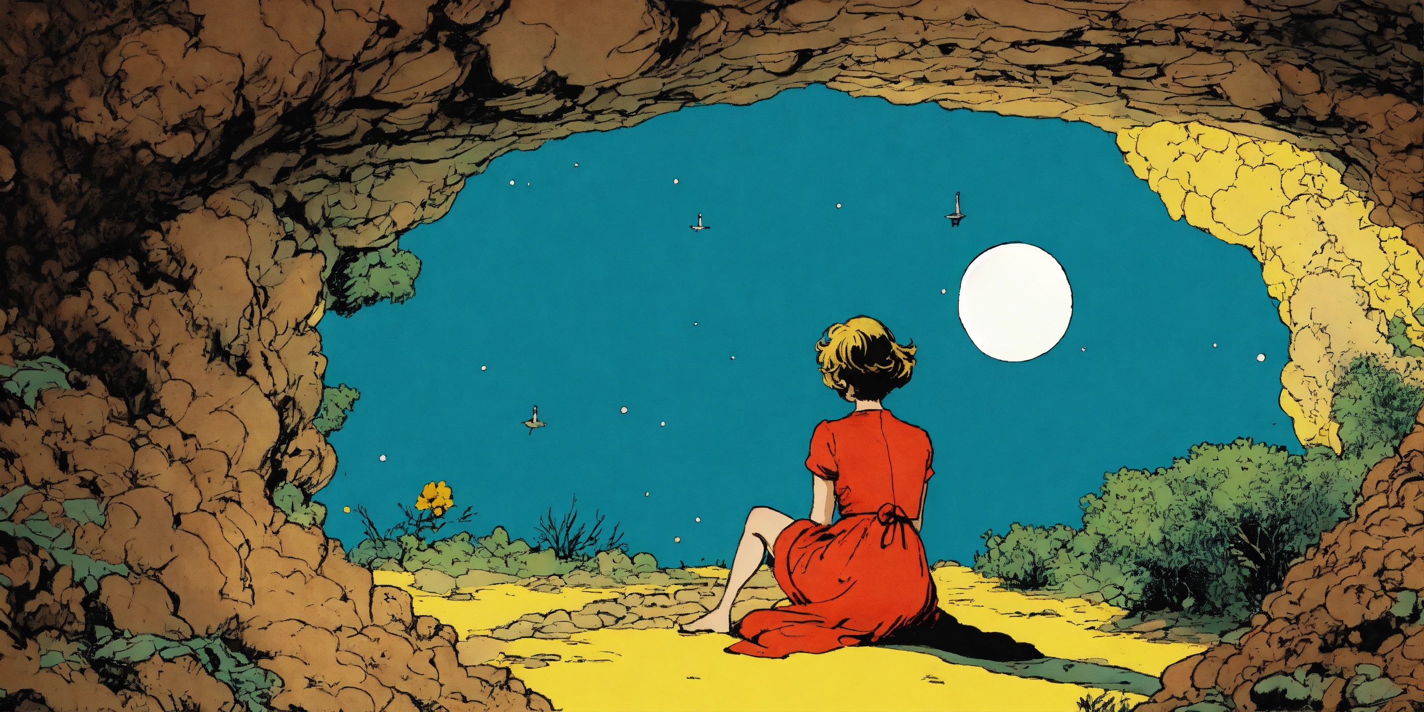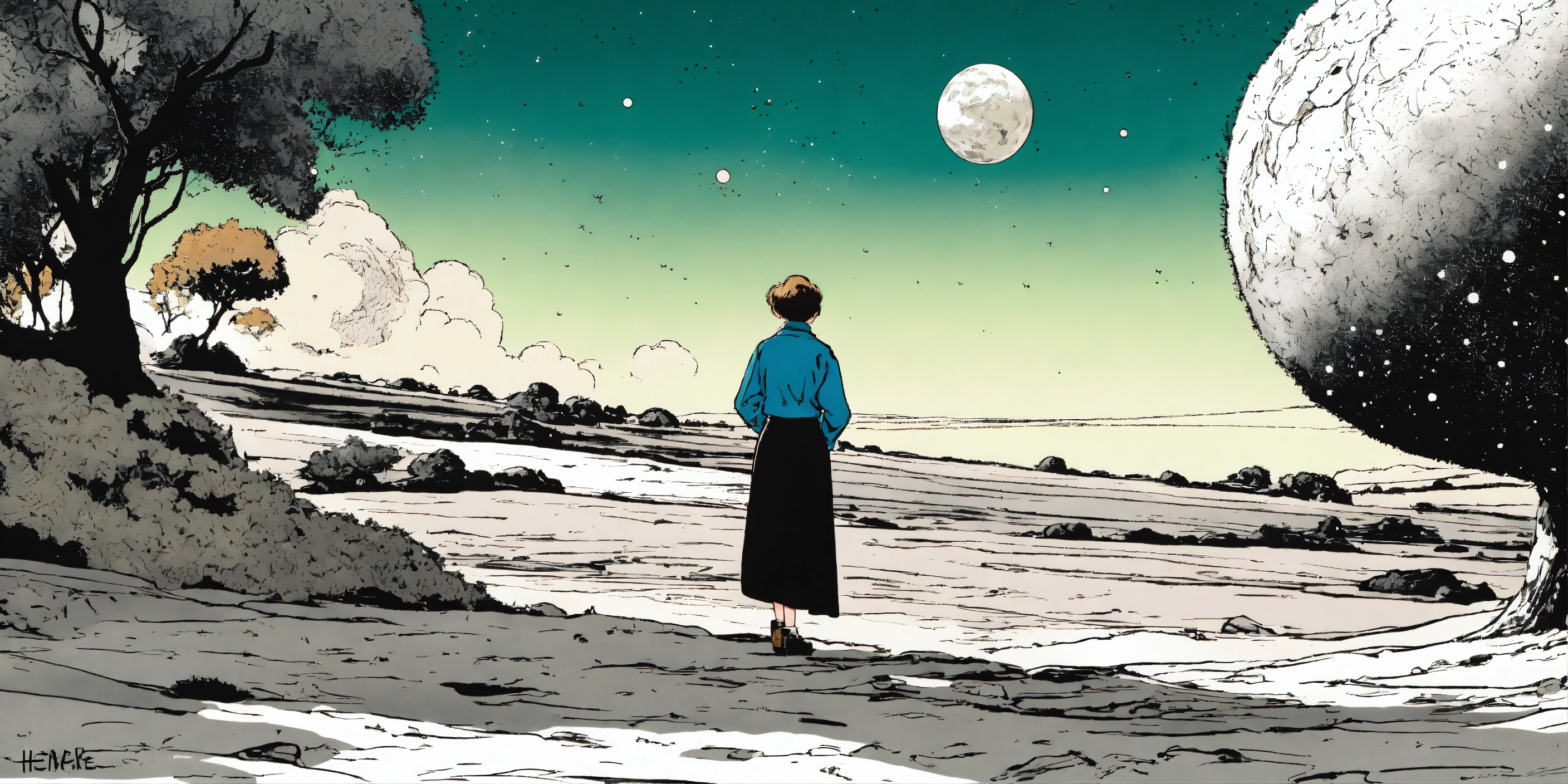 Pen and ink, illustrated by hergé, background space and earth. woman alone forever. sadness, stunning color scheme, masterpiece