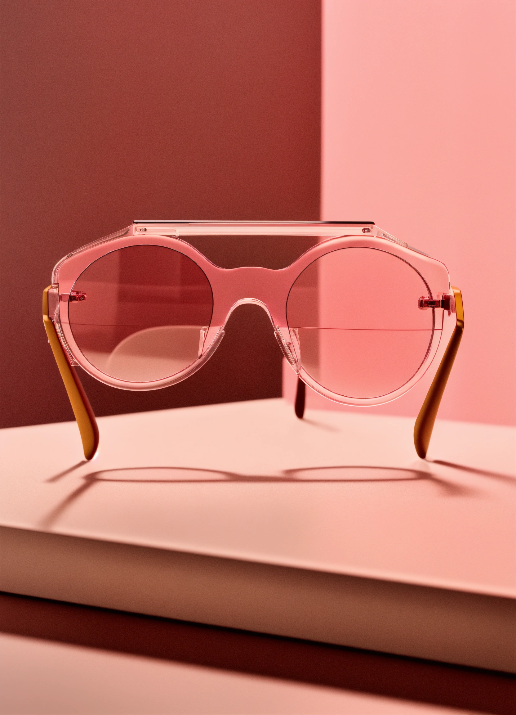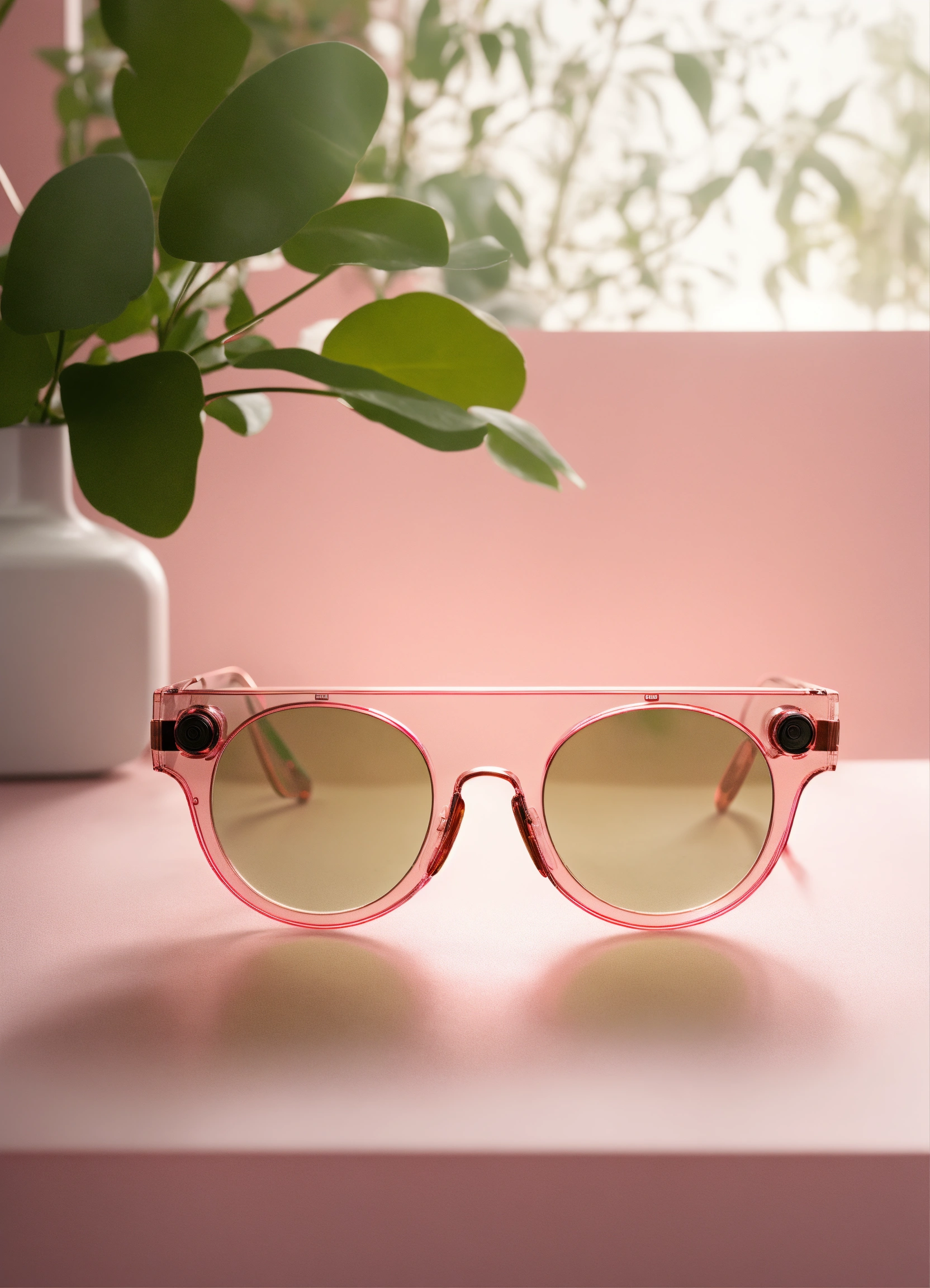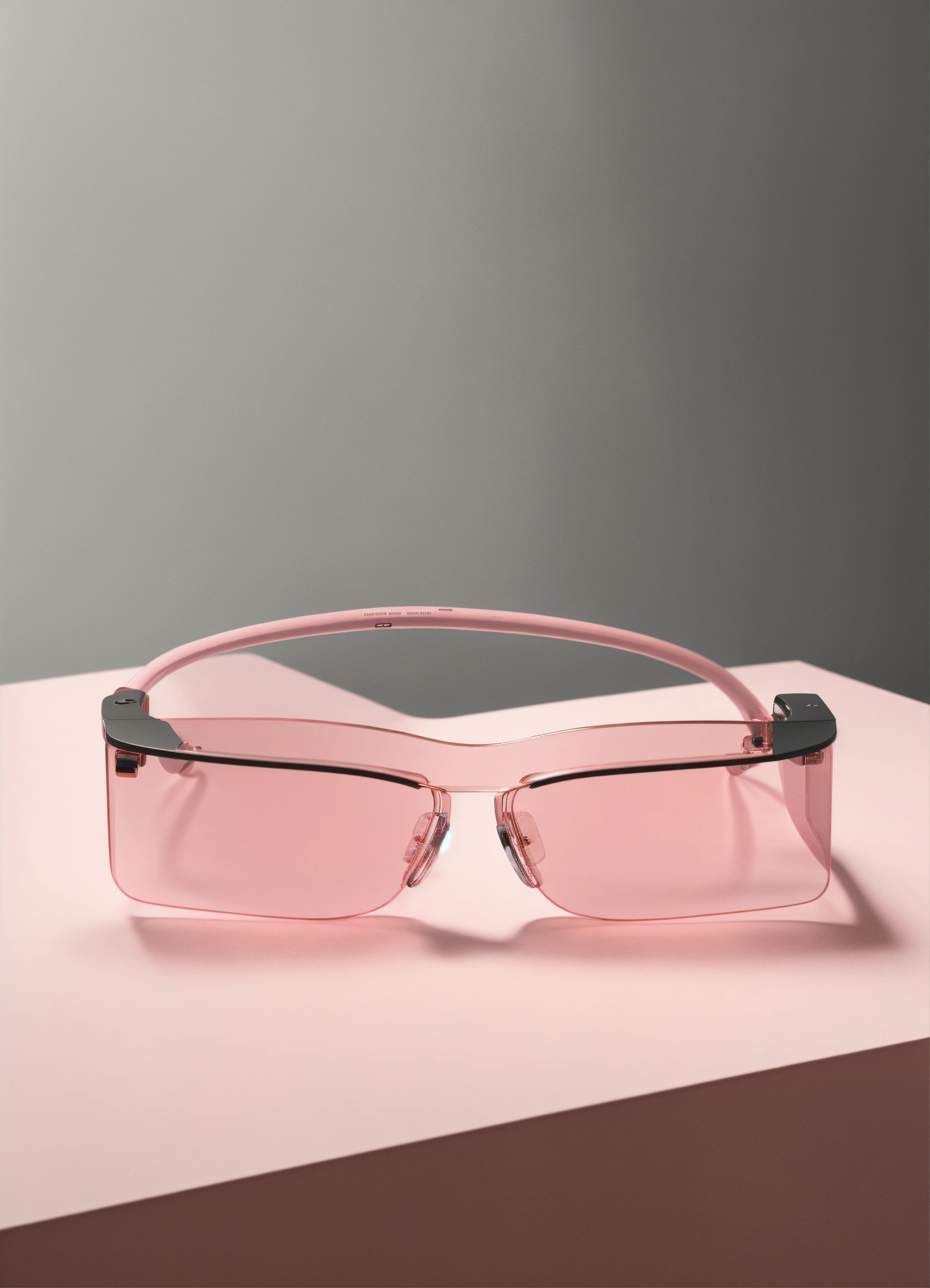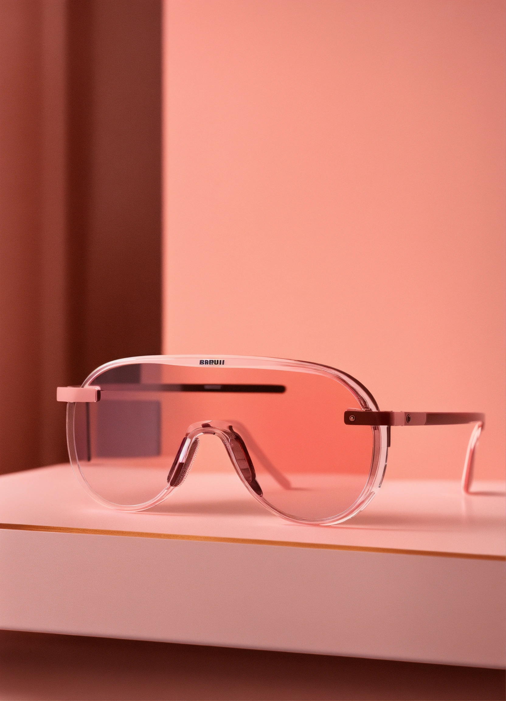 A stunning, minimalist, thin lightweight light pink translucent glass vr glasses designed by braun, dieter rams. product ad retro. industrial design inspiration. unreal engine render, natural lighting, on desk, beautiful shot