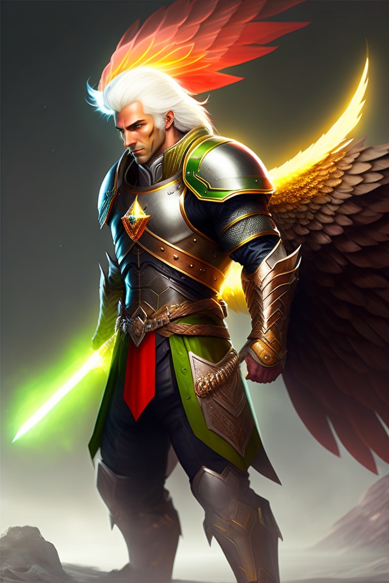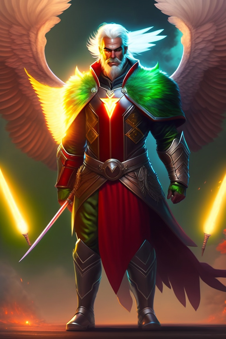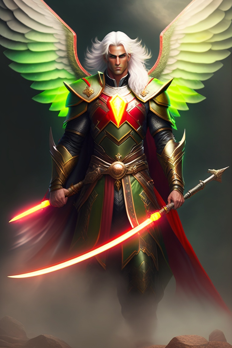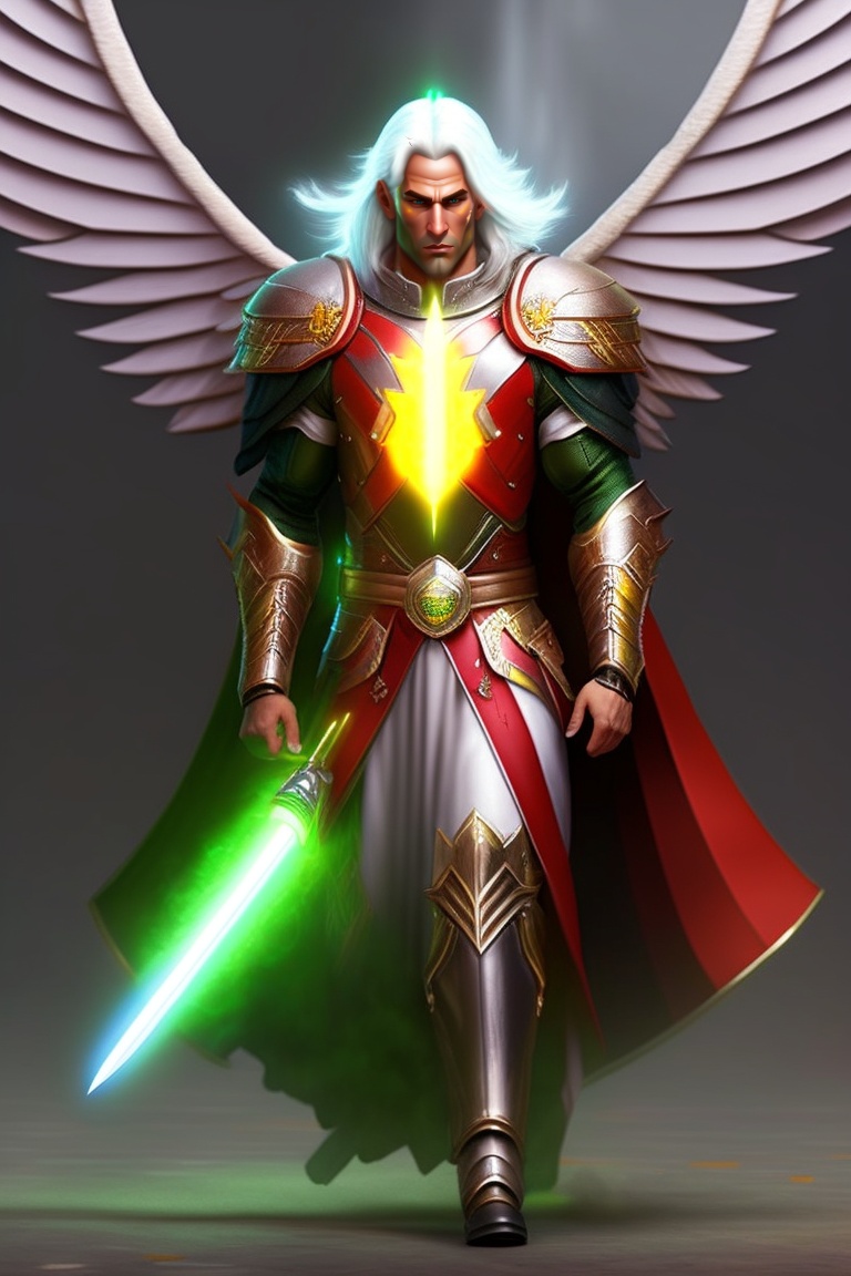 Aasimar man with wings haloed with yellow light beam, with a scimitar red, full body, white hair attached, elvan chain green
