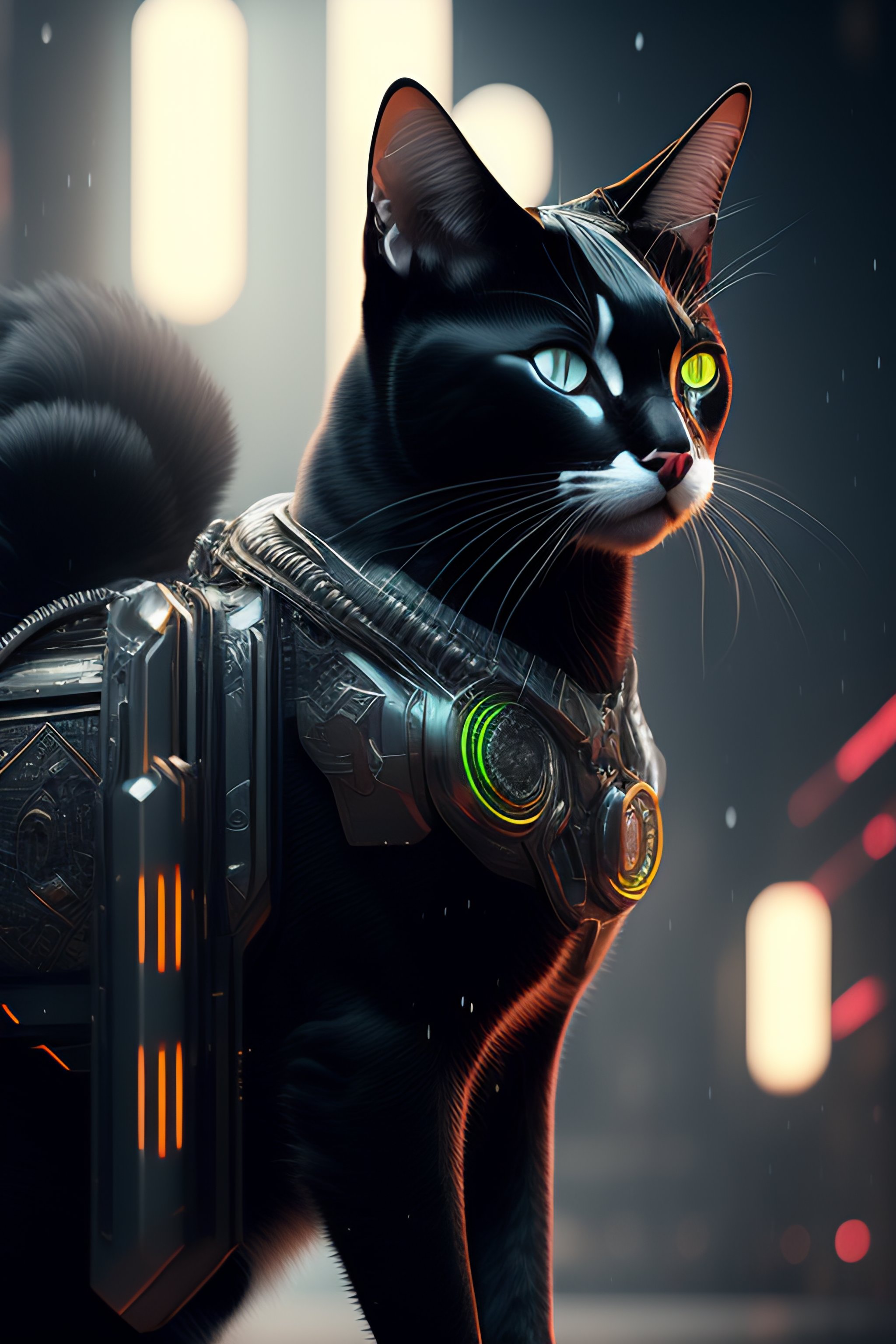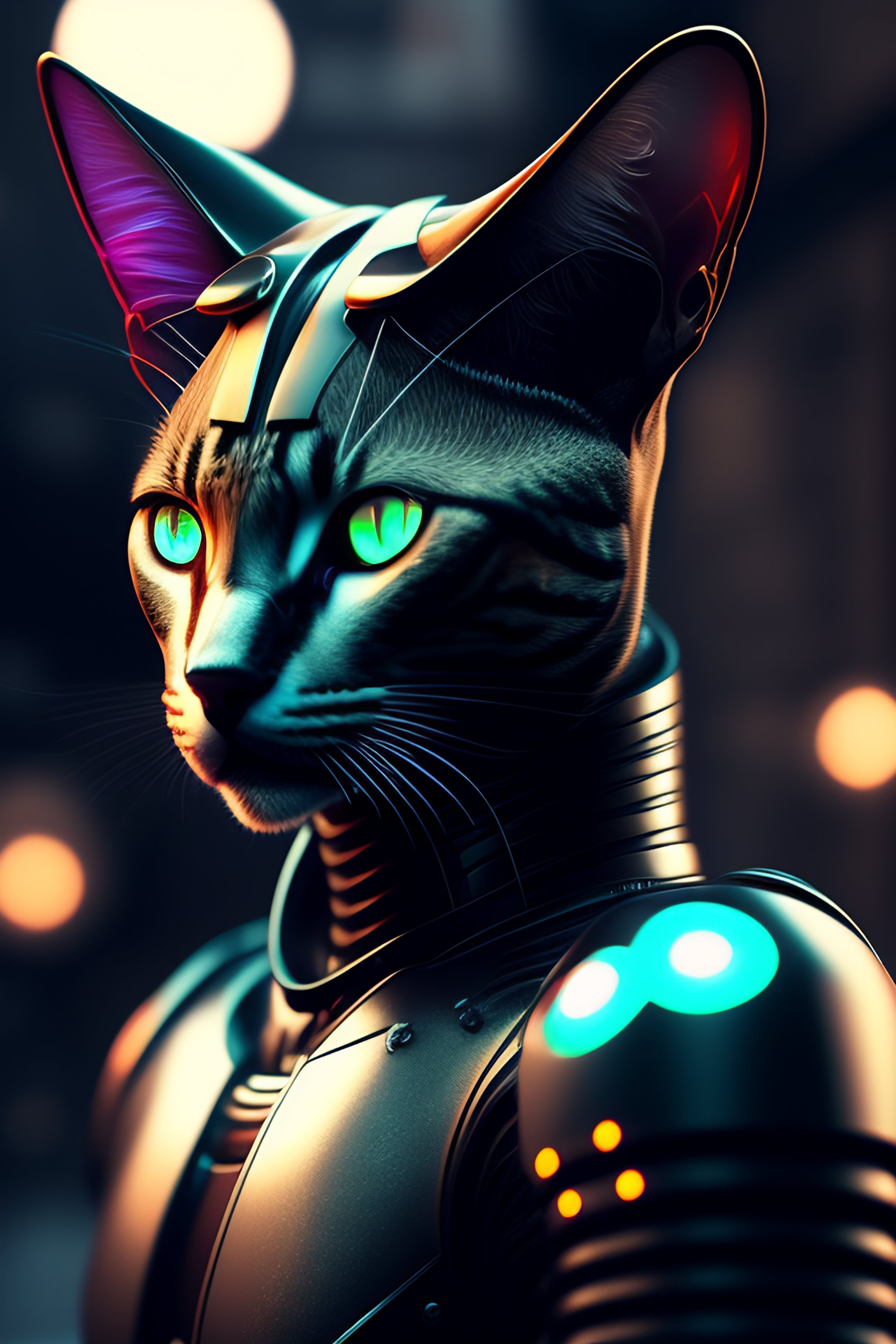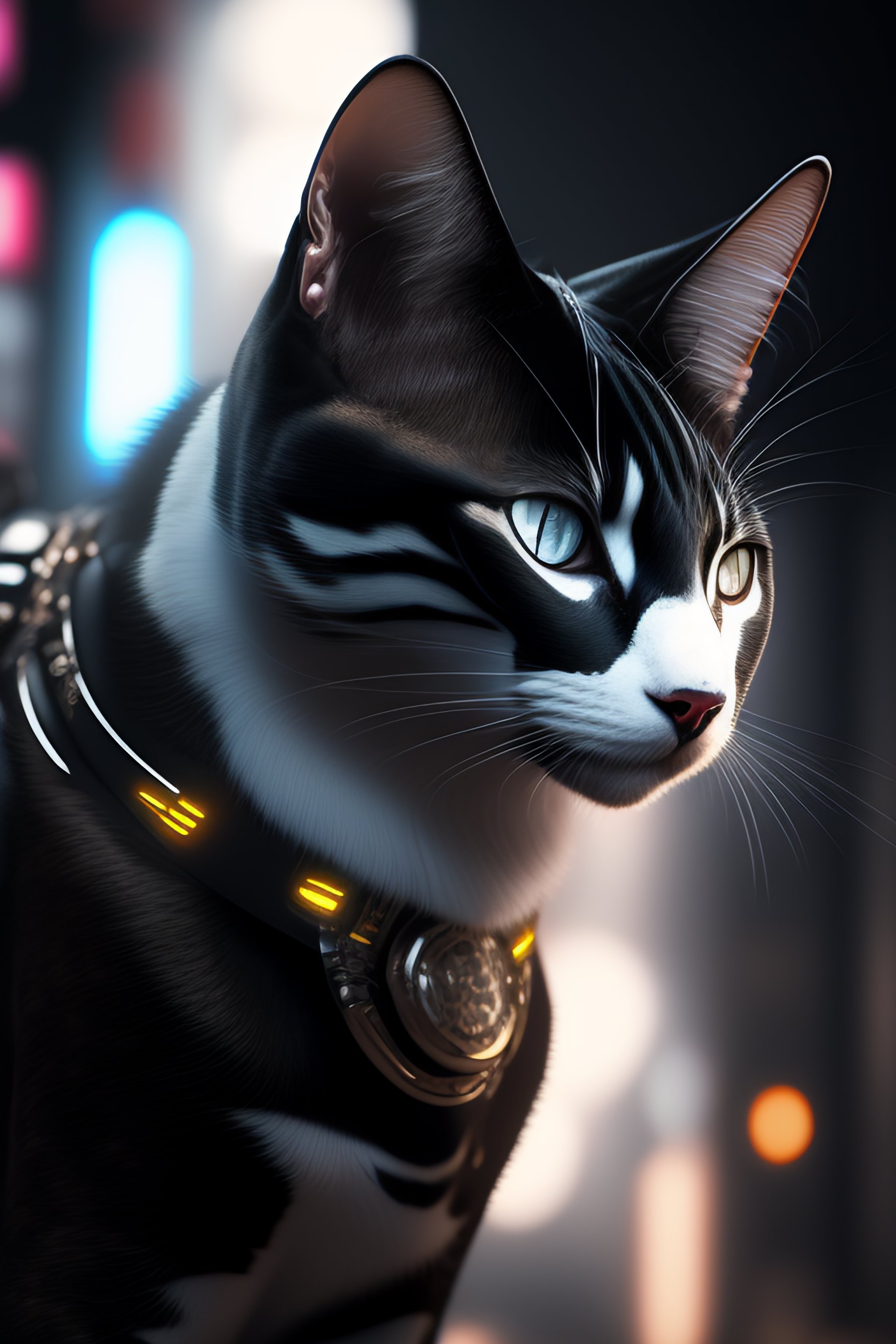 Cyberpunk male black and white cat like robot cyborg android with a crown, wetlook, abstract black oil, gear mecha, detailed acrylic, grunge, intricate complexity, rendered in unreal engine, photorealistic, neon ambiance