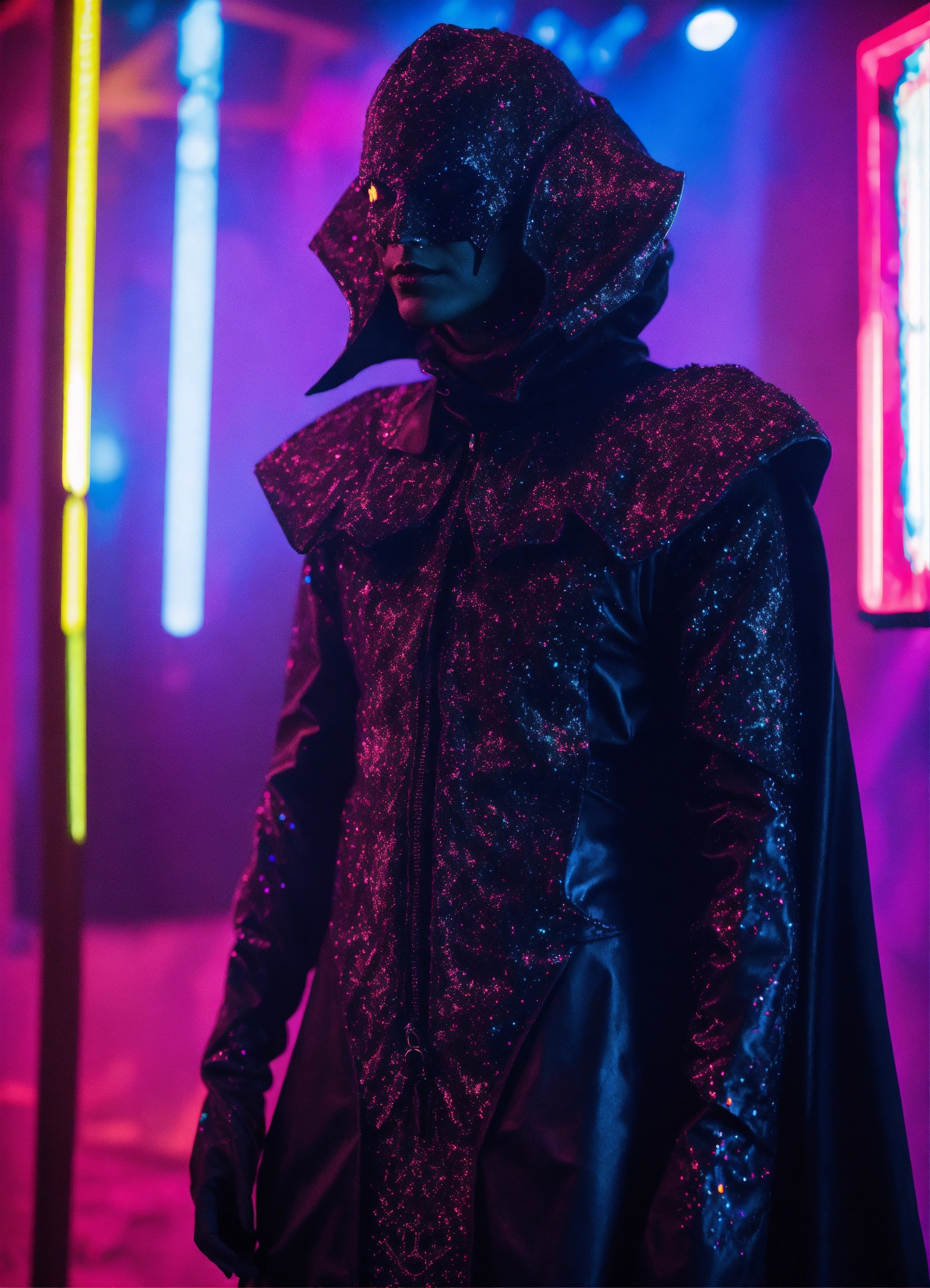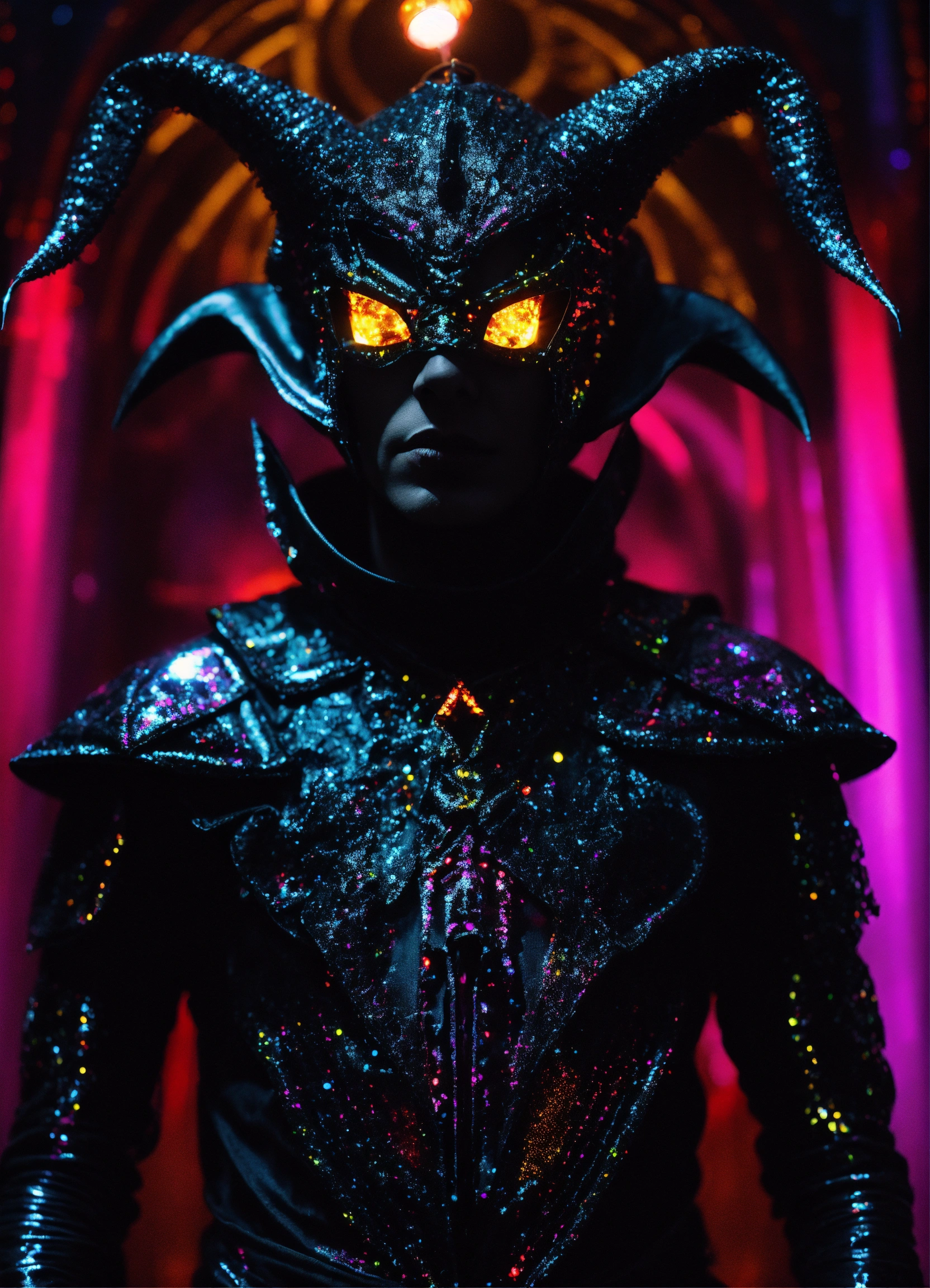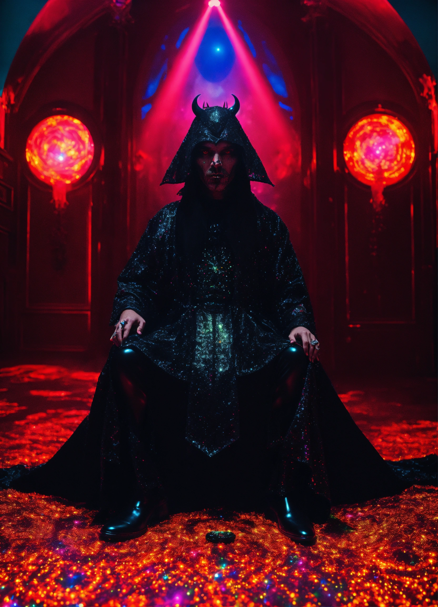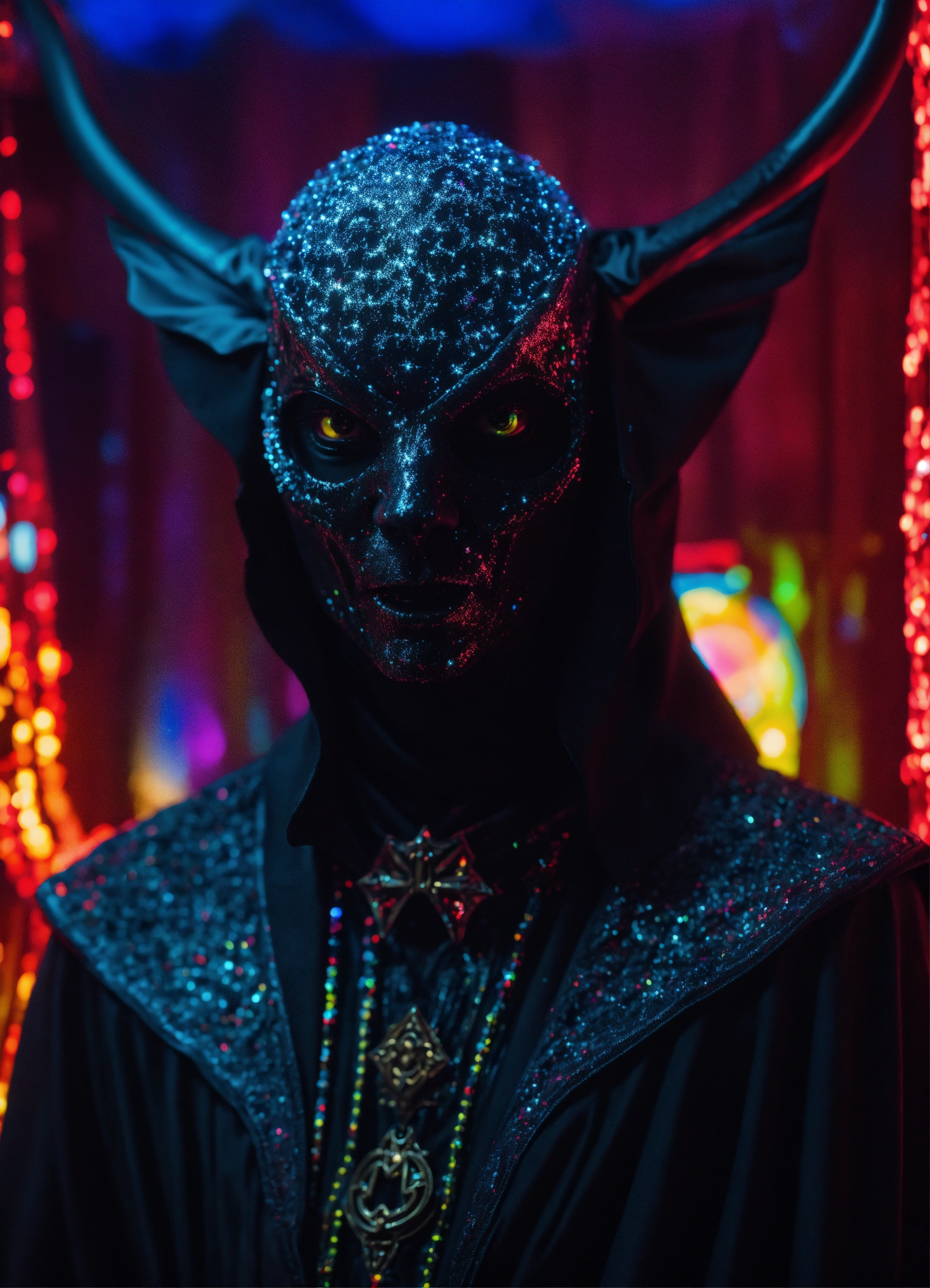 Hyperion in holy mountain the movie photorealistic 3d 35 mm portrait of gothic demon alien in demon dmt lsd black couture costume, baptized in a cosmic dmt tokyo black laser light black glitter holographic satanic techno club.