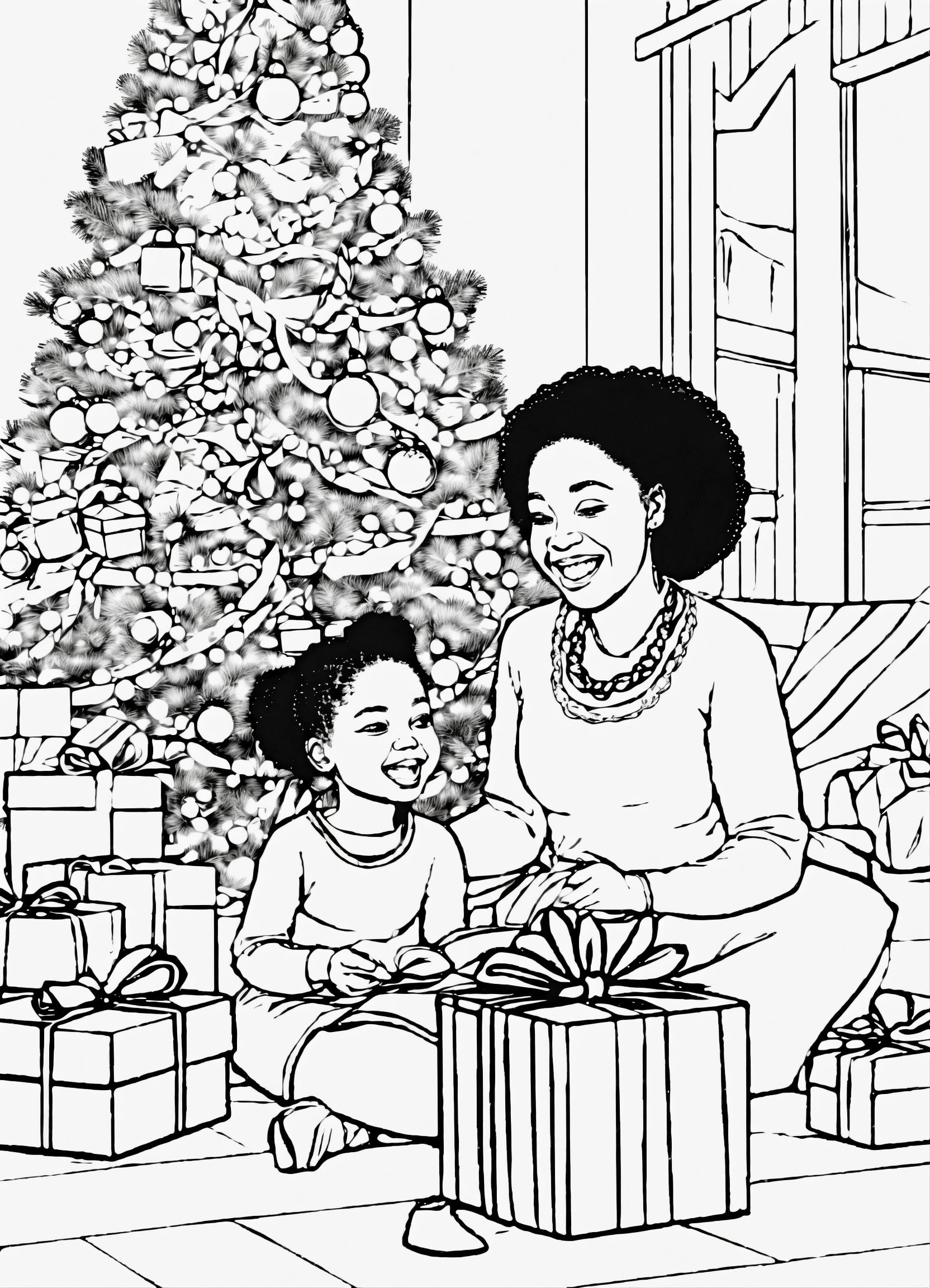 Black and white coloring pages of young african american aunt and niece with braids opening gifts by the christmas tree