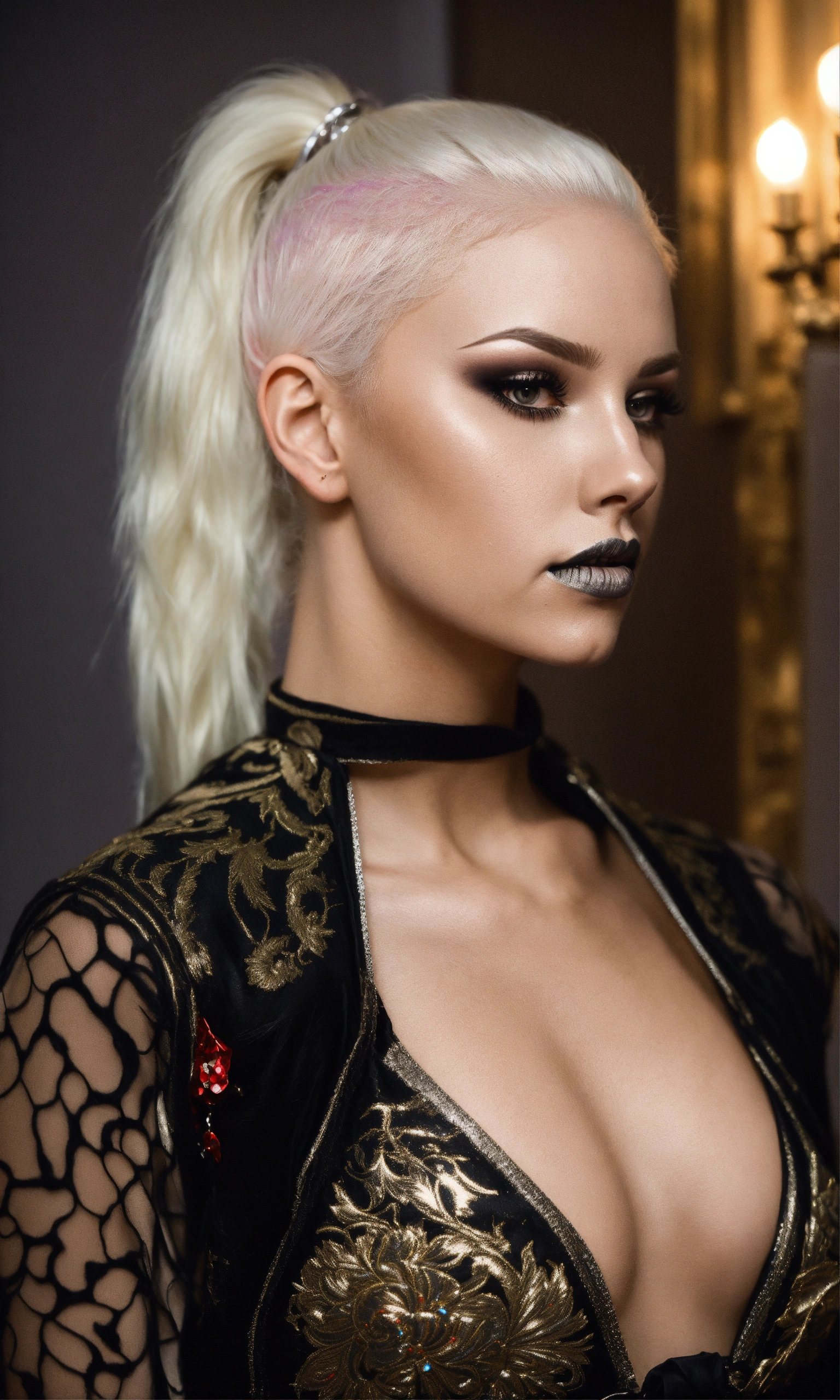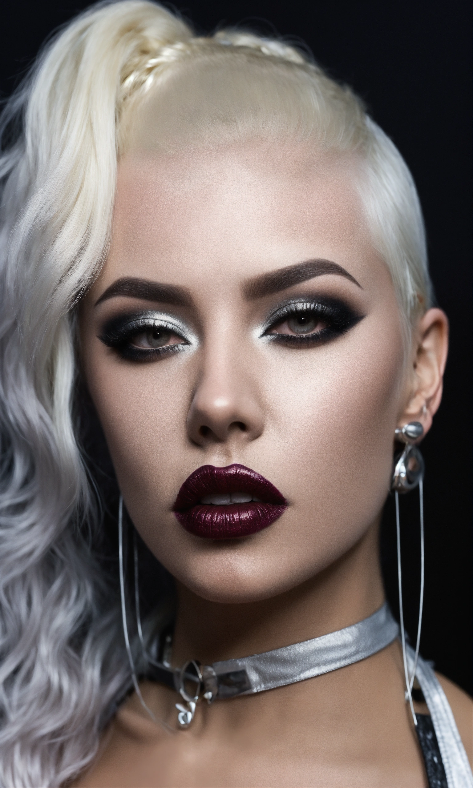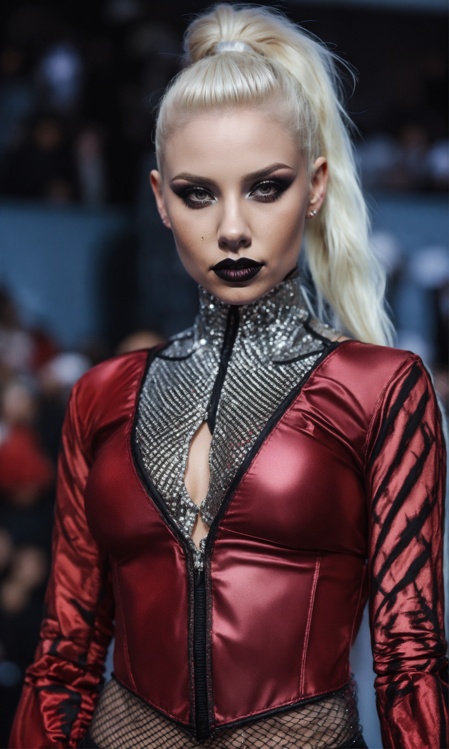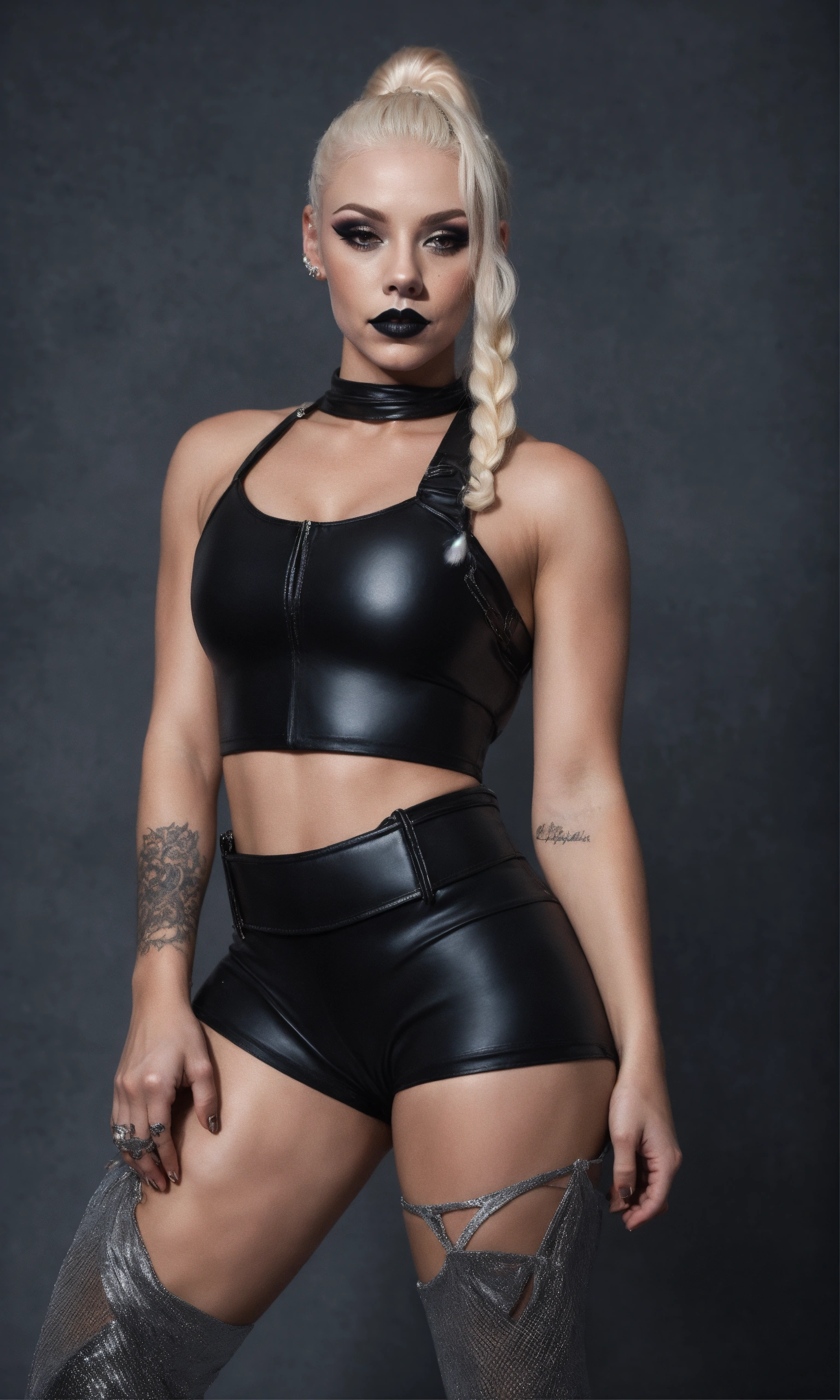 Scarlett bourdeux, hyper realistic, platinum blonde ponytail down to waist, silver lips, wrestling, goth makeup