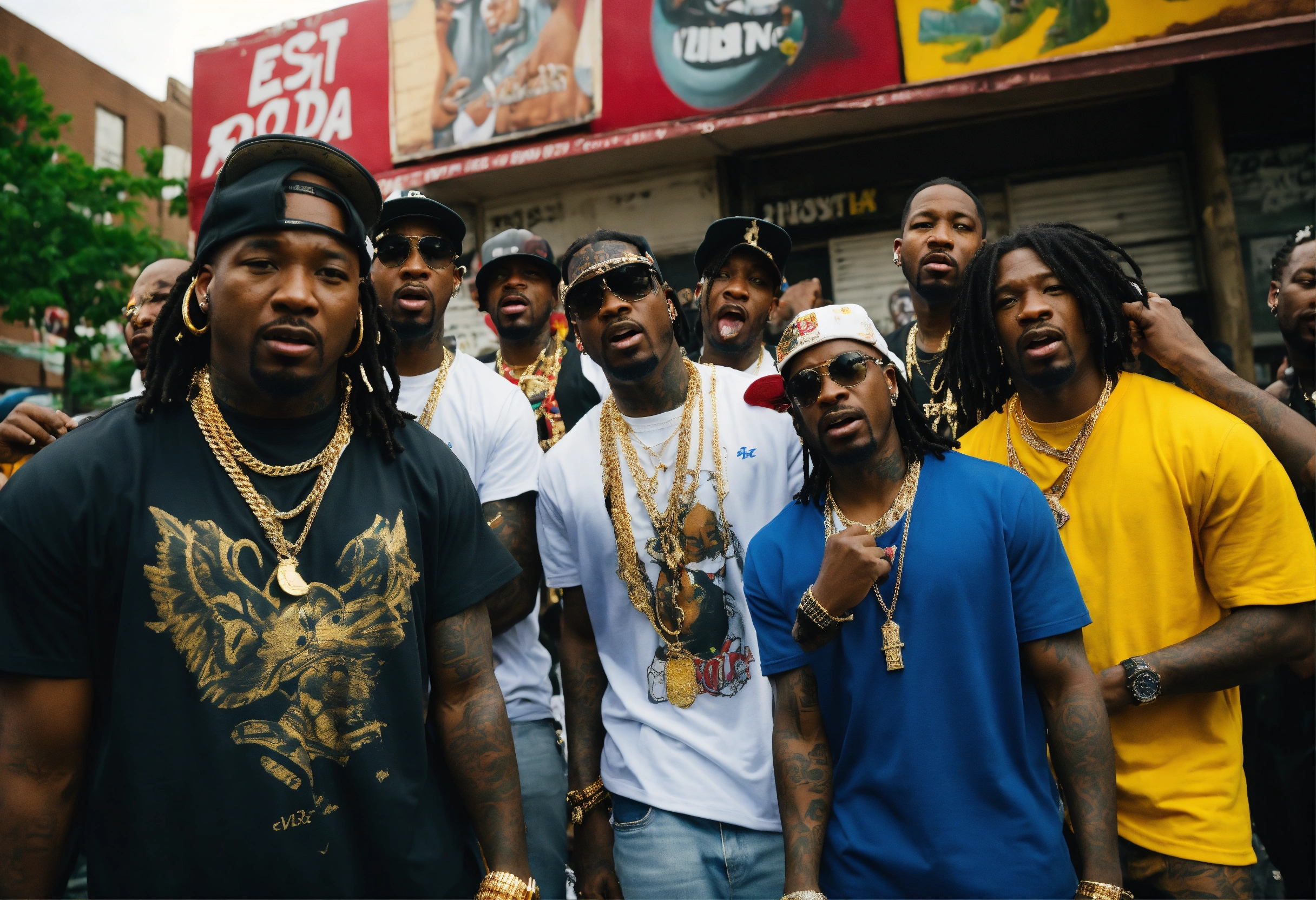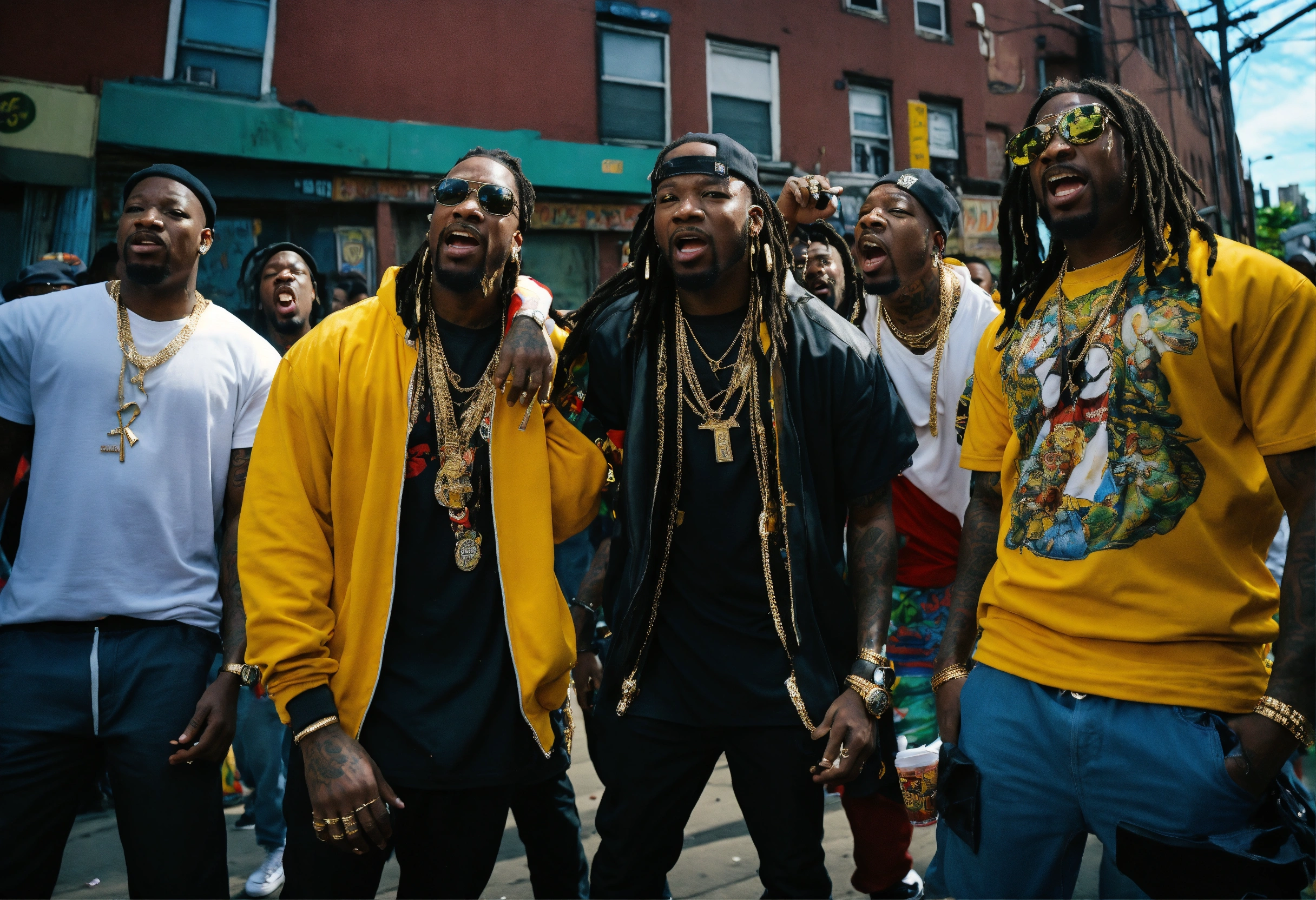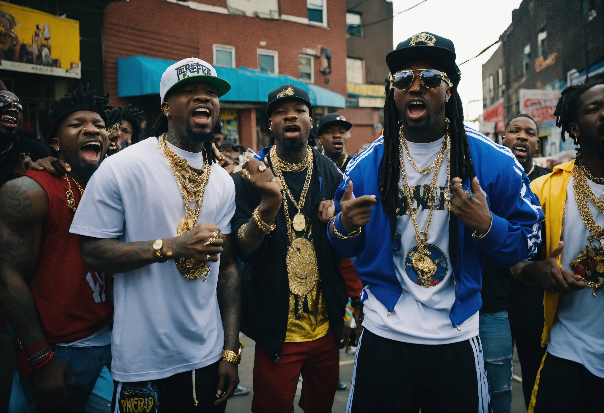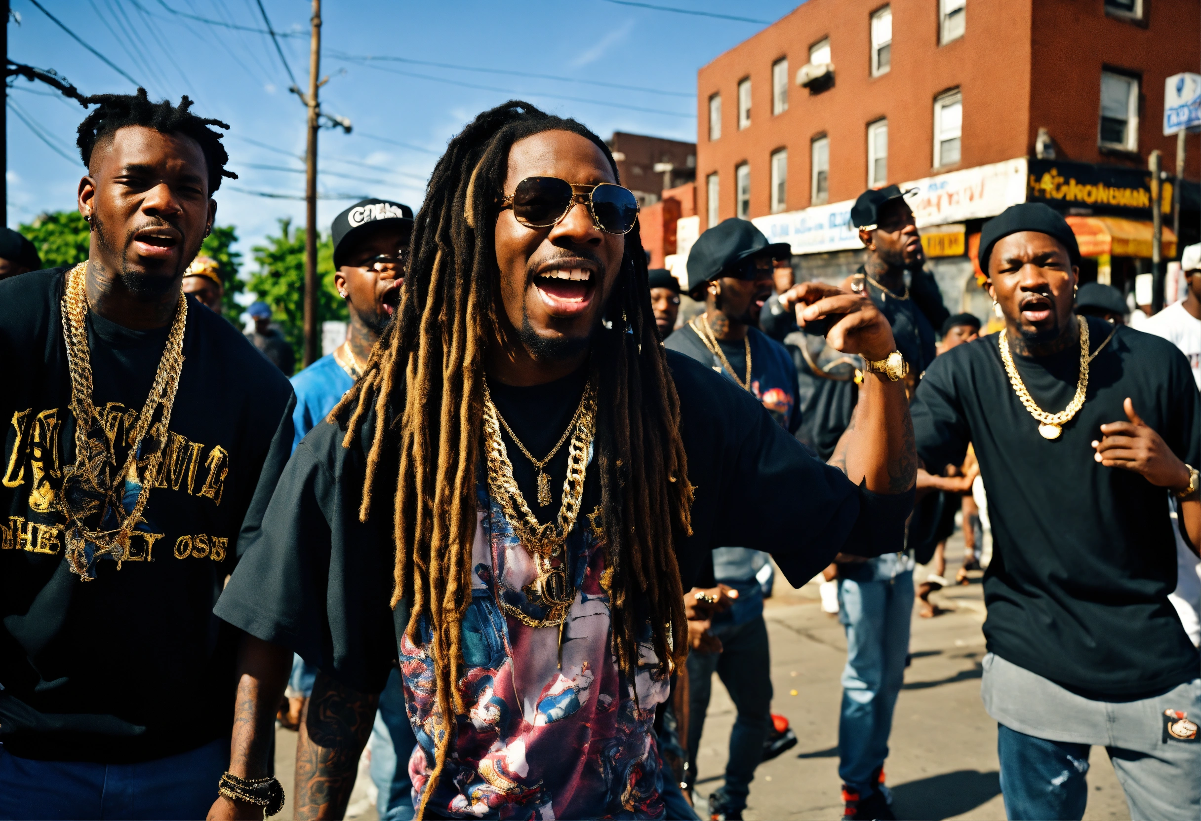 Full body shot rap group lost boyz " mr. cheeks", freaky tah, pretty lou" rapping in south jamaica, queens on 134th blvd. in rochdale new york people cheering in the background screaming, epic details 8k, super high quality, tattoo, gold neckless, canon eos 5d, burst out screaming, background.