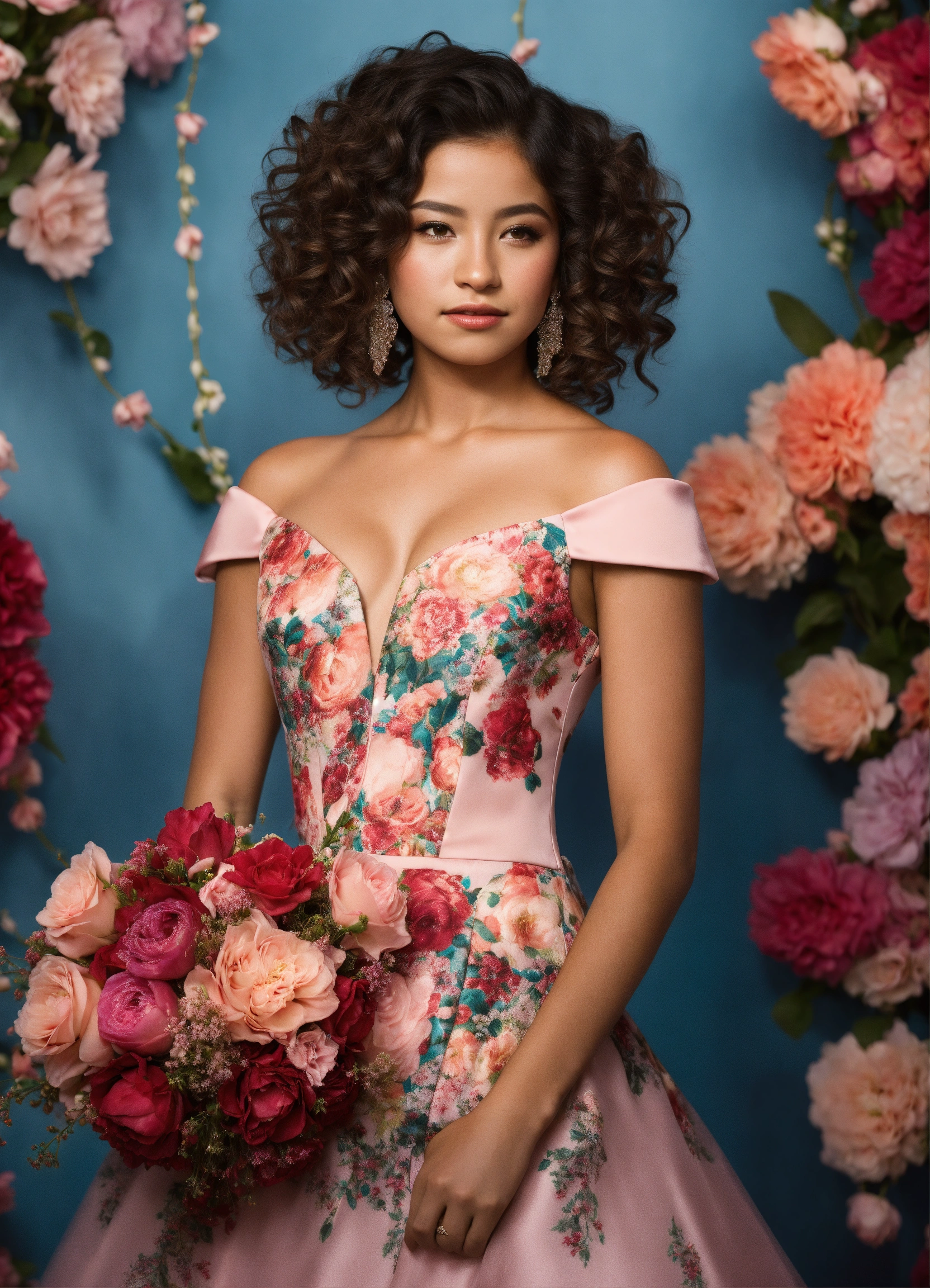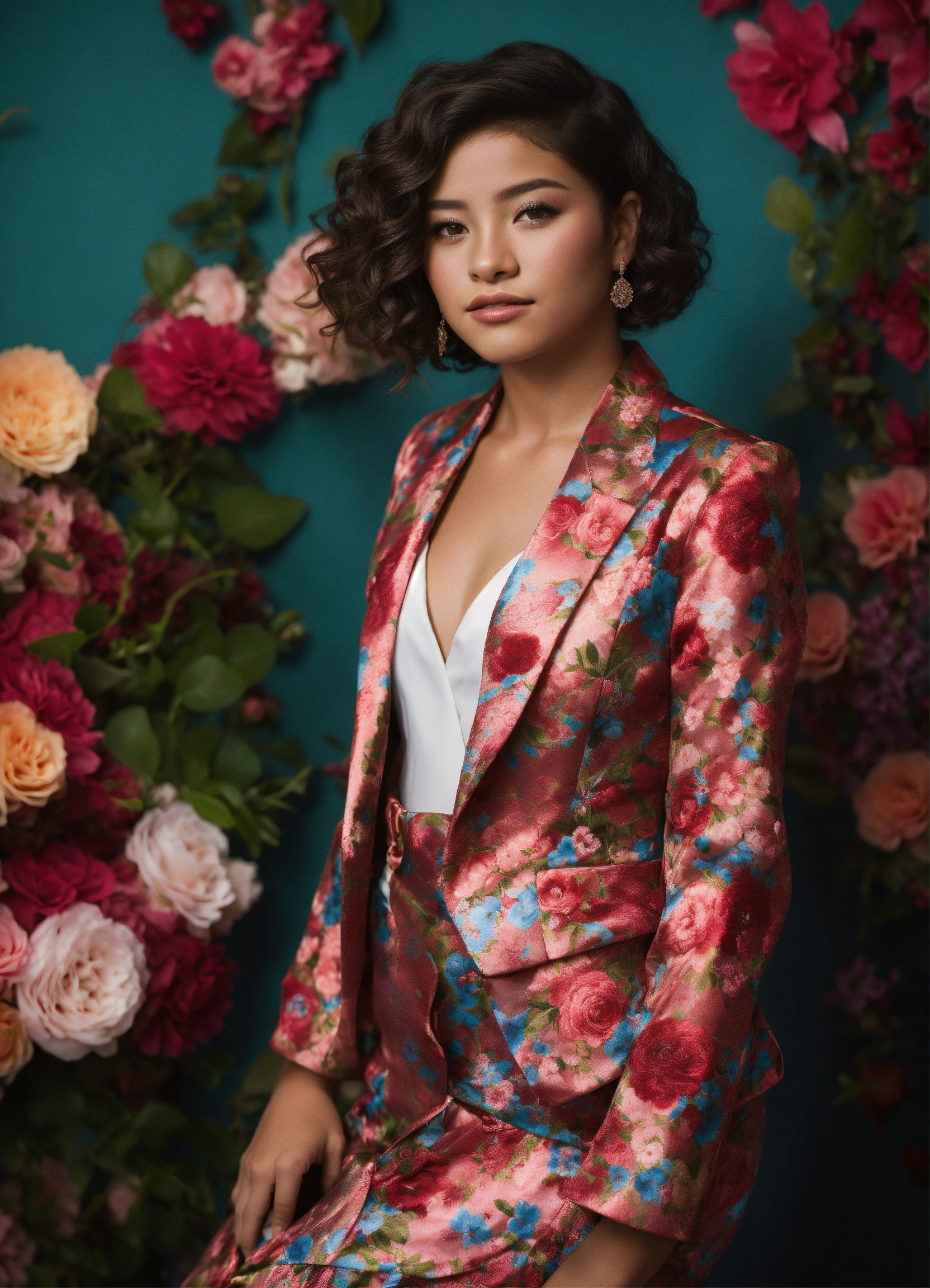 Quinceañera, curly very short hair, photorealistic, in a floral tuxedo, full shot, posing in a studio