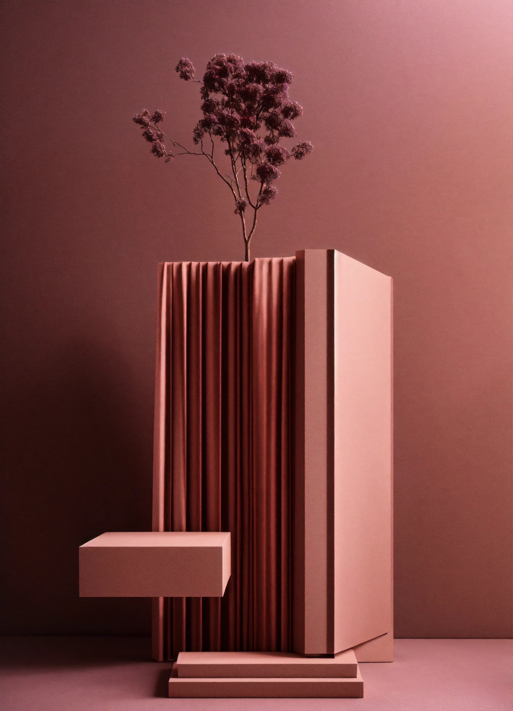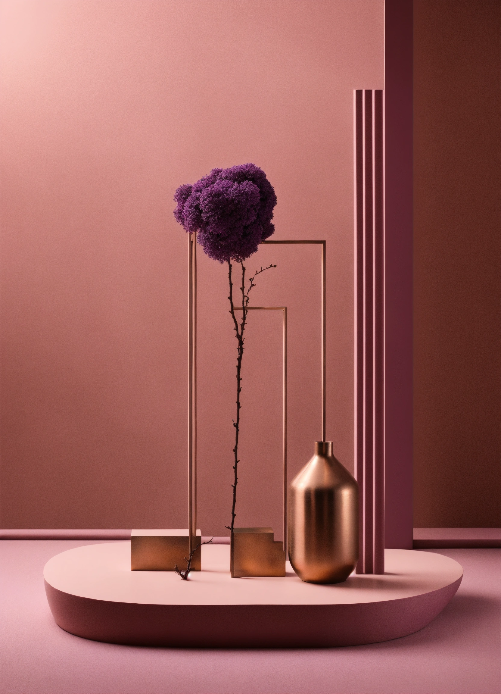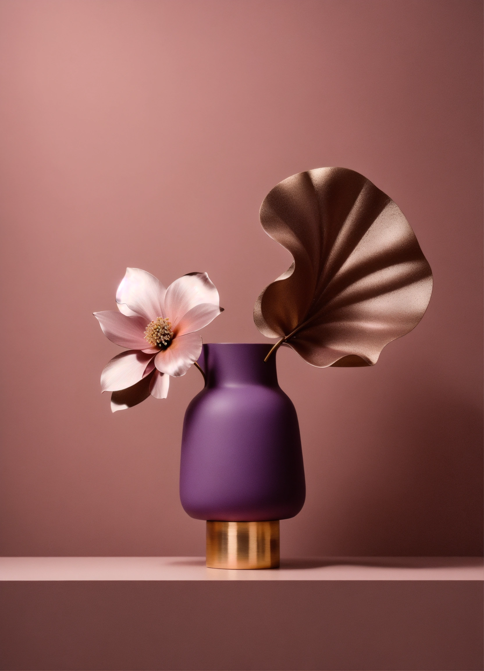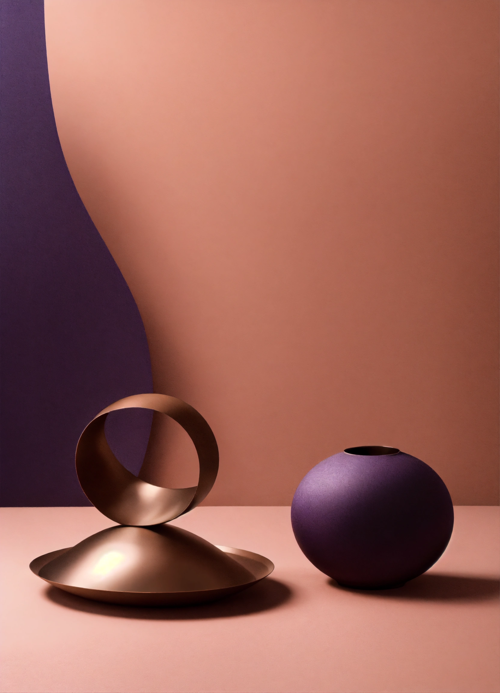 Muted tones of dusty pink and dark purple surreal combination with minimalist compositions, evoking a sense of calmness, bronze casting, simple bare minimalist style 3d compositions, wedding theme.