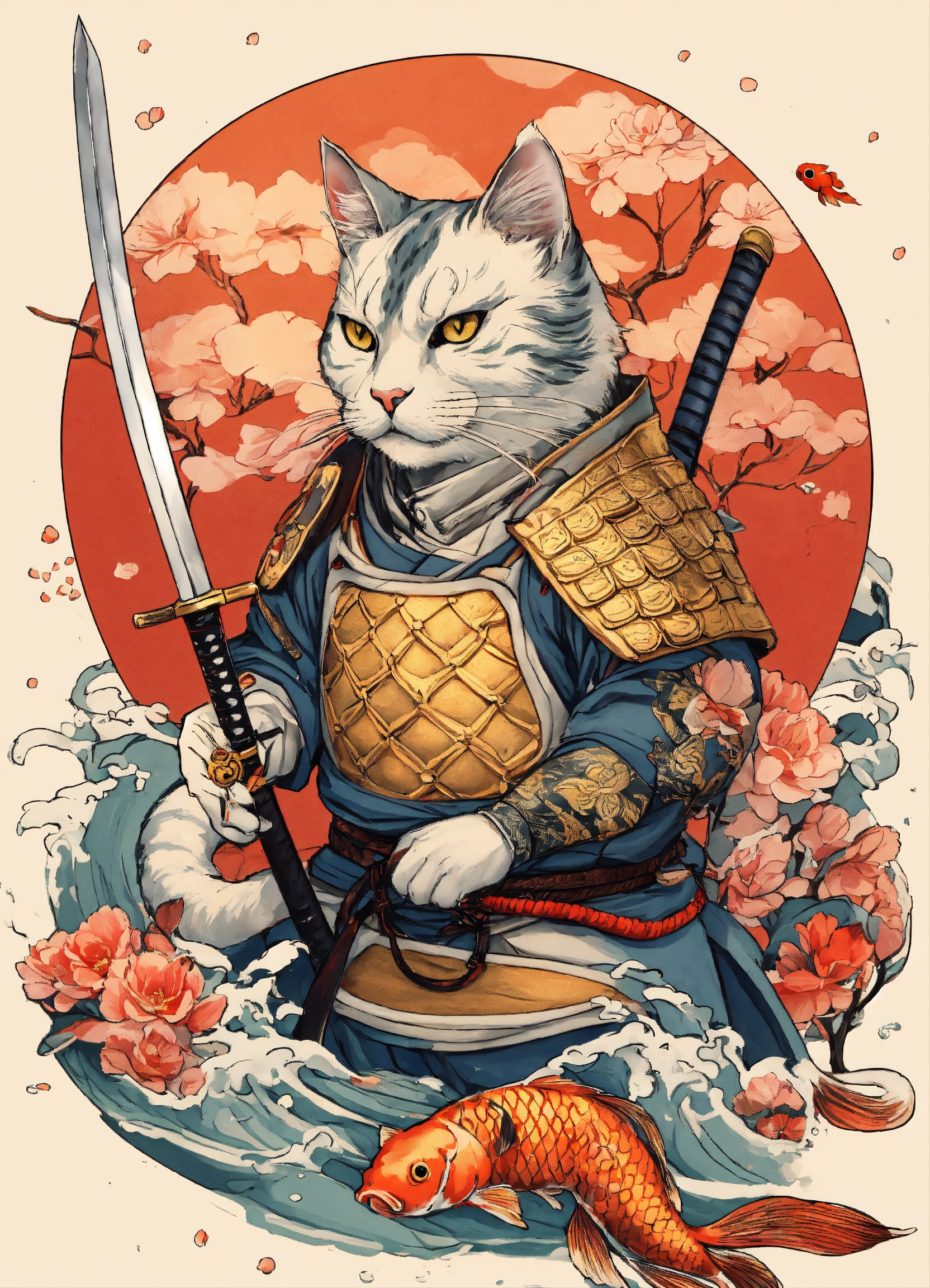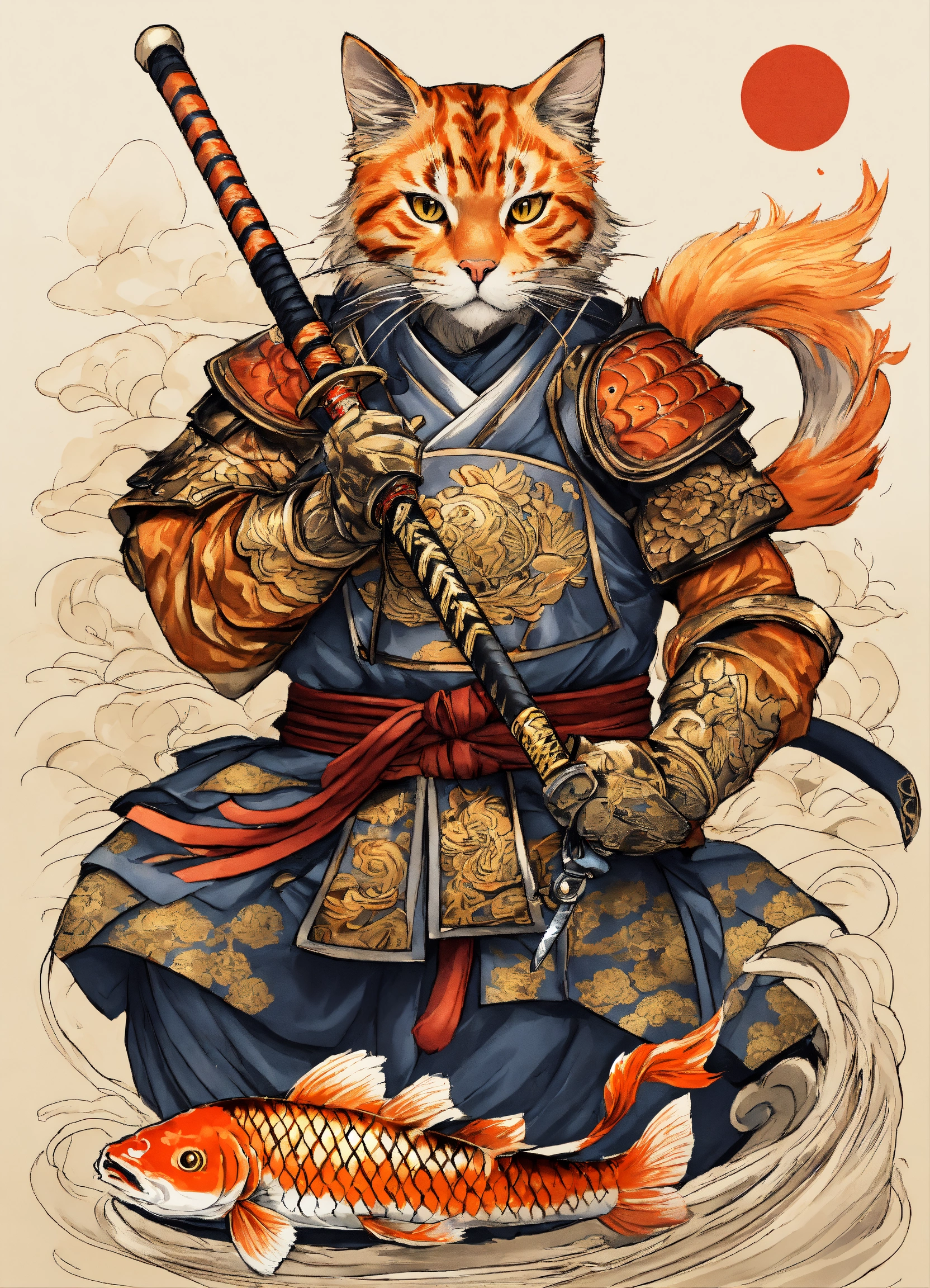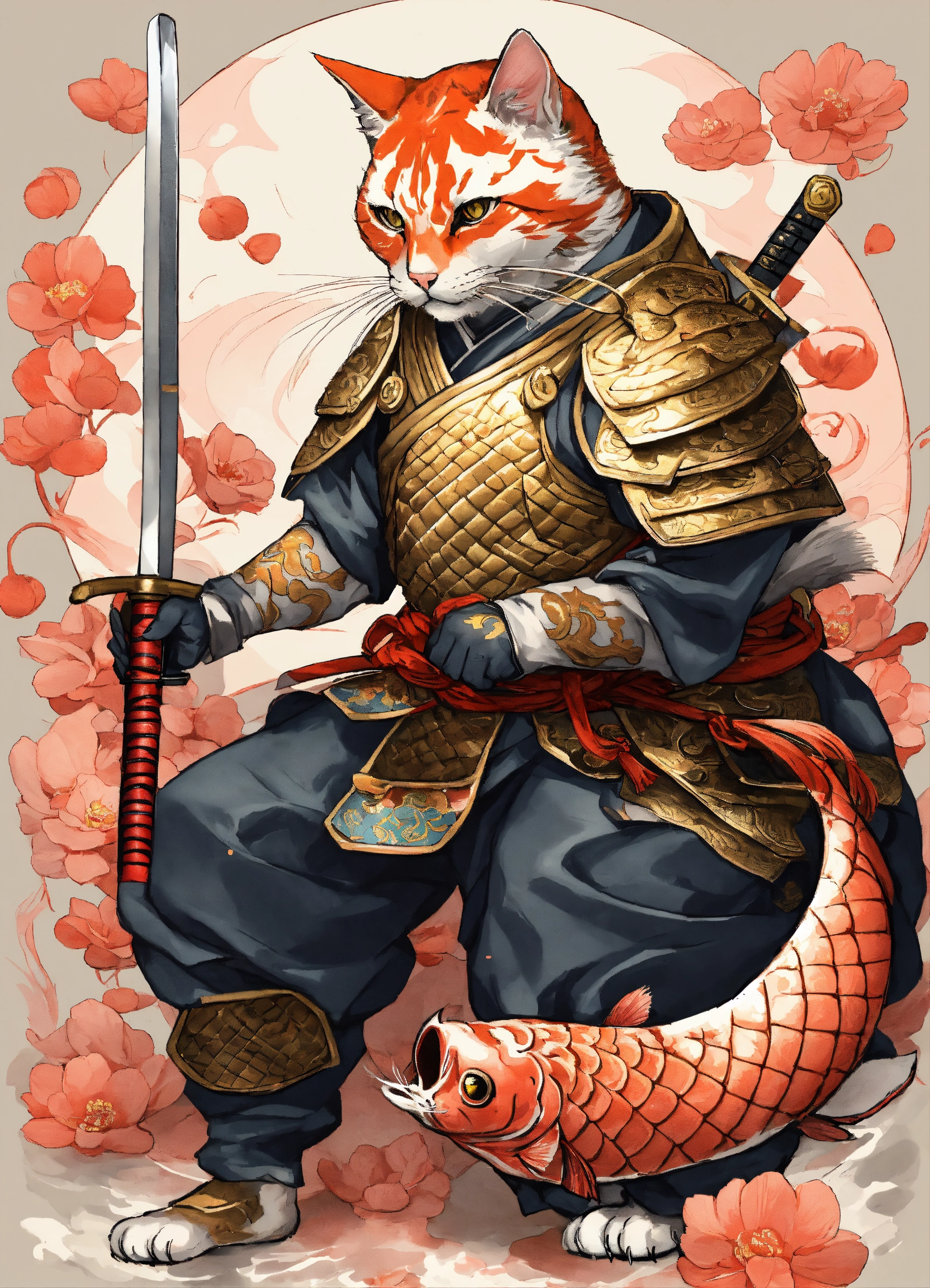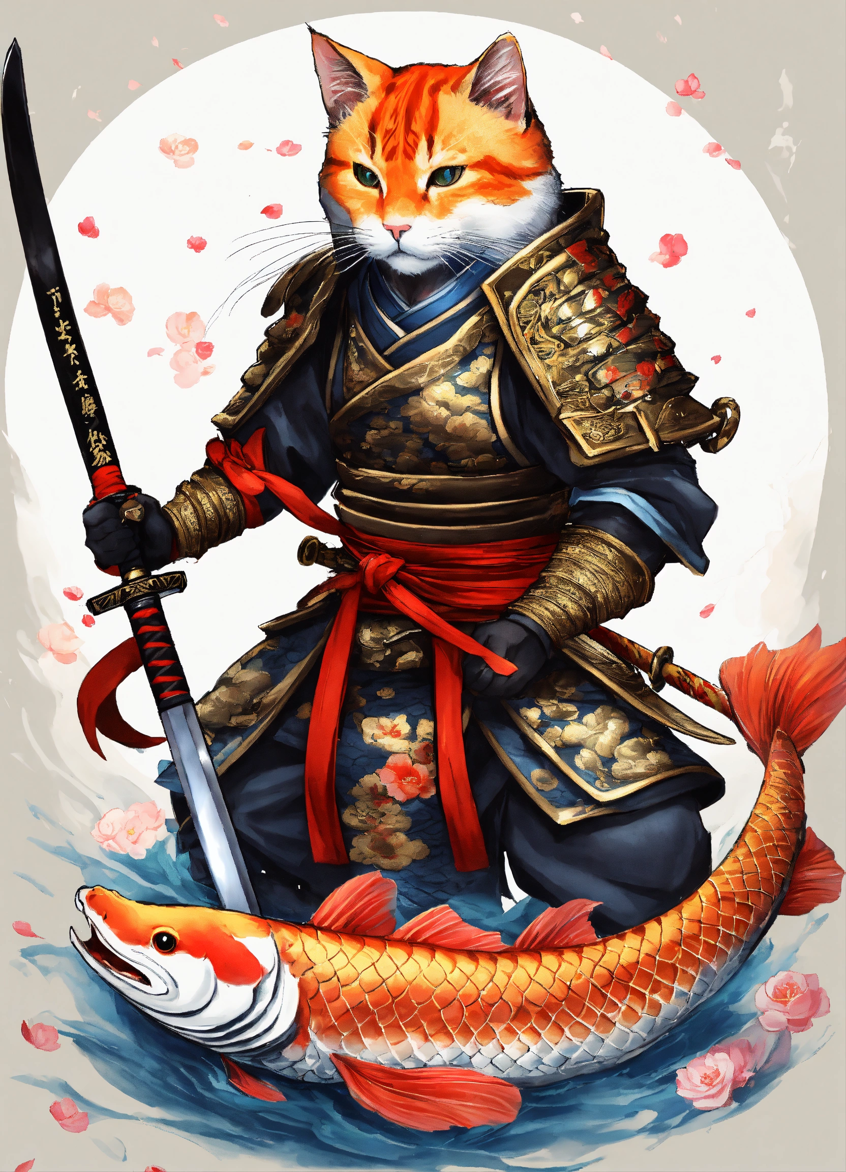 There is a cat with a big carp koi and a big sword on a white background, samurai cat, cat warrior, armored cat, anthropomorphic cat ninja, samurai deity with koi armor, by kanō tan'yū, highly details for tattoo on arm
